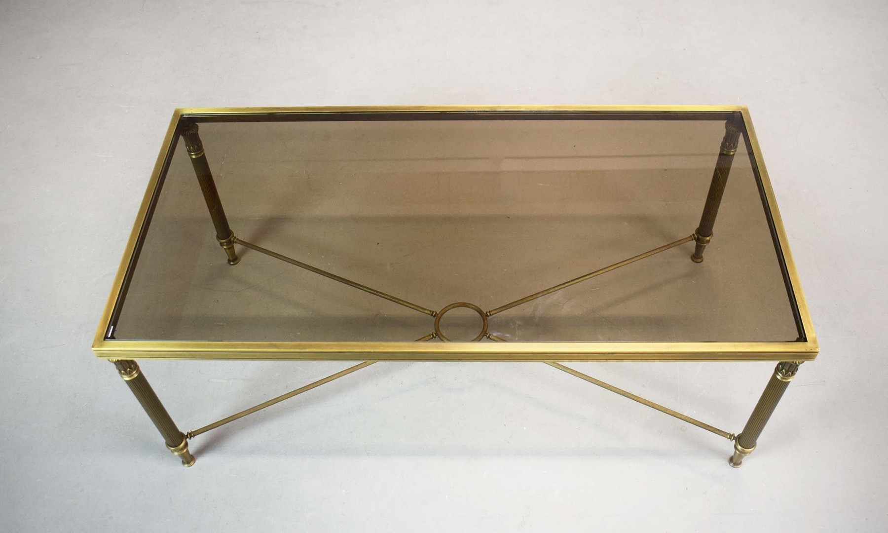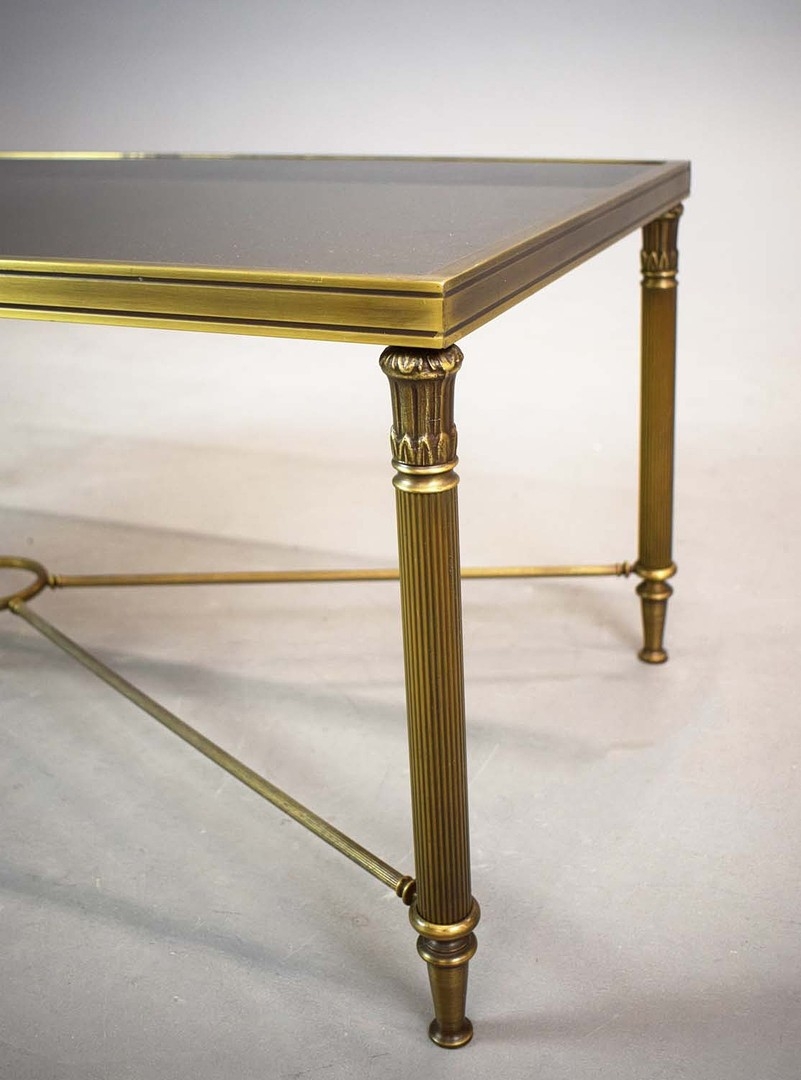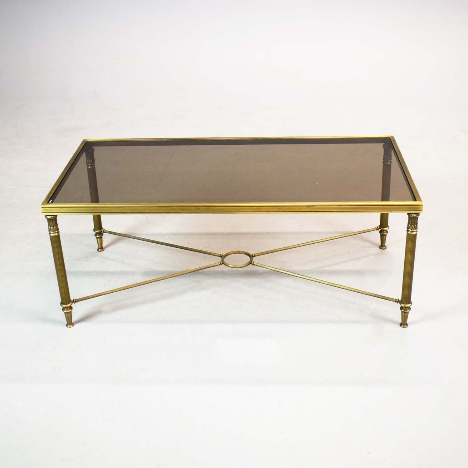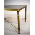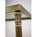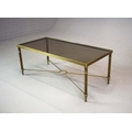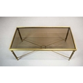 BRASS LOW TABLE. tinted glass top, 44cm H x 110cm W x 55cm D.