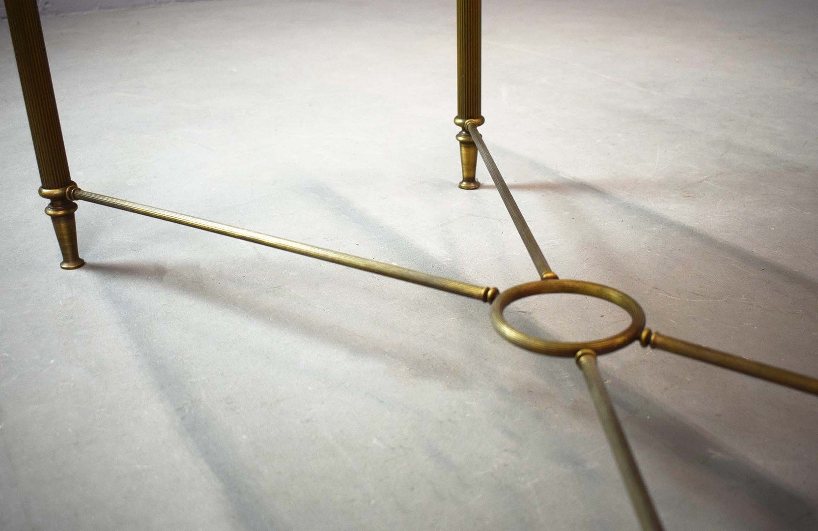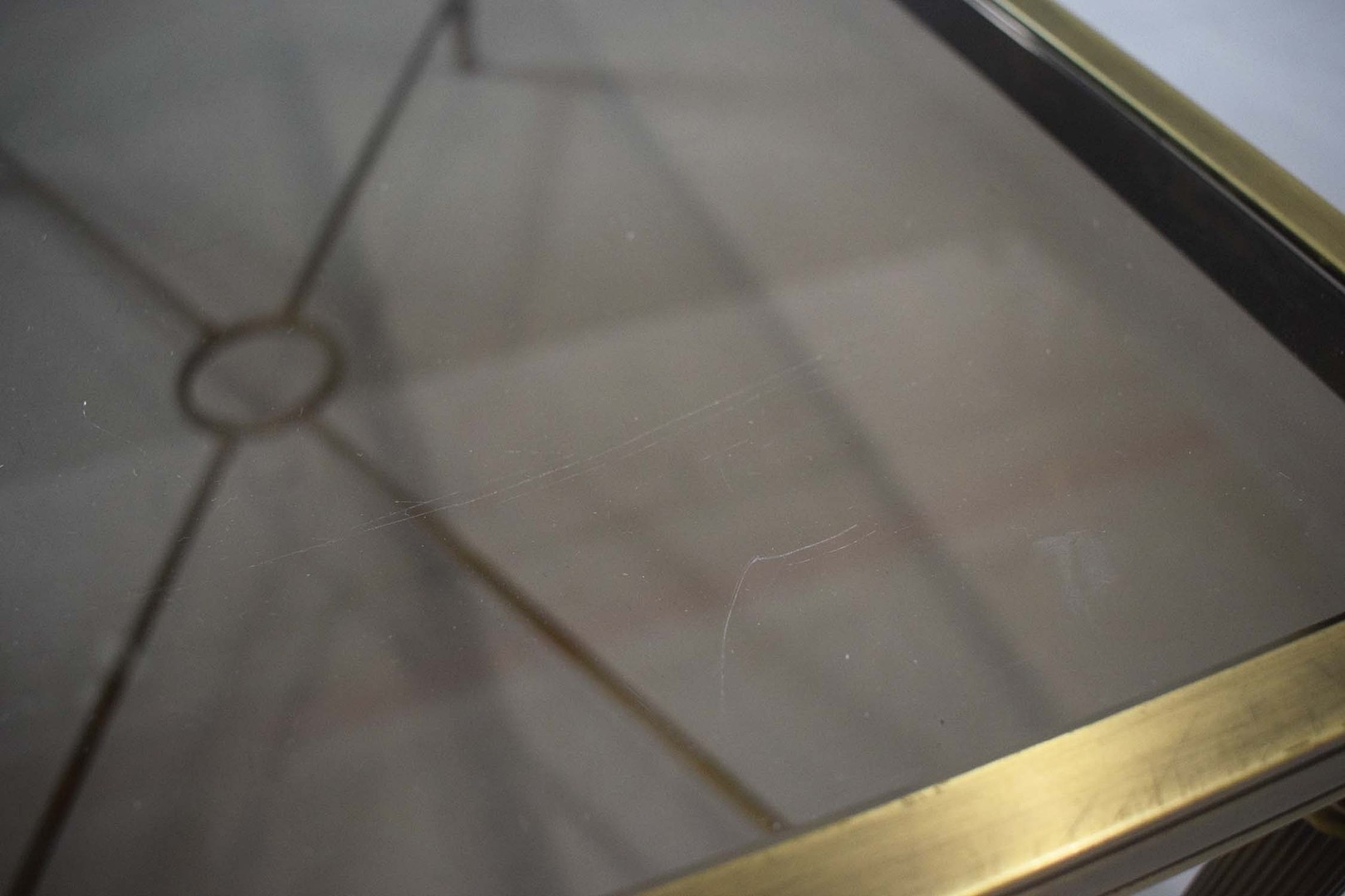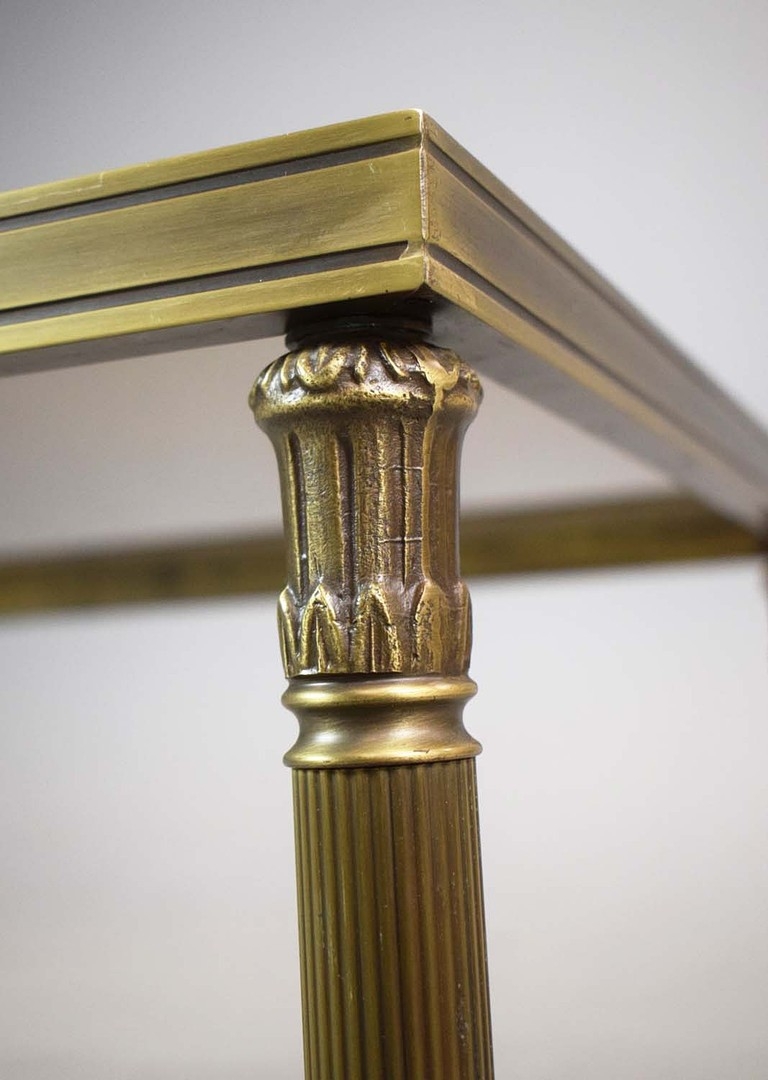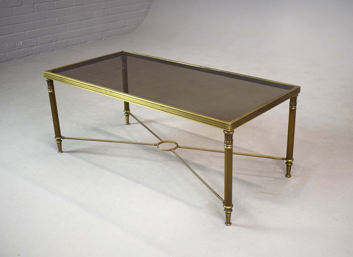 BRASS LOW TABLE. tinted glass top, 44cm H x 110cm W x 55cm D.