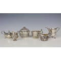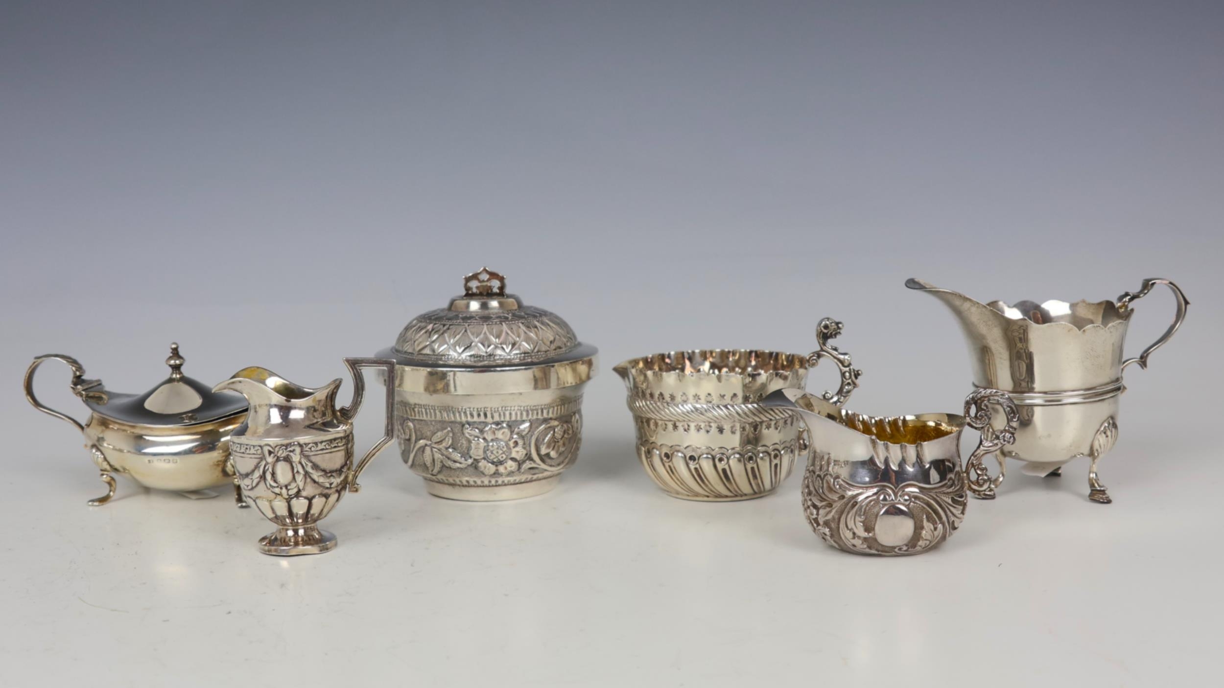A group of four silver jugs, comprising a Victorian example, John Henry Rawlings, London 1892, the cast handle above embossed body, 6cm high, with three further later examples, and a mustard pot and Indian white metal bowl, gross weight 12ozt (6)