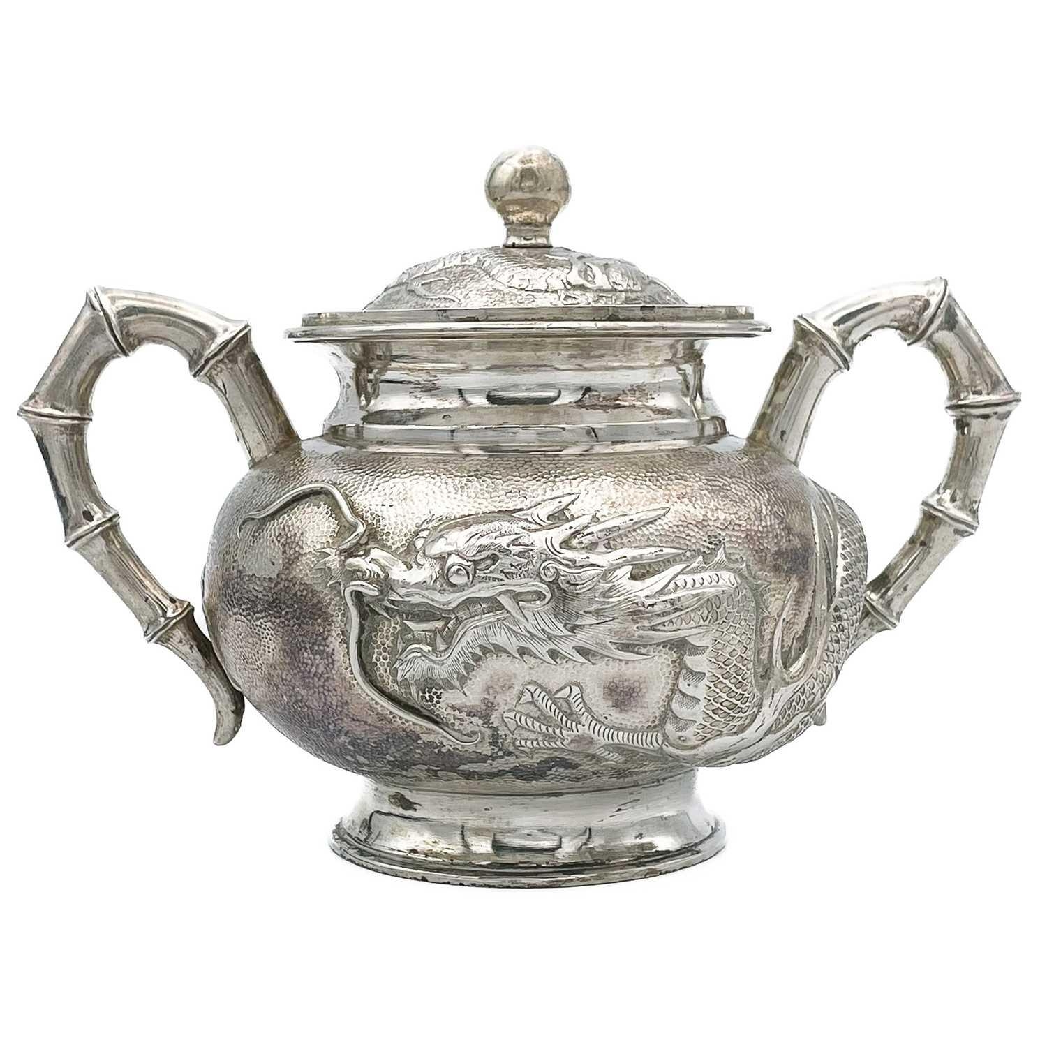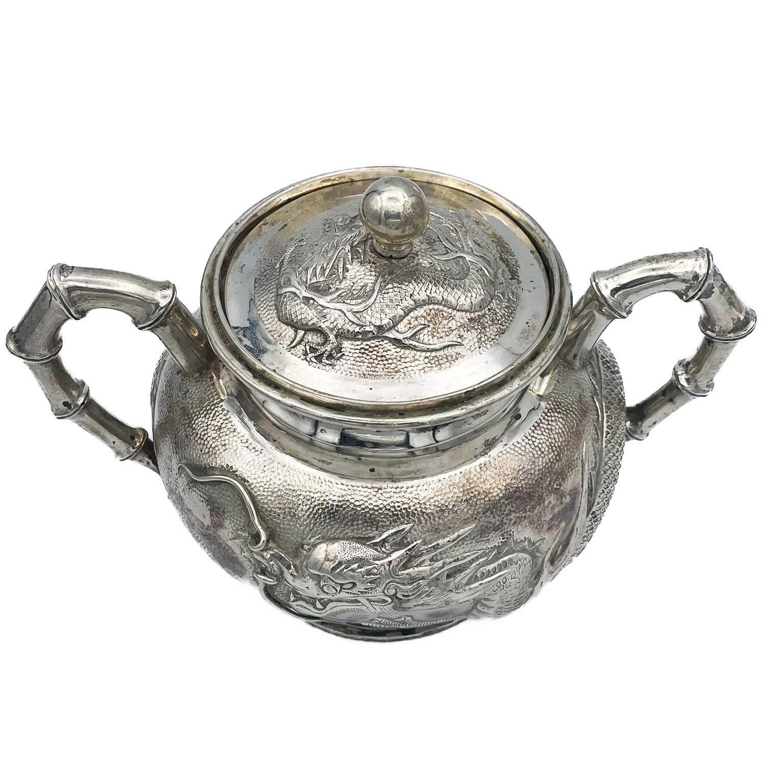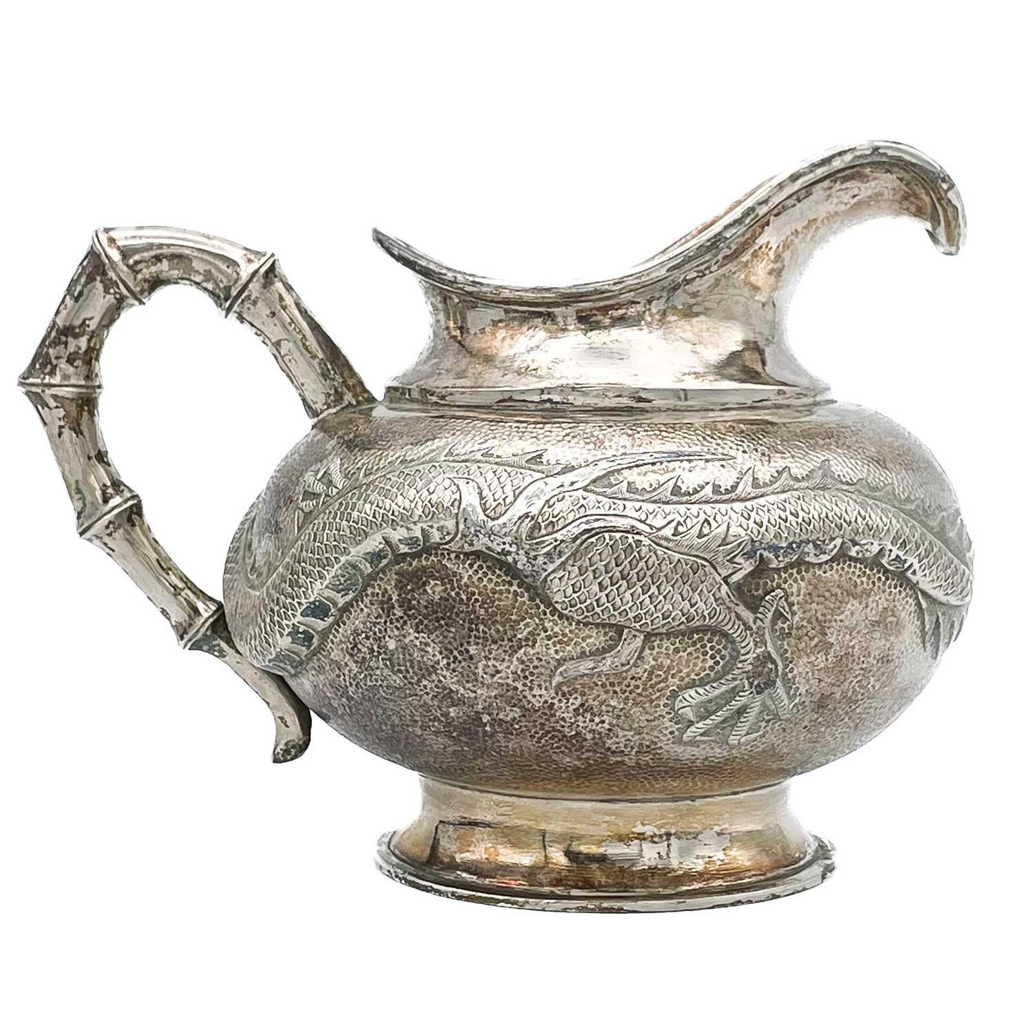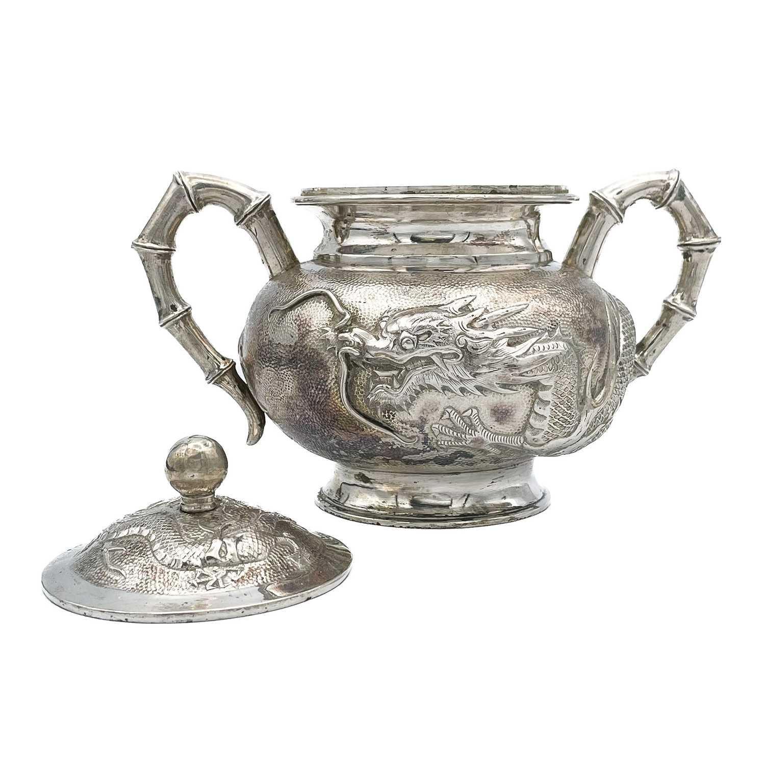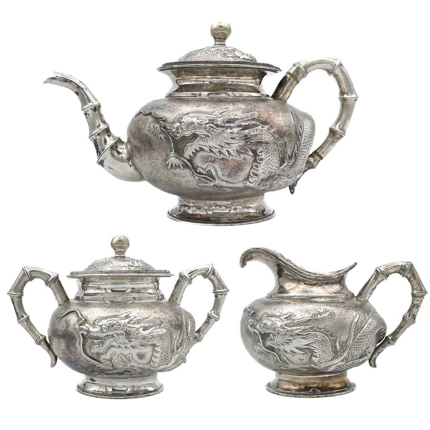 A Chinese silver three-piece tea service, late 19th century. Makers marks for Woshing, Shanghai, comprising a teapot, milk jug and sugar bowl, with simulated bamboo handles and spout, the body decorated with dragons in high relief, teapot size: height 15cm, length 24.5cm, diameter 14.5cm, total weight 1120 grams. (3)