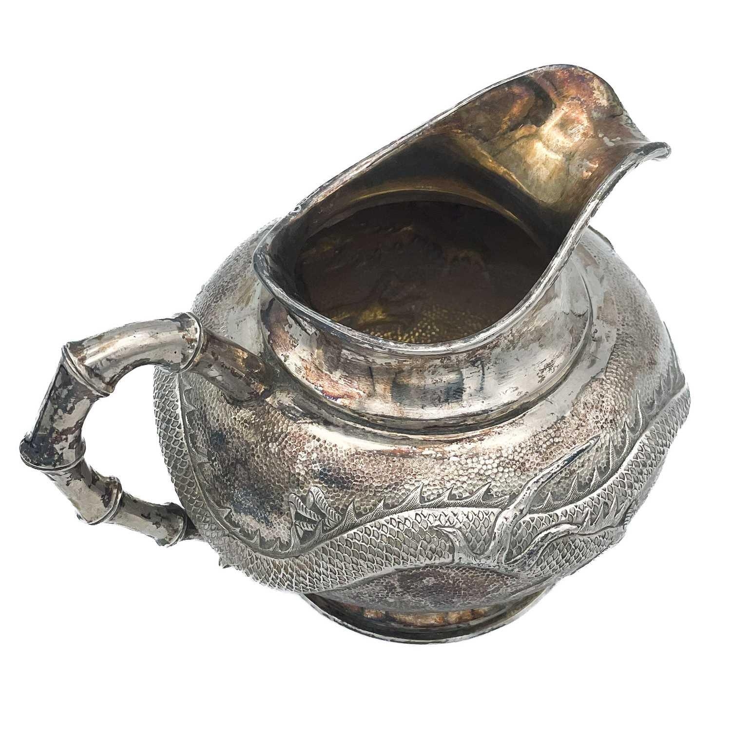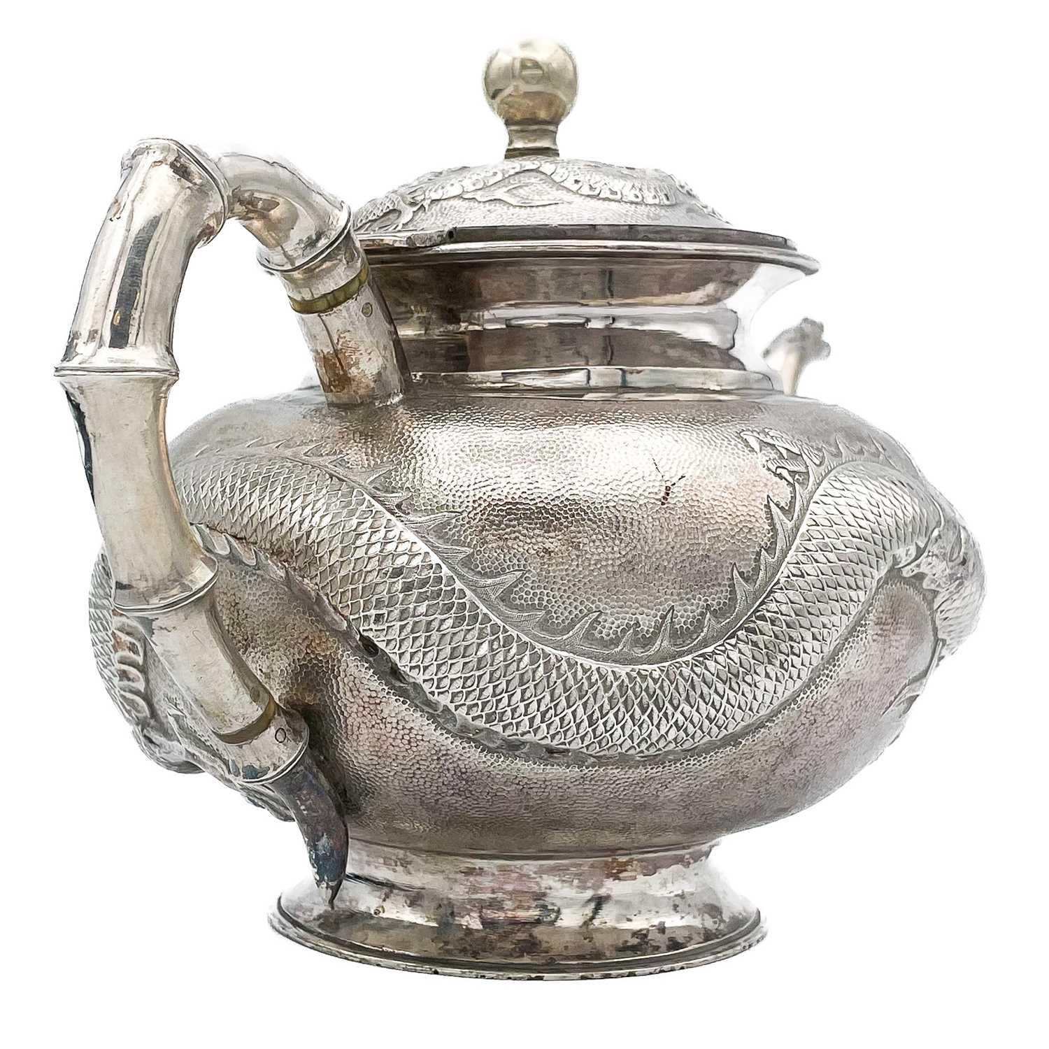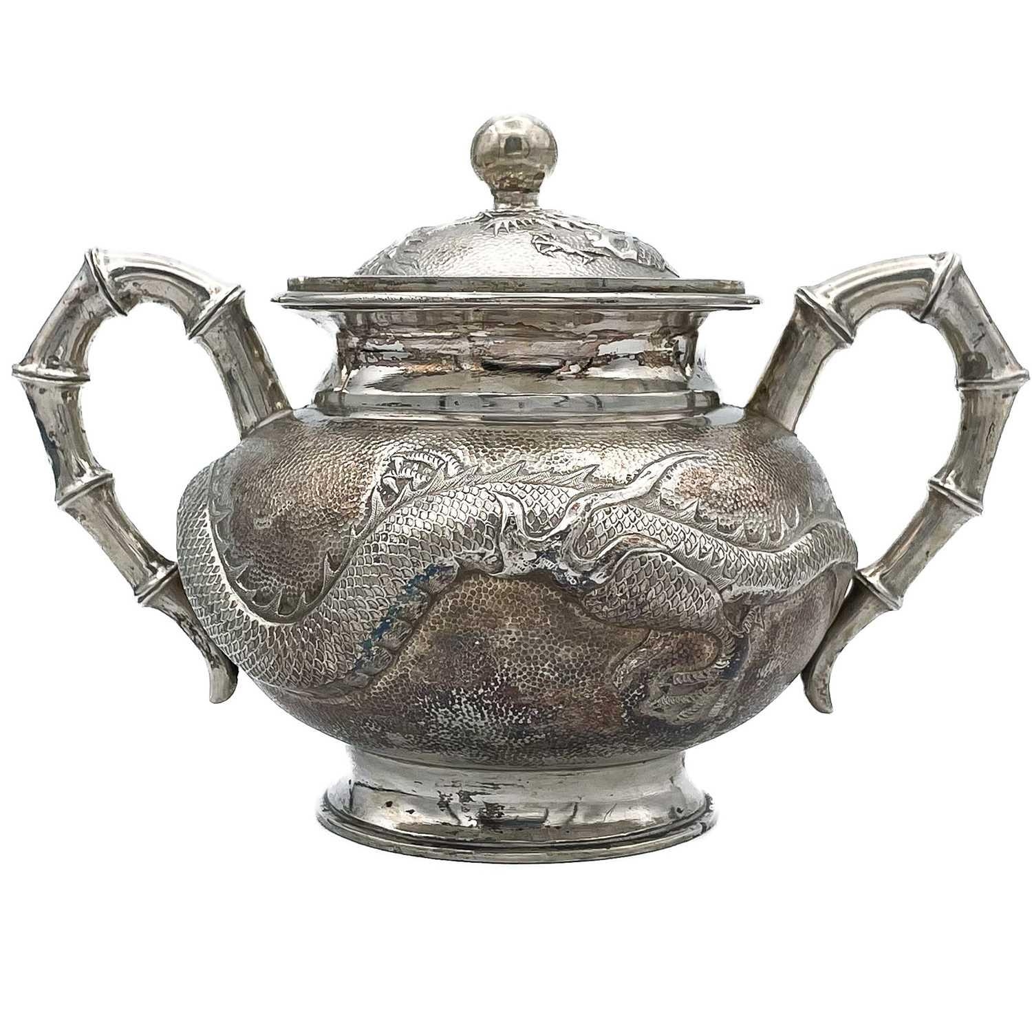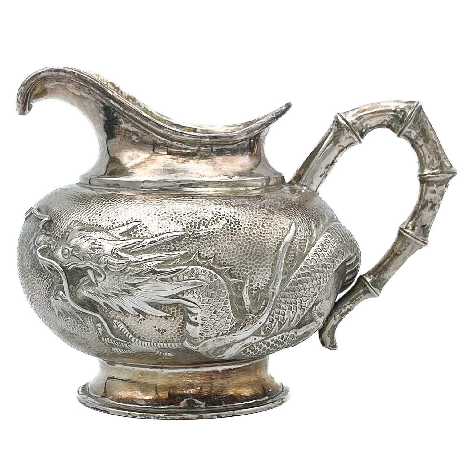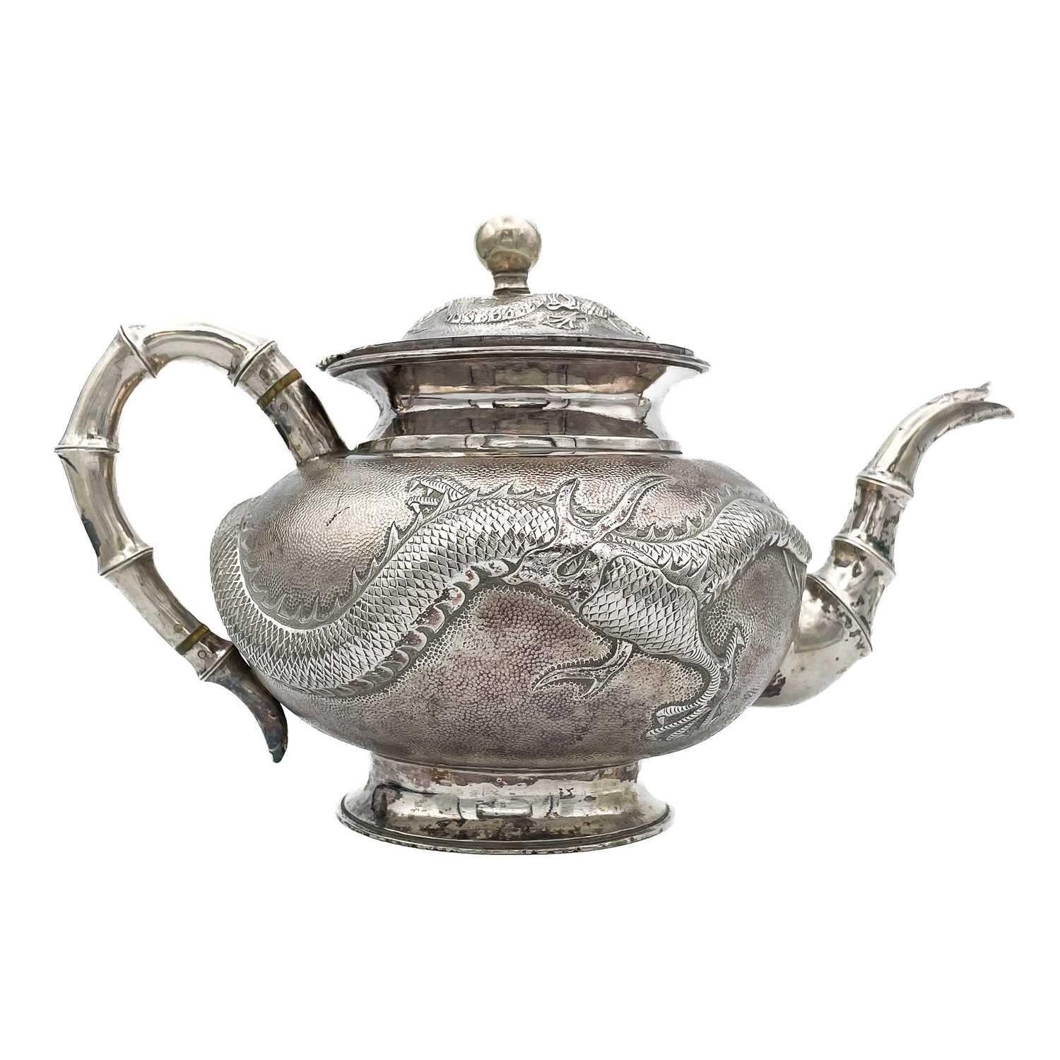A Chinese silver three-piece tea service, late 19th century. Makers marks for Woshing, Shanghai, comprising a teapot, milk jug and sugar bowl, with simulated bamboo handles and spout, the body decorated with dragons in high relief, teapot size: height 15cm, length 24.5cm, diameter 14.5cm, total weight 1120 grams. (3)