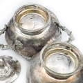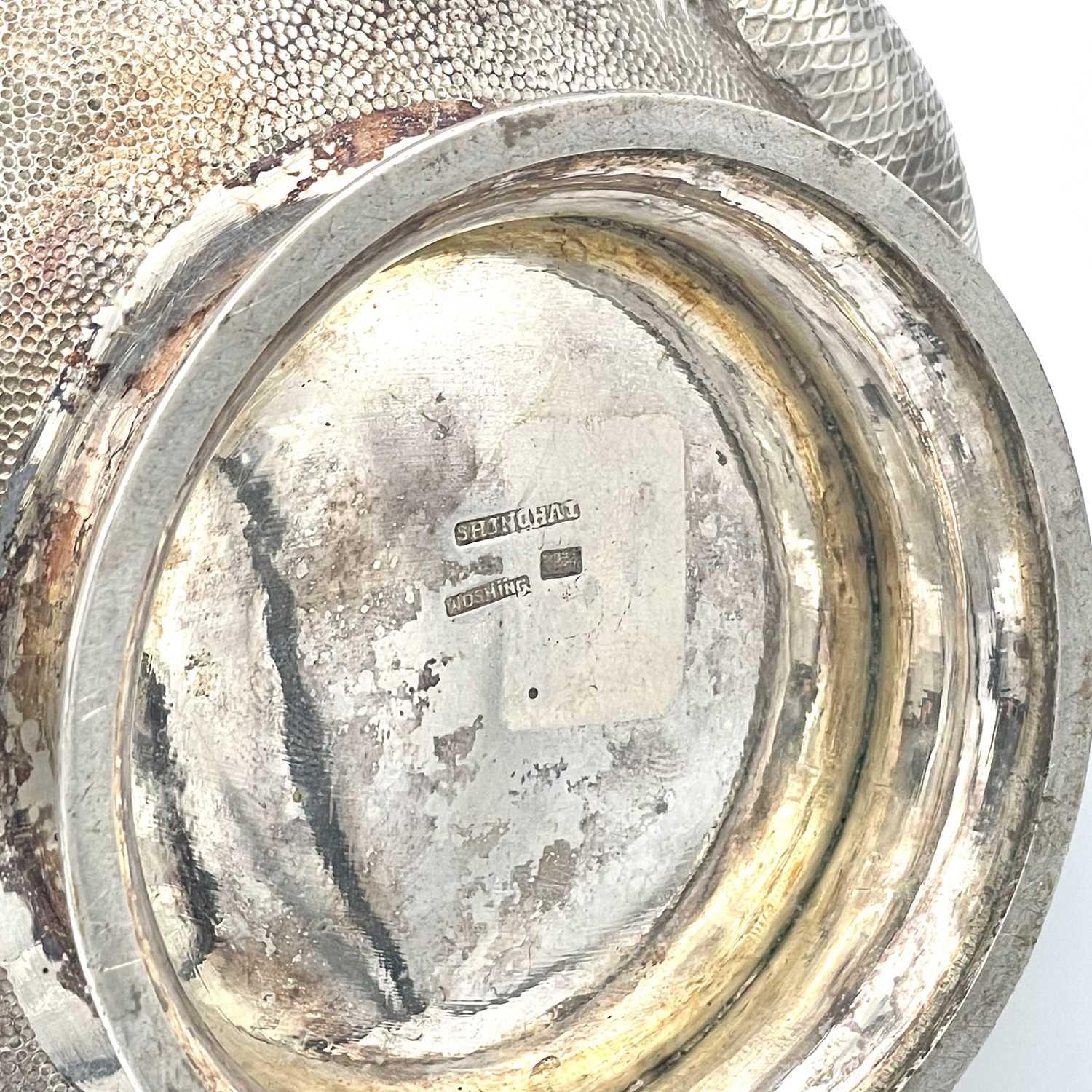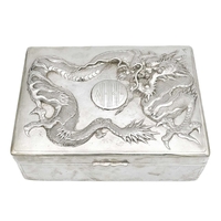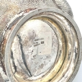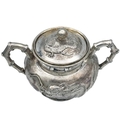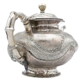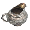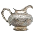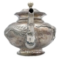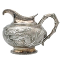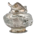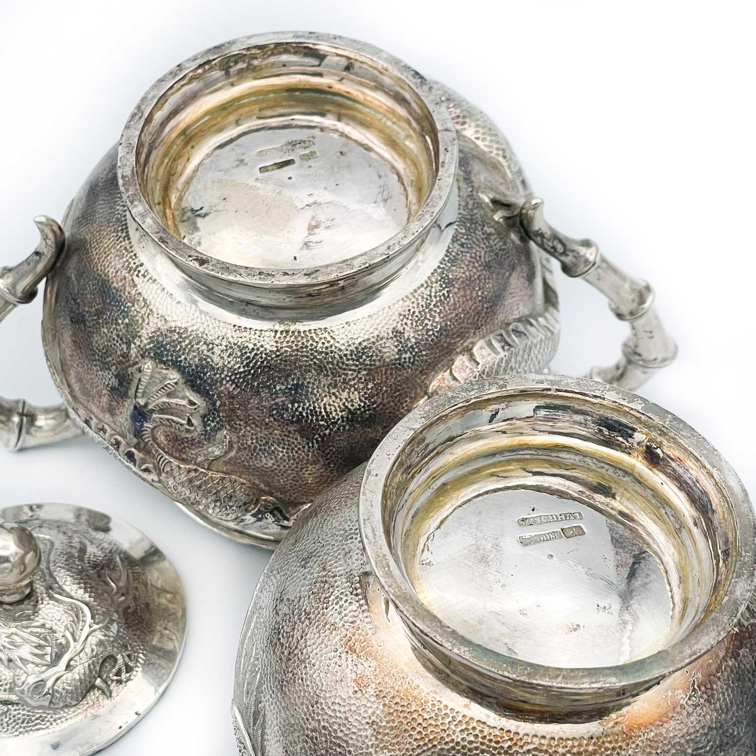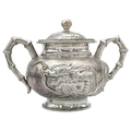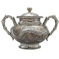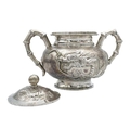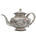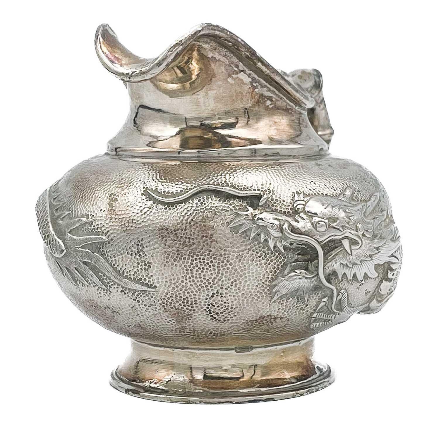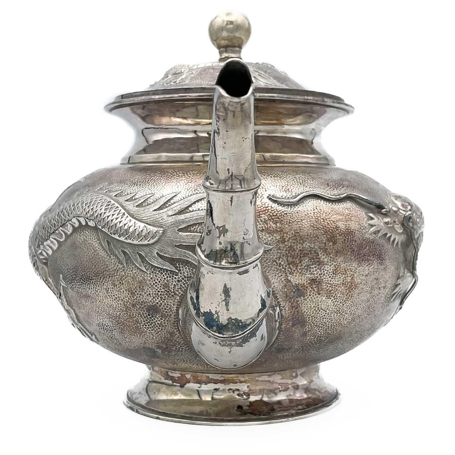 A Chinese silver three-piece tea service, late 19th century. Makers marks for Woshing, Shanghai, comprising a teapot, milk jug and sugar bowl, with simulated bamboo handles and spout, the body decorated with dragons in high relief, teapot size: height 15cm, length 24.5cm, diameter 14.5cm, total weight 1120 grams. (3)