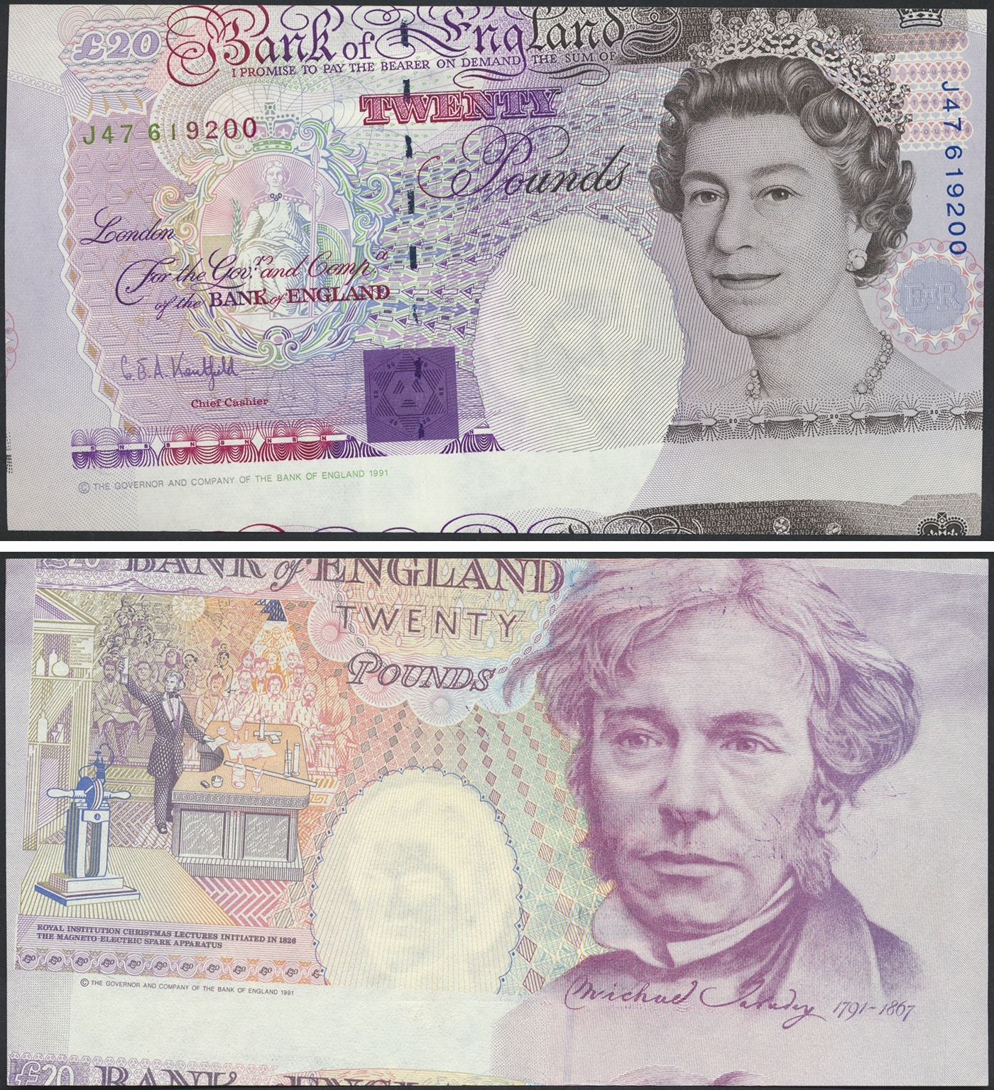 G.E.A. Kentfield. Error £20 J47 619200 design misplaced, angled slightly to left with design shifted up and to right, part of below note visible, near uncirculated. (BNYB E4a(i)) (N)