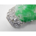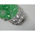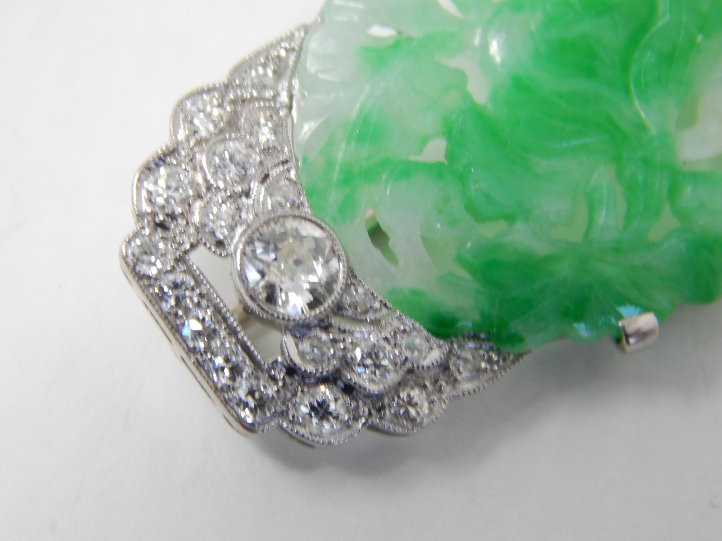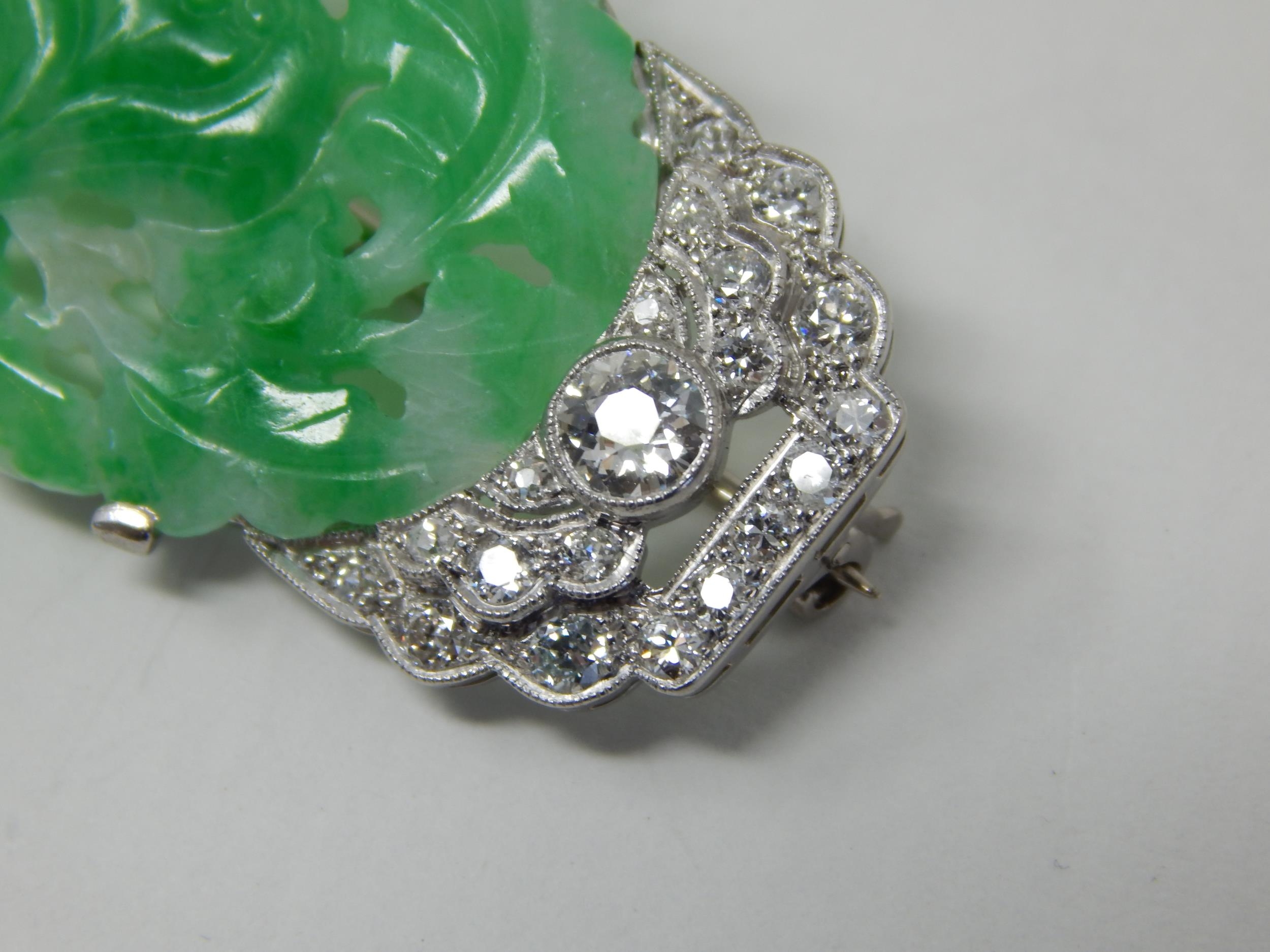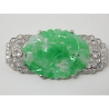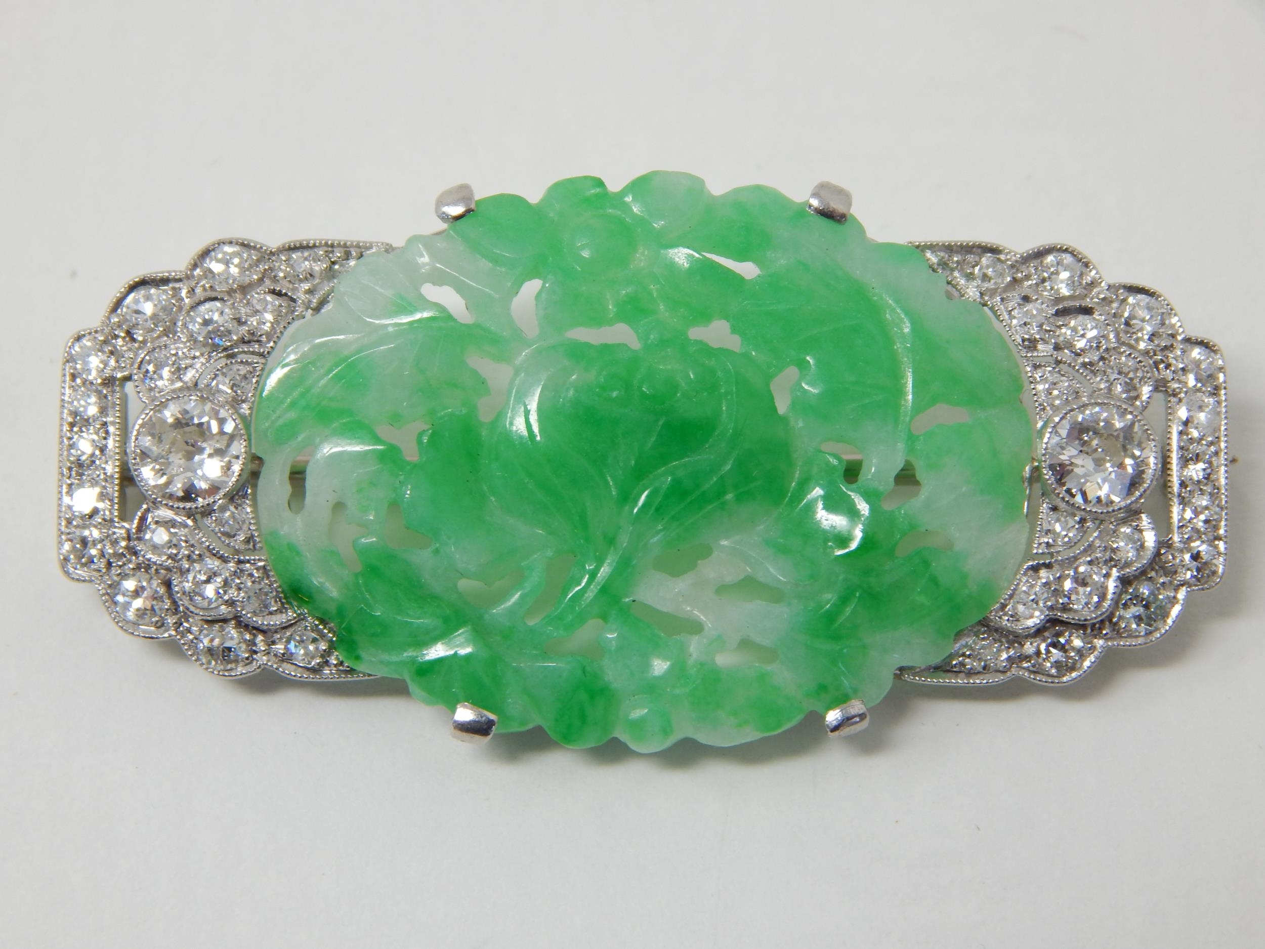Art Deco Diamond & Jade Brooch Mounted in Unmarked Platinum possibly by Cartier. The Oval Jade Panel Carved with Central Flower Amongst Foliage. The Diamonds Estimated @ 2.0cts G/H SI1. Measuring 4.6cm x 2.2cm