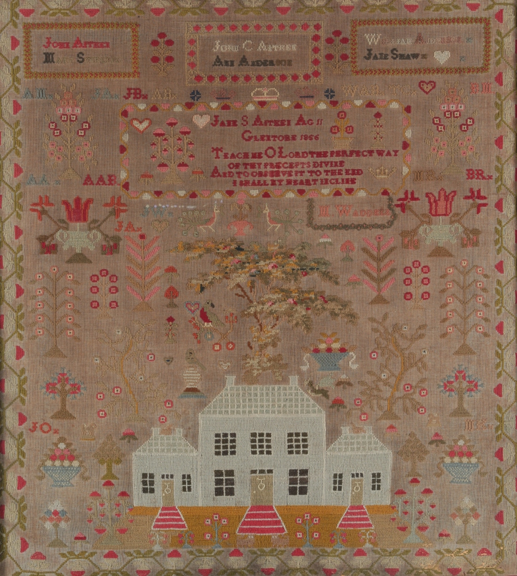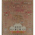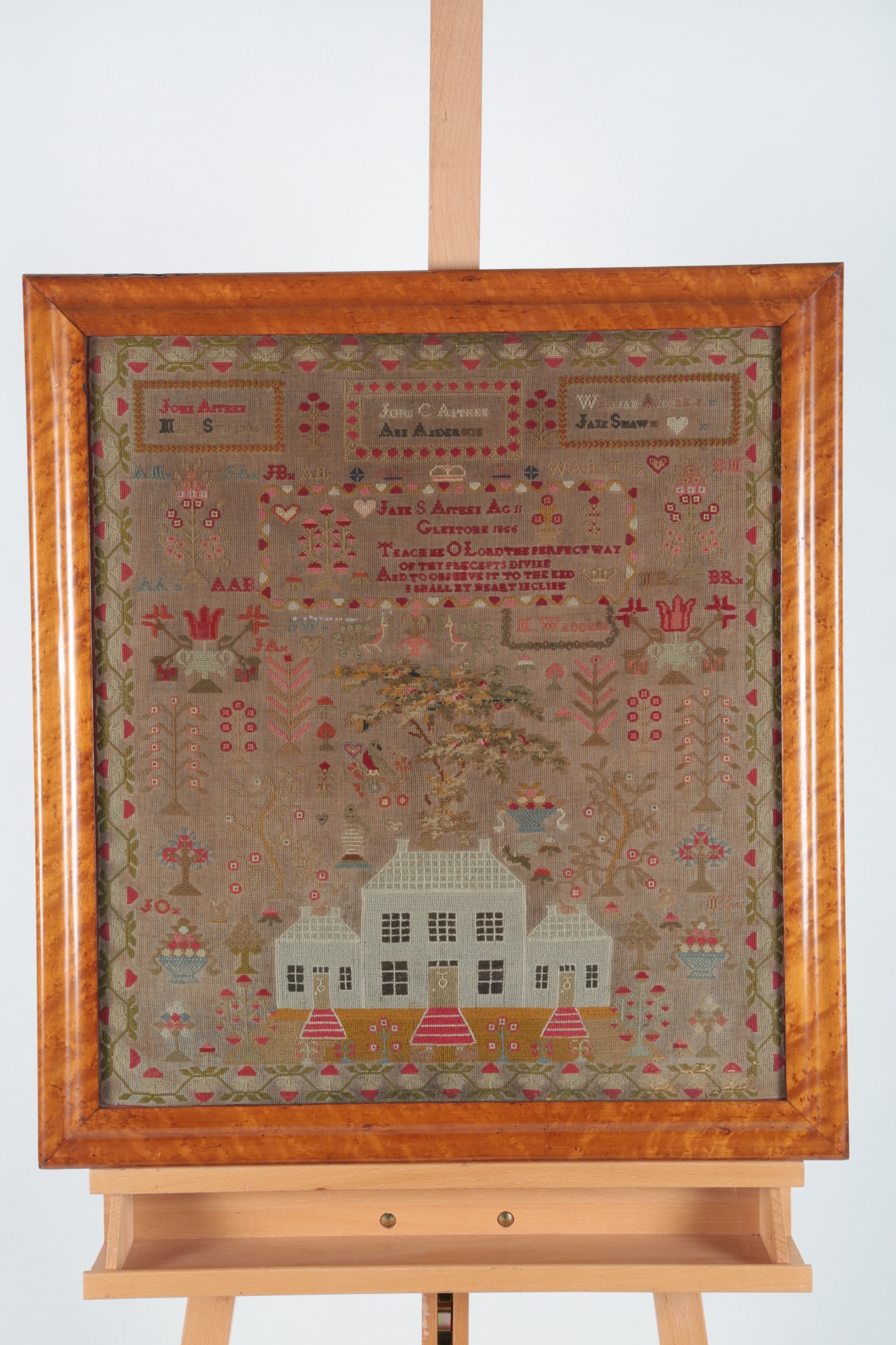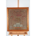 A 19th century maple framed sampler by Jane S Aitken, dated 1856, embroidered with religious verse and motifs of peacocks, flowers and trees and a large house at the base, bordered with a vining border, 59cm x 53cm.