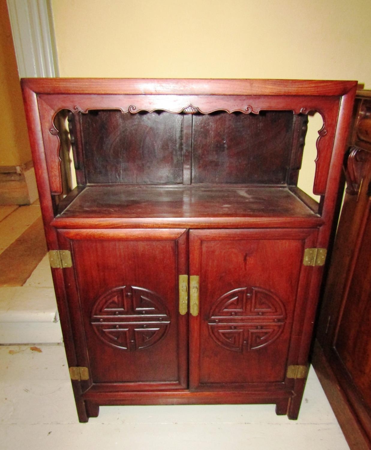 Antique Carved Hardwood Chinese Side Cabinet with Twin Doors Below Brass Mounted Approximately 28 Inches Wide x 32 Inches High