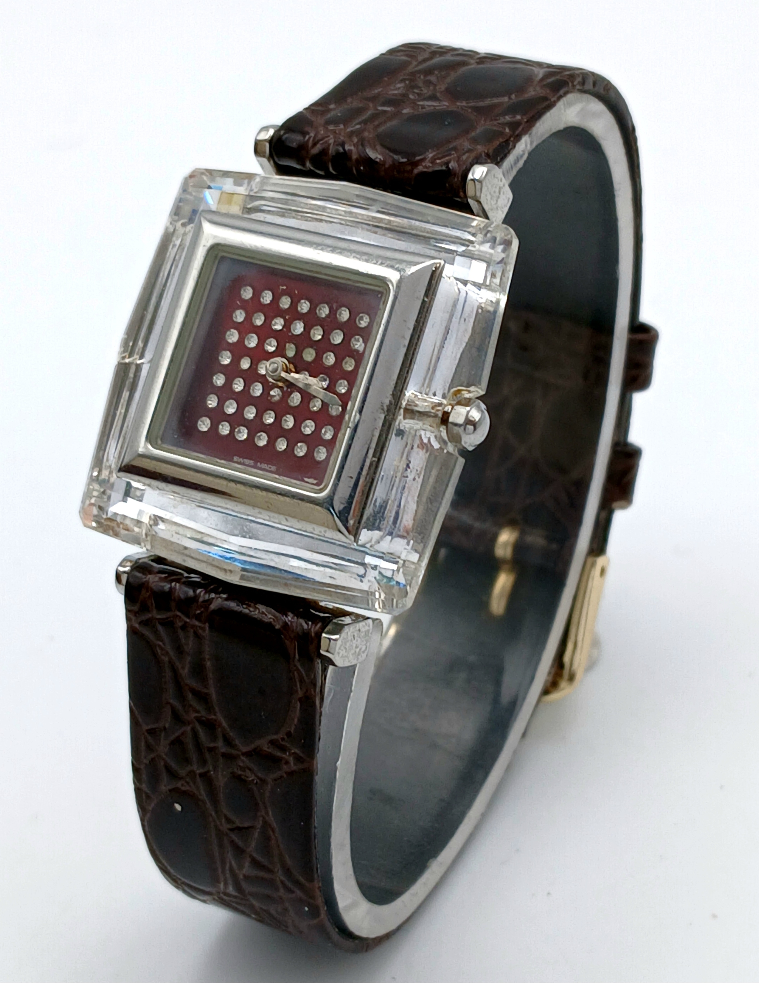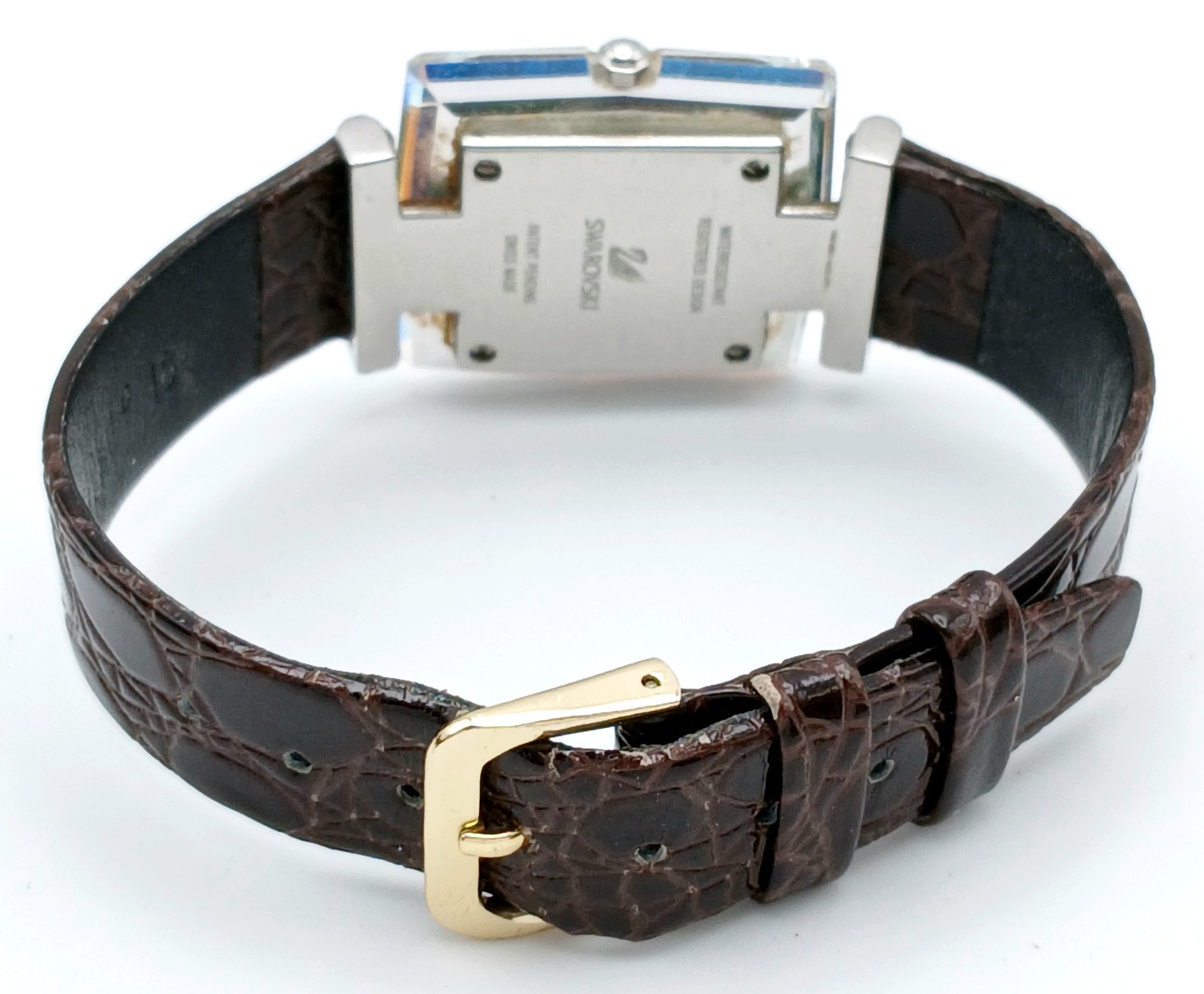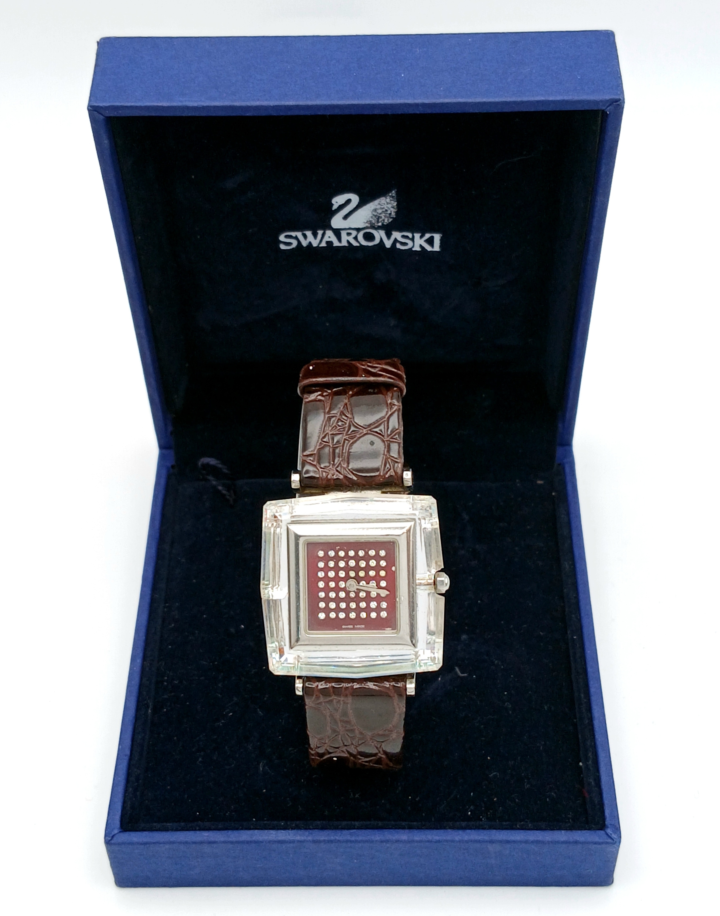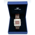 A SWAROVSKI, BROWN LEATHER STRAP WATCH. IN A SWAROVSKI BOX. IN FULL WORKING ORDER. NEW BATTERY FITTED RECENTLY. S/A 1605 - 1
