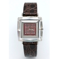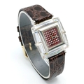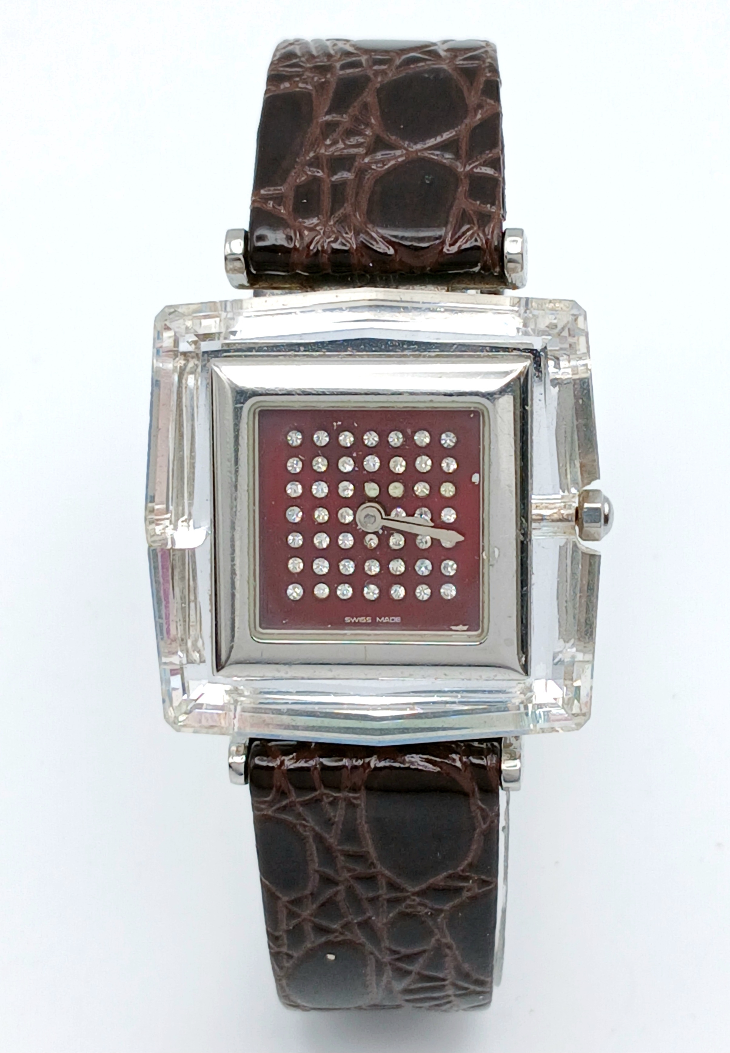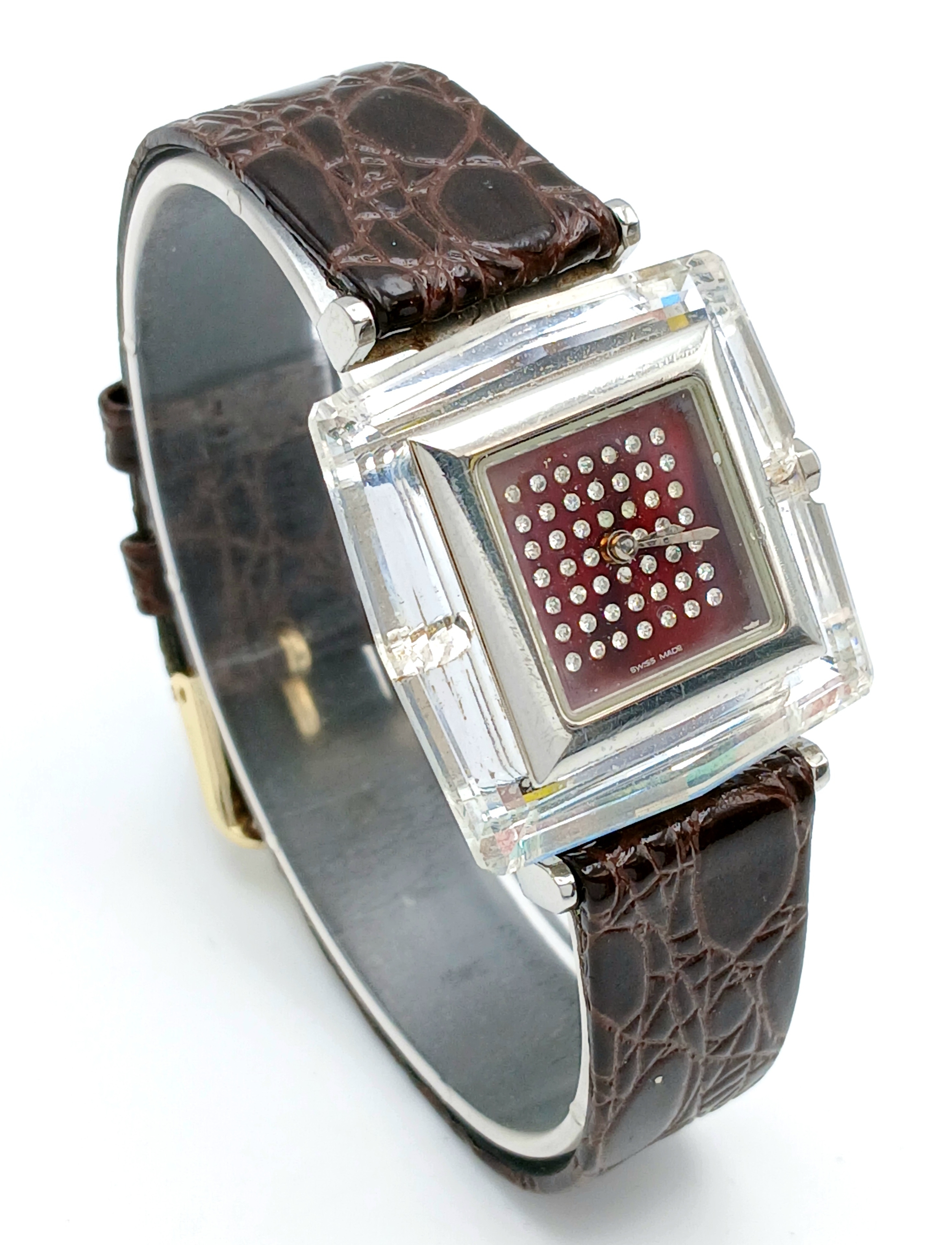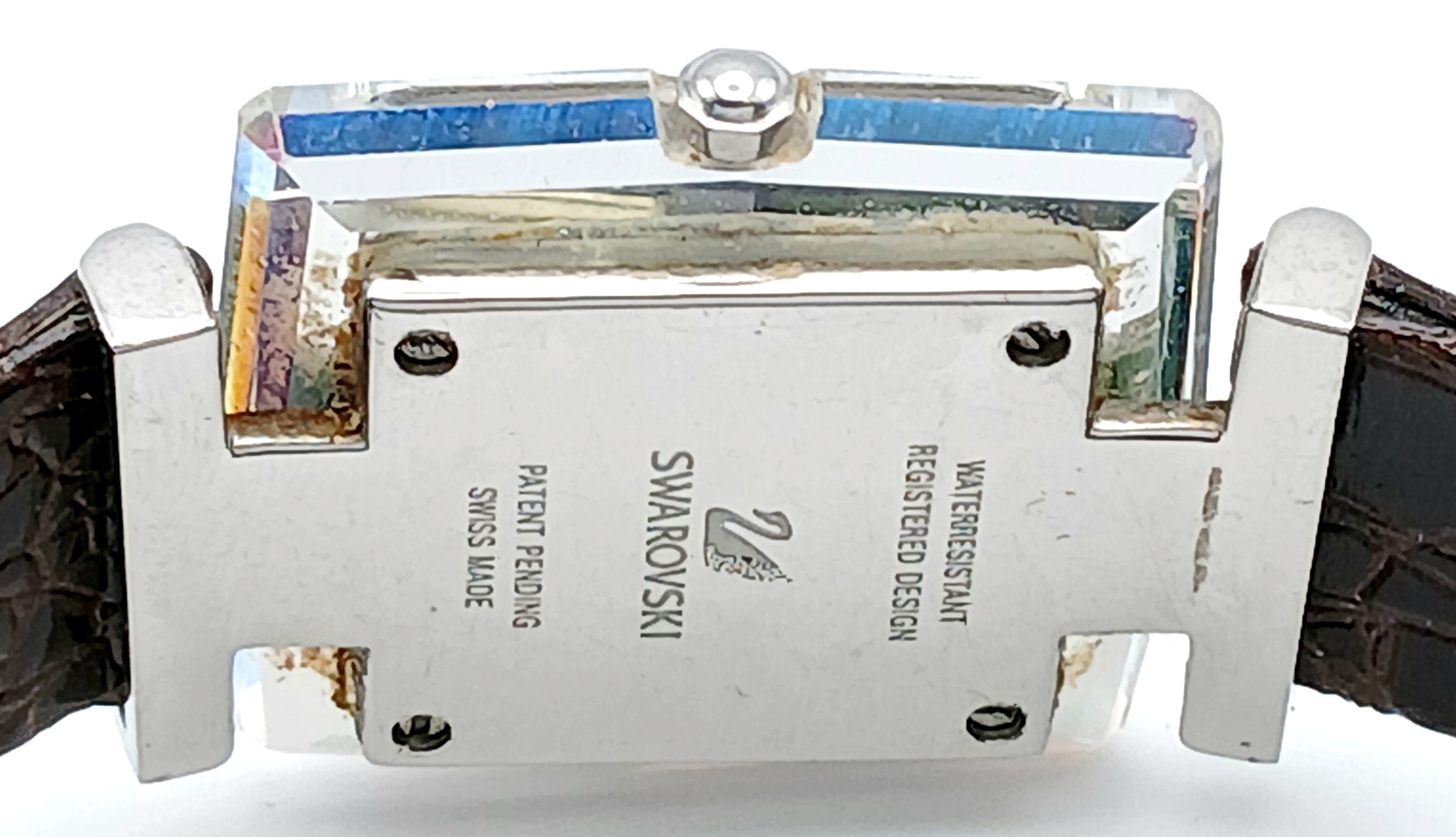 A SWAROVSKI, BROWN LEATHER STRAP WATCH. IN A SWAROVSKI BOX. IN FULL WORKING ORDER. NEW BATTERY FITTED RECENTLY. S/A 1605 - 1