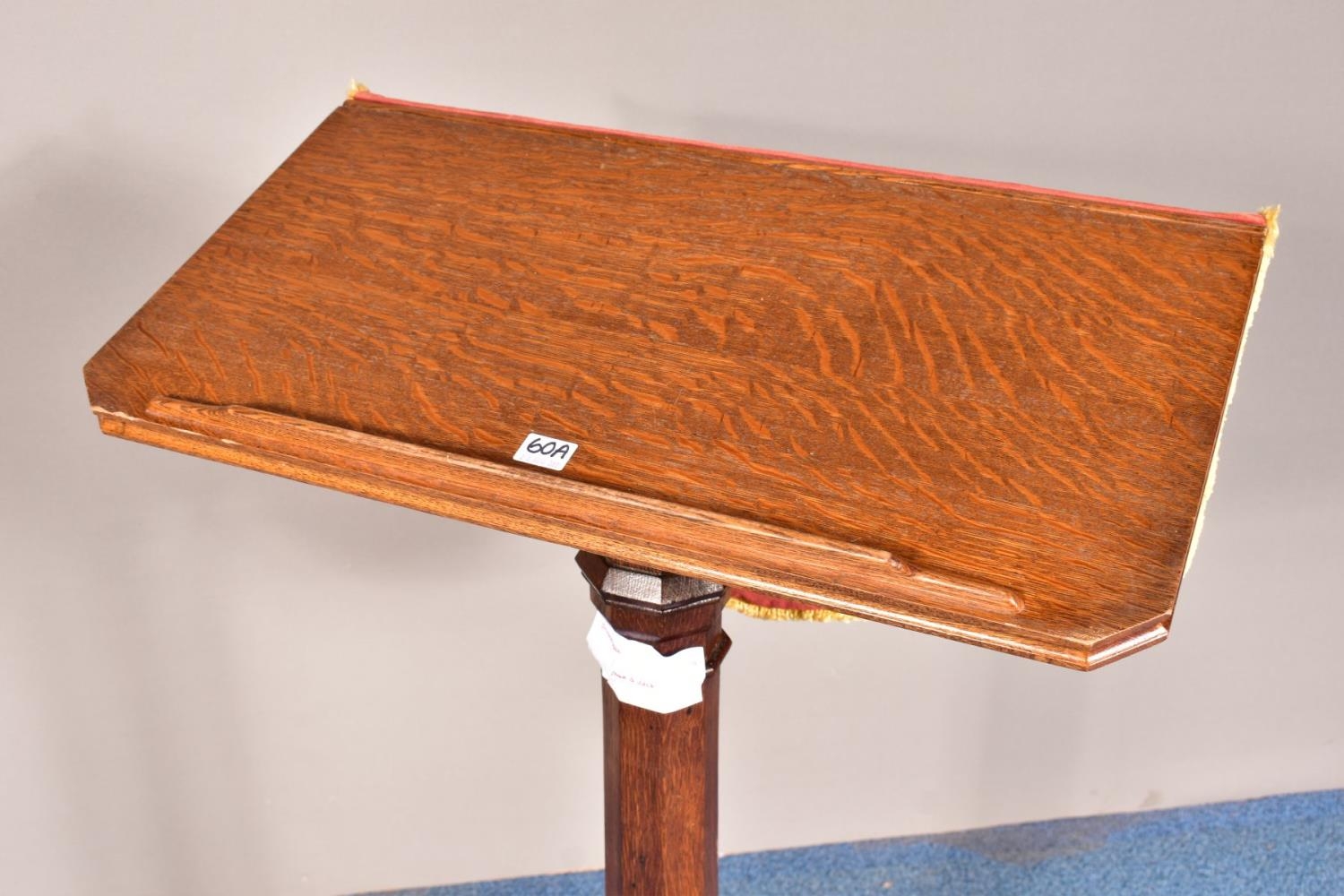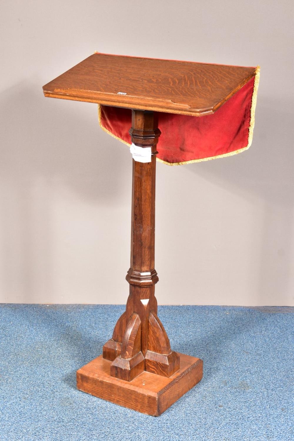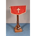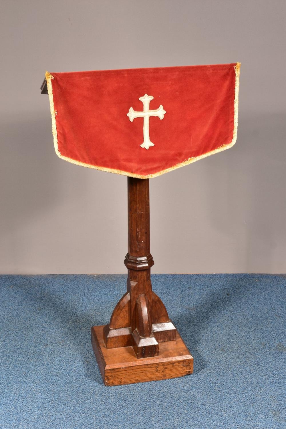 A 20TH CENTURY OAK ECCLESIASTICAL LECTURN, with fabric pulpit fall, height 124cm