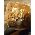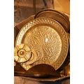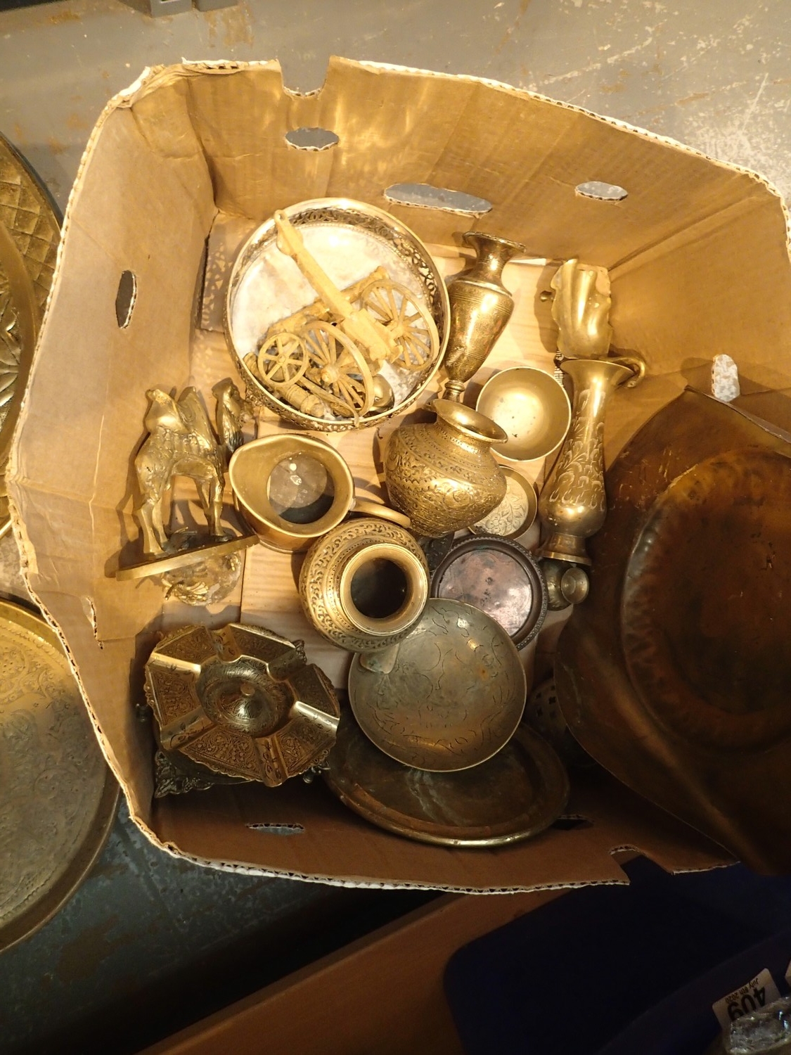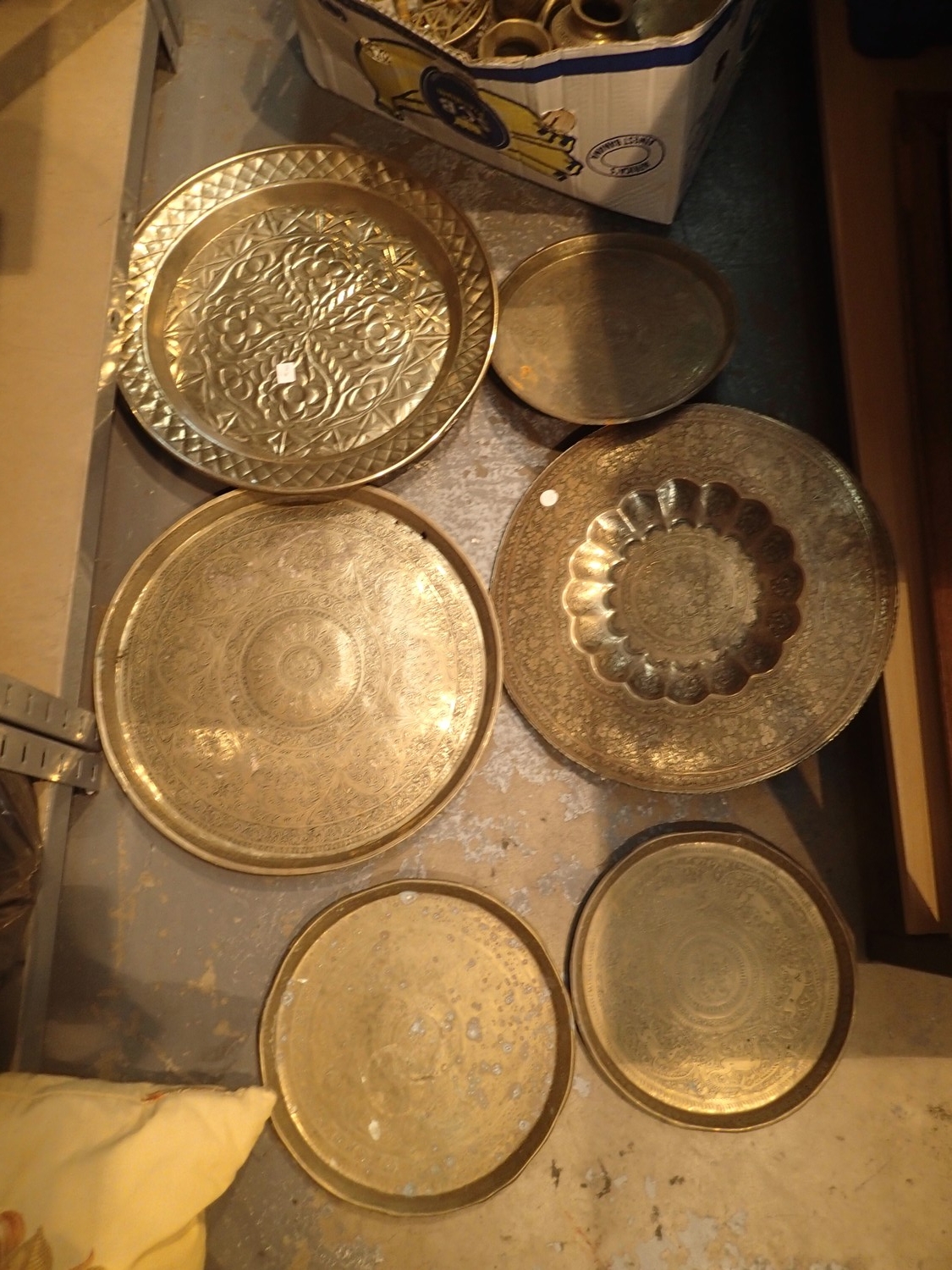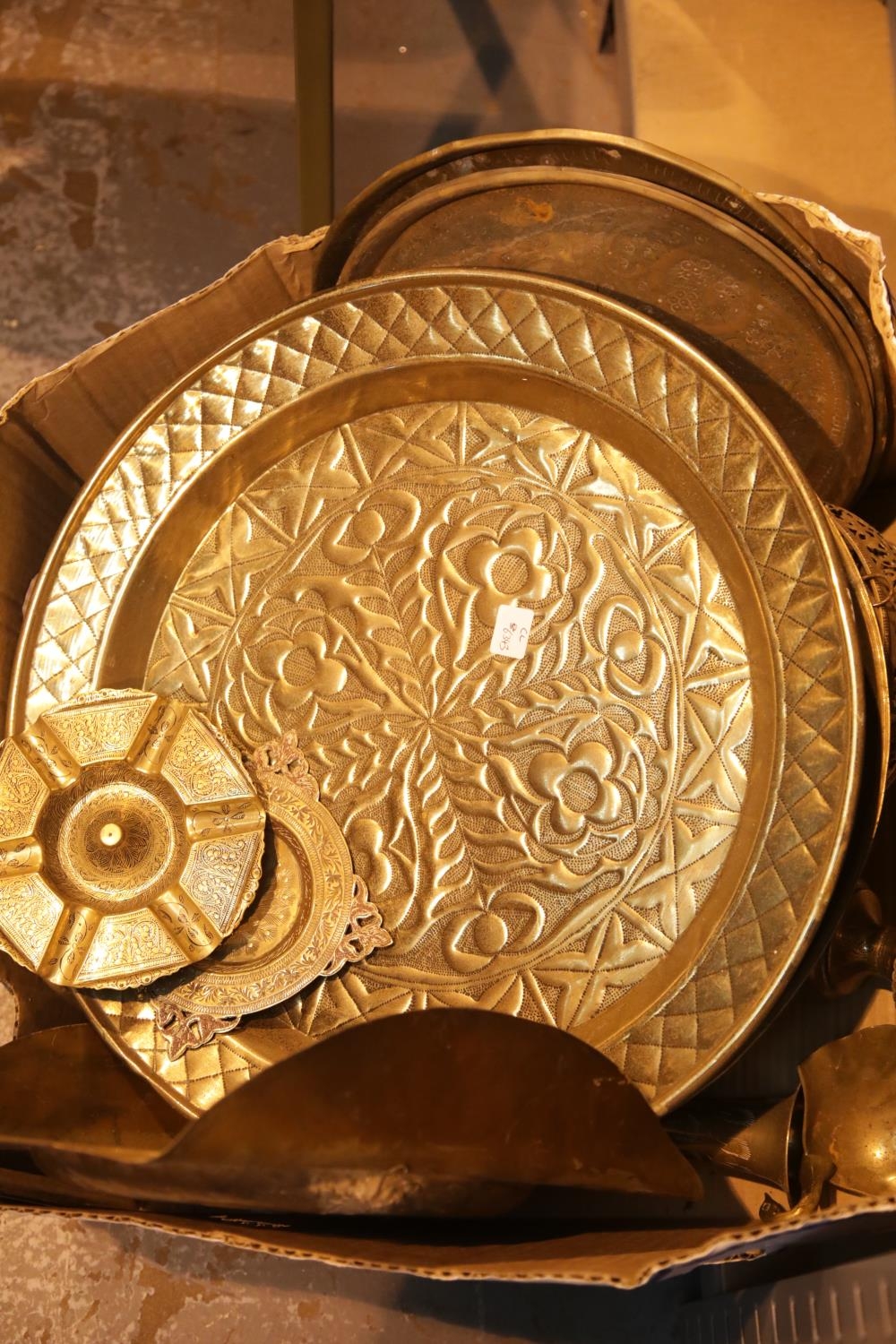 Box of mixed brass including chargers. This lot is not available for in-house P&P.