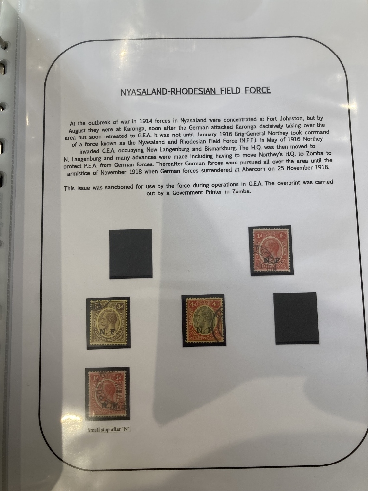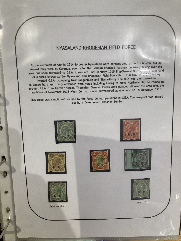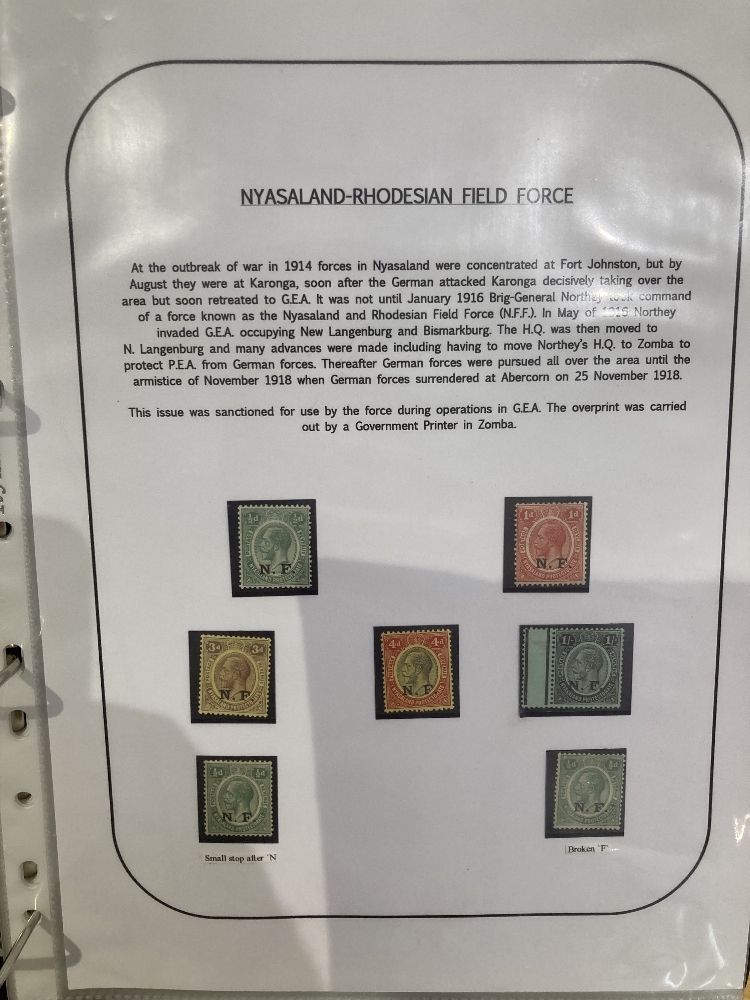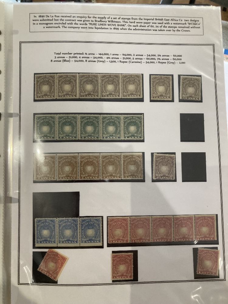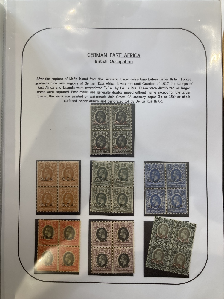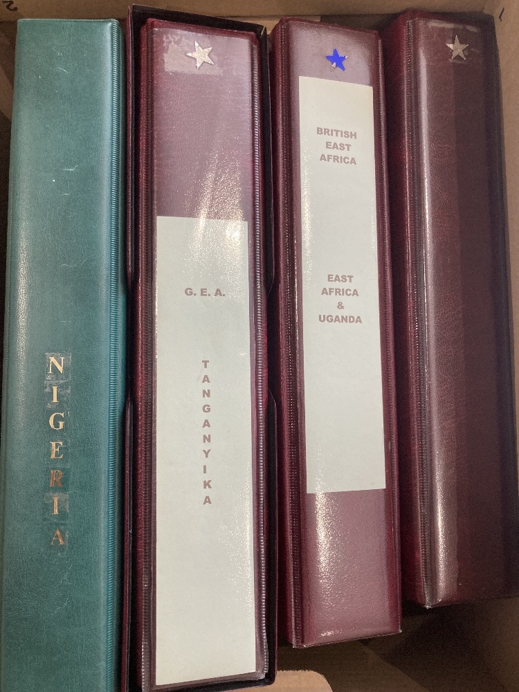 STAMPS BRITISH AFRICA, a mint & used collection of British East Africa & Nigeria, housed in four binders. Includes 1914 Nyasaland-Rhodesian Field Force set mint & to 4d used, 'G.E.A.' overprinted GV issues to 10r mint, Tanganyika GV issues to 5/- used, 1894 British East Africa issues to 5r, 1897 to 3r used (dubious pmk), East Africa & Uganda GV to 5r used, a useful range of K.U.T. issues with GVI to £1 mint & used, 1948 Wedding pair mint & used. Also a useful selection of Lagos with Northern & Southern Nigeria. A useful lot!