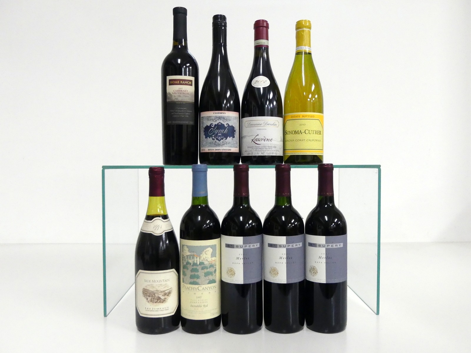 1 bt Jade Mountain Les Jumeaux Red Table Wine 1991 ls 1 bt Peachy Canyon Winery Bin 107 Zinfandel 1997 vts 3 bts St Supery Merlot 2001 Napa Valley vts 1 bt Home Ranch Cabernet Sauvignon 2002 Napa Valley vts 1 bt Marks & Spencer Syrah Bonny Doon Vineyard 2005 Central Coast hf/i.n 1 bt Dom Drouhin Laurène 2007 Oregon ts 1 bt Sonoma-Cutrer Chardonnay 2010 i.n Above 9 bottles