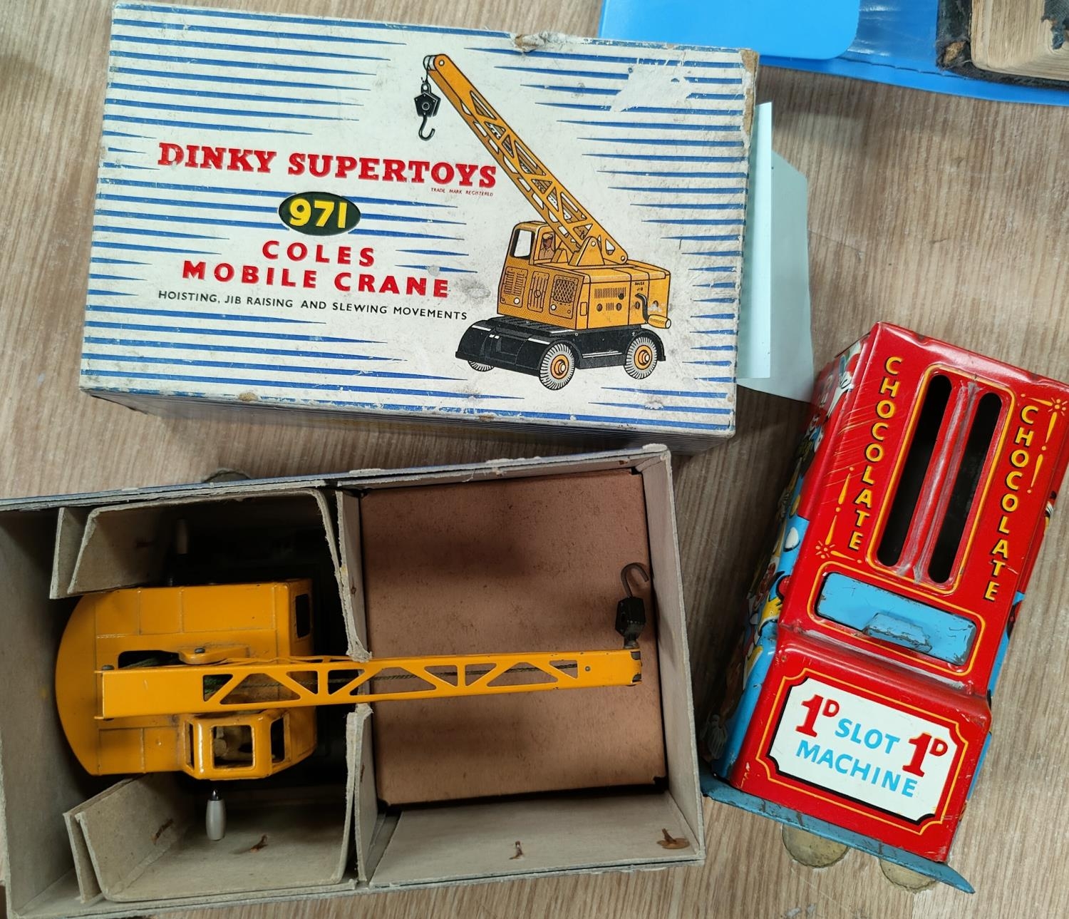 A Dinky Supertoys 971 Coles Mobile Crane, original box; a tinplate 1d slot chocolate dispenser.