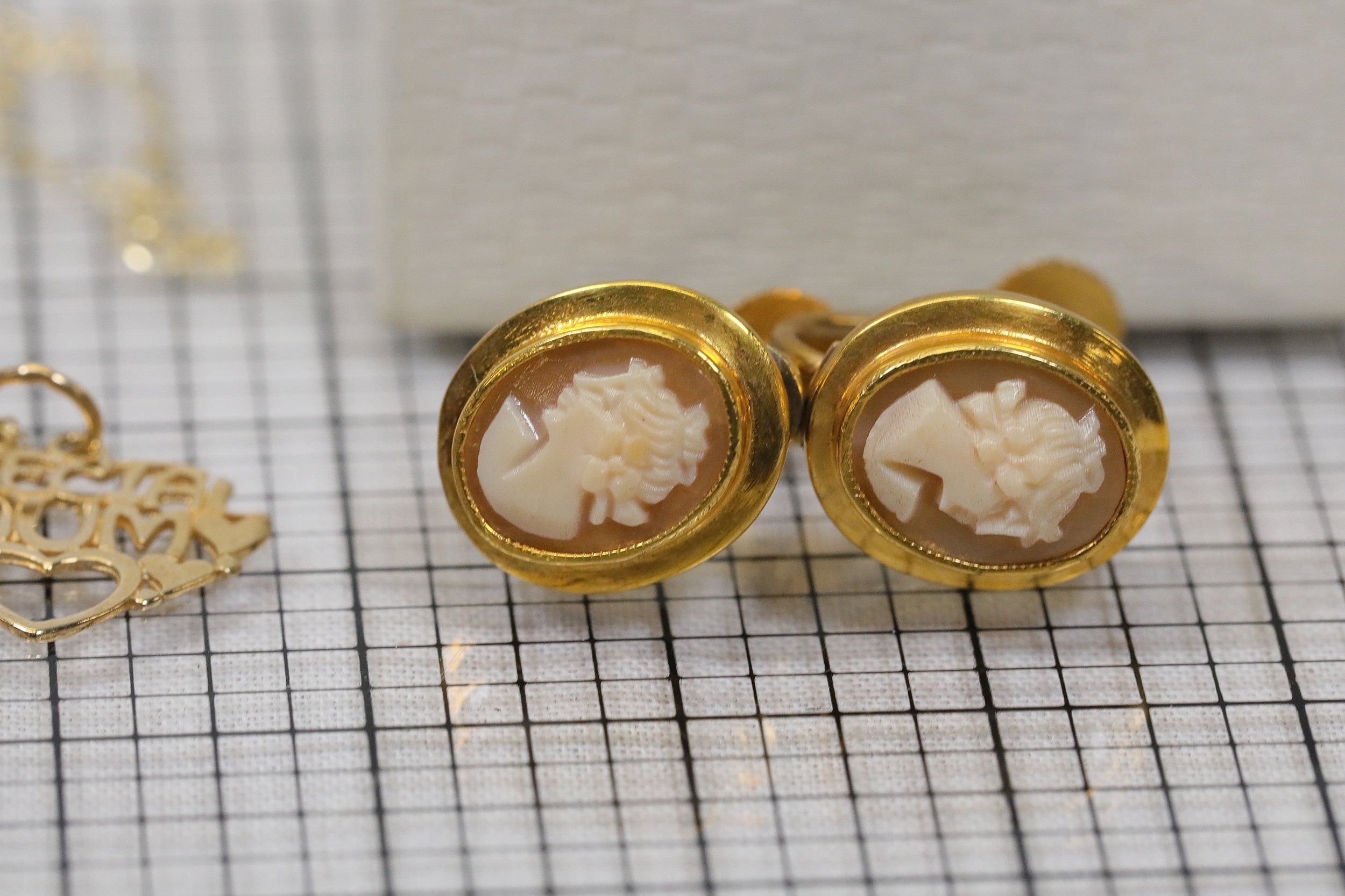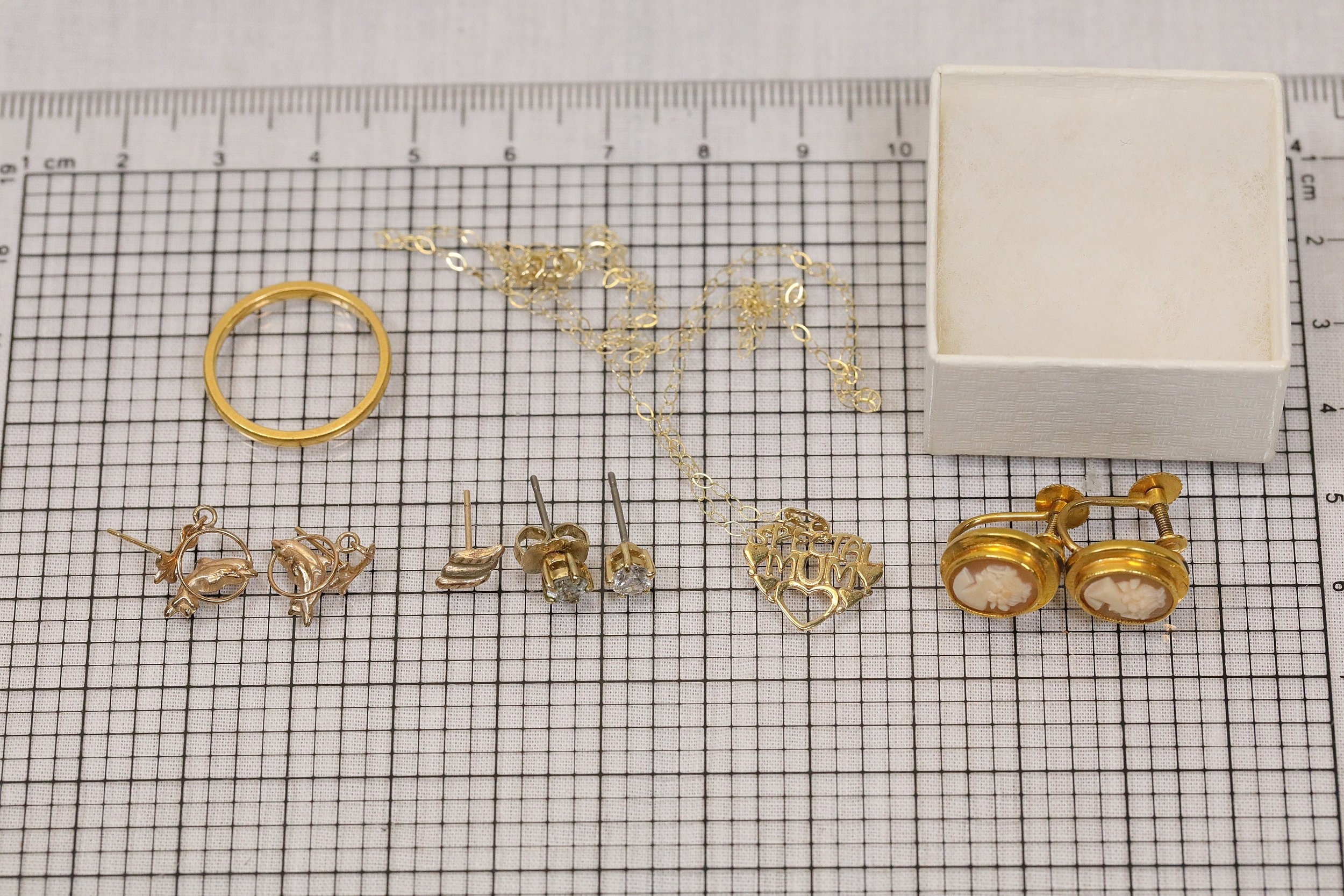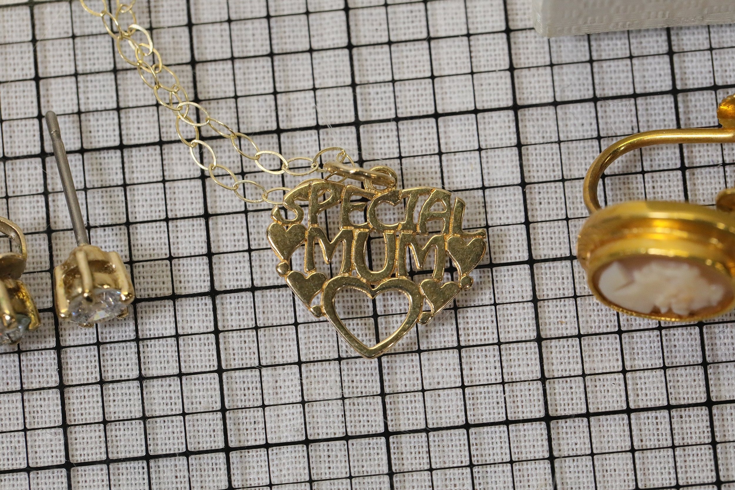 Assorted gold jewellery with SPECIAL MUM pendant, dolphin and cameo earrings, 7.74 grams