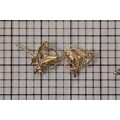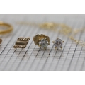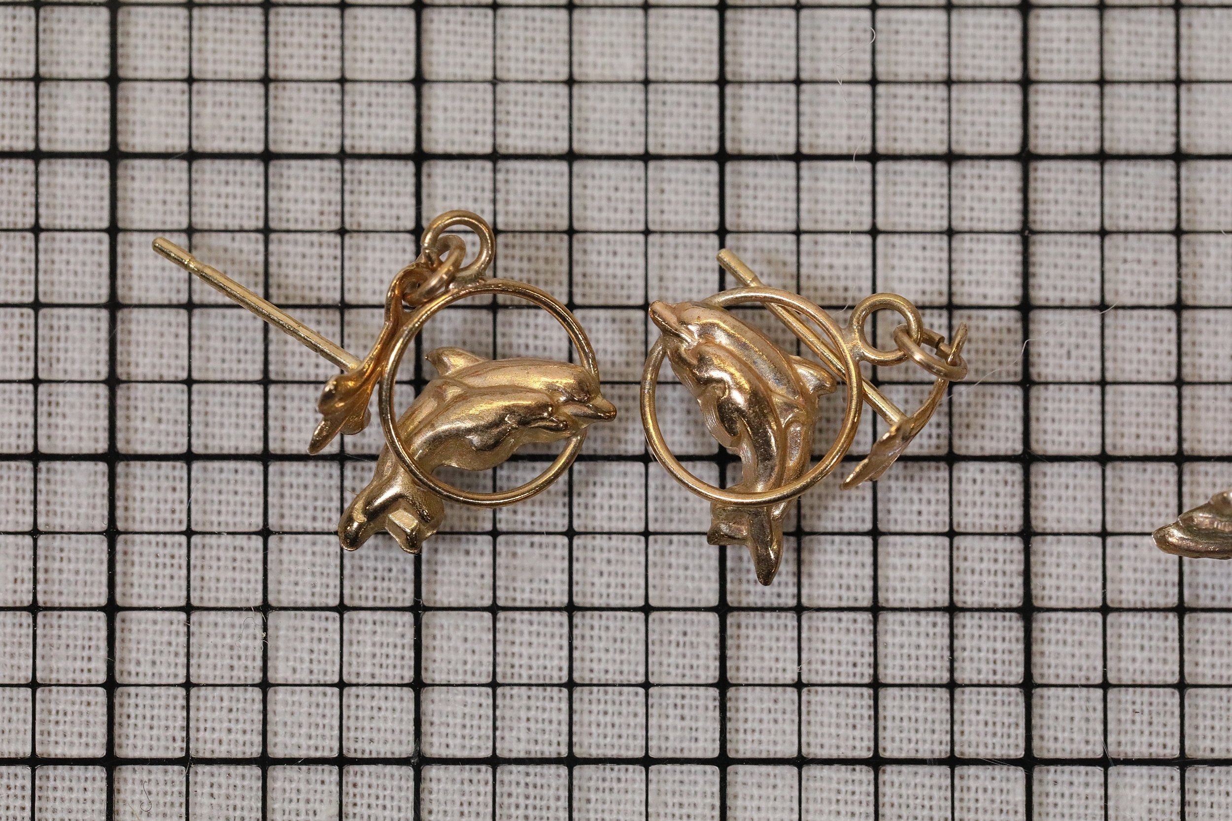 - Three pairs of earrings: dolphin figures within circular hoops with post fittings; textured wavy studs; clear faceted stone studs