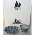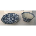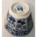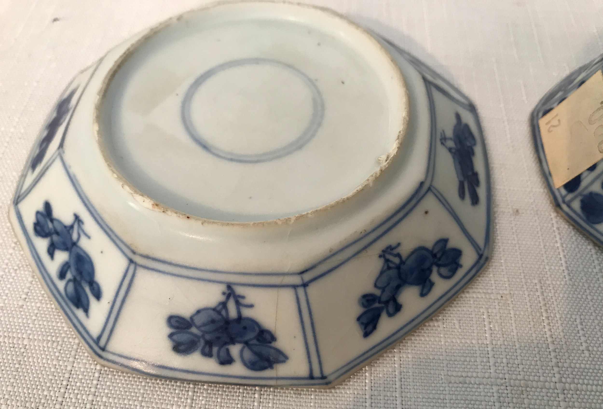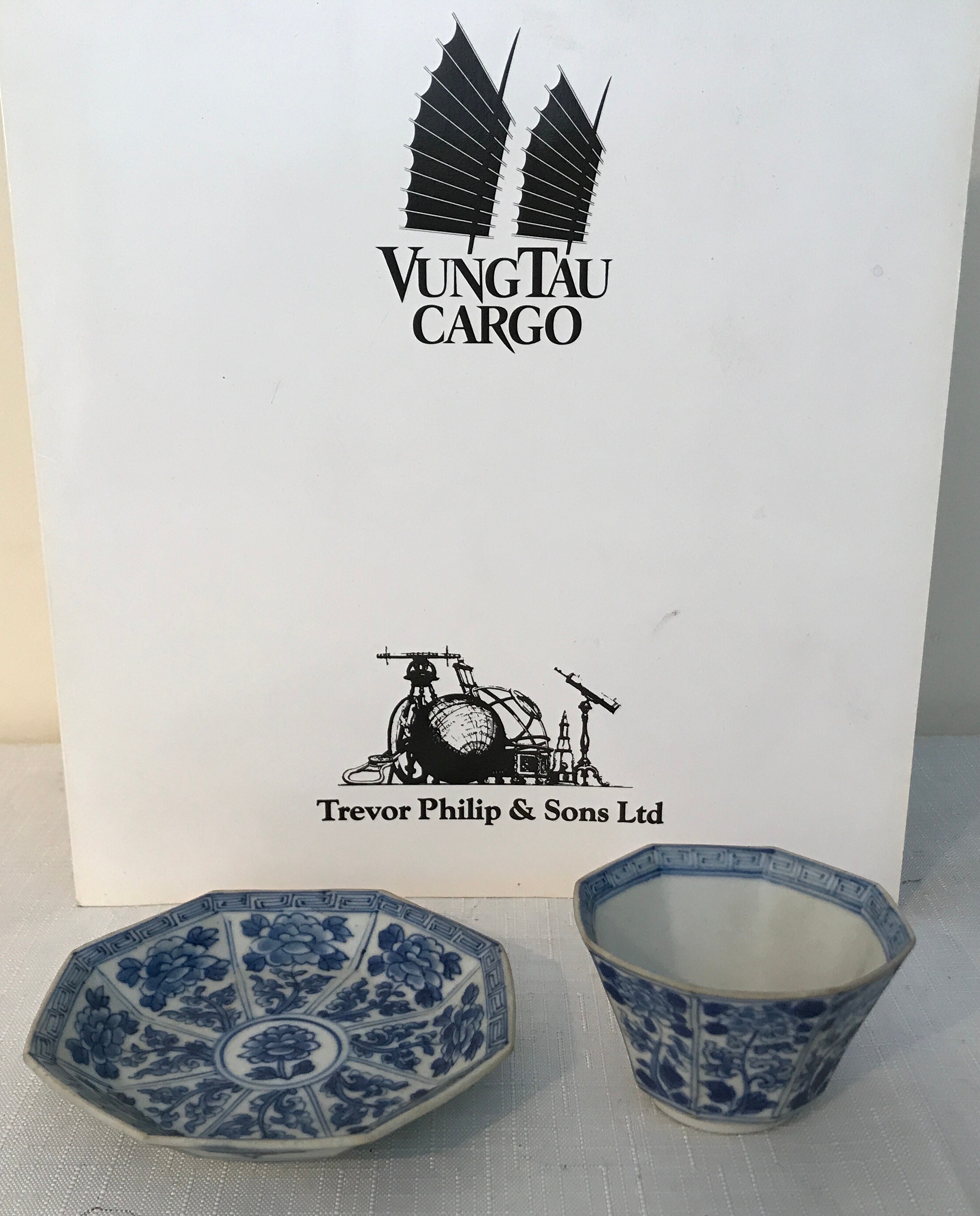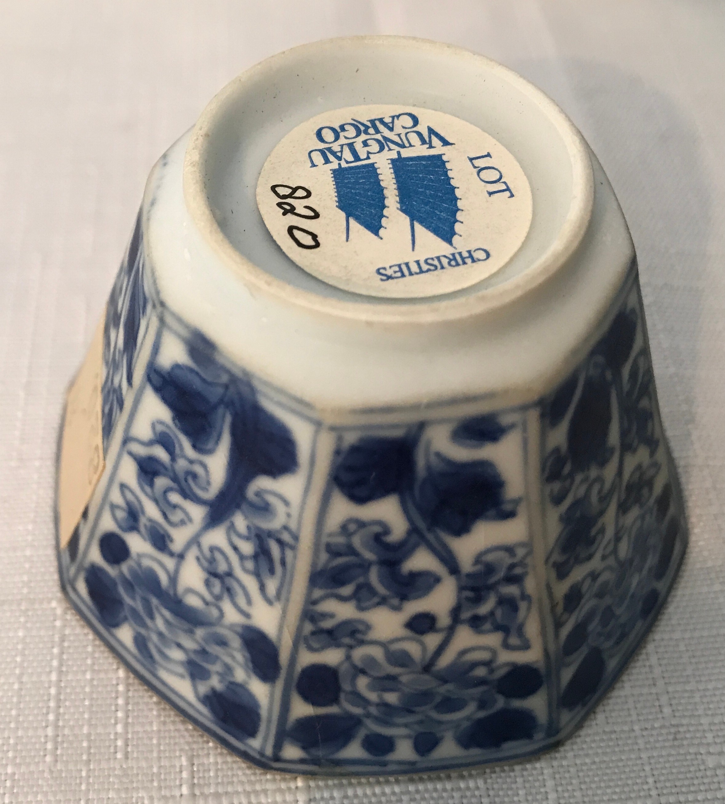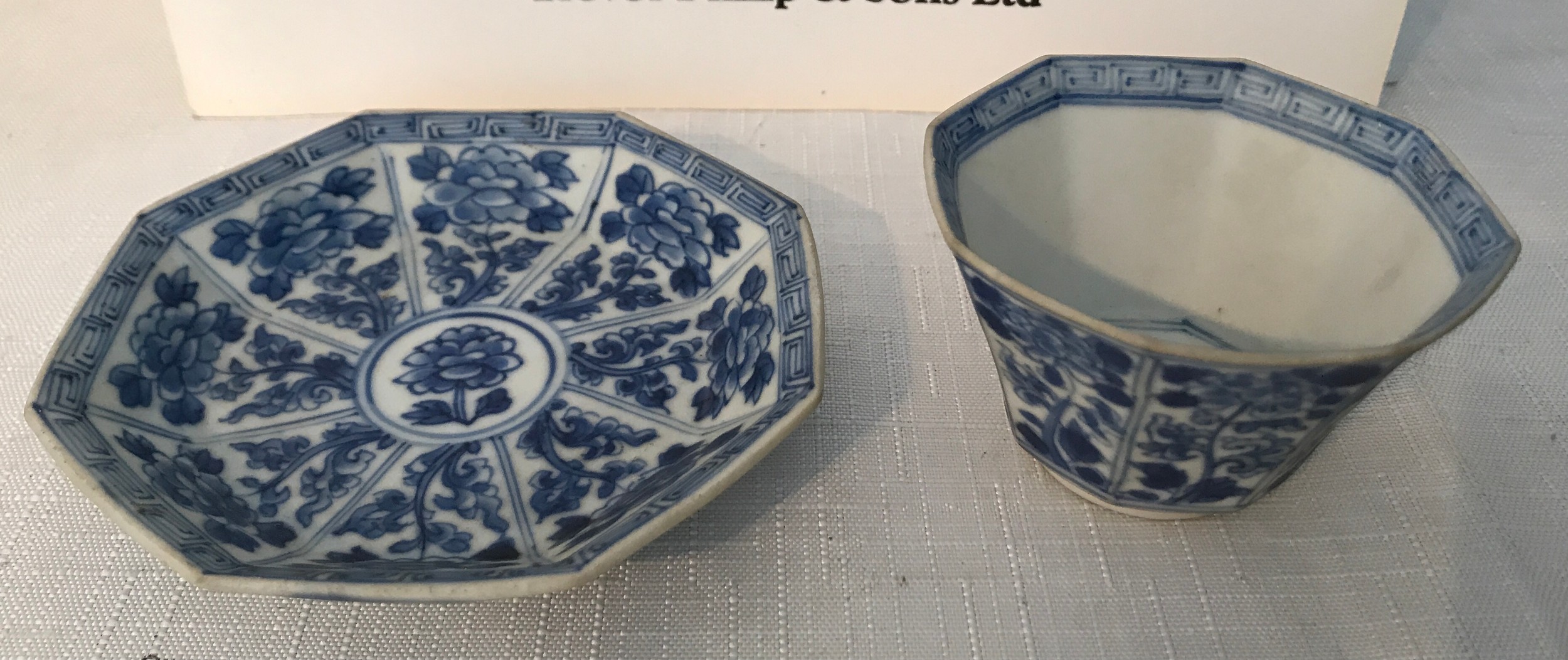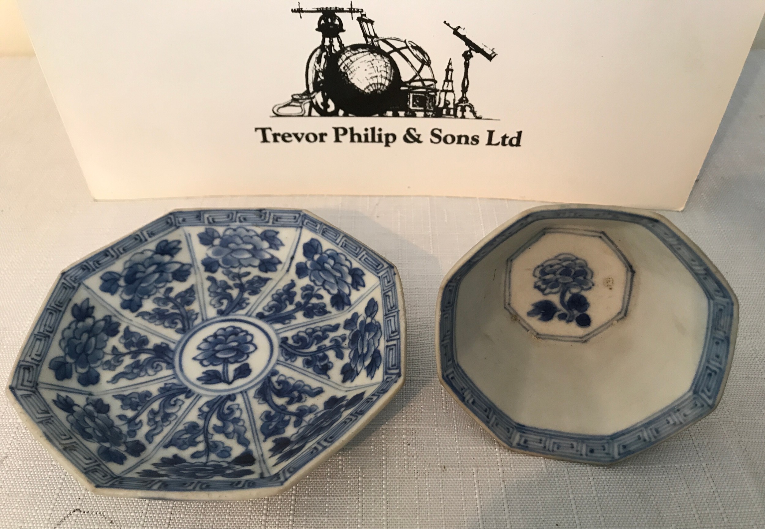 Vung Tau Cargo blue and white Chinese octagonal tea bowl and saucer, each painted with panels of floral stems c 1690. Saucer 9.5cms d and cup 6.5cms d x 4.5cms h.