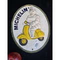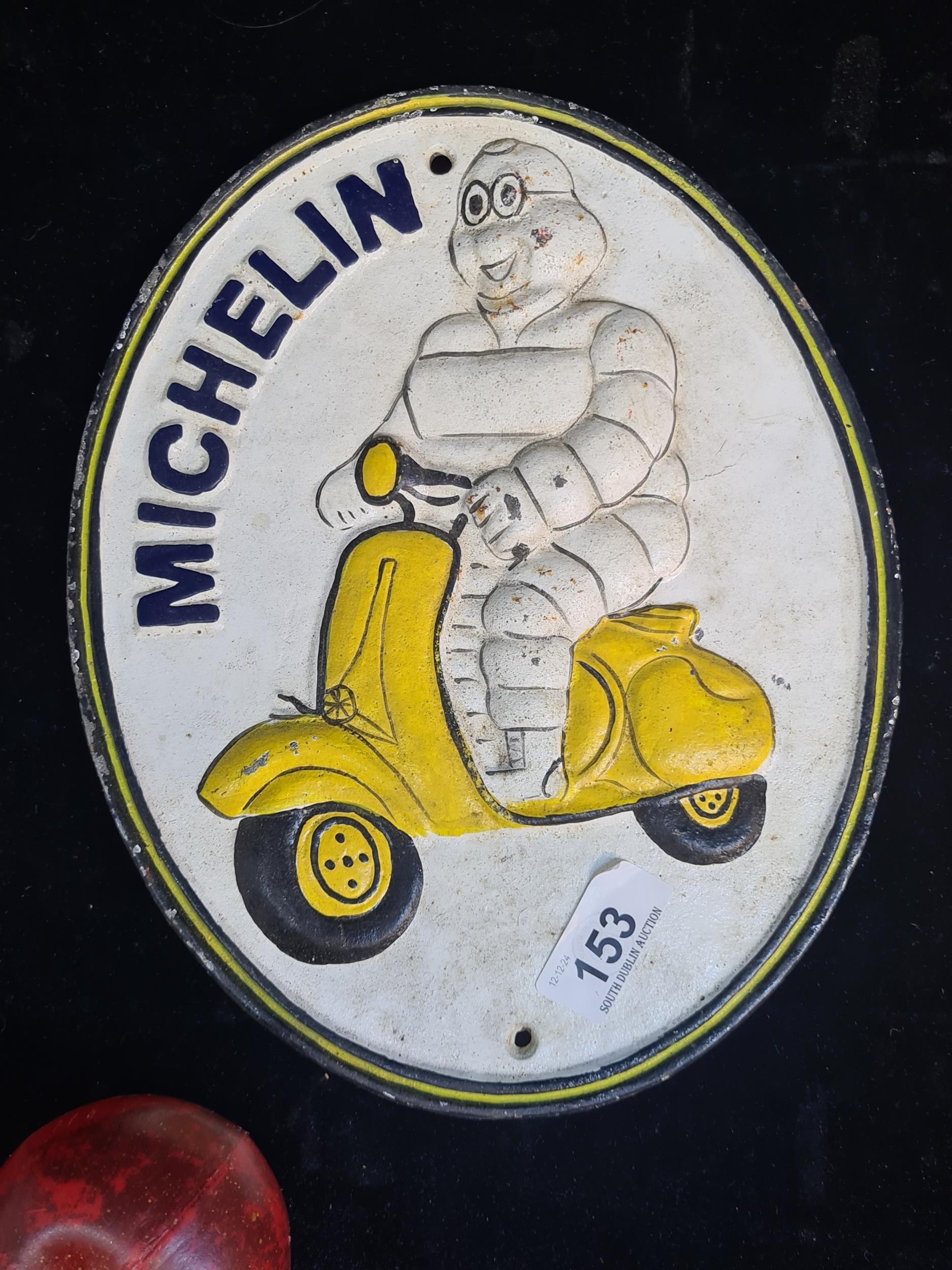 A hand painted heavy cast metal oval wall plaque advertising Michelin Tyres.