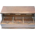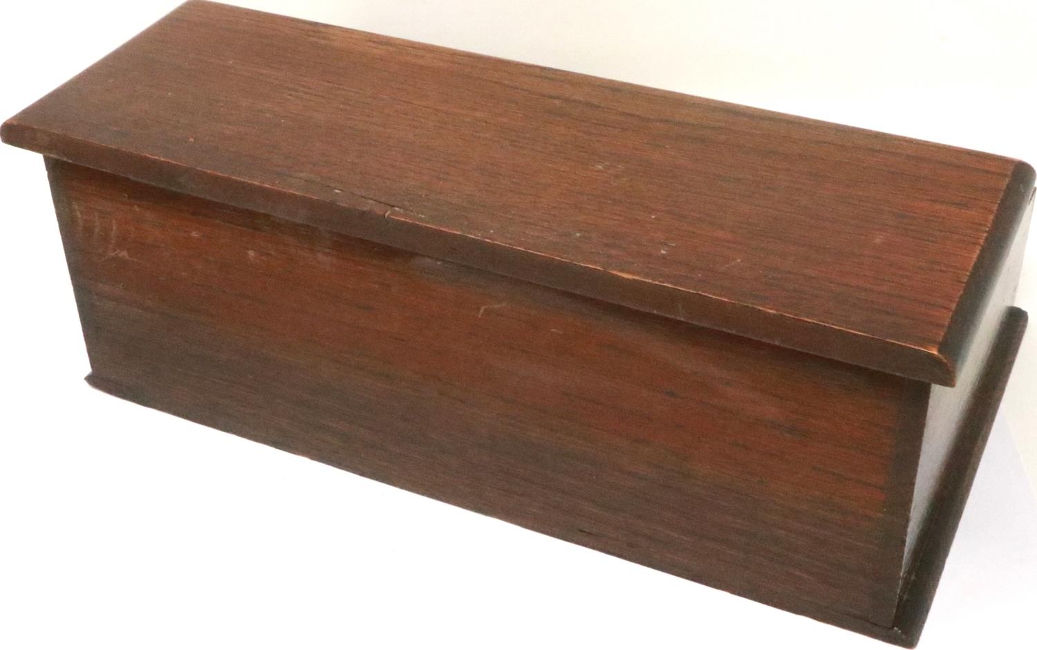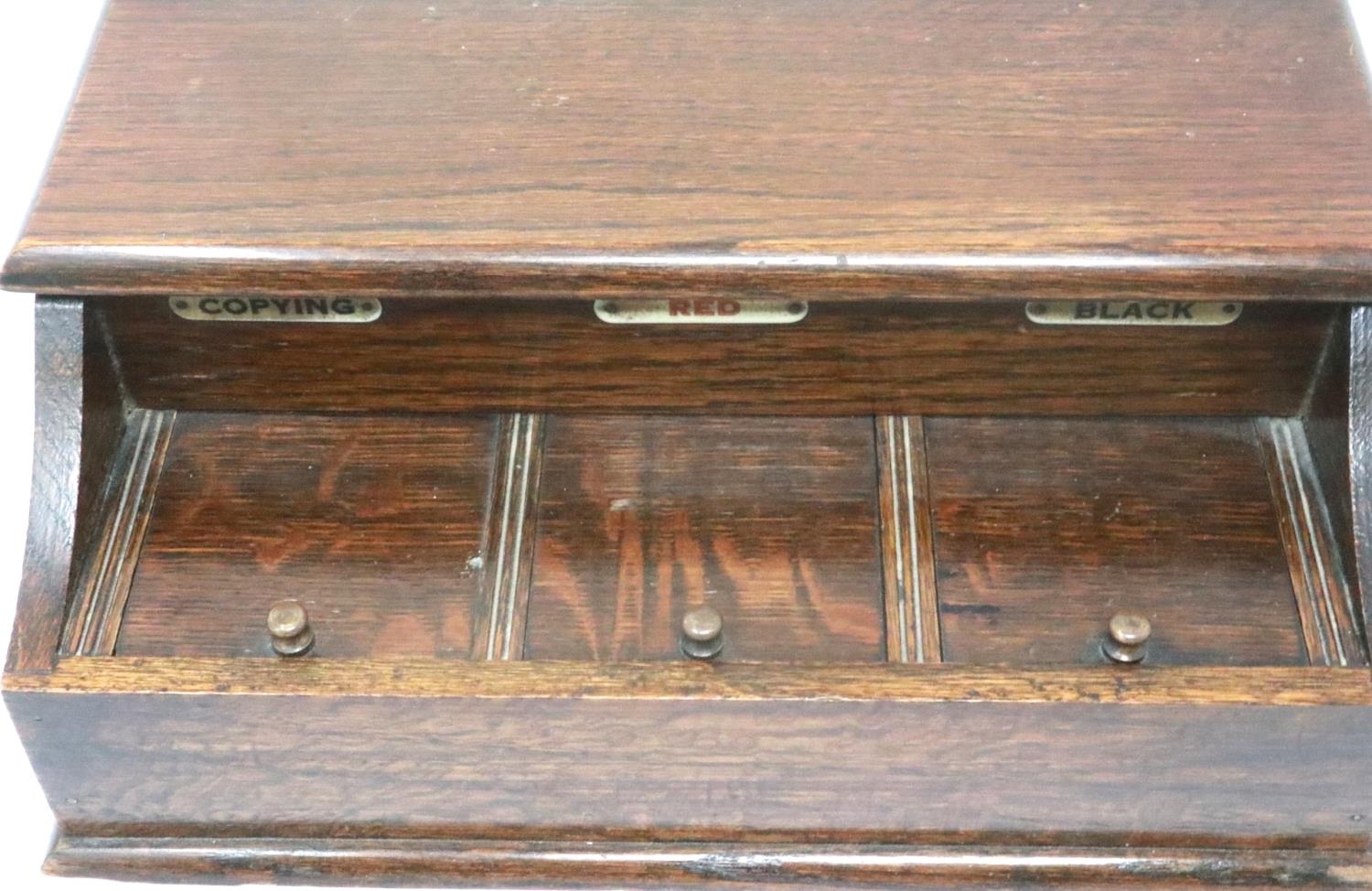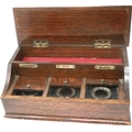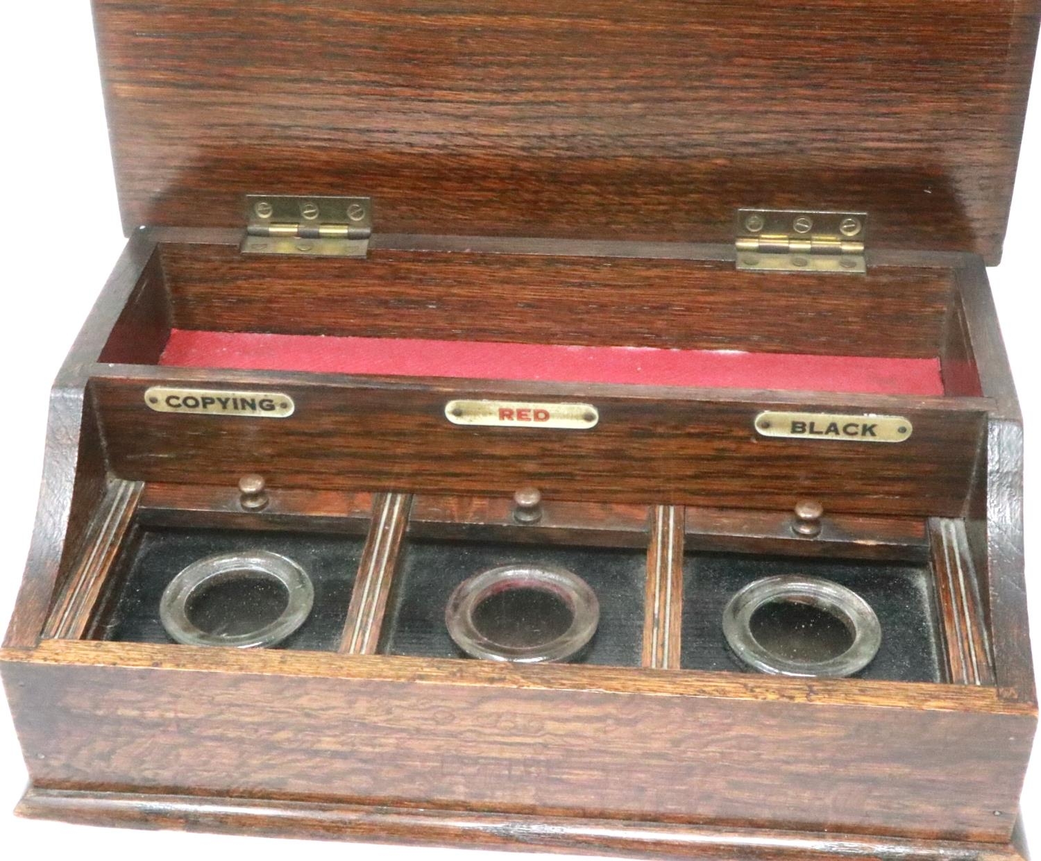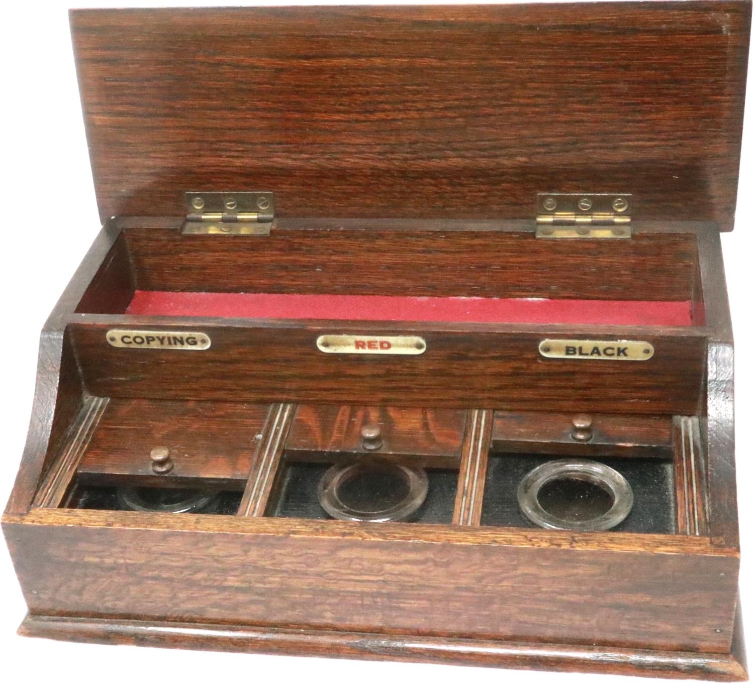 Oak triple inkwell and pen box, 27 x 16 x 10 cm H. P&P Group 2 (£18+VAT for the first lot and £3+VAT for subsequent lots)