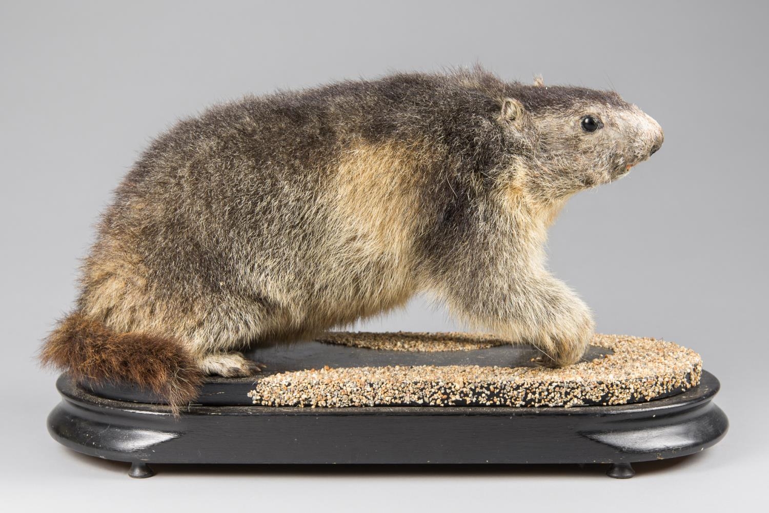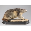 A LATE 20TH CENTURY TAXIDERMY ALPINE MARMOT UPON A VICTORIAN EBONISED BASE. (h 30cm x w 50cm x d 22cm)
