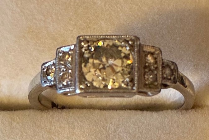 Art Deco platinum and diamond ring, the centre stone approx 0.5 carats flanked by six diamonds, gross weight 3.89 grams.