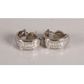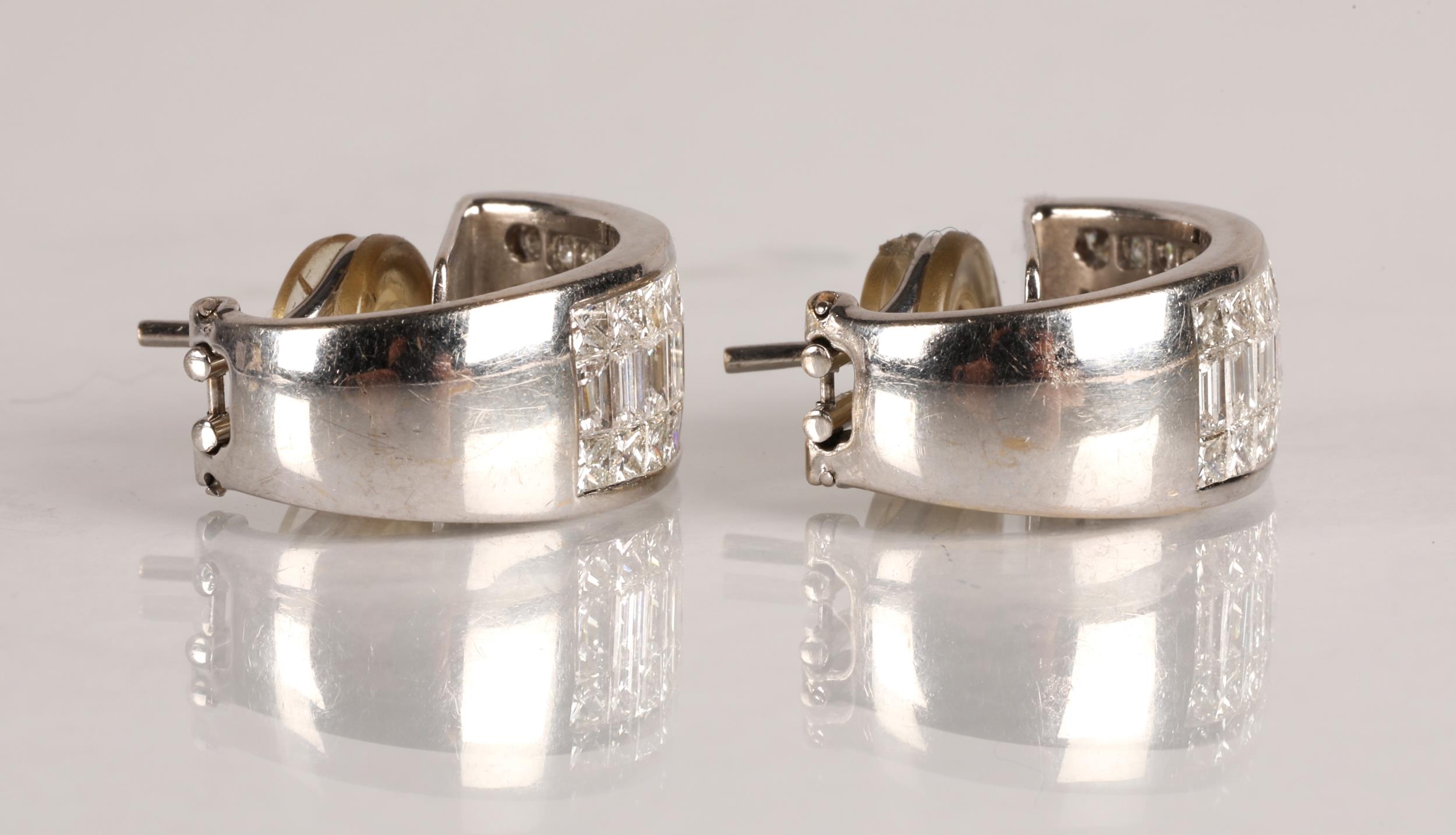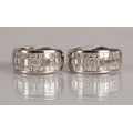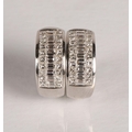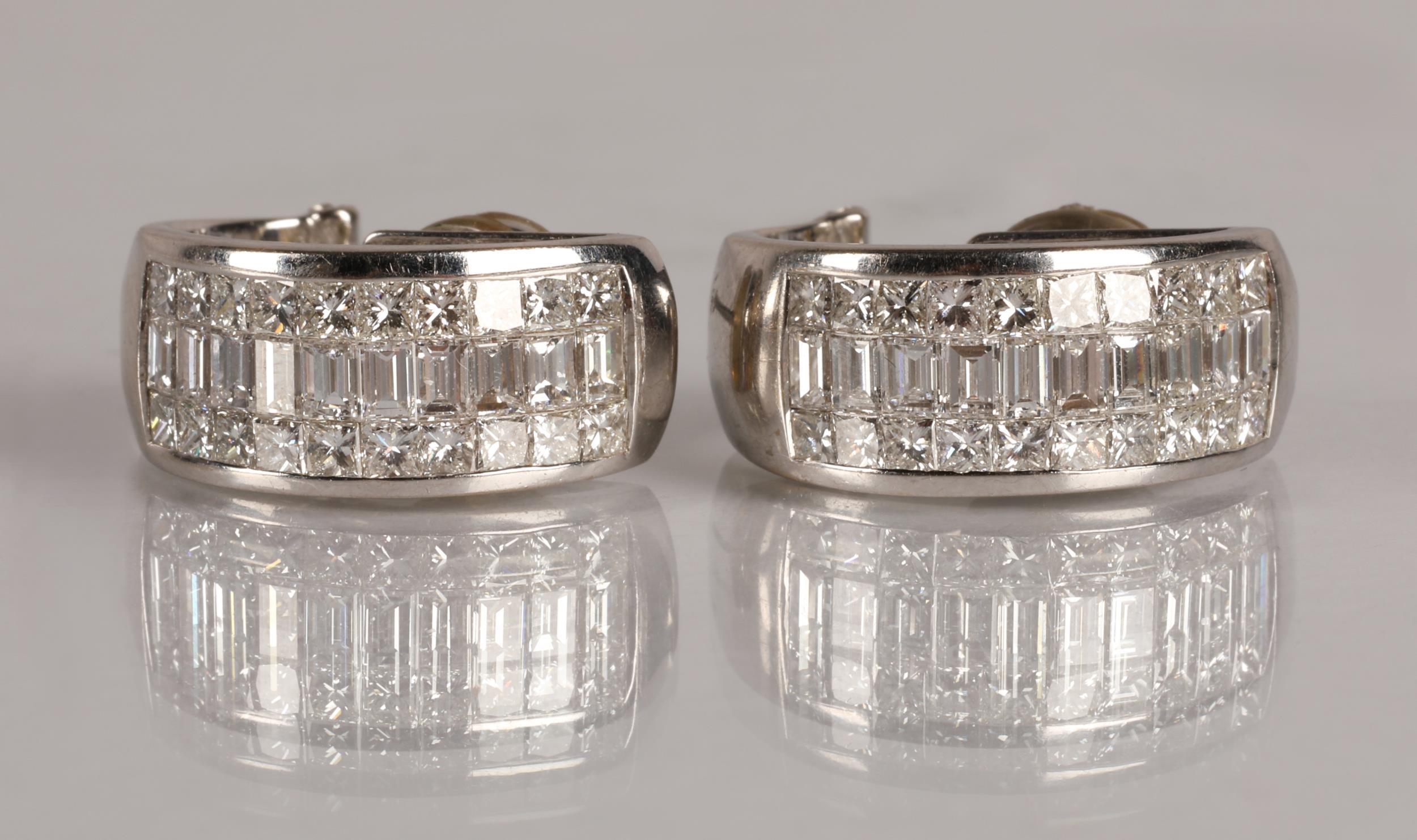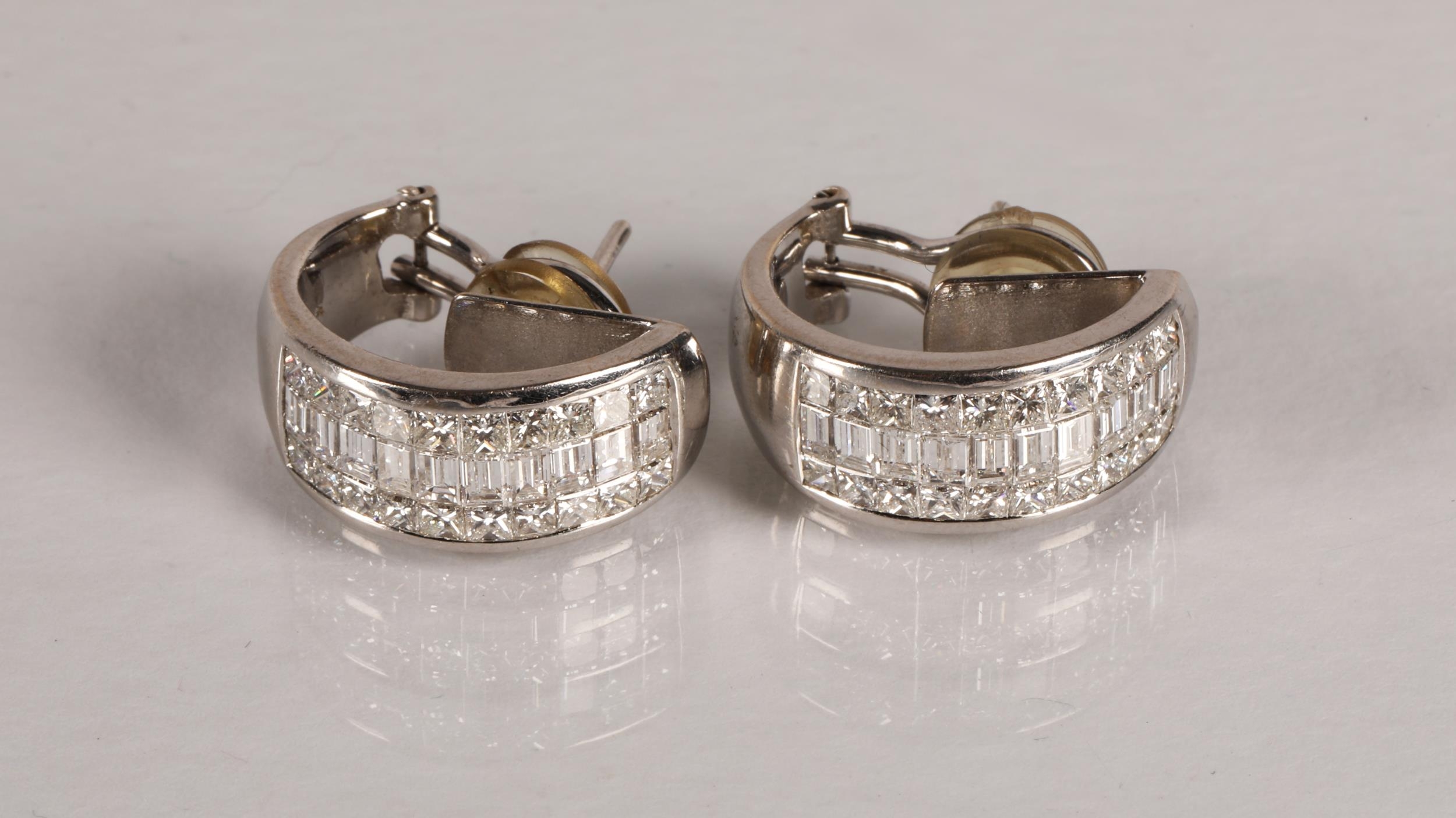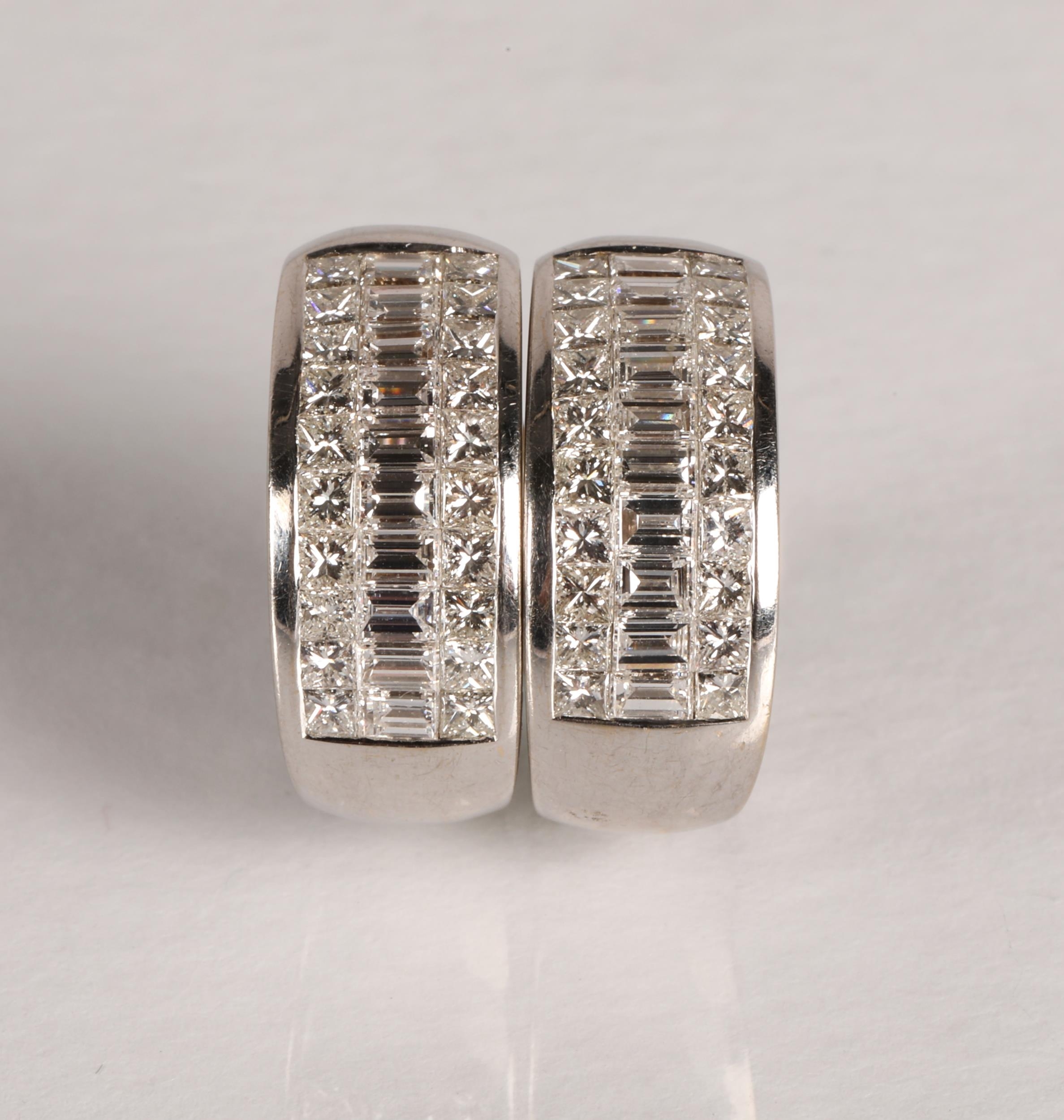 Pair of ladies 18ct white gold diamond encrusted earrings, two rows of brilliant cut diamonds either side of a central row of baguette cut diamonds, gross weight 13.2 grams