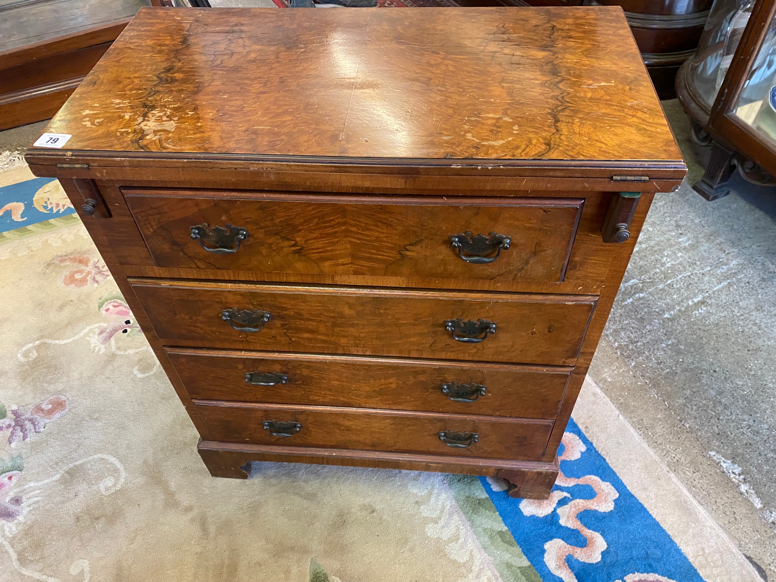 A reproduction walnut veneered bachelors chest with folding top, fitted four wide drawers, on bracket feet - 25in. wide