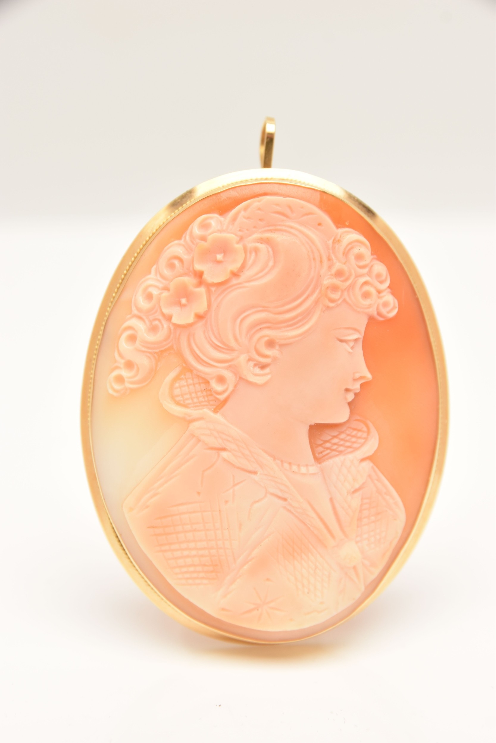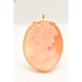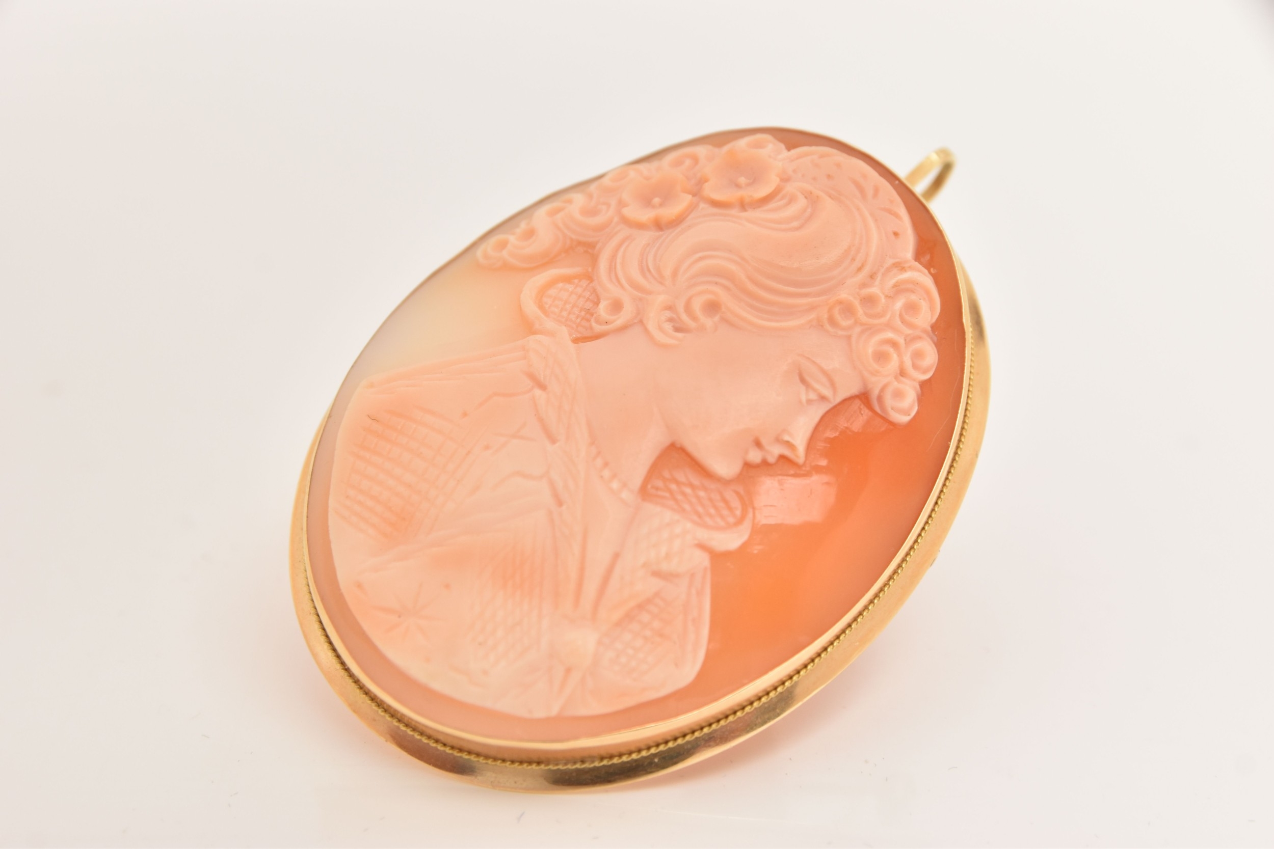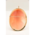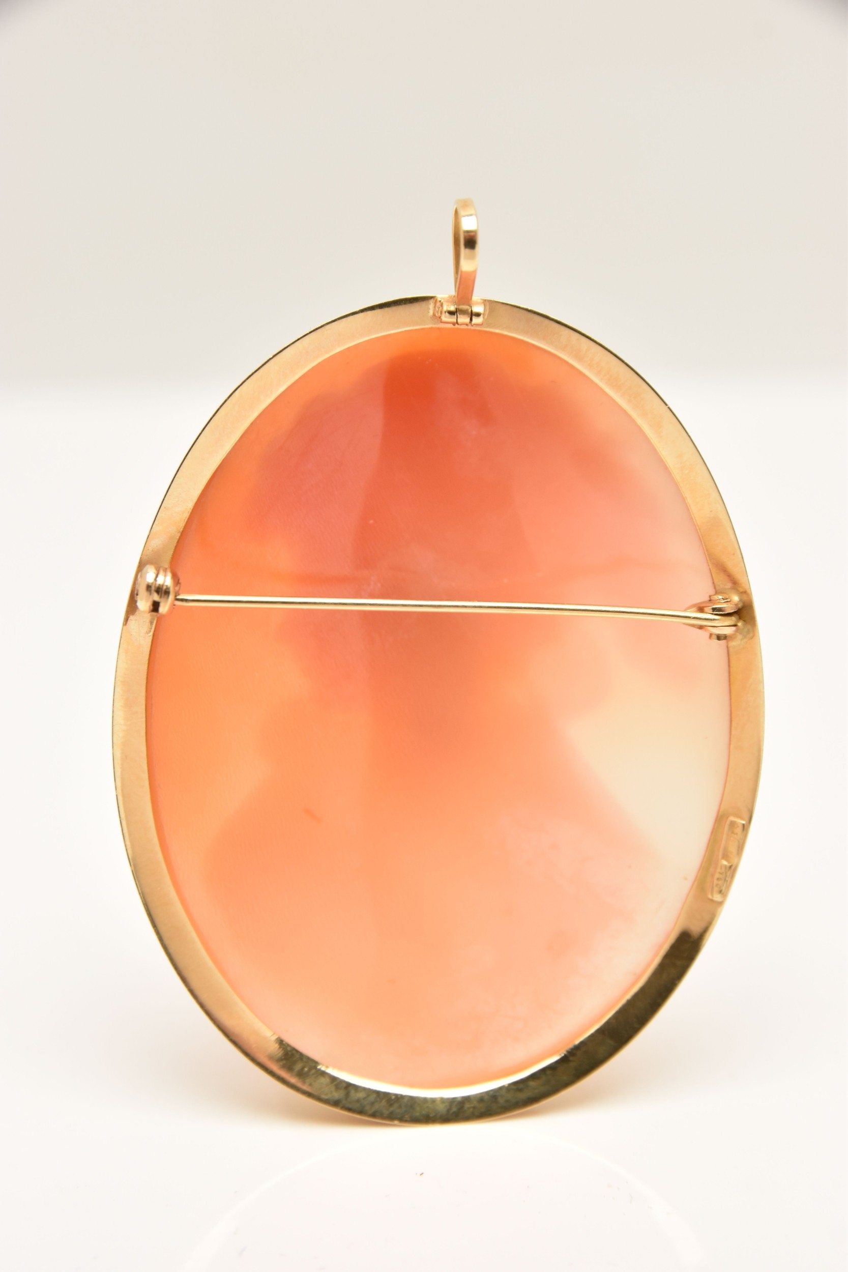 A LARGE YELLOW METAL CAMEO BROOCH, carved shell cameo depicting a lady in profile, collet set with a fine rope twist surround, fitted with a brooch pin and safety clasp, with additional bail to be worn as a pendant, approximate length 52.6mm x width 40.7mm, stamped 750 Italian marks, approximate gross weight 12.5 grams (condition reports: general light wear, clasp in working order)