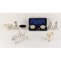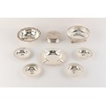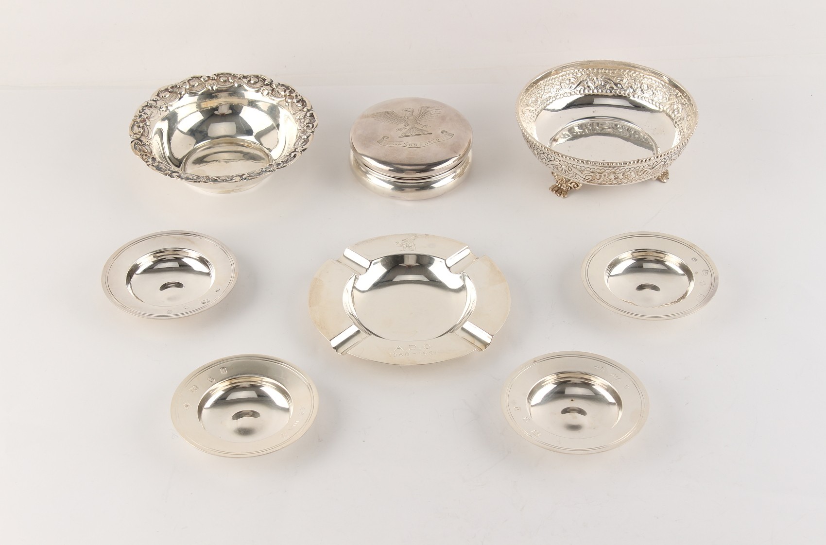 Property of a gentleman - a late Victorian silver bun shaped box with engraved crest to cover & engraved presentation initials to base, William Hutton & Sons, London 1896; together with a set of four small silver armada dishes; a silver ashtray; and two unmarked silver (tested) bowls (approximately 531 grams total) (8).