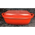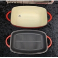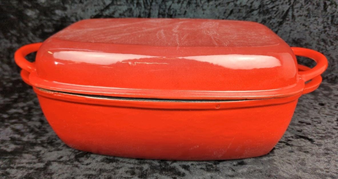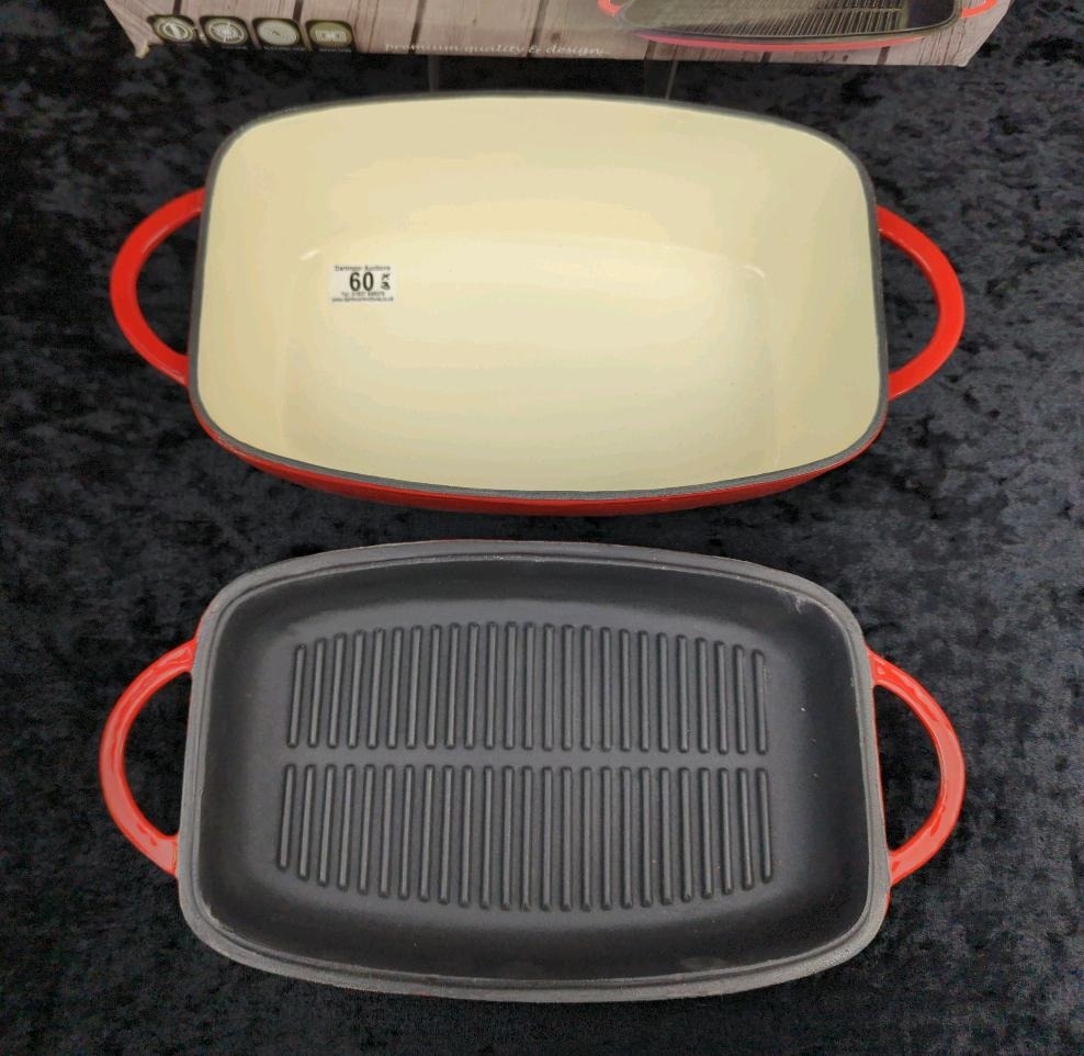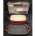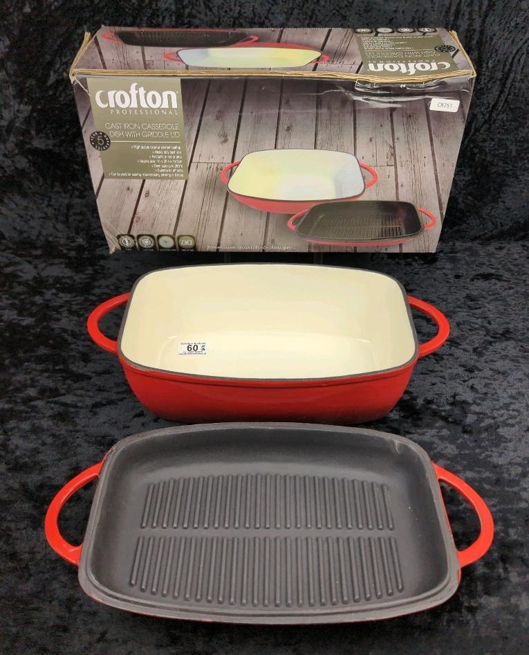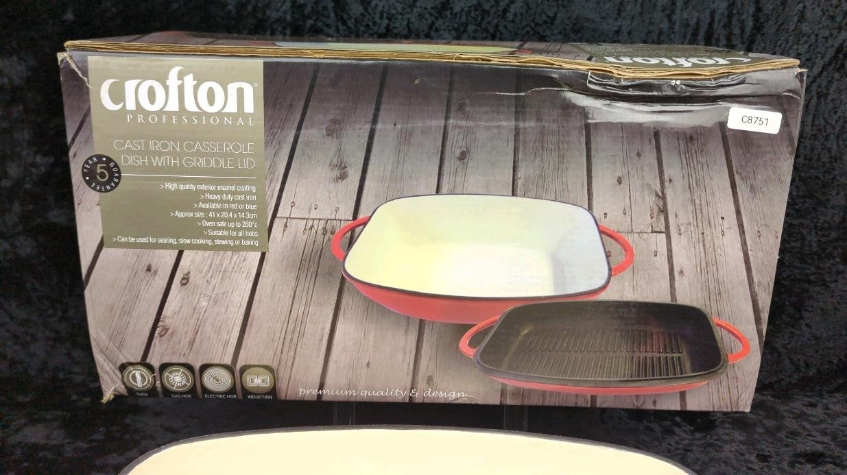 Brand new (with box) red cast iron casserole dish with griddle lid, made by Crofton Professional.