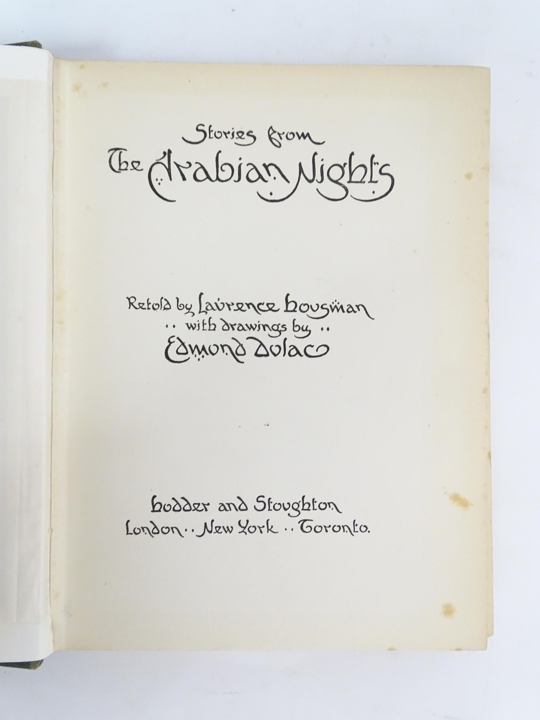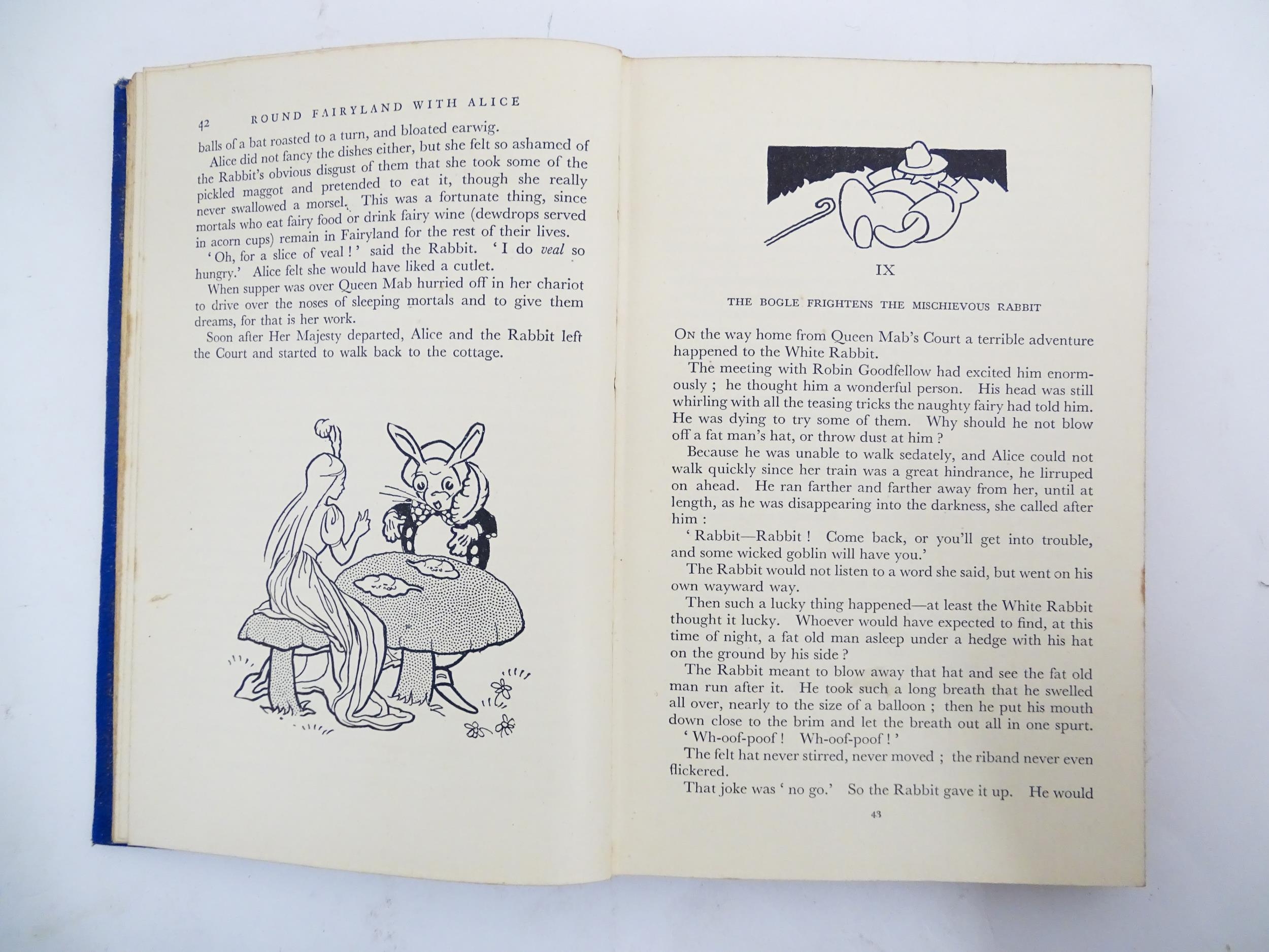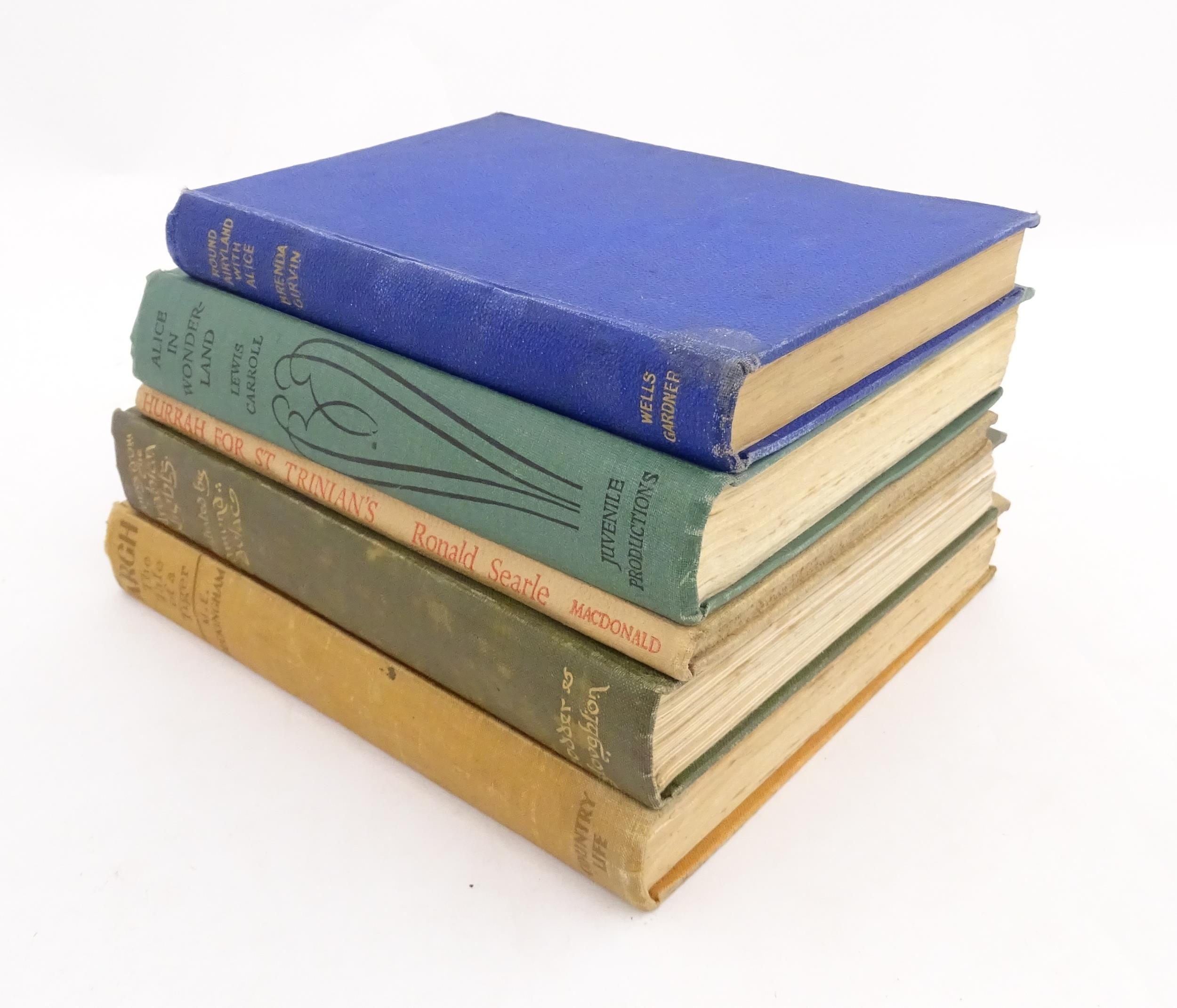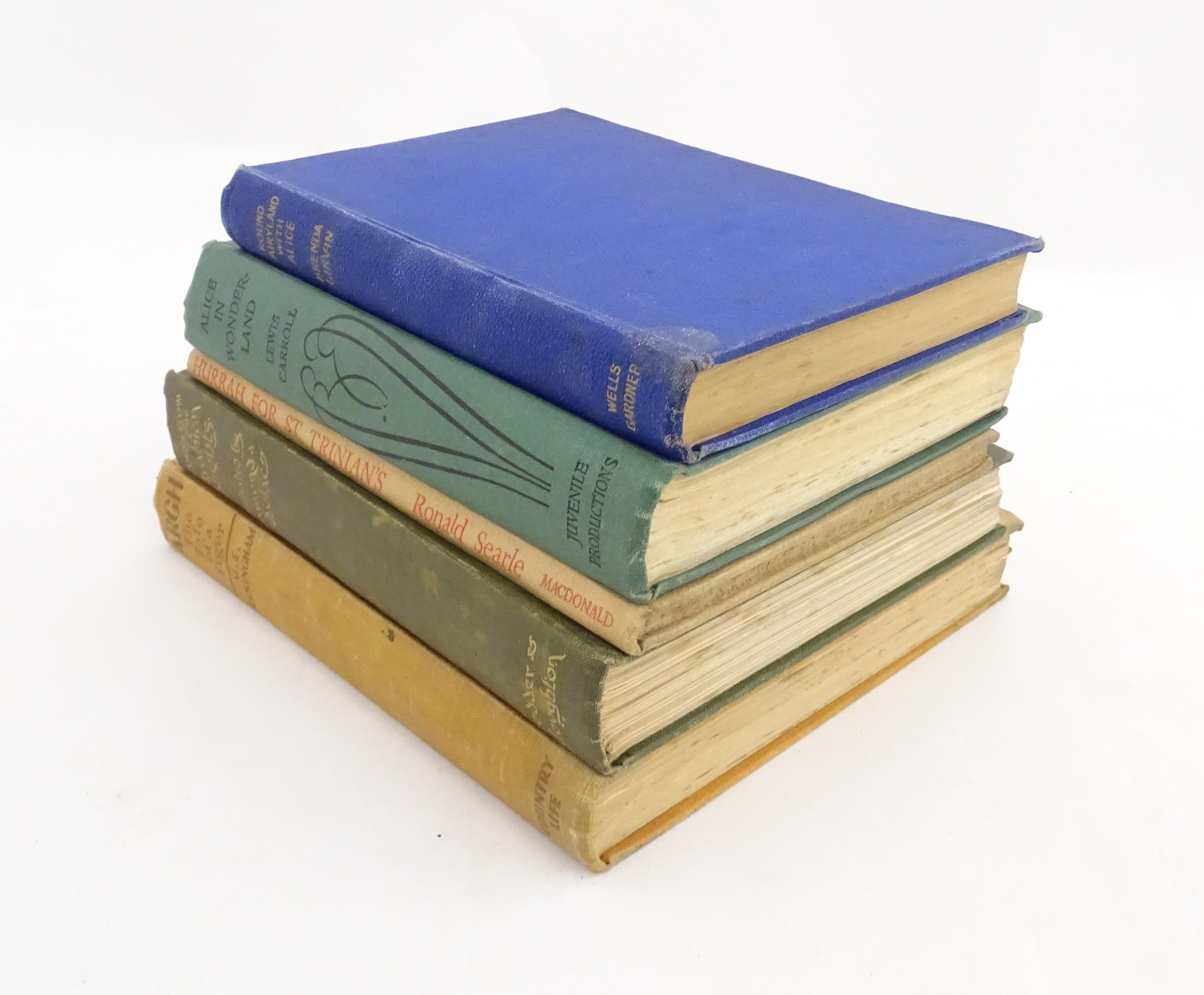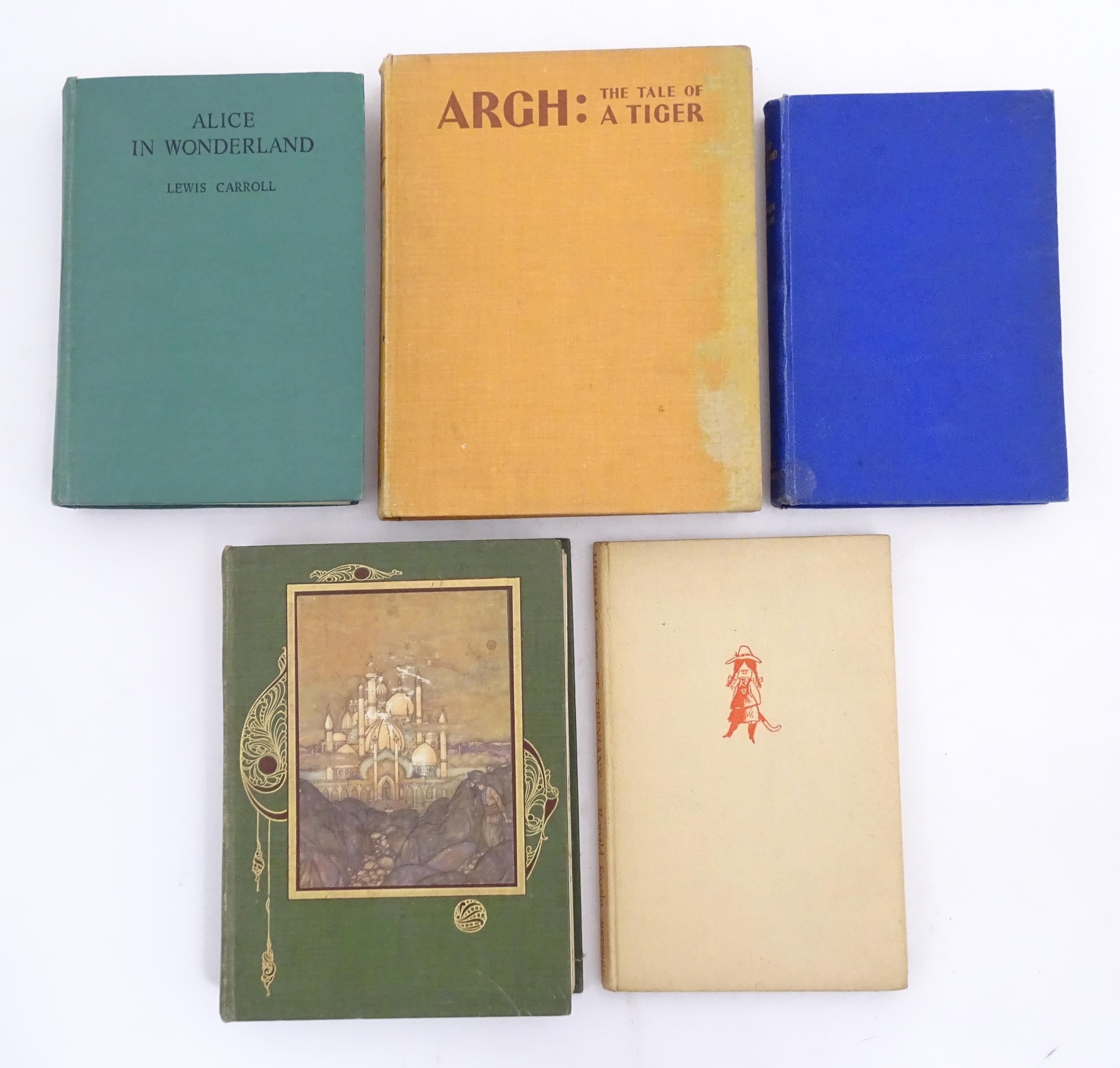 Books: Five assorted books comprising Argh The Tale of a Tiger by M. E. Buckingham, 1936; Stories from the Arabian Nights, retold by Laurence Housman, 1911; Hurrah for St Trinian's and other lapses by Ronal Searle, 1948; Alice in Wonderland by Lewis Carroll, and Round Fairyland with Alice by Brenda Girvin, 1948 (5)
