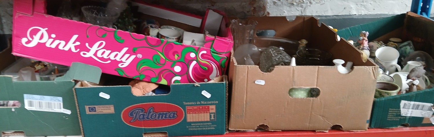 Five boxes of mixed glass, pottery and ornaments