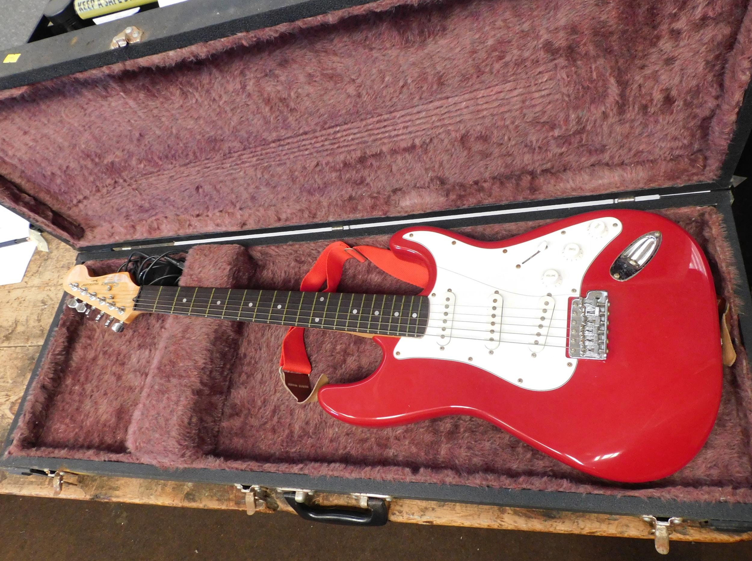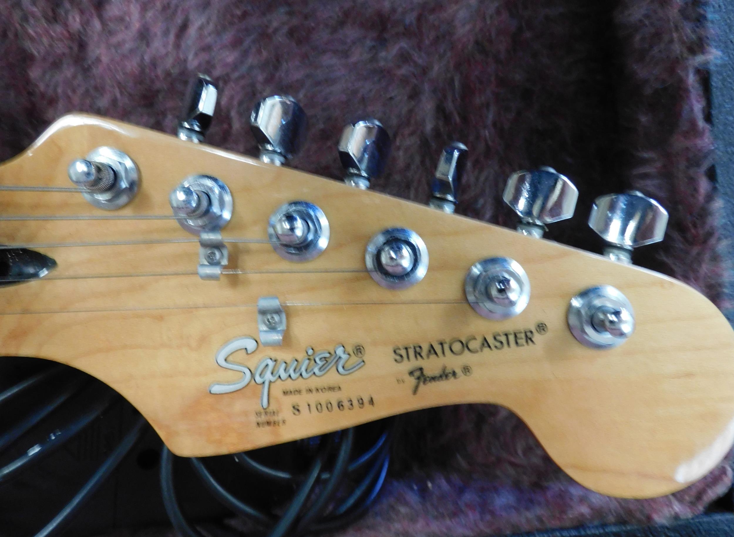 Squire Stratocaster electric guitar W/O - but needs a replacement string, with hard case