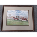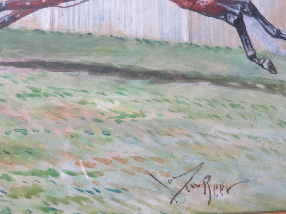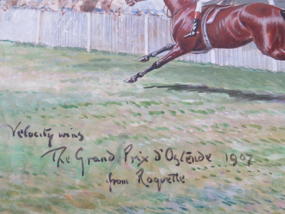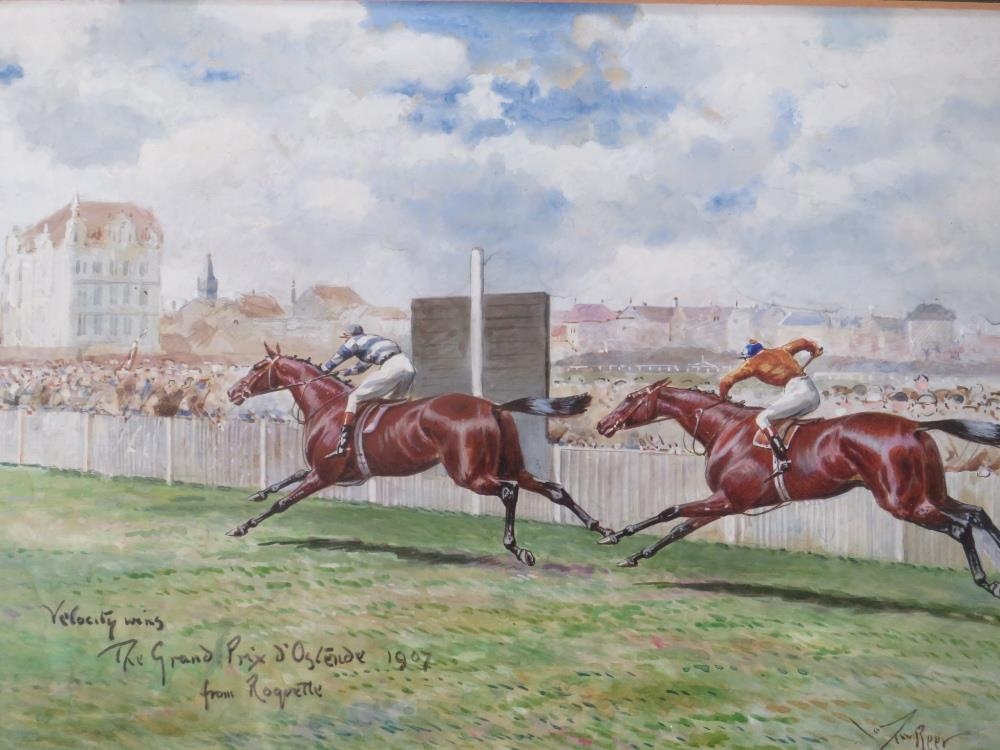 JOHN BEER (XIX-XX). British school horse racing scene 'Velocity Wins the Grand Prix D'Ostende 1907', signed lower right, watercolour, framed and glazed, 25 x 35 cm