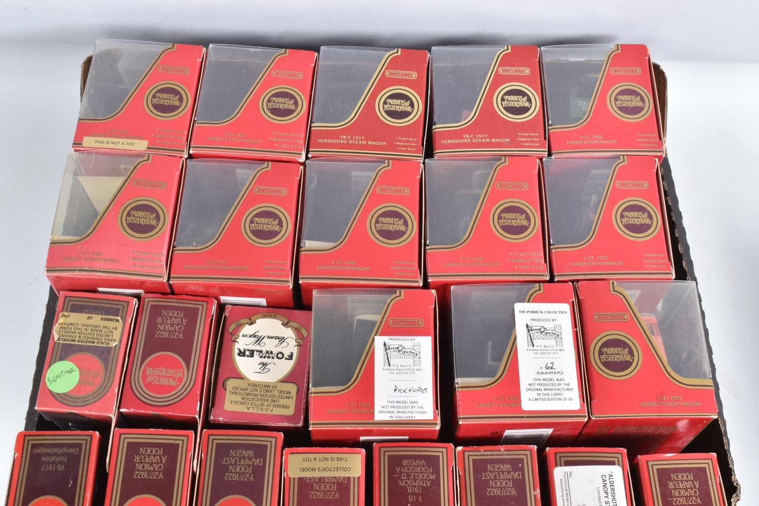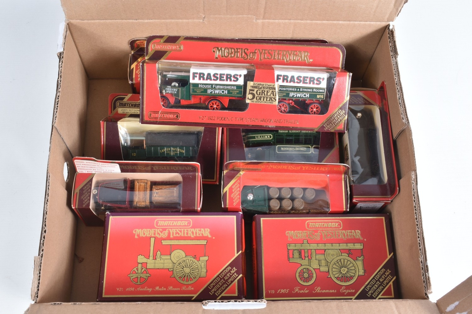 A QUANTITY OF BOXED MATCHBOX DIECAST MODELS OF YESTERYEAR, to include a 1917 Yorkshire Steam Wagon no. Y-8, a 1922 Foden 'C' type Steam Engine Wagon and Trailer no. Y-27, a Limited Edition 1905 Fowler Showmans Engine, a Limited Edition 1894 Aveling-Porter Steam Roller no. Y-21, a 1929 Garrett Steam Wagon no. Y-37 and many more similar models, the outer packaging is in good condition showing slight wear on corners and edges, the plastic window boxes are in good condition, some with stickers attached, the contents have not been checked for completeness