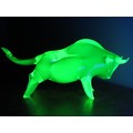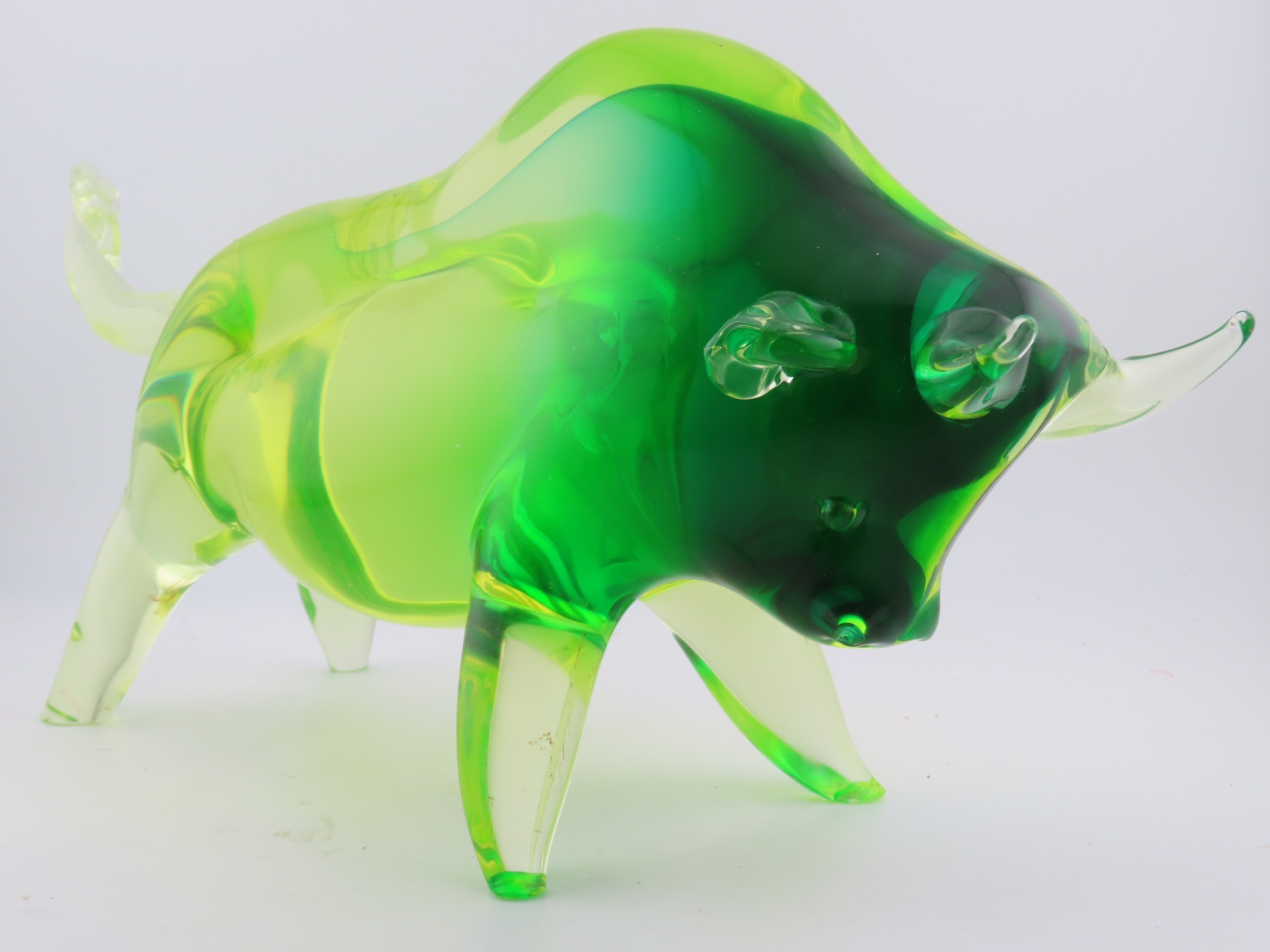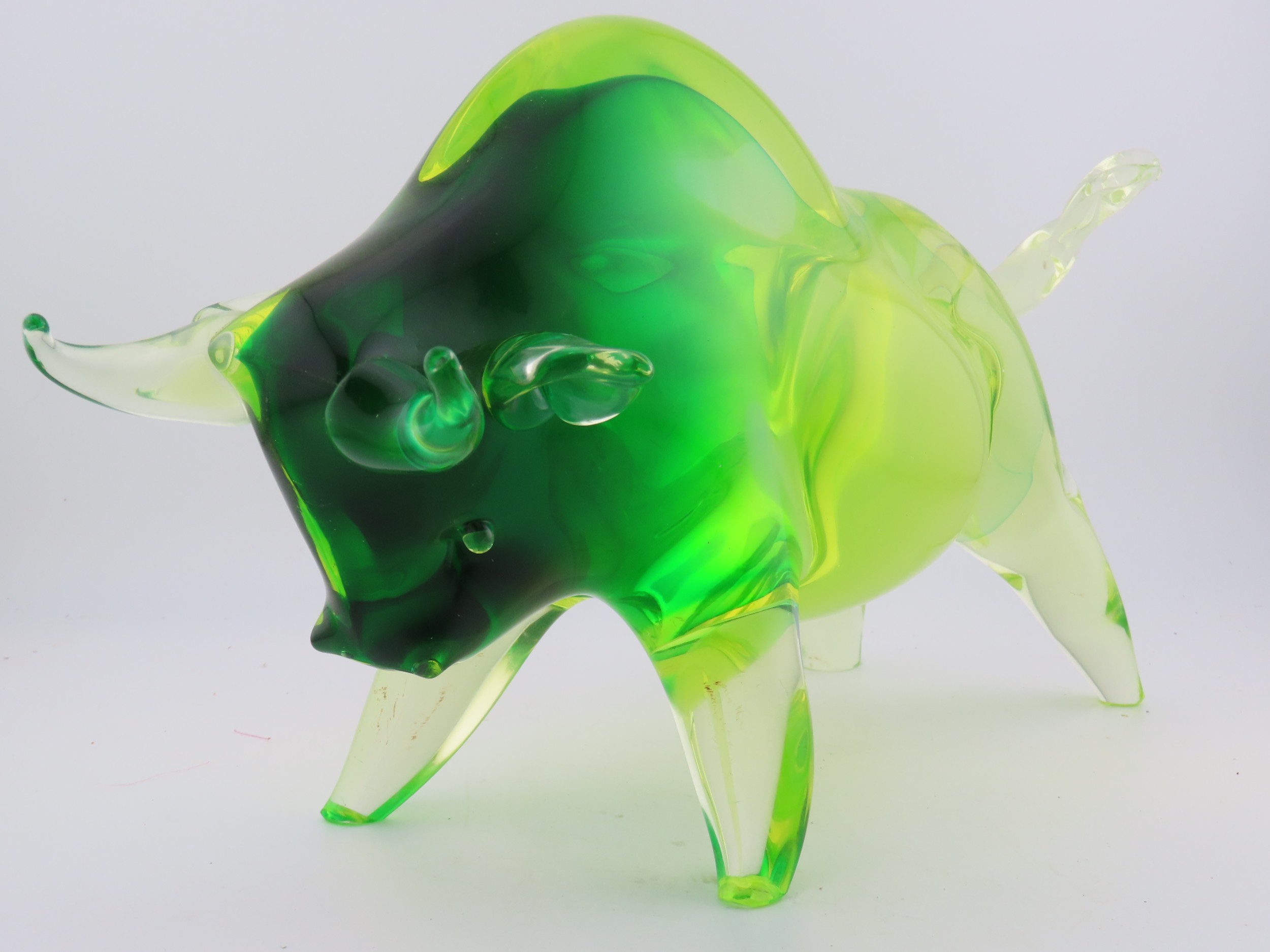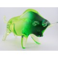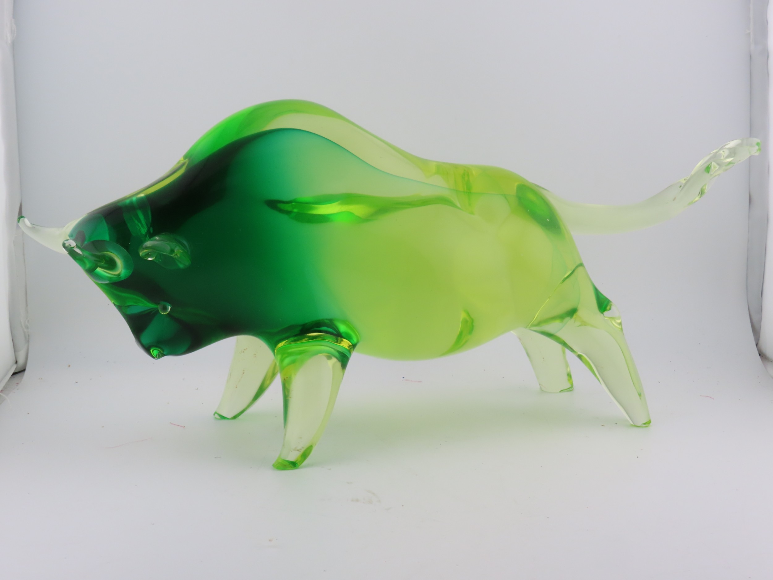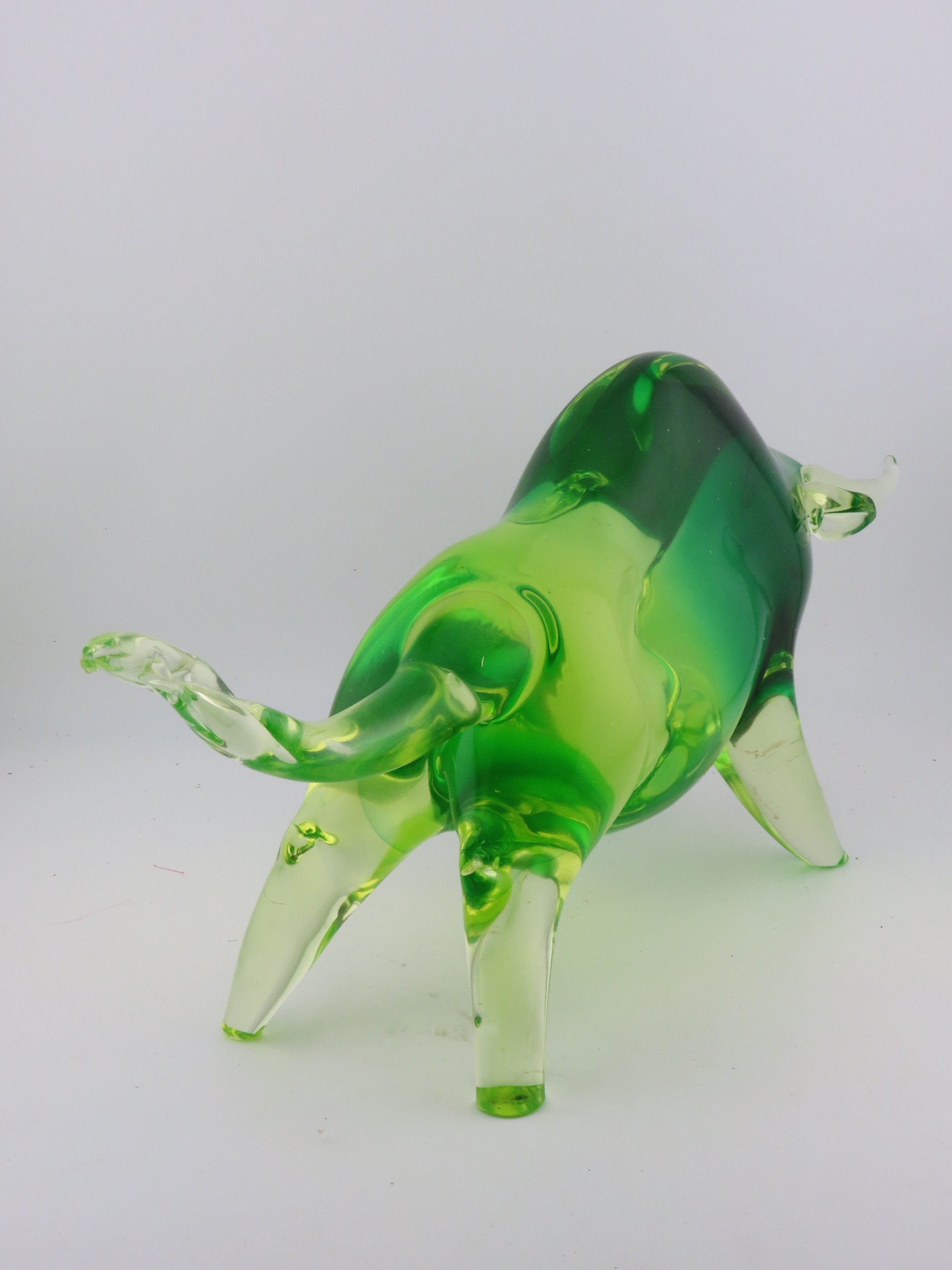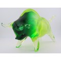 A large Murano uranium glass bull figure, of elongated form, with graduated green and yellow tones. Length approximately 13 inches, height approximately 5.5 inches.
