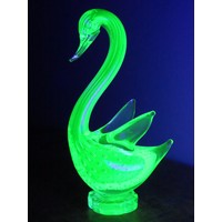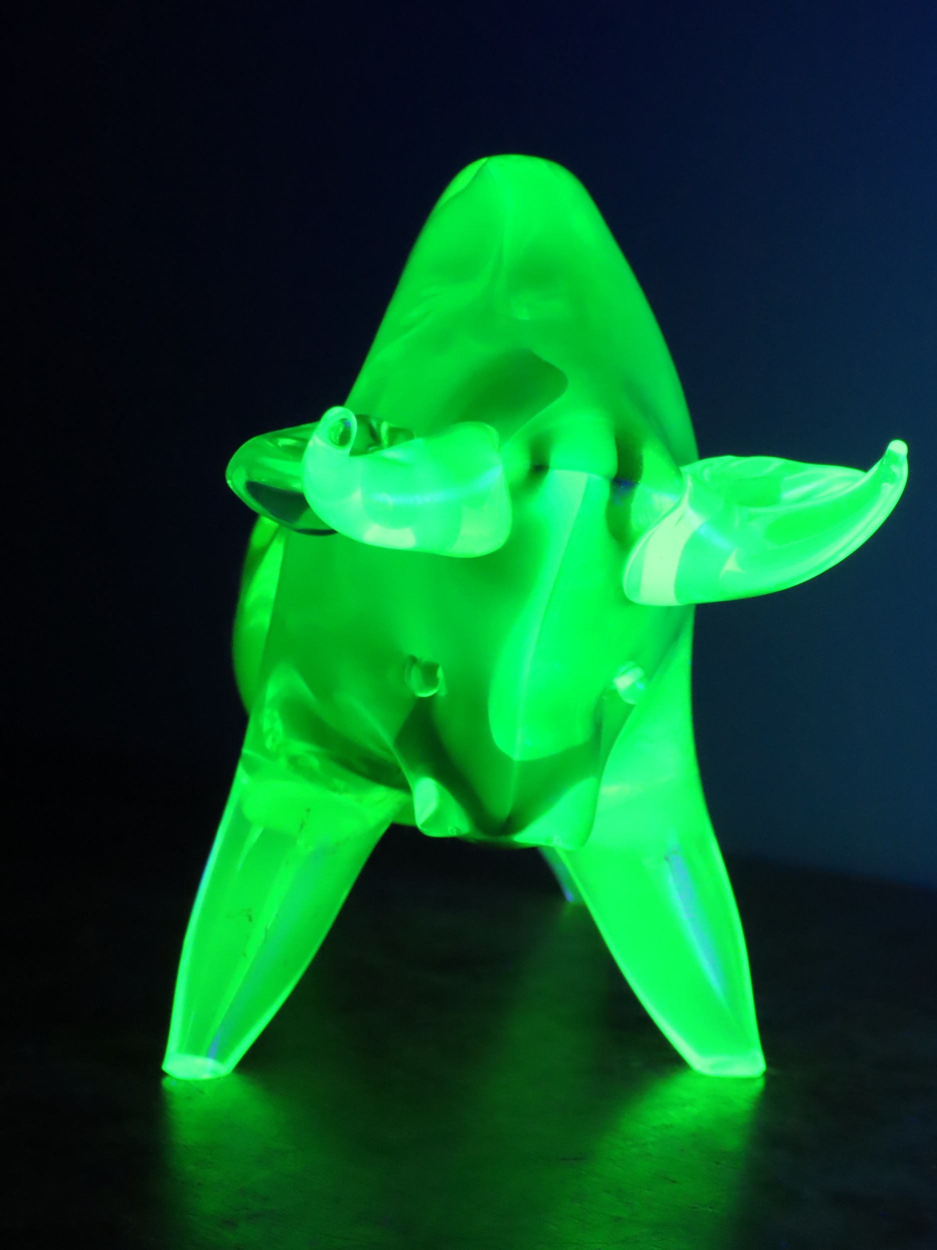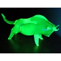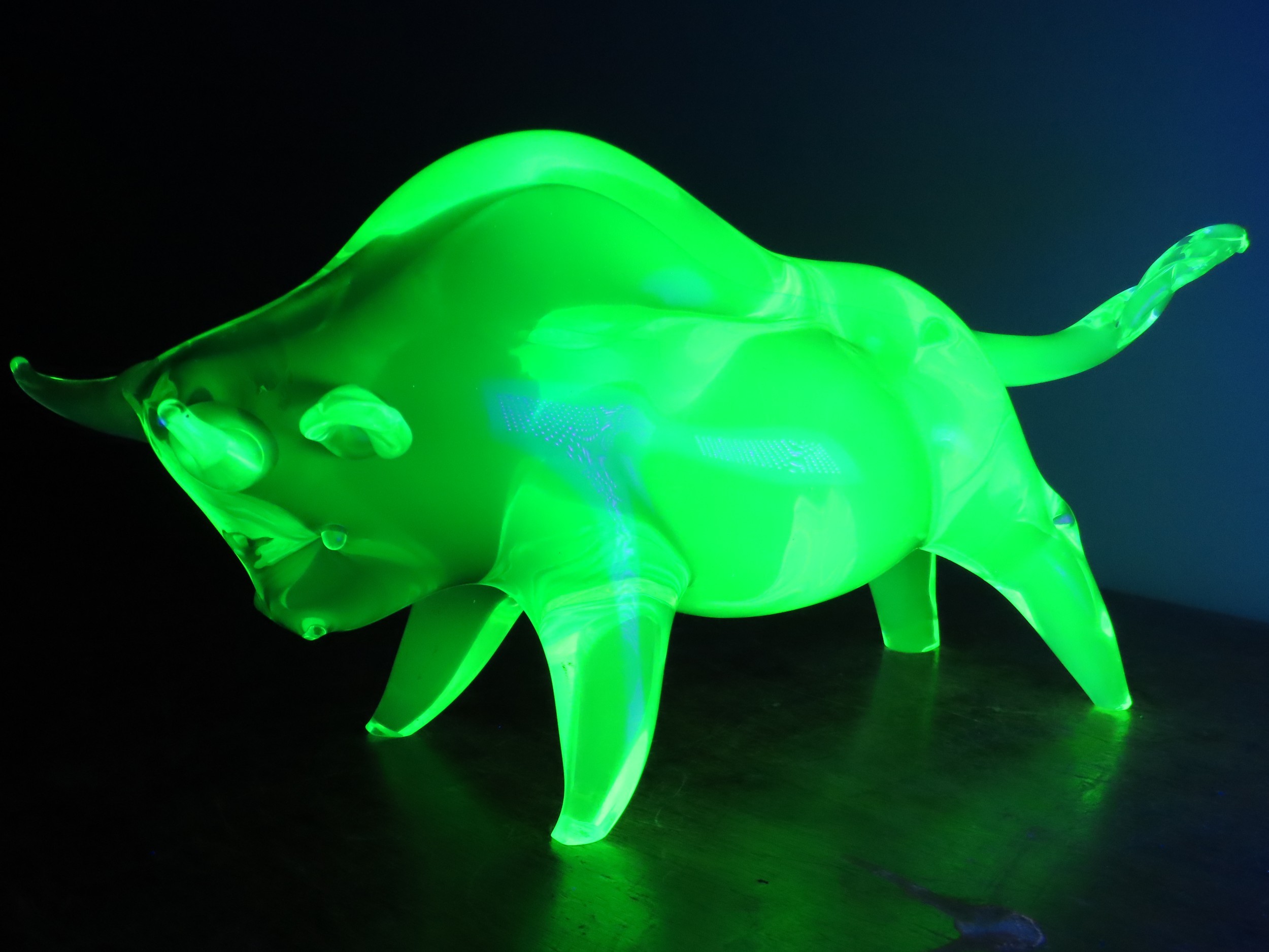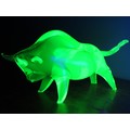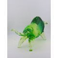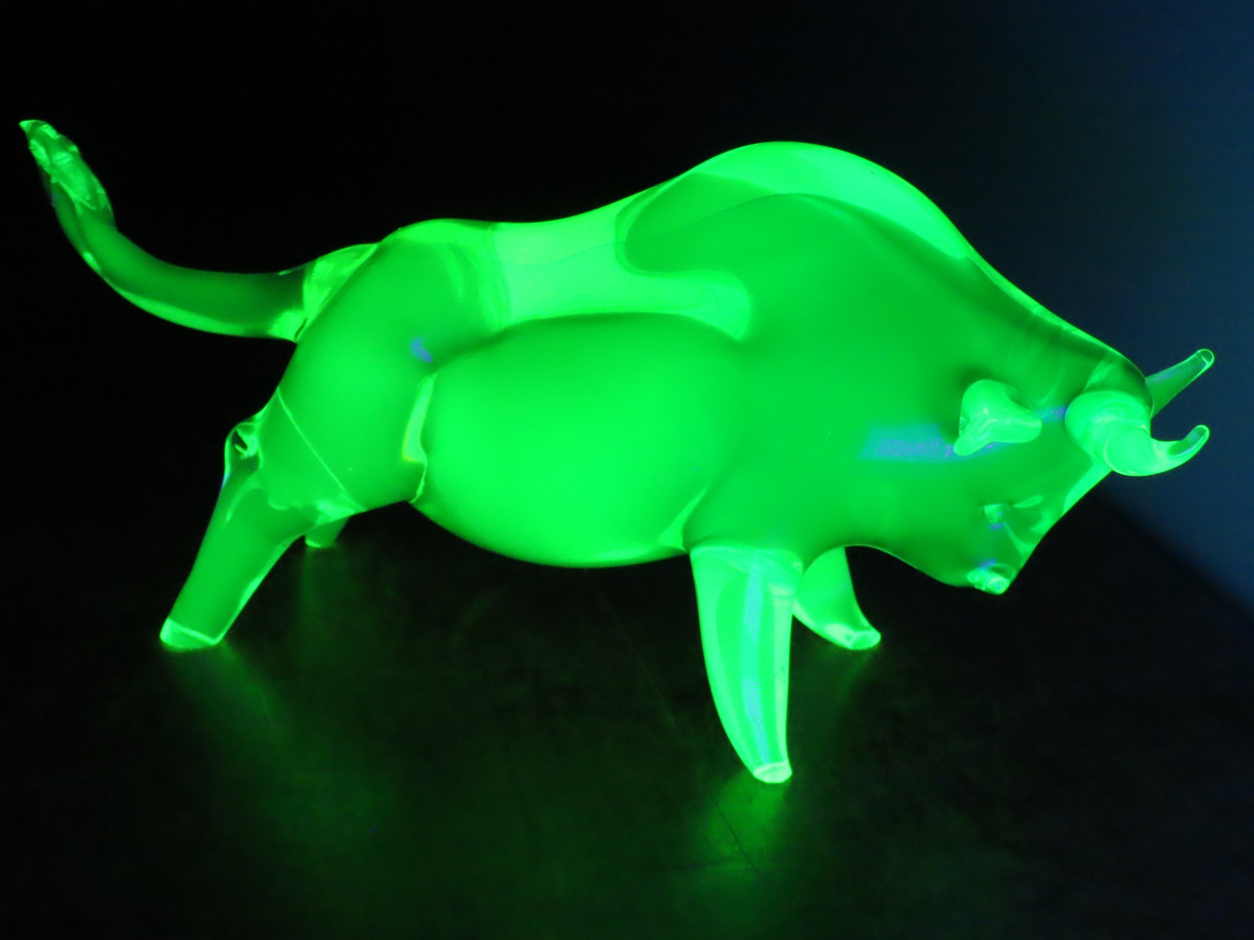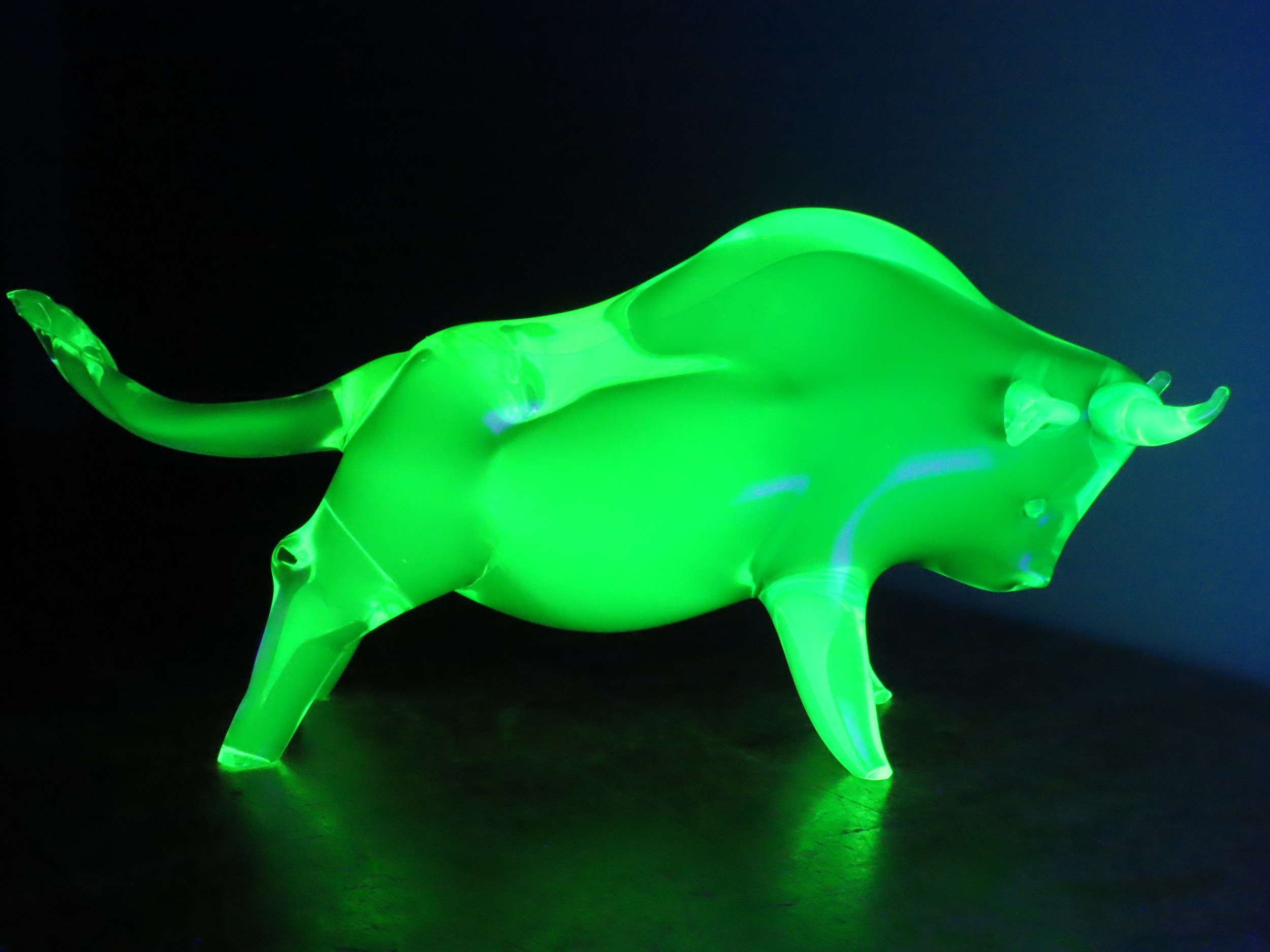 A large Murano uranium glass bull figure, of elongated form, with graduated green and yellow tones. Length approximately 13 inches, height approximately 5.5 inches.