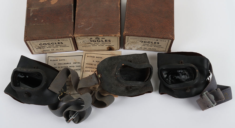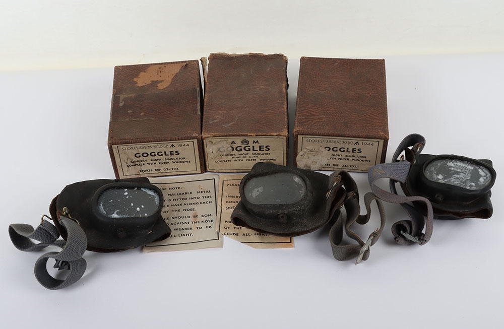 WW2 RAF Night Simulator Gunnery Training Goggles, Boxed. Three pairs of the night gunnery simulator goggles, boxed in 1944 dated or 'AM' marked boxes. All are missing one of the lenses on each set. Fair condition but with some age related wear to the rubber components.
