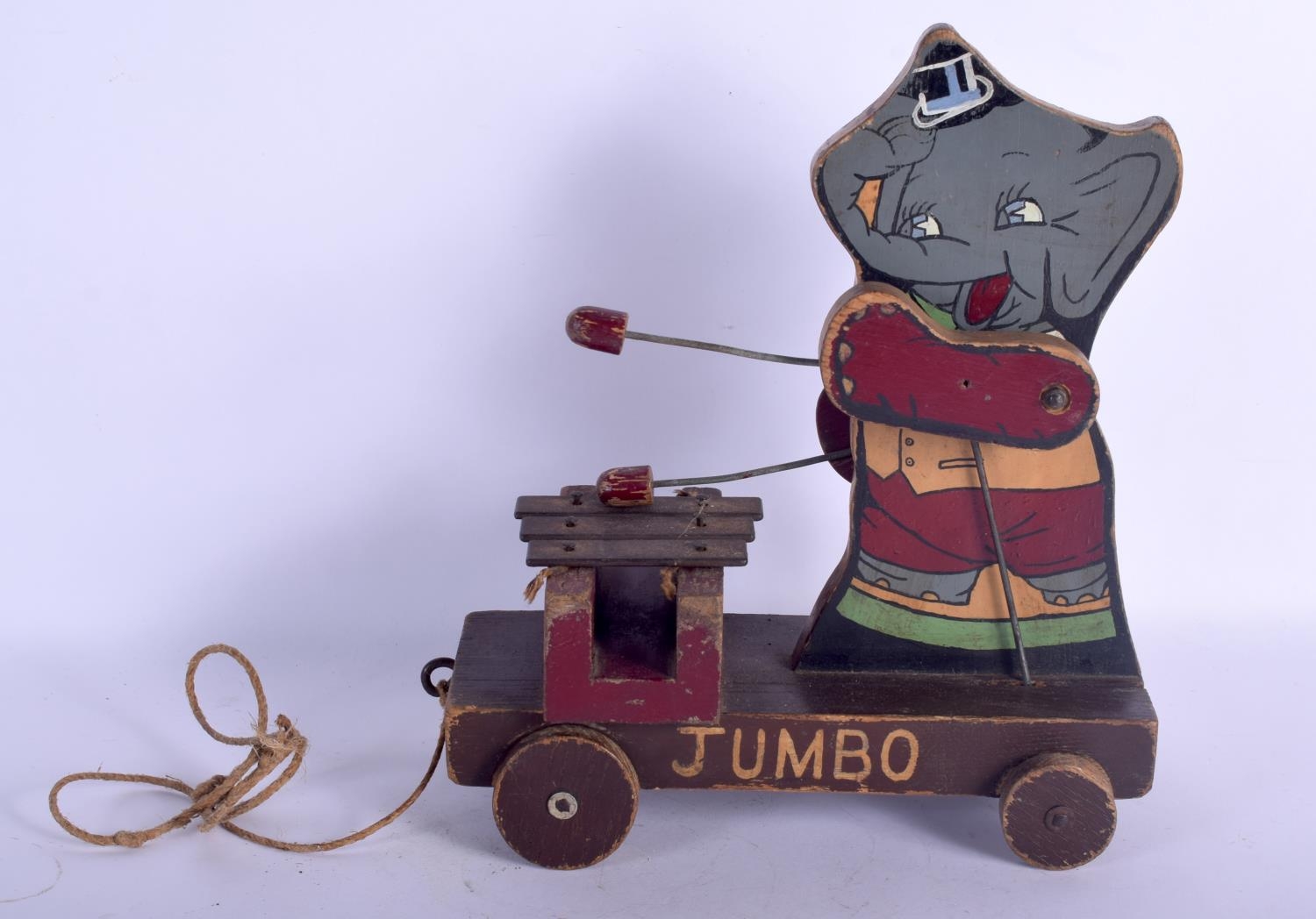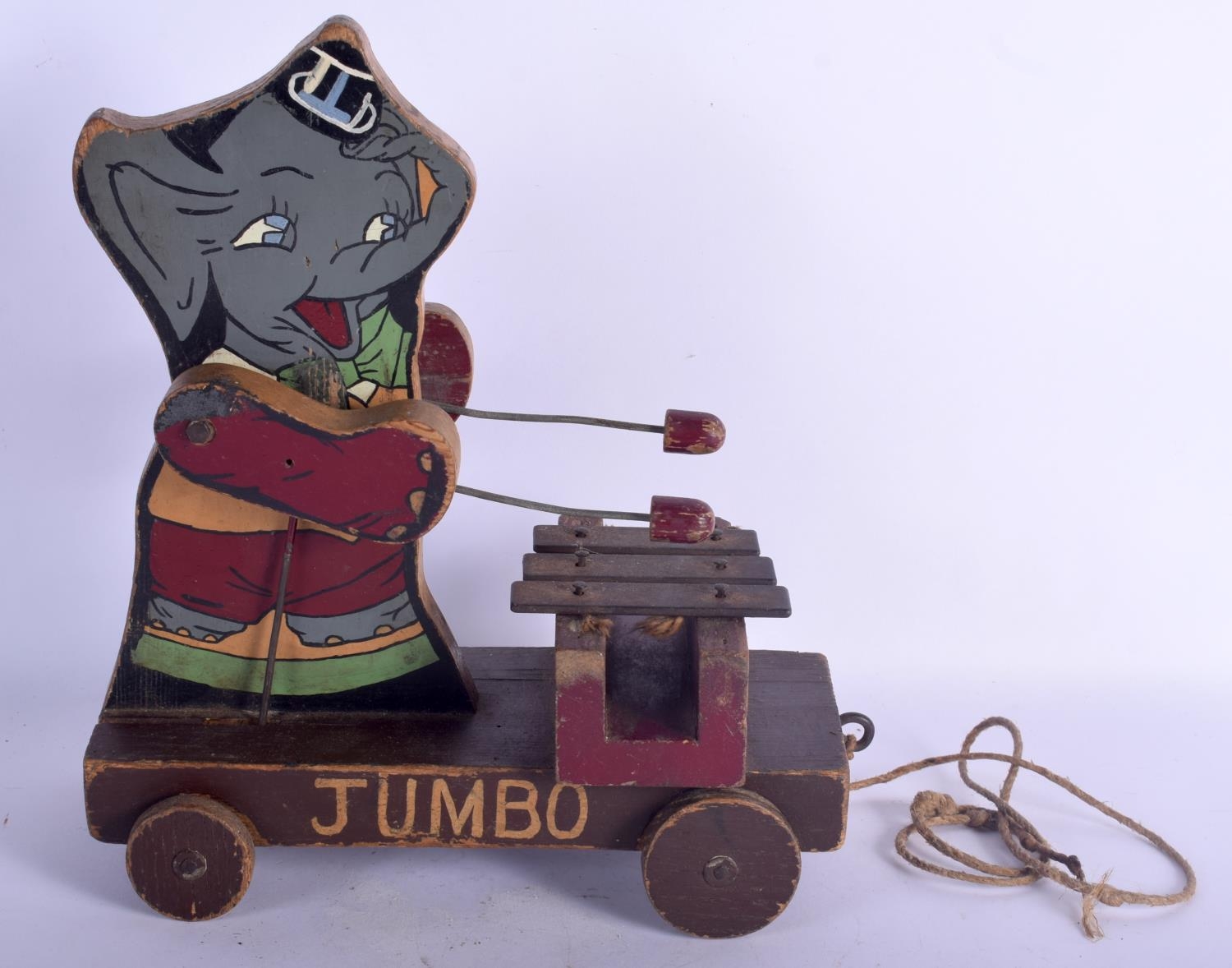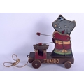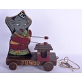 A VINTAGE JUMBO THE ELEPHANT PAINTED WOOD CHILDS PULL ALONG TOY. 22 cm x 28 cm.