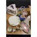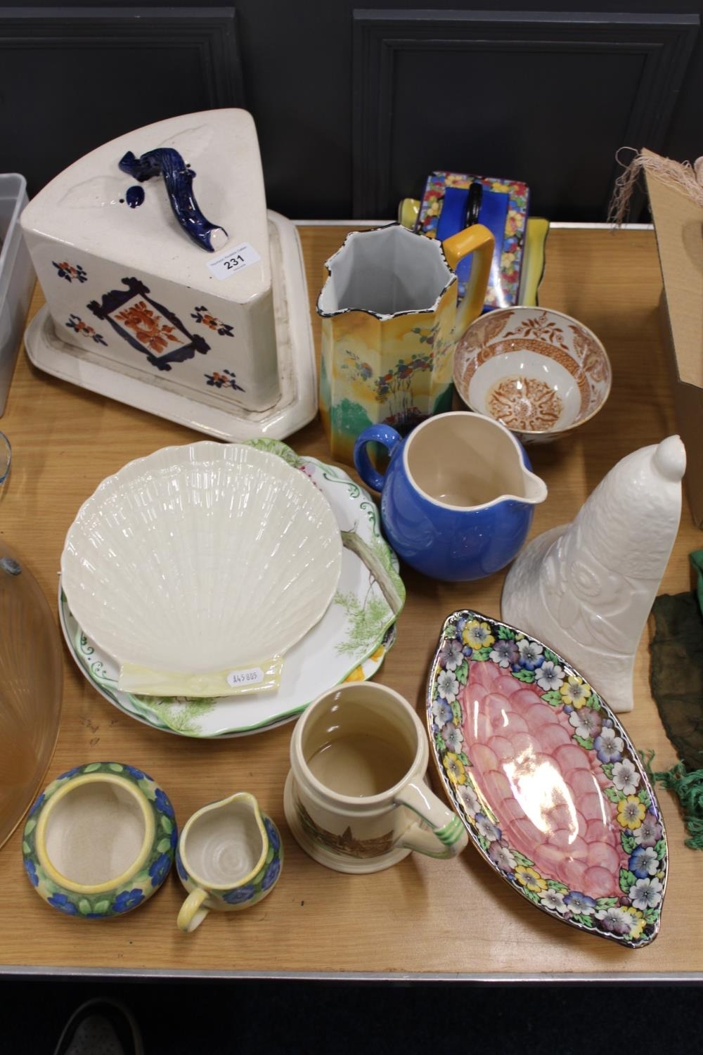 Antique Imari wedge shaped cheese dish and cover, a Spode Velamore #6326 wall pocket, a Maling lustre dish, a Brentley ware Edinburgh tankard, a Radford hand-painted sugar and cream, a Belleek scallop shaped dish, a pair of Gladstone china dishes, etc.