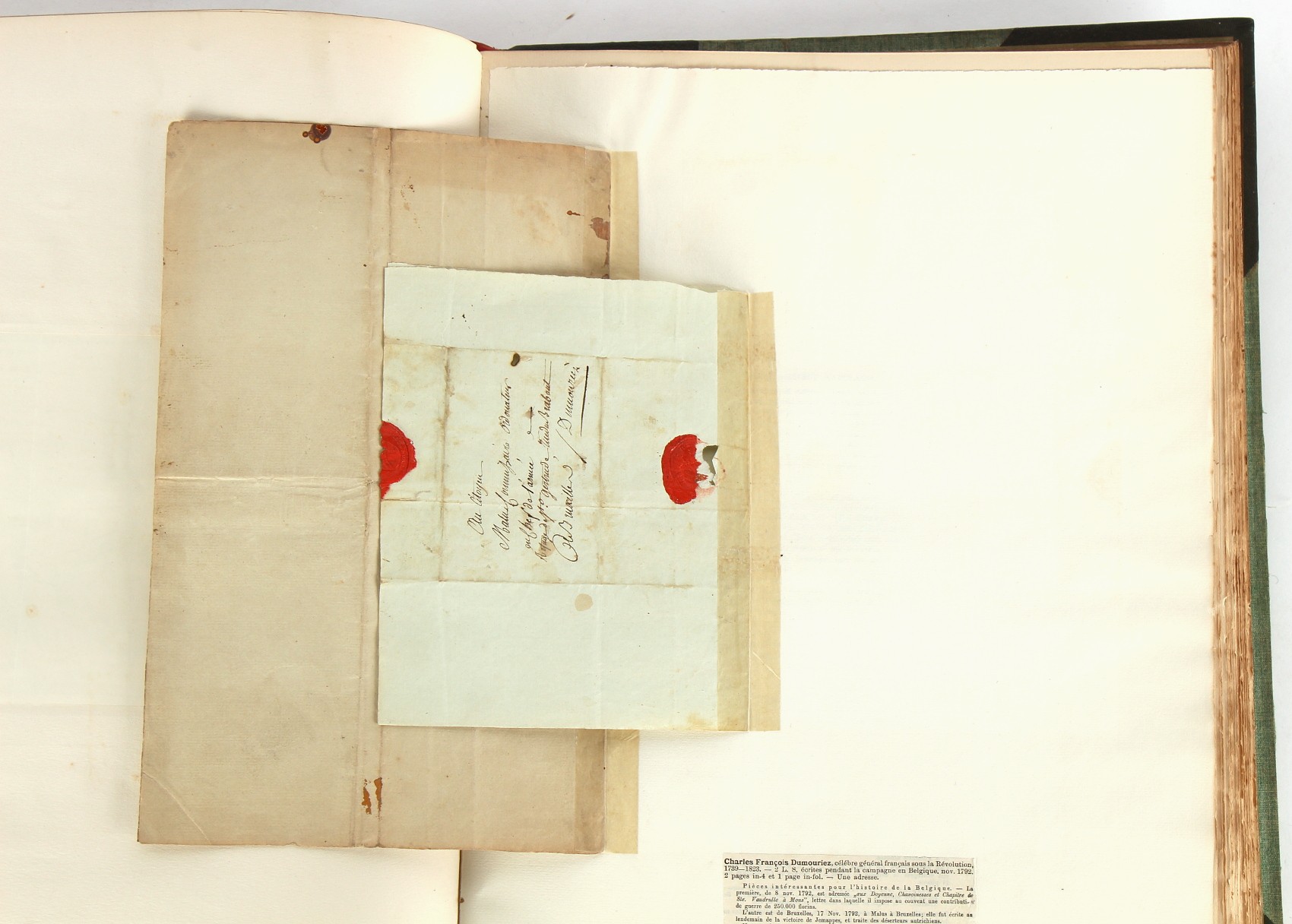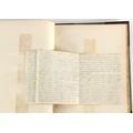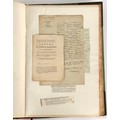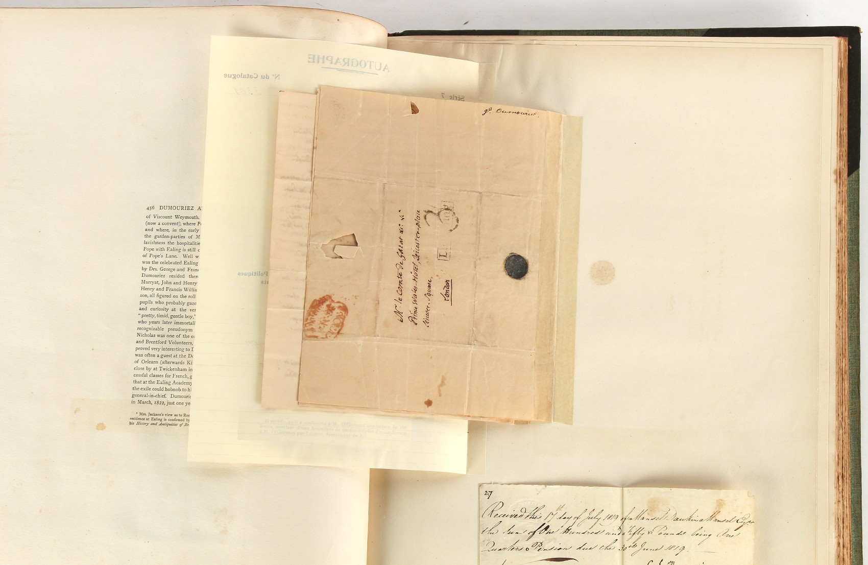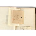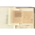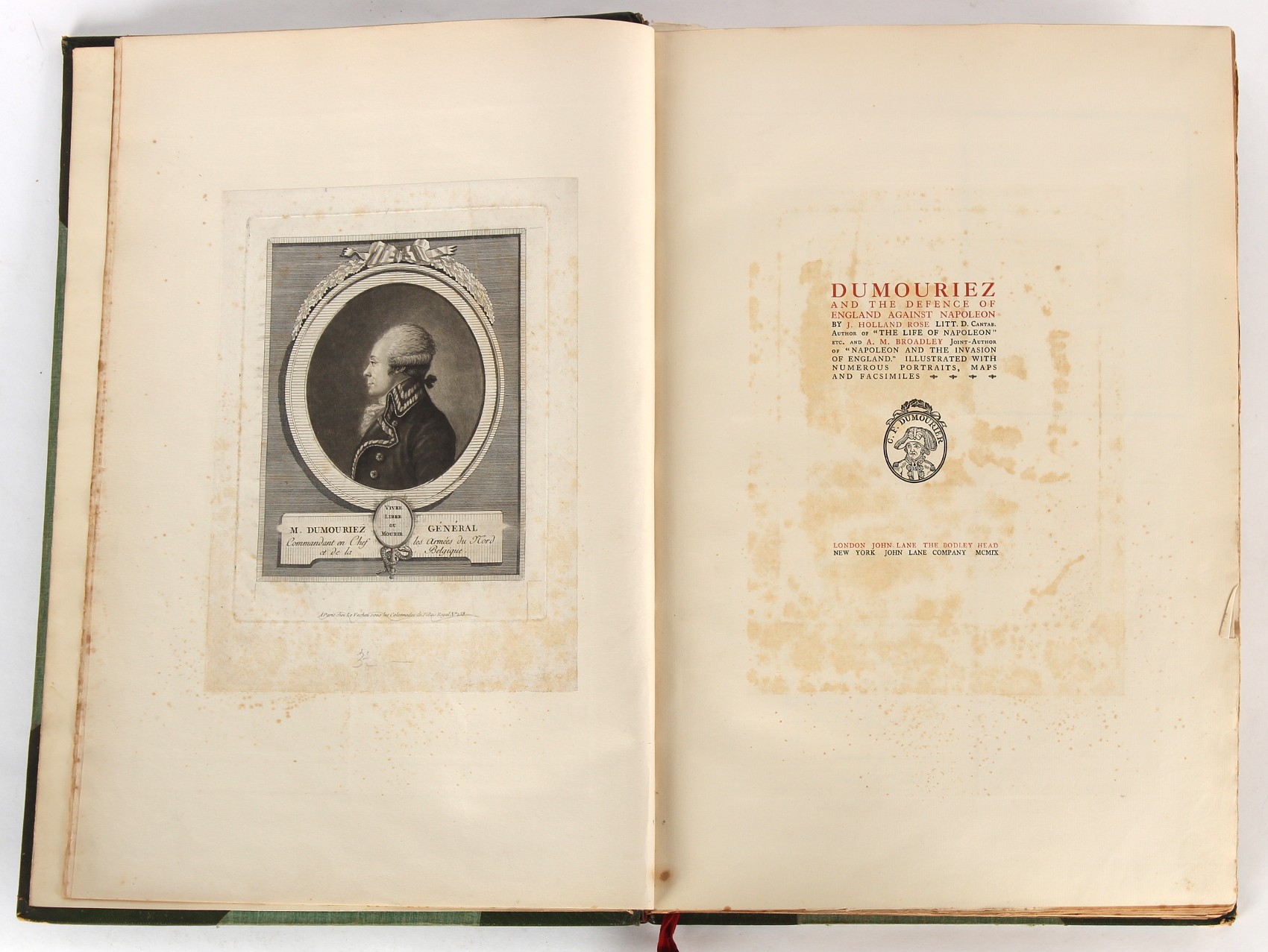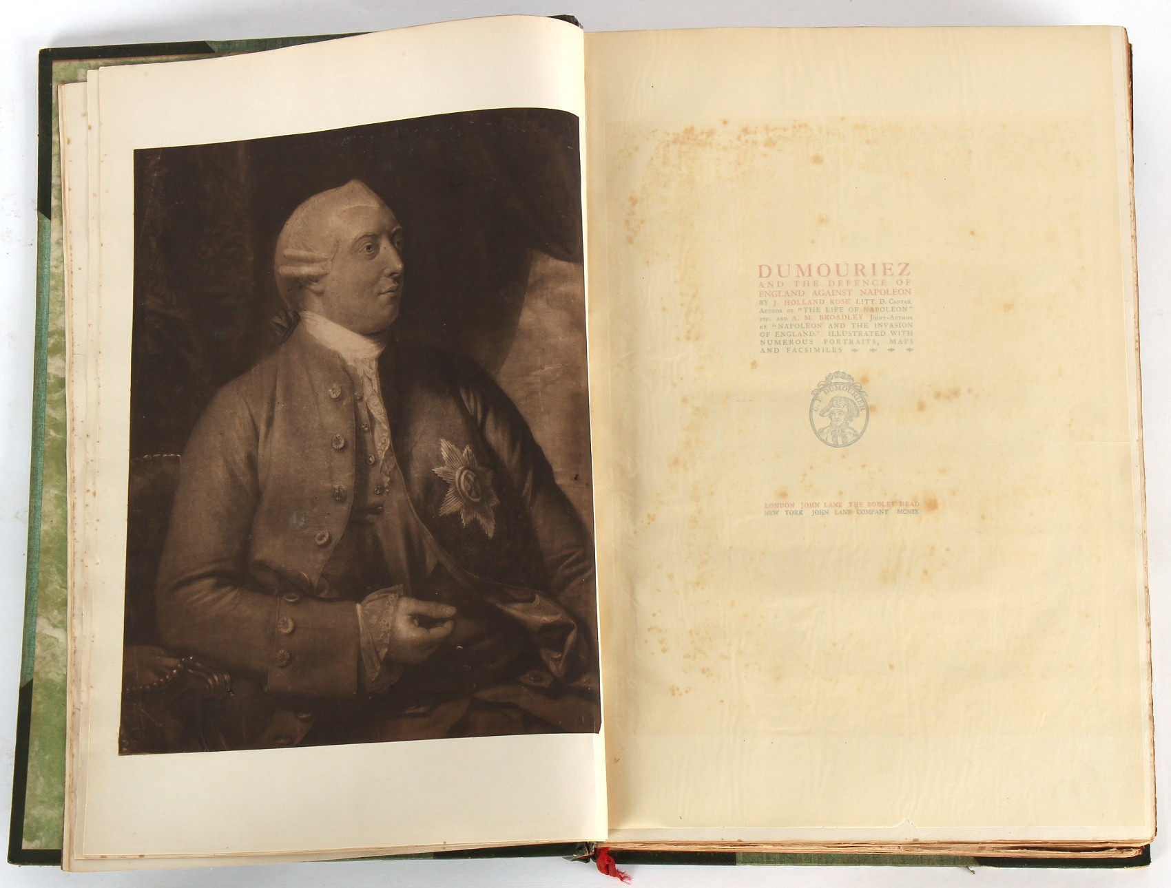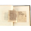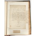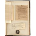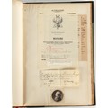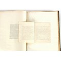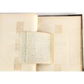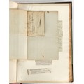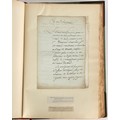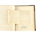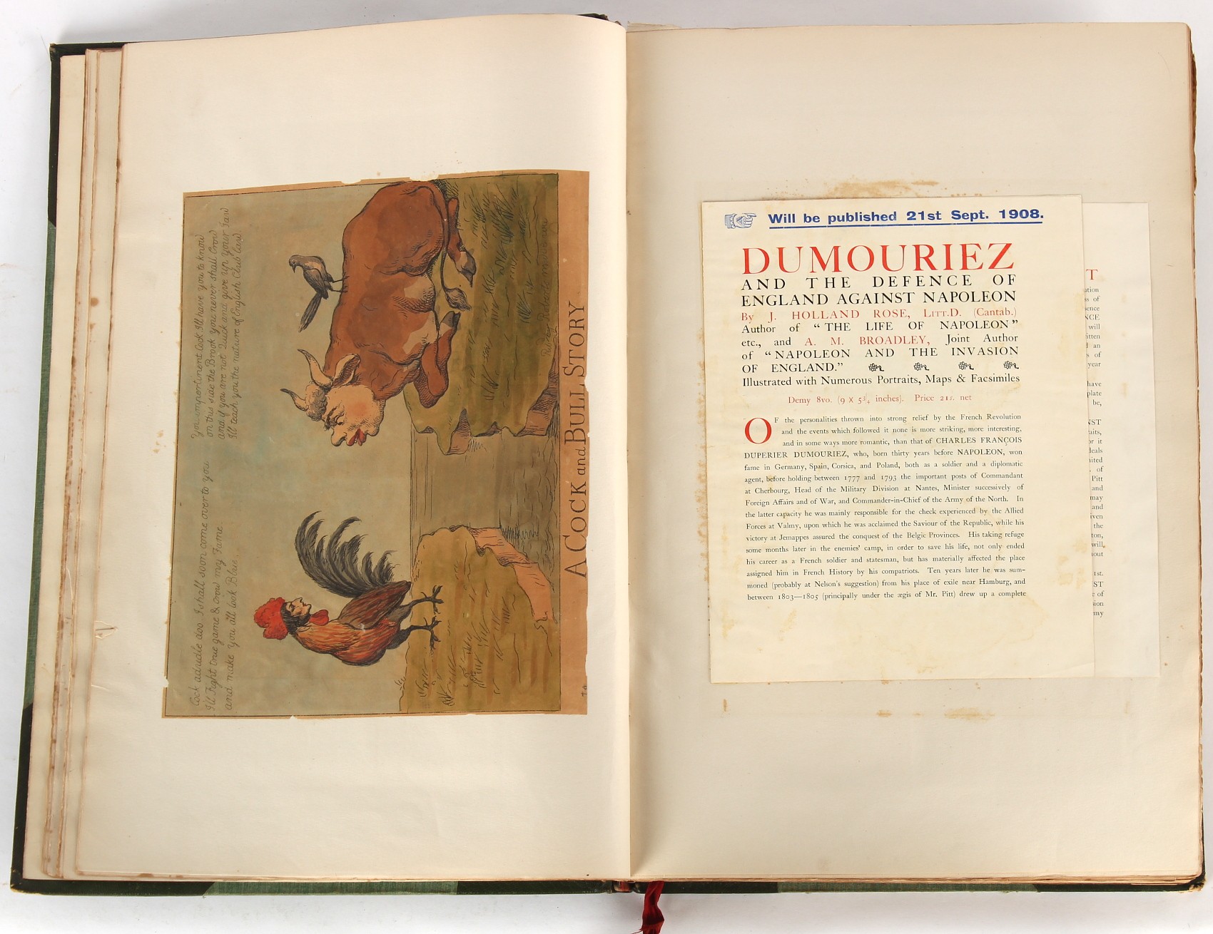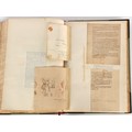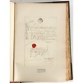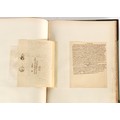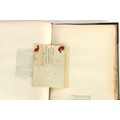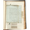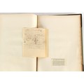 Property of a lady - Napoleonic historical interest - BROADLEY, Alexander Meyrick, and ROSE, John Holland - 'Dumouriez and the Defence of England against Napoleon' - two volume set, the personal 'Extra-Illustrated' or 'Grangerized' (or 'Grangerised') copies of Alexander Meyrick Broadley (1847-1916), London, John Lane, The Bodley Head, 1909, with tipped-in invoice from William Brendon & Son Limited Printers, Plymouth, dated 7th Sept. 1908 for £2 - - 'To one special copy pulled upon large paper, also 200 folio plain sheets', extra-illustrated or augmented with a large quantity of contemporarily hand-coloured and monochrome cartoon or caricature satirical prints, original drawings & watercolours, printed broadsides, etc., each affixed at the edges only into a window cut in to each plain folio sheet (so that backs are open & visible), Volume One including six tipped-in manuscript letters from Herbert H. Raphael (Major Sir Herbert Henry Raphael, 1st Baronet, 1859–1924) and twenty-six tipped-in manuscript letters from John Holland Rose (1855-1942) and two manuscript letters (one being four-sided) from Field Marshal Lord Roberts (1832-1914), and many other ms letters including some from Cambrai (Cambray), France (where Dumouriez was born), and the publishers (including the original contract between the authors and the publishers), all regarding the book and its compilation, also including twelve original ink manuscript letters by the subject of the book Charles Francois du Perier Dumouriez (1739-1823) (a further 16 letters by him are in Volume Two), the first dated 1765, the second (four sided) from Versailles dated 1772, the third (four sided) dated 1782, the fourth, fifth, sixth, seventh, eighth, ninth and tenth all dated 1792 when Dumouriez was Ministre des Affairs Etrangeres, Ministre de la Guerre, and Chef de L'Armee du Nord, an important ink manuscript letter from Dumouriez dated 1793 (two sided) consulting Charles James Fox on finding refuge in London (with letter from the dealer P.F. Madigan in Fifth Avenue, New York, regarding Boardley's purchase of this letter for $40), another ms letter from Dumouriez (two sided) dated 1796, and another from Antoine-Marie Chamans de Lavallette (Directeur General des Postes under Napoleon), the prints including Piercy Roberts after George Murgatroyd Woodward - 'John Bull and His Friends Commemorating The Peace' (1802); 'A Cock and Bull Story' (1803), published by Percy Roberts; a small pencil drawing portrait of Dumouriez initialled J.D. and dated 9 Oct. '69; 'La Retour en Angleterre' (we can find no record of this print); 'Carte des Descentes Faites en Angleterre et en Irlande Depuis Guillaume la Conquérant jusqu'à nos jours' (Map of the Invasions of England and Ireland from William the Conqueror to the Present) (1798), hand-coloured, with accompanying text; 'Capture of Bonaparte's Carriage', published by Edwards, 1818; a signed watercolour by G. Heberden entitled 'Genl. Dumouriez marching the Sans Culottes into Holland', 19.5 by 32.5cms.; 'A Dose for Dumourier, Evacuation of Holland and Brabant' (monochrome); and James Gillray - 'Dumourier dining in state at St James's, on the 15th of May, 1793' (monochrome), Volume Two including numerous broadsides or notices, some anti-Napoleon propaganda, one a folding monochrome broadside entitled 'An ABSTRACT of An Act for providing an Augmentation to the MILITIA, to be trained and exercised in the Manner therein directed; and for enabling His Majesty to cause the same to be embodied, in case of Necessity, for the Defence of these Kingdoms', printed by George Eyre and Andrew Strahan, 1796; lists of recruited foreign soldiers, etc.; an 'Army of Reserve Act' broadside for the Parish of St. Clement Danes, dated 1803; a Jan Kip folded engraving of Lulworth Castle entitled 'Lullworth Castle in Dorsetshire, The Seat of Humphry Weld'; other folding maps; several printed patriotic song scores of the period; a ms autograph ink sheet entitled 'Verses written on the threatened Invasion', by B. Atkinson of Bath'; a contemporary 60-page plus index ink ms booklet entitled 'Internal Defence of Essex', listing the names & number of carts & horses for each village or town to be called upon in the event of invasion; a printed list of 'Loyal Colchester Volunteers', dated July 1803; this second volume also includes a further 16 ink ms letters by Dumouriez dating from 1804 to 1822; and much more (helpfully, Broadley added a ms index of the extra illustrations); each volume approximately 20.5 by 14ins. (52 by 35.5cms.) (overall) (2). Footnote - Alexander Meyrick Broadley (1847-1916) was a British author, barrister, collector and social figure, known for defending Ahmed 'Urabi after the Urabi Revolt. Broadley penned numerous historical works later in life, particularly regarding Napoleon and his era. Among the works he authored or co-authored are 'Napoleon and the Invasion of England: The Story of the Great Terror' (London, 1908); 'Nelson’s Hardy: His Life, Letters and Friends' (London, 1909); 'Napoleon in Caricature 1795-1821' (London, 1911); and 'Napoleon in Exile' (London, 1914). Broadley was known as a celebrated grangeriser (or extra-illustrator) of books, and one of his greatest achievements was the creation, with the assistance of Daniell, of an extra-illustrated set of Rose’s 'Life of Napoleon I' and Rosebery’s 'Napoleon. The Last Phase', by inlaying and extending the works from three octavo to twenty-eight folio volumes with engravings, portraits, manuscripts, autograph letters, etc. over a period of four years. This monumental work was bought by George Nathaniel Curzon, Marquess Curzon of Kedleston at the auction of Broadley’s library held in four sales between 1916 and 1918, and Curzon later bequeathed the set to the Bodleian Library, Oxford.