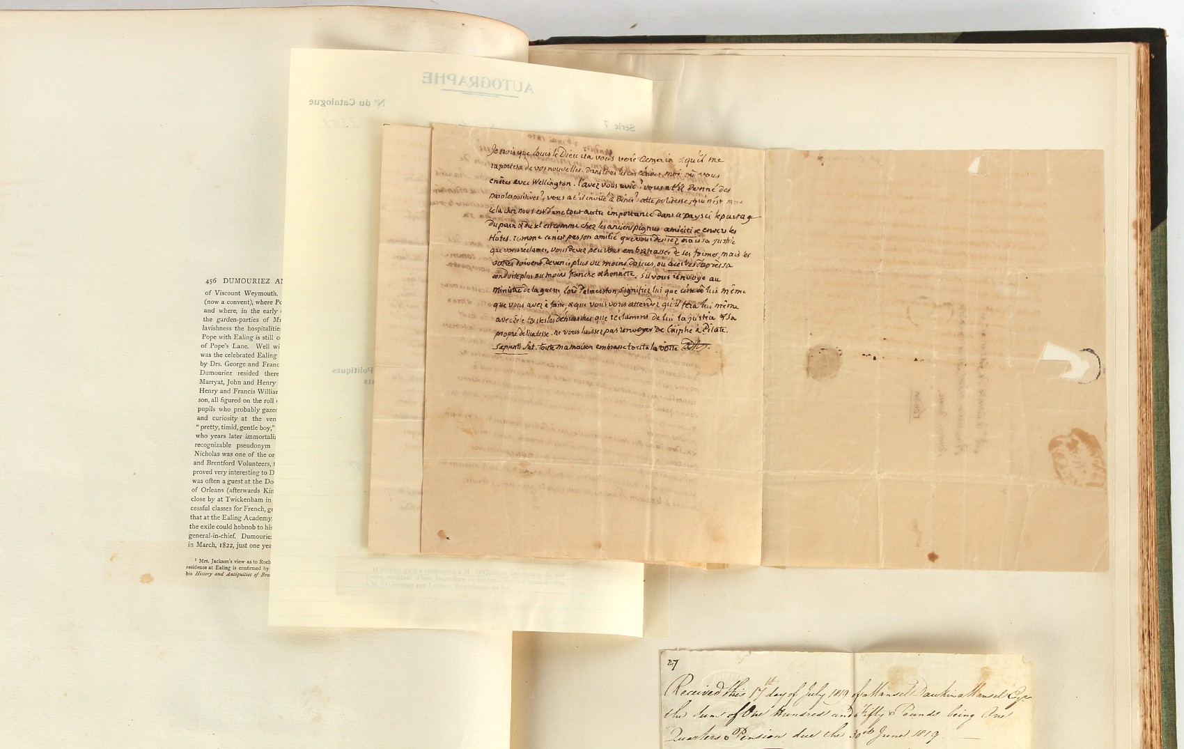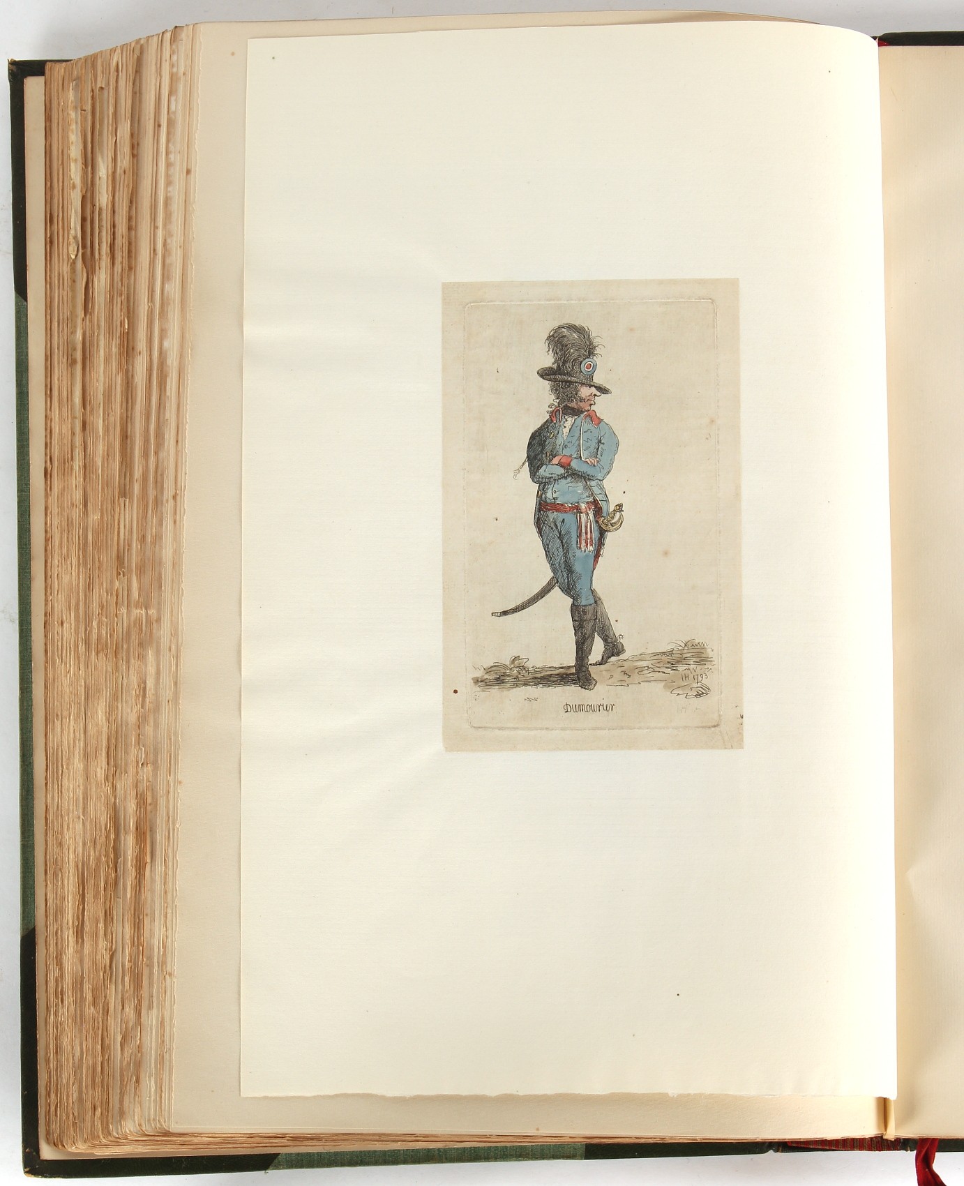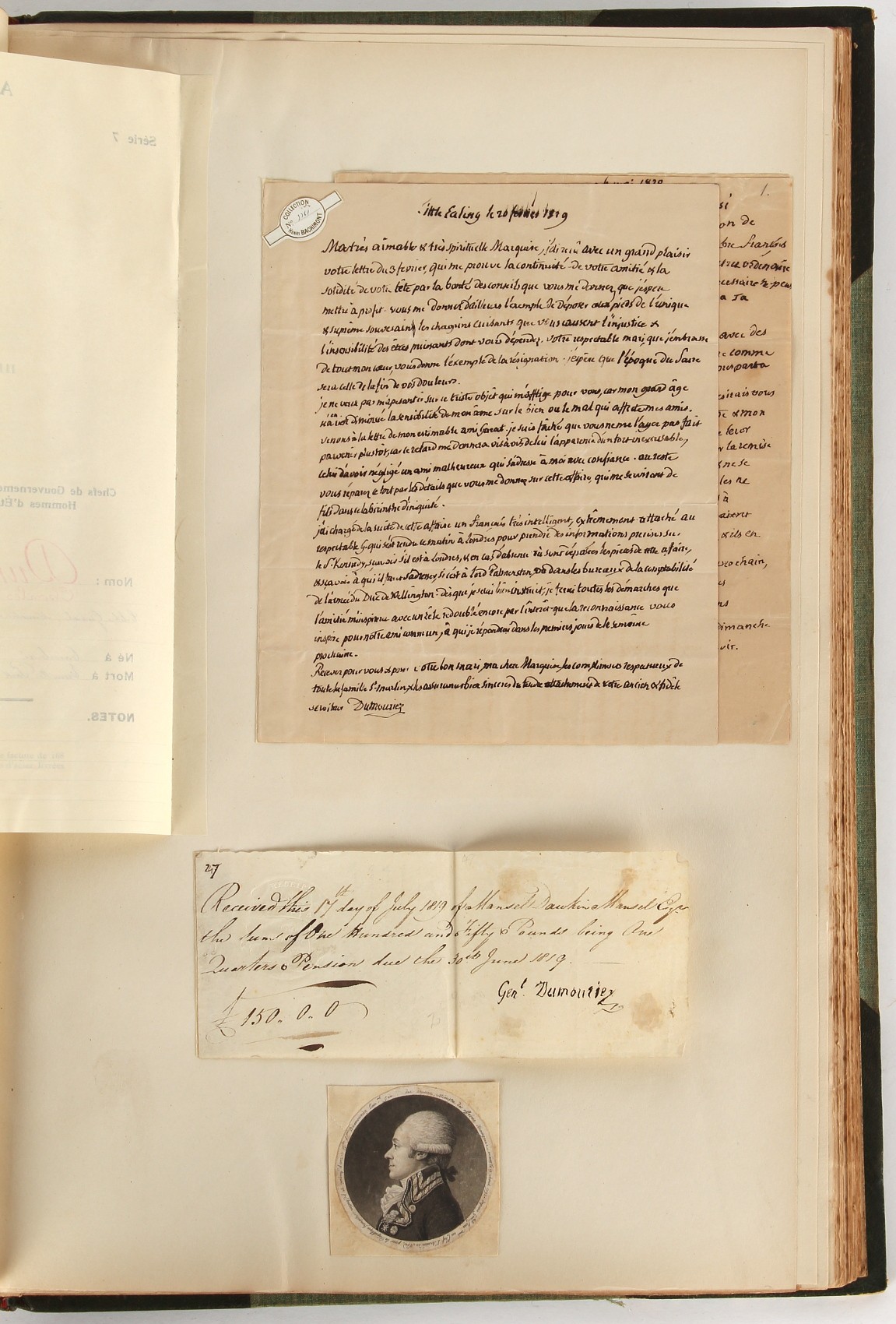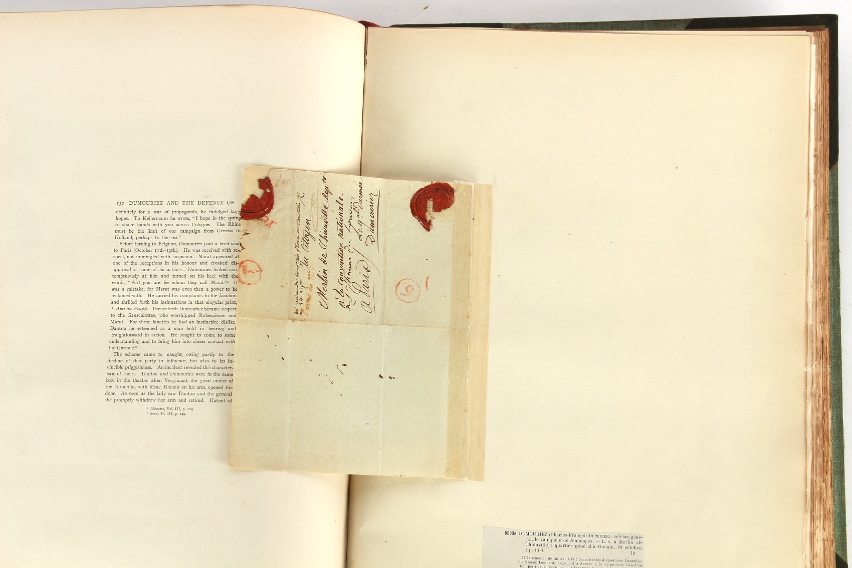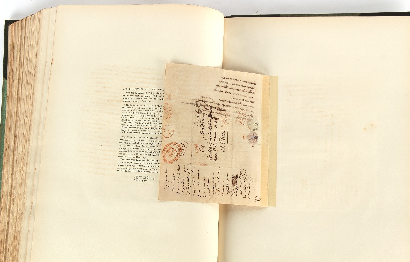 Property of a lady - Napoleonic historical interest - BROADLEY, Alexander Meyrick, and ROSE, John Holland - 'Dumouriez and the Defence of England against Napoleon' - two volume set, the personal 'Extra-Illustrated' or 'Grangerized' (or 'Grangerised') copies of Alexander Meyrick Broadley (1847-1916), London, John Lane, The Bodley Head, 1909, with tipped-in invoice from William Brendon & Son Limited Printers, Plymouth, dated 7th Sept. 1908 for £2 - - 'To one special copy pulled upon large paper, also 200 folio plain sheets', extra-illustrated or augmented with a large quantity of contemporarily hand-coloured and monochrome cartoon or caricature satirical prints, original drawings & watercolours, printed broadsides, etc., each affixed at the edges only into a window cut in to each plain folio sheet (so that backs are open & visible), Volume One including six tipped-in manuscript letters from Herbert H. Raphael (Major Sir Herbert Henry Raphael, 1st Baronet, 1859–1924) and twenty-six tipped-in manuscript letters from John Holland Rose (1855-1942) and two manuscript letters (one being four-sided) from Field Marshal Lord Roberts (1832-1914), and many other ms letters including some from Cambrai (Cambray), France (where Dumouriez was born), and the publishers (including the original contract between the authors and the publishers), all regarding the book and its compilation, also including twelve original ink manuscript letters by the subject of the book Charles Francois du Perier Dumouriez (1739-1823) (a further 16 letters by him are in Volume Two), the first dated 1765, the second (four sided) from Versailles dated 1772, the third (four sided) dated 1782, the fourth, fifth, sixth, seventh, eighth, ninth and tenth all dated 1792 when Dumouriez was Ministre des Affairs Etrangeres, Ministre de la Guerre, and Chef de L'Armee du Nord, an important ink manuscript letter from Dumouriez dated 1793 (two sided) consulting Charles James Fox on finding refuge in London (with letter from the dealer P.F. Madigan in Fifth Avenue, New York, regarding Boardley's purchase of this letter for $40), another ms letter from Dumouriez (two sided) dated 1796, and another from Antoine-Marie Chamans de Lavallette (Directeur General des Postes under Napoleon), the prints including Piercy Roberts after George Murgatroyd Woodward - 'John Bull and His Friends Commemorating The Peace' (1802); 'A Cock and Bull Story' (1803), published by Percy Roberts; a small pencil drawing portrait of Dumouriez initialled J.D. and dated 9 Oct. '69; 'La Retour en Angleterre' (we can find no record of this print); 'Carte des Descentes Faites en Angleterre et en Irlande Depuis Guillaume la Conquérant jusqu'à nos jours' (Map of the Invasions of England and Ireland from William the Conqueror to the Present) (1798), hand-coloured, with accompanying text; 'Capture of Bonaparte's Carriage', published by Edwards, 1818; a signed watercolour by G. Heberden entitled 'Genl. Dumouriez marching the Sans Culottes into Holland', 19.5 by 32.5cms.; 'A Dose for Dumourier, Evacuation of Holland and Brabant' (monochrome); and James Gillray - 'Dumourier dining in state at St James's, on the 15th of May, 1793' (monochrome), Volume Two including numerous broadsides or notices, some anti-Napoleon propaganda, one a folding monochrome broadside entitled 'An ABSTRACT of An Act for providing an Augmentation to the MILITIA, to be trained and exercised in the Manner therein directed; and for enabling His Majesty to cause the same to be embodied, in case of Necessity, for the Defence of these Kingdoms', printed by George Eyre and Andrew Strahan, 1796; lists of recruited foreign soldiers, etc.; an 'Army of Reserve Act' broadside for the Parish of St. Clement Danes, dated 1803; a Jan Kip folded engraving of Lulworth Castle entitled 'Lullworth Castle in Dorsetshire, The Seat of Humphry Weld'; other folding maps; several printed patriotic song scores of the period; a ms autograph ink sheet entitled 'Verses written on the threatened Invasion', by B. Atkinson of Bath'; a contemporary 60-page plus index ink ms booklet entitled 'Internal Defence of Essex', listing the names & number of carts & horses for each village or town to be called upon in the event of invasion; a printed list of 'Loyal Colchester Volunteers', dated July 1803; this second volume also includes a further 16 ink ms letters by Dumouriez dating from 1804 to 1822; and much more (helpfully, Broadley added a ms index of the extra illustrations); each volume approximately 20.5 by 14ins. (52 by 35.5cms.) (overall) (2). Footnote - Alexander Meyrick Broadley (1847-1916) was a British author, barrister, collector and social figure, known for defending Ahmed 'Urabi after the Urabi Revolt. Broadley penned numerous historical works later in life, particularly regarding Napoleon and his era. Among the works he authored or co-authored are 'Napoleon and the Invasion of England: The Story of the Great Terror' (London, 1908); 'Nelson’s Hardy: His Life, Letters and Friends' (London, 1909); 'Napoleon in Caricature 1795-1821' (London, 1911); and 'Napoleon in Exile' (London, 1914). Broadley was known as a celebrated grangeriser (or extra-illustrator) of books, and one of his greatest achievements was the creation, with the assistance of Daniell, of an extra-illustrated set of Rose’s 'Life of Napoleon I' and Rosebery’s 'Napoleon. The Last Phase', by inlaying and extending the works from three octavo to twenty-eight folio volumes with engravings, portraits, manuscripts, autograph letters, etc. over a period of four years. This monumental work was bought by George Nathaniel Curzon, Marquess Curzon of Kedleston at the auction of Broadley’s library held in four sales between 1916 and 1918, and Curzon later bequeathed the set to the Bodleian Library, Oxford.