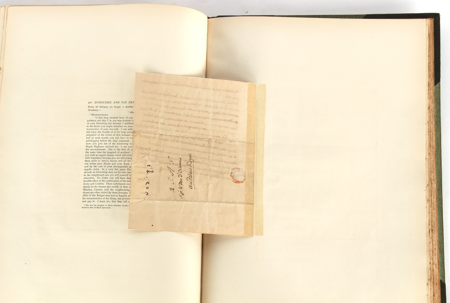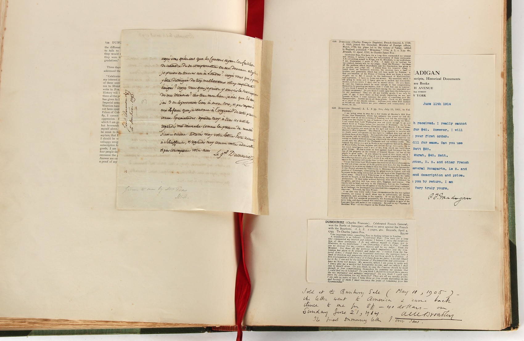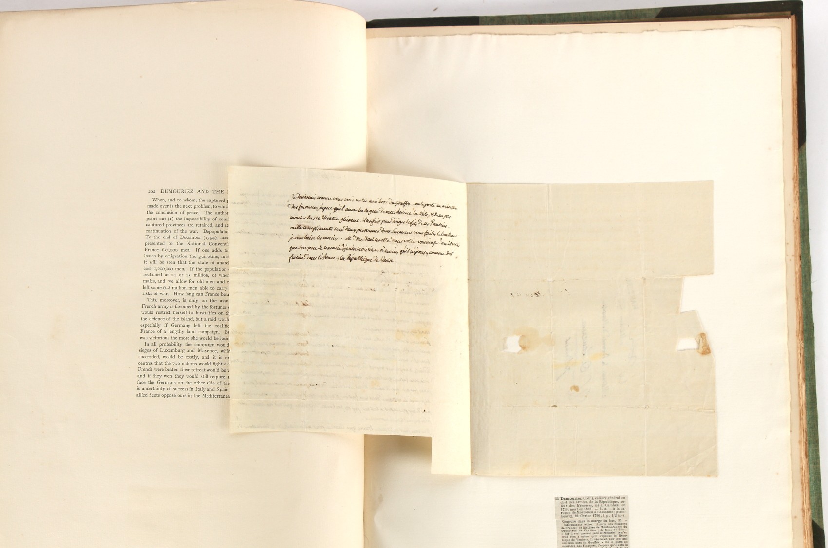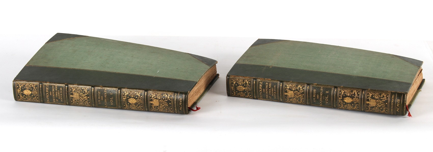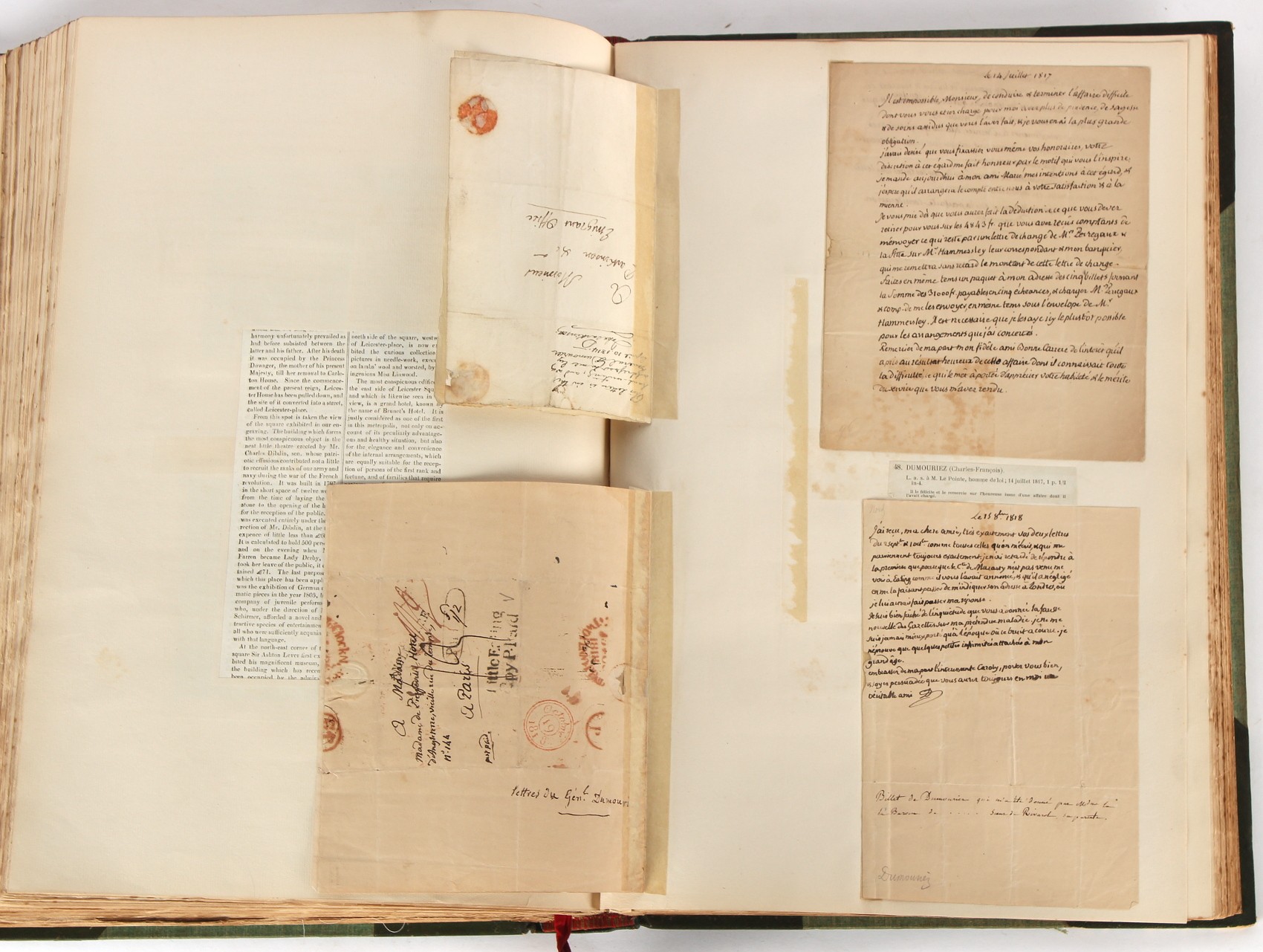 Property of a lady - Napoleonic historical interest - BROADLEY, Alexander Meyrick, and ROSE, John Holland - 'Dumouriez and the Defence of England against Napoleon' - two volume set, the personal 'Extra-Illustrated' or 'Grangerized' (or 'Grangerised') copies of Alexander Meyrick Broadley (1847-1916), London, John Lane, The Bodley Head, 1909, with tipped-in invoice from William Brendon & Son Limited Printers, Plymouth, dated 7th Sept. 1908 for £2 - - 'To one special copy pulled upon large paper, also 200 folio plain sheets', extra-illustrated or augmented with a large quantity of contemporarily hand-coloured and monochrome cartoon or caricature satirical prints, original drawings & watercolours, printed broadsides, etc., each affixed at the edges only into a window cut in to each plain folio sheet (so that backs are open & visible), Volume One including six tipped-in manuscript letters from Herbert H. Raphael (Major Sir Herbert Henry Raphael, 1st Baronet, 1859–1924) and twenty-six tipped-in manuscript letters from John Holland Rose (1855-1942) and two manuscript letters (one being four-sided) from Field Marshal Lord Roberts (1832-1914), and many other ms letters including some from Cambrai (Cambray), France (where Dumouriez was born), and the publishers (including the original contract between the authors and the publishers), all regarding the book and its compilation, also including twelve original ink manuscript letters by the subject of the book Charles Francois du Perier Dumouriez (1739-1823) (a further 16 letters by him are in Volume Two), the first dated 1765, the second (four sided) from Versailles dated 1772, the third (four sided) dated 1782, the fourth, fifth, sixth, seventh, eighth, ninth and tenth all dated 1792 when Dumouriez was Ministre des Affairs Etrangeres, Ministre de la Guerre, and Chef de L'Armee du Nord, an important ink manuscript letter from Dumouriez dated 1793 (two sided) consulting Charles James Fox on finding refuge in London (with letter from the dealer P.F. Madigan in Fifth Avenue, New York, regarding Boardley's purchase of this letter for $40), another ms letter from Dumouriez (two sided) dated 1796, and another from Antoine-Marie Chamans de Lavallette (Directeur General des Postes under Napoleon), the prints including Piercy Roberts after George Murgatroyd Woodward - 'John Bull and His Friends Commemorating The Peace' (1802); 'A Cock and Bull Story' (1803), published by Percy Roberts; a small pencil drawing portrait of Dumouriez initialled J.D. and dated 9 Oct. '69; 'La Retour en Angleterre' (we can find no record of this print); 'Carte des Descentes Faites en Angleterre et en Irlande Depuis Guillaume la Conquérant jusqu'à nos jours' (Map of the Invasions of England and Ireland from William the Conqueror to the Present) (1798), hand-coloured, with accompanying text; 'Capture of Bonaparte's Carriage', published by Edwards, 1818; a signed watercolour by G. Heberden entitled 'Genl. Dumouriez marching the Sans Culottes into Holland', 19.5 by 32.5cms.; 'A Dose for Dumourier, Evacuation of Holland and Brabant' (monochrome); and James Gillray - 'Dumourier dining in state at St James's, on the 15th of May, 1793' (monochrome), Volume Two including numerous broadsides or notices, some anti-Napoleon propaganda, one a folding monochrome broadside entitled 'An ABSTRACT of An Act for providing an Augmentation to the MILITIA, to be trained and exercised in the Manner therein directed; and for enabling His Majesty to cause the same to be embodied, in case of Necessity, for the Defence of these Kingdoms', printed by George Eyre and Andrew Strahan, 1796; lists of recruited foreign soldiers, etc.; an 'Army of Reserve Act' broadside for the Parish of St. Clement Danes, dated 1803; a Jan Kip folded engraving of Lulworth Castle entitled 'Lullworth Castle in Dorsetshire, The Seat of Humphry Weld'; other folding maps; several printed patriotic song scores of the period; a ms autograph ink sheet entitled 'Verses written on the threatened Invasion', by B. Atkinson of Bath'; a contemporary 60-page plus index ink ms booklet entitled 'Internal Defence of Essex', listing the names & number of carts & horses for each village or town to be called upon in the event of invasion; a printed list of 'Loyal Colchester Volunteers', dated July 1803; this second volume also includes a further 16 ink ms letters by Dumouriez dating from 1804 to 1822; and much more (helpfully, Broadley added a ms index of the extra illustrations); each volume approximately 20.5 by 14ins. (52 by 35.5cms.) (overall) (2). Footnote - Alexander Meyrick Broadley (1847-1916) was a British author, barrister, collector and social figure, known for defending Ahmed 'Urabi after the Urabi Revolt. Broadley penned numerous historical works later in life, particularly regarding Napoleon and his era. Among the works he authored or co-authored are 'Napoleon and the Invasion of England: The Story of the Great Terror' (London, 1908); 'Nelson’s Hardy: His Life, Letters and Friends' (London, 1909); 'Napoleon in Caricature 1795-1821' (London, 1911); and 'Napoleon in Exile' (London, 1914). Broadley was known as a celebrated grangeriser (or extra-illustrator) of books, and one of his greatest achievements was the creation, with the assistance of Daniell, of an extra-illustrated set of Rose’s 'Life of Napoleon I' and Rosebery’s 'Napoleon. The Last Phase', by inlaying and extending the works from three octavo to twenty-eight folio volumes with engravings, portraits, manuscripts, autograph letters, etc. over a period of four years. This monumental work was bought by George Nathaniel Curzon, Marquess Curzon of Kedleston at the auction of Broadley’s library held in four sales between 1916 and 1918, and Curzon later bequeathed the set to the Bodleian Library, Oxford.