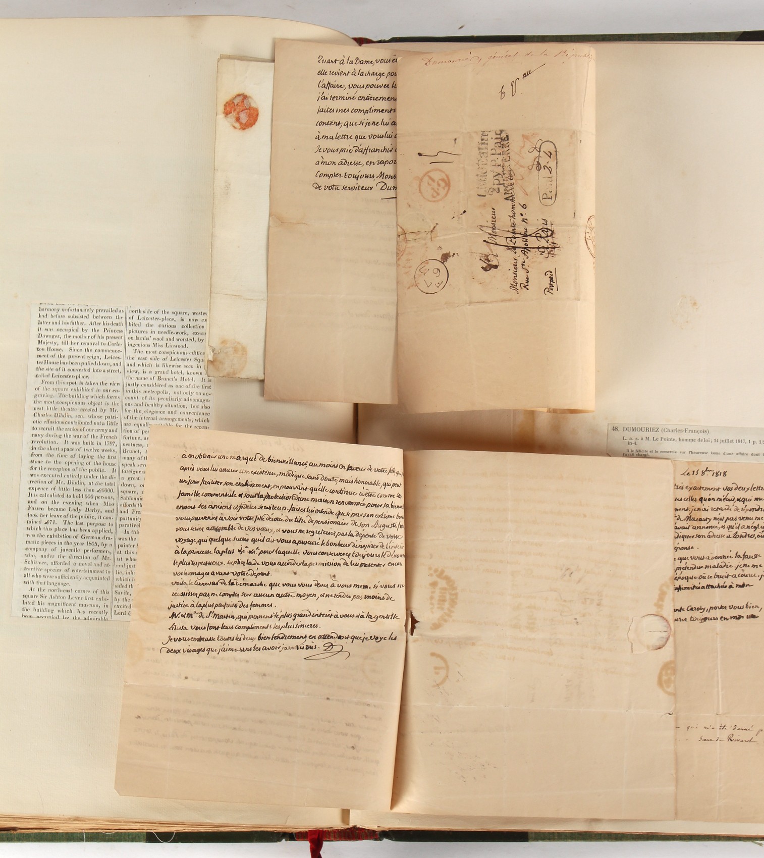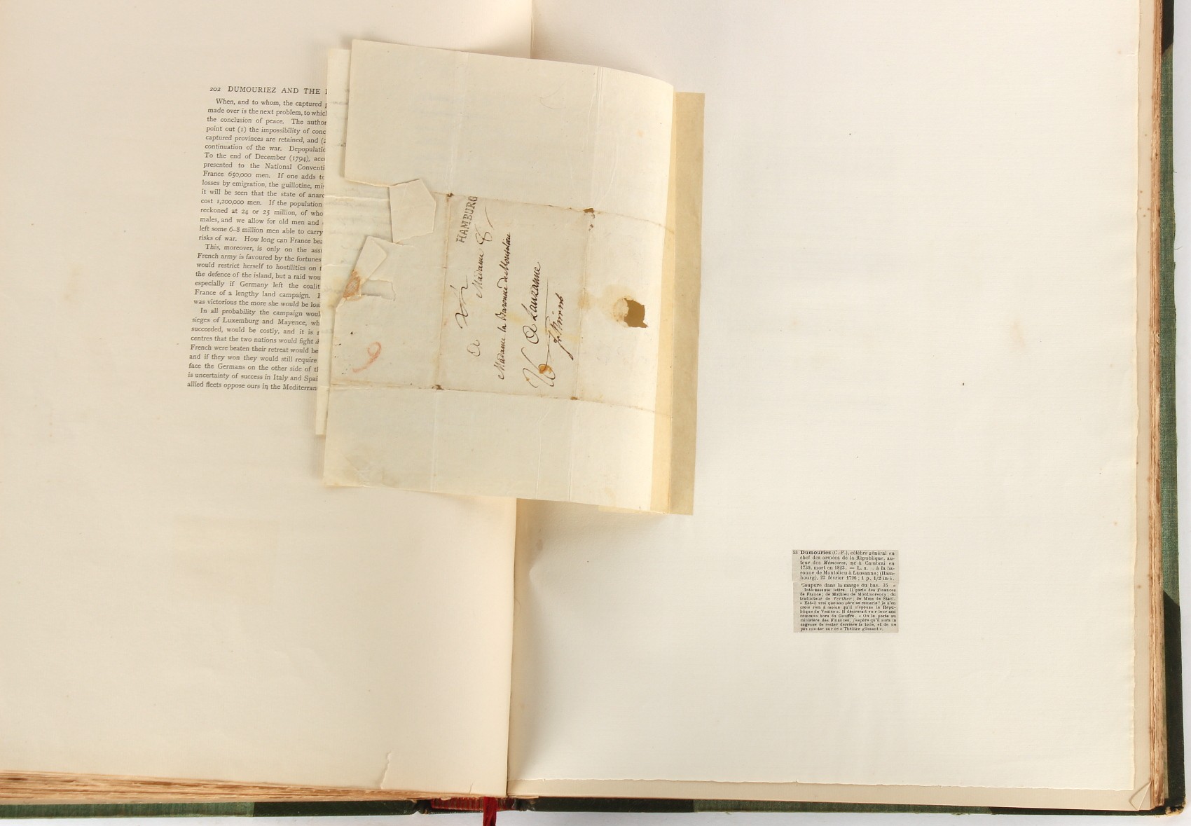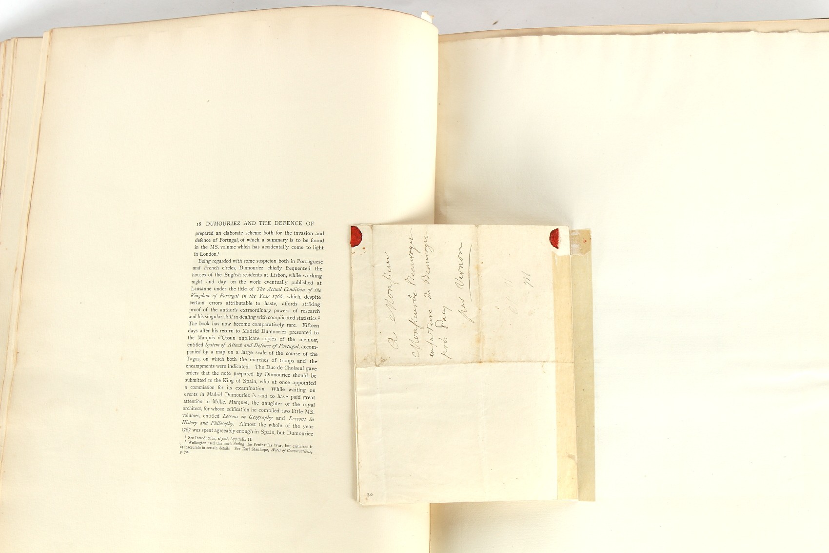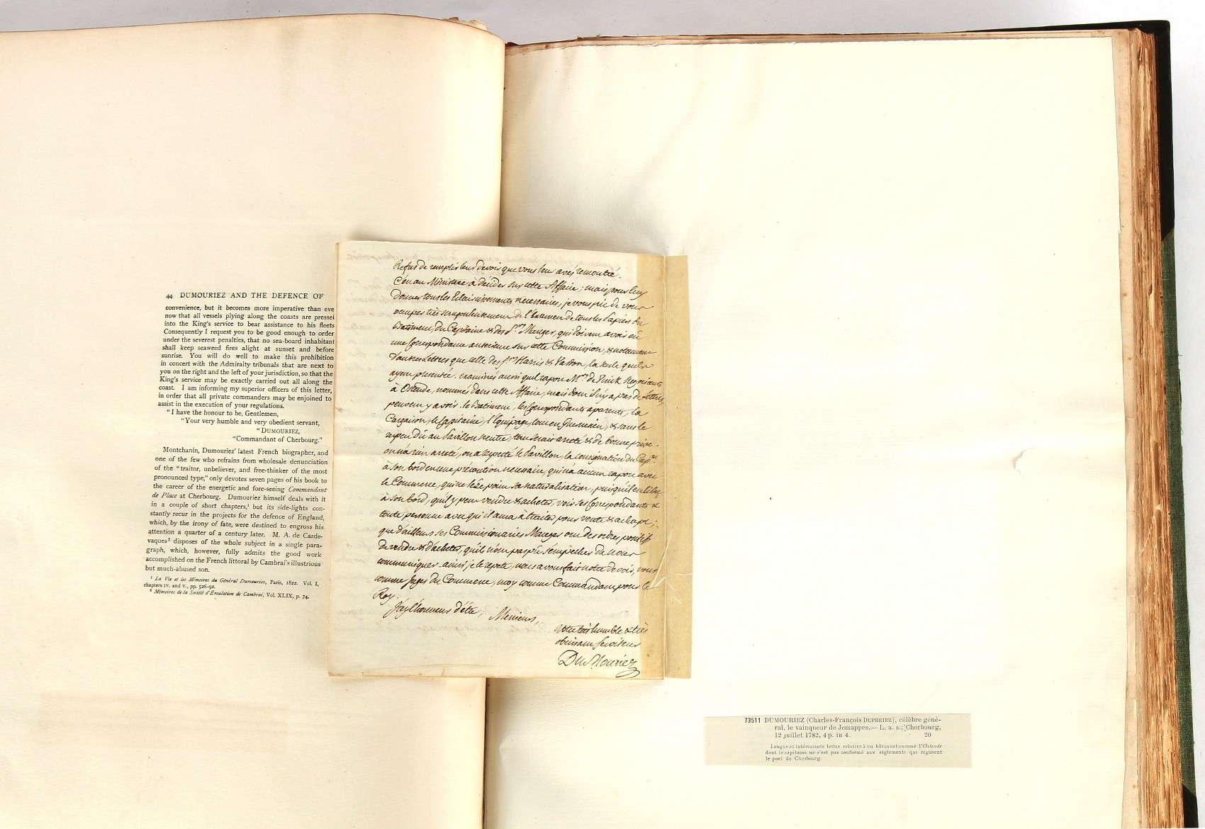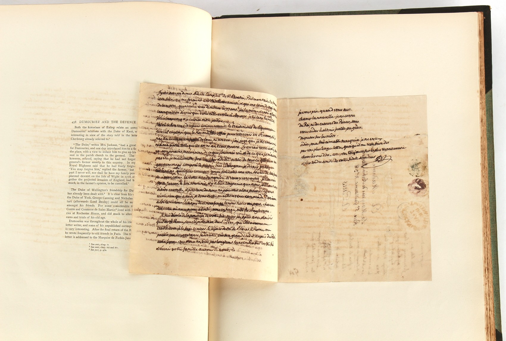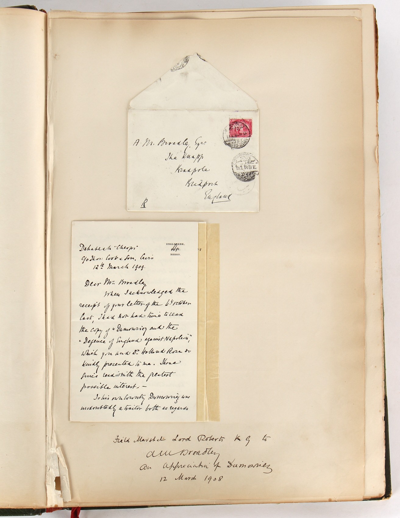 Property of a lady - Napoleonic historical interest - BROADLEY, Alexander Meyrick, and ROSE, John Holland - 'Dumouriez and the Defence of England against Napoleon' - two volume set, the personal 'Extra-Illustrated' or 'Grangerized' (or 'Grangerised') copies of Alexander Meyrick Broadley (1847-1916), London, John Lane, The Bodley Head, 1909, with tipped-in invoice from William Brendon & Son Limited Printers, Plymouth, dated 7th Sept. 1908 for £2 - - 'To one special copy pulled upon large paper, also 200 folio plain sheets', extra-illustrated or augmented with a large quantity of contemporarily hand-coloured and monochrome cartoon or caricature satirical prints, original drawings & watercolours, printed broadsides, etc., each affixed at the edges only into a window cut in to each plain folio sheet (so that backs are open & visible), Volume One including six tipped-in manuscript letters from Herbert H. Raphael (Major Sir Herbert Henry Raphael, 1st Baronet, 1859–1924) and twenty-six tipped-in manuscript letters from John Holland Rose (1855-1942) and two manuscript letters (one being four-sided) from Field Marshal Lord Roberts (1832-1914), and many other ms letters including some from Cambrai (Cambray), France (where Dumouriez was born), and the publishers (including the original contract between the authors and the publishers), all regarding the book and its compilation, also including twelve original ink manuscript letters by the subject of the book Charles Francois du Perier Dumouriez (1739-1823) (a further 16 letters by him are in Volume Two), the first dated 1765, the second (four sided) from Versailles dated 1772, the third (four sided) dated 1782, the fourth, fifth, sixth, seventh, eighth, ninth and tenth all dated 1792 when Dumouriez was Ministre des Affairs Etrangeres, Ministre de la Guerre, and Chef de L'Armee du Nord, an important ink manuscript letter from Dumouriez dated 1793 (two sided) consulting Charles James Fox on finding refuge in London (with letter from the dealer P.F. Madigan in Fifth Avenue, New York, regarding Boardley's purchase of this letter for $40), another ms letter from Dumouriez (two sided) dated 1796, and another from Antoine-Marie Chamans de Lavallette (Directeur General des Postes under Napoleon), the prints including Piercy Roberts after George Murgatroyd Woodward - 'John Bull and His Friends Commemorating The Peace' (1802); 'A Cock and Bull Story' (1803), published by Percy Roberts; a small pencil drawing portrait of Dumouriez initialled J.D. and dated 9 Oct. '69; 'La Retour en Angleterre' (we can find no record of this print); 'Carte des Descentes Faites en Angleterre et en Irlande Depuis Guillaume la Conquérant jusqu'à nos jours' (Map of the Invasions of England and Ireland from William the Conqueror to the Present) (1798), hand-coloured, with accompanying text; 'Capture of Bonaparte's Carriage', published by Edwards, 1818; a signed watercolour by G. Heberden entitled 'Genl. Dumouriez marching the Sans Culottes into Holland', 19.5 by 32.5cms.; 'A Dose for Dumourier, Evacuation of Holland and Brabant' (monochrome); and James Gillray - 'Dumourier dining in state at St James's, on the 15th of May, 1793' (monochrome), Volume Two including numerous broadsides or notices, some anti-Napoleon propaganda, one a folding monochrome broadside entitled 'An ABSTRACT of An Act for providing an Augmentation to the MILITIA, to be trained and exercised in the Manner therein directed; and for enabling His Majesty to cause the same to be embodied, in case of Necessity, for the Defence of these Kingdoms', printed by George Eyre and Andrew Strahan, 1796; lists of recruited foreign soldiers, etc.; an 'Army of Reserve Act' broadside for the Parish of St. Clement Danes, dated 1803; a Jan Kip folded engraving of Lulworth Castle entitled 'Lullworth Castle in Dorsetshire, The Seat of Humphry Weld'; other folding maps; several printed patriotic song scores of the period; a ms autograph ink sheet entitled 'Verses written on the threatened Invasion', by B. Atkinson of Bath'; a contemporary 60-page plus index ink ms booklet entitled 'Internal Defence of Essex', listing the names & number of carts & horses for each village or town to be called upon in the event of invasion; a printed list of 'Loyal Colchester Volunteers', dated July 1803; this second volume also includes a further 16 ink ms letters by Dumouriez dating from 1804 to 1822; and much more (helpfully, Broadley added a ms index of the extra illustrations); each volume approximately 20.5 by 14ins. (52 by 35.5cms.) (overall) (2). Footnote - Alexander Meyrick Broadley (1847-1916) was a British author, barrister, collector and social figure, known for defending Ahmed 'Urabi after the Urabi Revolt. Broadley penned numerous historical works later in life, particularly regarding Napoleon and his era. Among the works he authored or co-authored are 'Napoleon and the Invasion of England: The Story of the Great Terror' (London, 1908); 'Nelson’s Hardy: His Life, Letters and Friends' (London, 1909); 'Napoleon in Caricature 1795-1821' (London, 1911); and 'Napoleon in Exile' (London, 1914). Broadley was known as a celebrated grangeriser (or extra-illustrator) of books, and one of his greatest achievements was the creation, with the assistance of Daniell, of an extra-illustrated set of Rose’s 'Life of Napoleon I' and Rosebery’s 'Napoleon. The Last Phase', by inlaying and extending the works from three octavo to twenty-eight folio volumes with engravings, portraits, manuscripts, autograph letters, etc. over a period of four years. This monumental work was bought by George Nathaniel Curzon, Marquess Curzon of Kedleston at the auction of Broadley’s library held in four sales between 1916 and 1918, and Curzon later bequeathed the set to the Bodleian Library, Oxford.