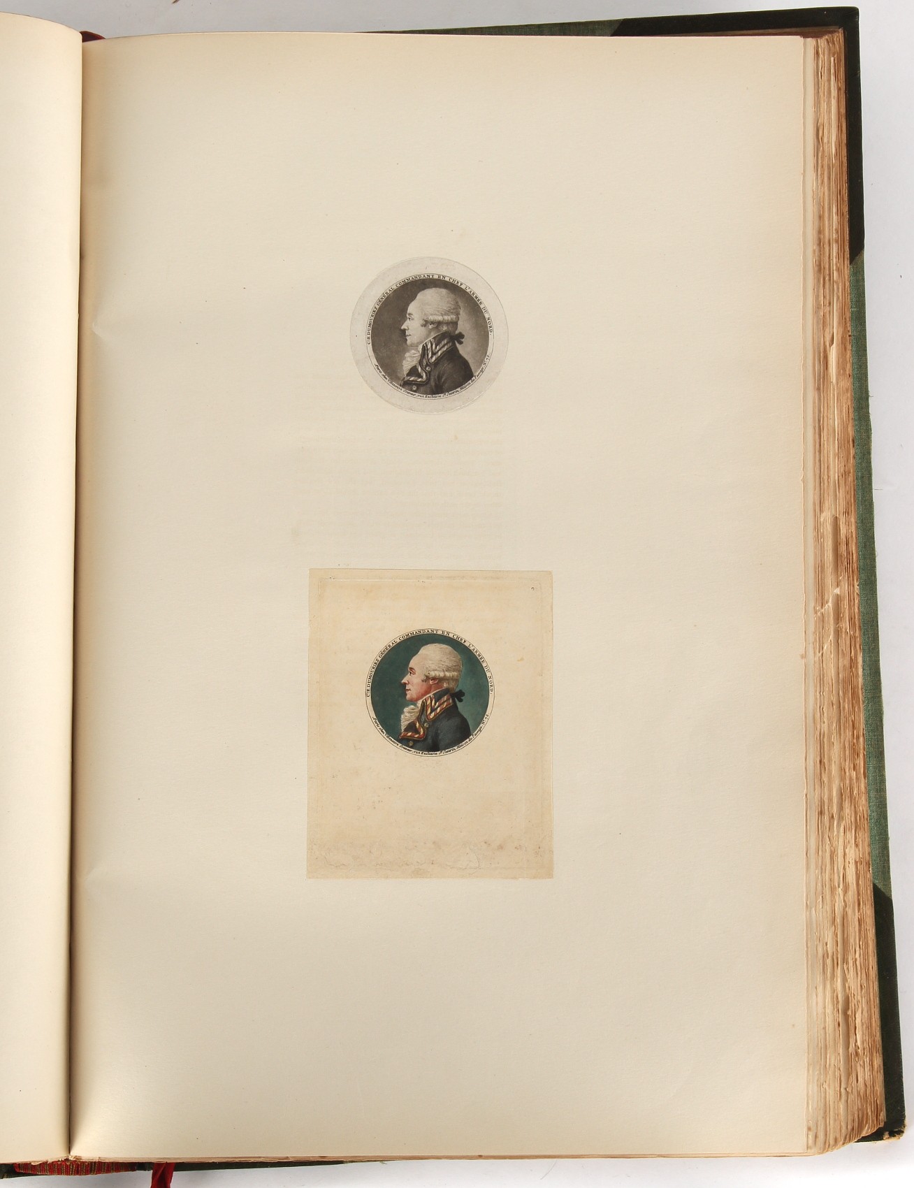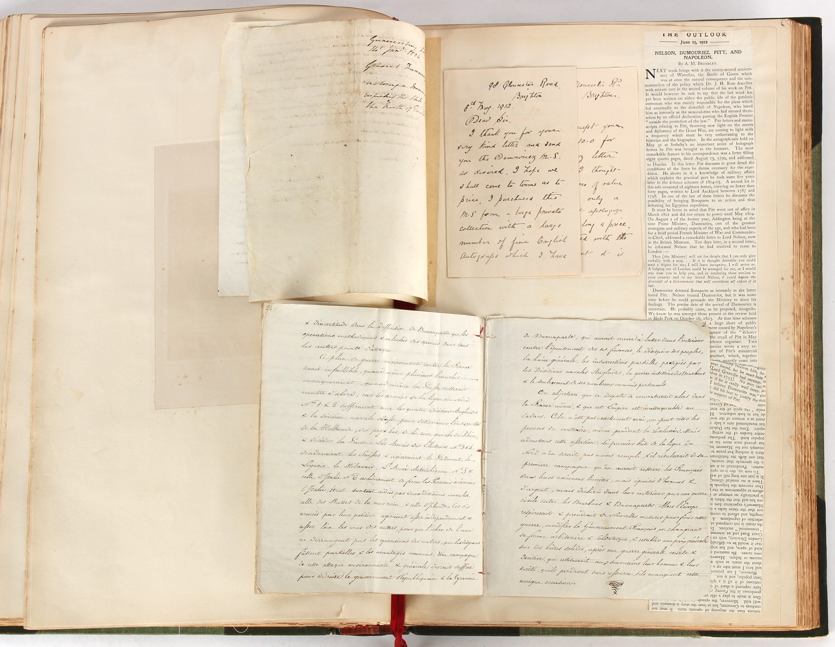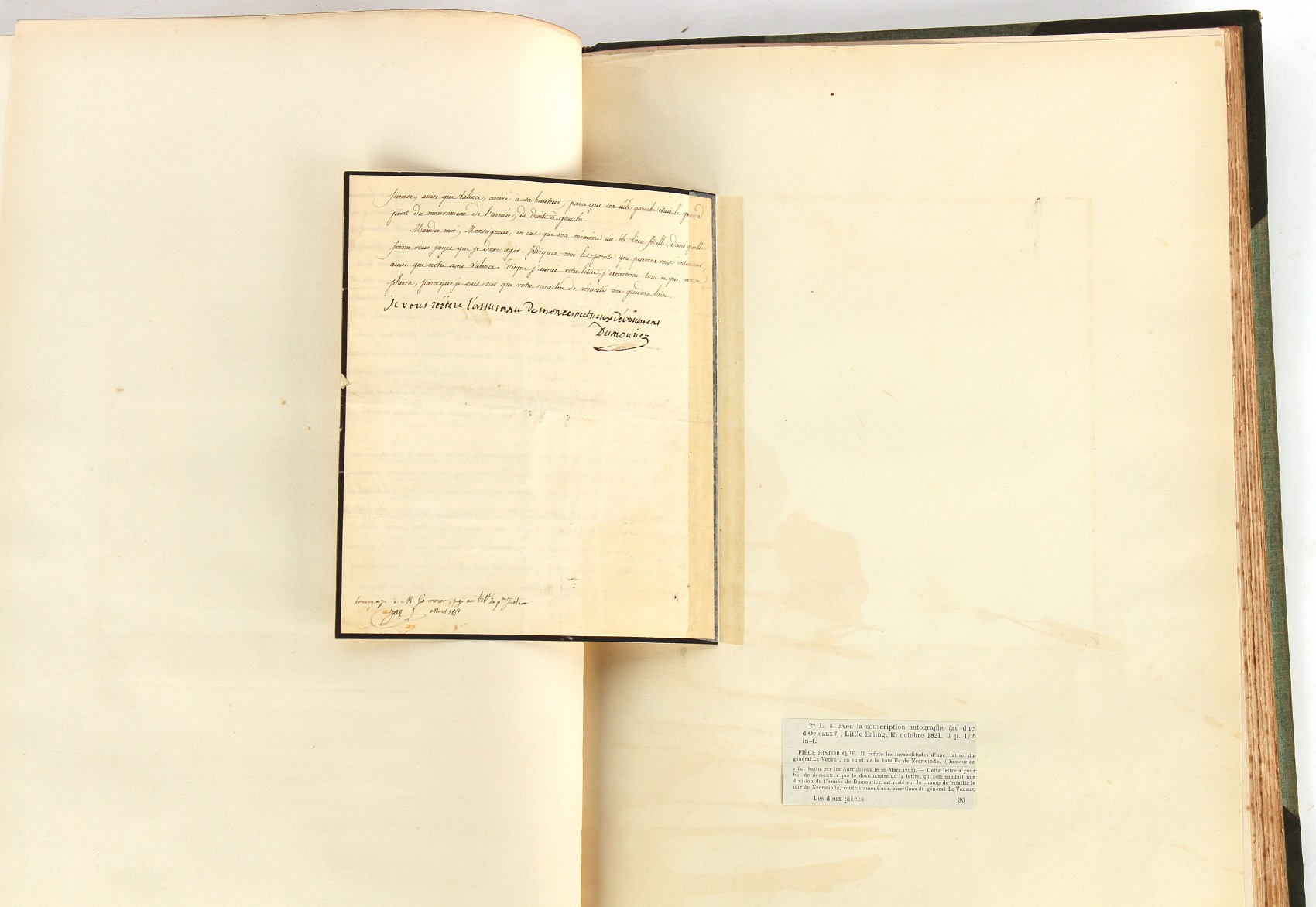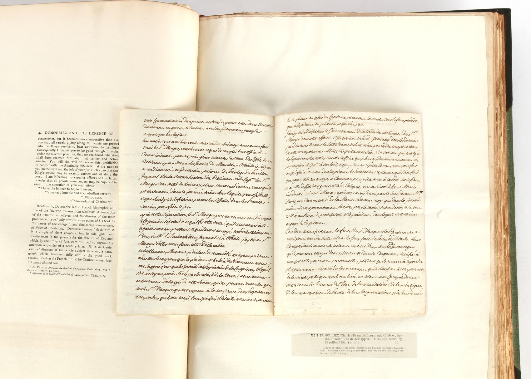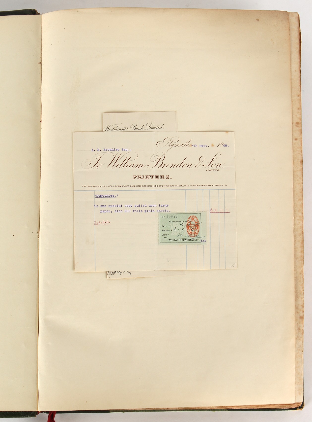 Property of a lady - Napoleonic historical interest - BROADLEY, Alexander Meyrick, and ROSE, John Holland - 'Dumouriez and the Defence of England against Napoleon' - two volume set, the personal 'Extra-Illustrated' or 'Grangerized' (or 'Grangerised') copies of Alexander Meyrick Broadley (1847-1916), London, John Lane, The Bodley Head, 1909, with tipped-in invoice from William Brendon & Son Limited Printers, Plymouth, dated 7th Sept. 1908 for £2 - - 'To one special copy pulled upon large paper, also 200 folio plain sheets', extra-illustrated or augmented with a large quantity of contemporarily hand-coloured and monochrome cartoon or caricature satirical prints, original drawings & watercolours, printed broadsides, etc., each affixed at the edges only into a window cut in to each plain folio sheet (so that backs are open & visible), Volume One including six tipped-in manuscript letters from Herbert H. Raphael (Major Sir Herbert Henry Raphael, 1st Baronet, 1859–1924) and twenty-six tipped-in manuscript letters from John Holland Rose (1855-1942) and two manuscript letters (one being four-sided) from Field Marshal Lord Roberts (1832-1914), and many other ms letters including some from Cambrai (Cambray), France (where Dumouriez was born), and the publishers (including the original contract between the authors and the publishers), all regarding the book and its compilation, also including twelve original ink manuscript letters by the subject of the book Charles Francois du Perier Dumouriez (1739-1823) (a further 16 letters by him are in Volume Two), the first dated 1765, the second (four sided) from Versailles dated 1772, the third (four sided) dated 1782, the fourth, fifth, sixth, seventh, eighth, ninth and tenth all dated 1792 when Dumouriez was Ministre des Affairs Etrangeres, Ministre de la Guerre, and Chef de L'Armee du Nord, an important ink manuscript letter from Dumouriez dated 1793 (two sided) consulting Charles James Fox on finding refuge in London (with letter from the dealer P.F. Madigan in Fifth Avenue, New York, regarding Boardley's purchase of this letter for $40), another ms letter from Dumouriez (two sided) dated 1796, and another from Antoine-Marie Chamans de Lavallette (Directeur General des Postes under Napoleon), the prints including Piercy Roberts after George Murgatroyd Woodward - 'John Bull and His Friends Commemorating The Peace' (1802); 'A Cock and Bull Story' (1803), published by Percy Roberts; a small pencil drawing portrait of Dumouriez initialled J.D. and dated 9 Oct. '69; 'La Retour en Angleterre' (we can find no record of this print); 'Carte des Descentes Faites en Angleterre et en Irlande Depuis Guillaume la Conquérant jusqu'à nos jours' (Map of the Invasions of England and Ireland from William the Conqueror to the Present) (1798), hand-coloured, with accompanying text; 'Capture of Bonaparte's Carriage', published by Edwards, 1818; a signed watercolour by G. Heberden entitled 'Genl. Dumouriez marching the Sans Culottes into Holland', 19.5 by 32.5cms.; 'A Dose for Dumourier, Evacuation of Holland and Brabant' (monochrome); and James Gillray - 'Dumourier dining in state at St James's, on the 15th of May, 1793' (monochrome), Volume Two including numerous broadsides or notices, some anti-Napoleon propaganda, one a folding monochrome broadside entitled 'An ABSTRACT of An Act for providing an Augmentation to the MILITIA, to be trained and exercised in the Manner therein directed; and for enabling His Majesty to cause the same to be embodied, in case of Necessity, for the Defence of these Kingdoms', printed by George Eyre and Andrew Strahan, 1796; lists of recruited foreign soldiers, etc.; an 'Army of Reserve Act' broadside for the Parish of St. Clement Danes, dated 1803; a Jan Kip folded engraving of Lulworth Castle entitled 'Lullworth Castle in Dorsetshire, The Seat of Humphry Weld'; other folding maps; several printed patriotic song scores of the period; a ms autograph ink sheet entitled 'Verses written on the threatened Invasion', by B. Atkinson of Bath'; a contemporary 60-page plus index ink ms booklet entitled 'Internal Defence of Essex', listing the names & number of carts & horses for each village or town to be called upon in the event of invasion; a printed list of 'Loyal Colchester Volunteers', dated July 1803; this second volume also includes a further 16 ink ms letters by Dumouriez dating from 1804 to 1822; and much more (helpfully, Broadley added a ms index of the extra illustrations); each volume approximately 20.5 by 14ins. (52 by 35.5cms.) (overall) (2). Footnote - Alexander Meyrick Broadley (1847-1916) was a British author, barrister, collector and social figure, known for defending Ahmed 'Urabi after the Urabi Revolt. Broadley penned numerous historical works later in life, particularly regarding Napoleon and his era. Among the works he authored or co-authored are 'Napoleon and the Invasion of England: The Story of the Great Terror' (London, 1908); 'Nelson’s Hardy: His Life, Letters and Friends' (London, 1909); 'Napoleon in Caricature 1795-1821' (London, 1911); and 'Napoleon in Exile' (London, 1914). Broadley was known as a celebrated grangeriser (or extra-illustrator) of books, and one of his greatest achievements was the creation, with the assistance of Daniell, of an extra-illustrated set of Rose’s 'Life of Napoleon I' and Rosebery’s 'Napoleon. The Last Phase', by inlaying and extending the works from three octavo to twenty-eight folio volumes with engravings, portraits, manuscripts, autograph letters, etc. over a period of four years. This monumental work was bought by George Nathaniel Curzon, Marquess Curzon of Kedleston at the auction of Broadley’s library held in four sales between 1916 and 1918, and Curzon later bequeathed the set to the Bodleian Library, Oxford.
