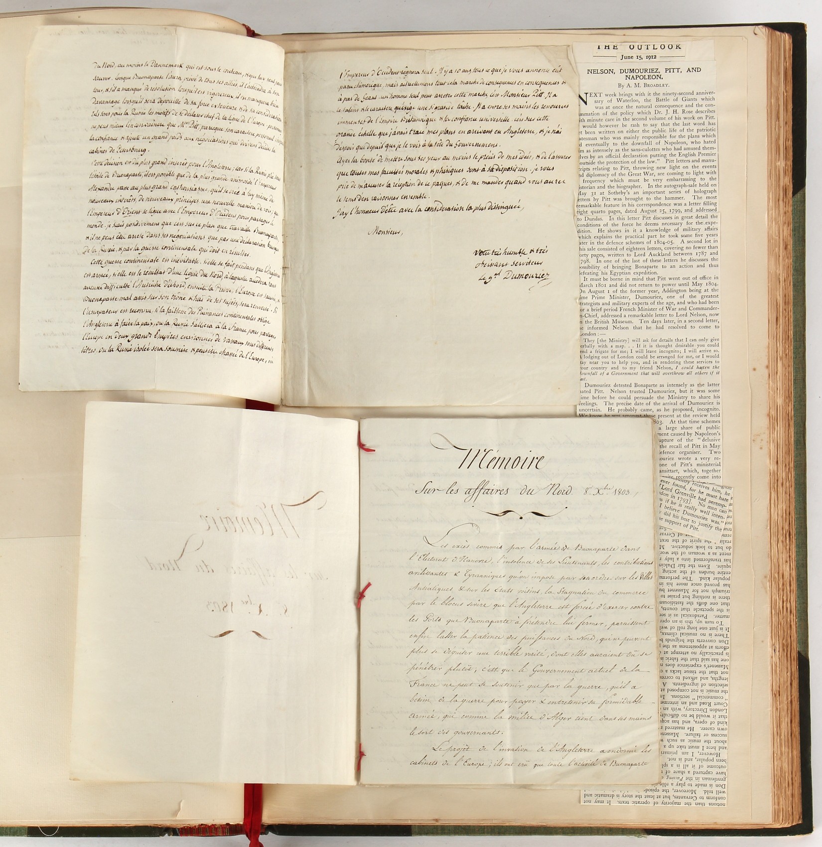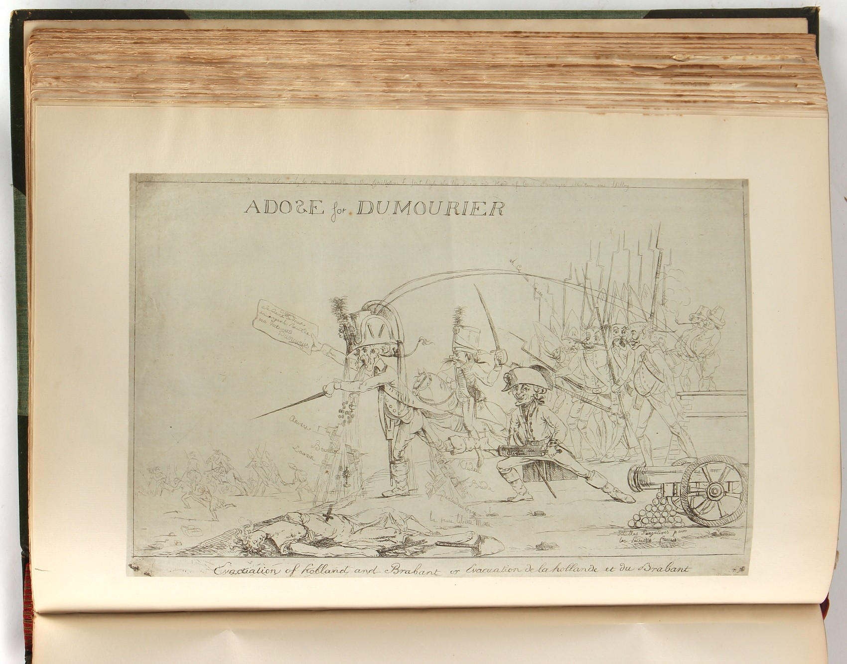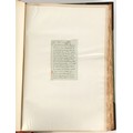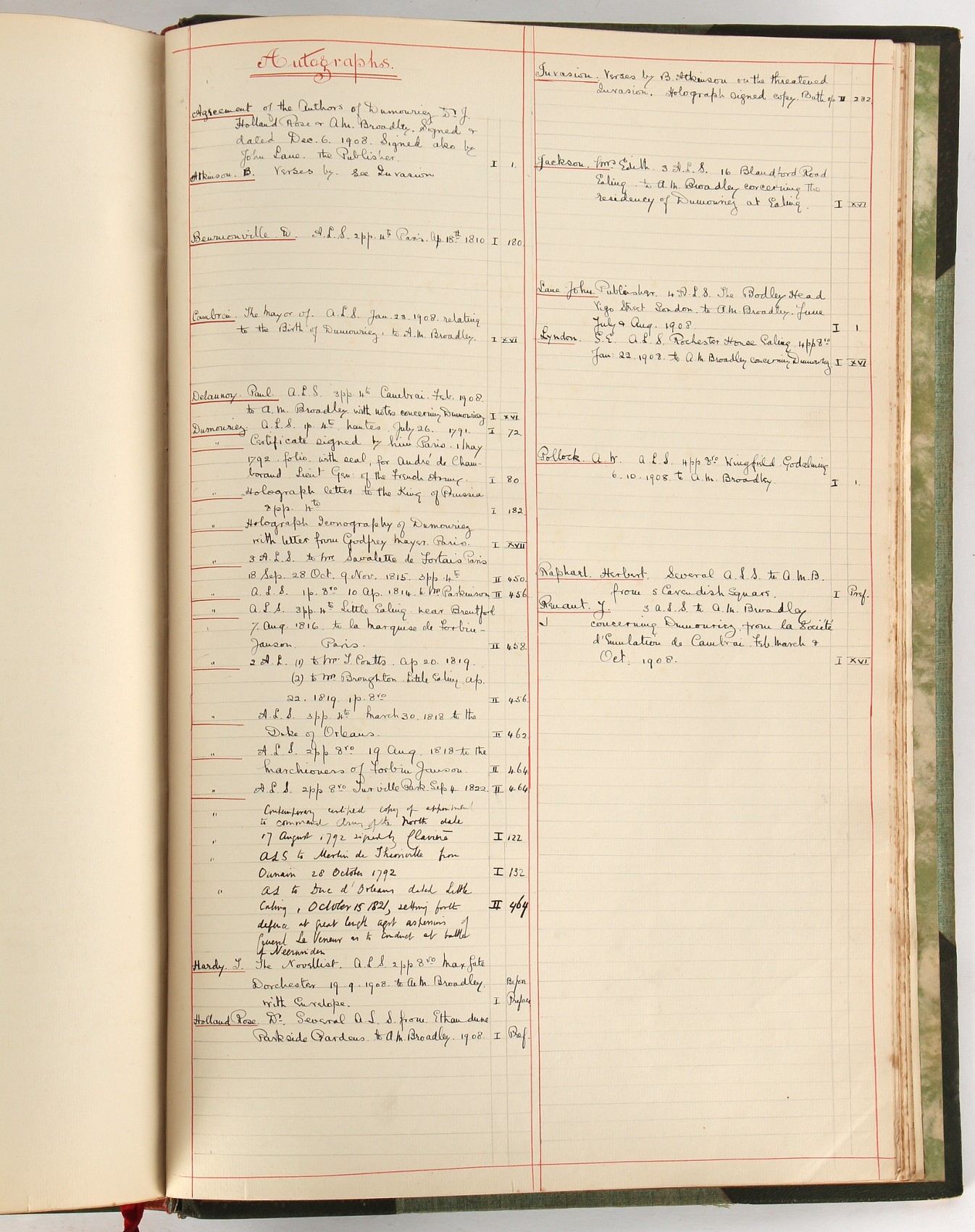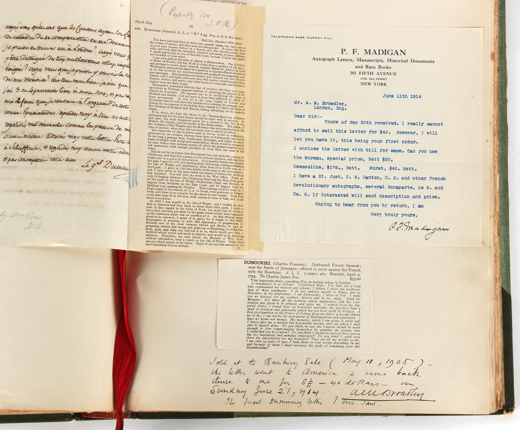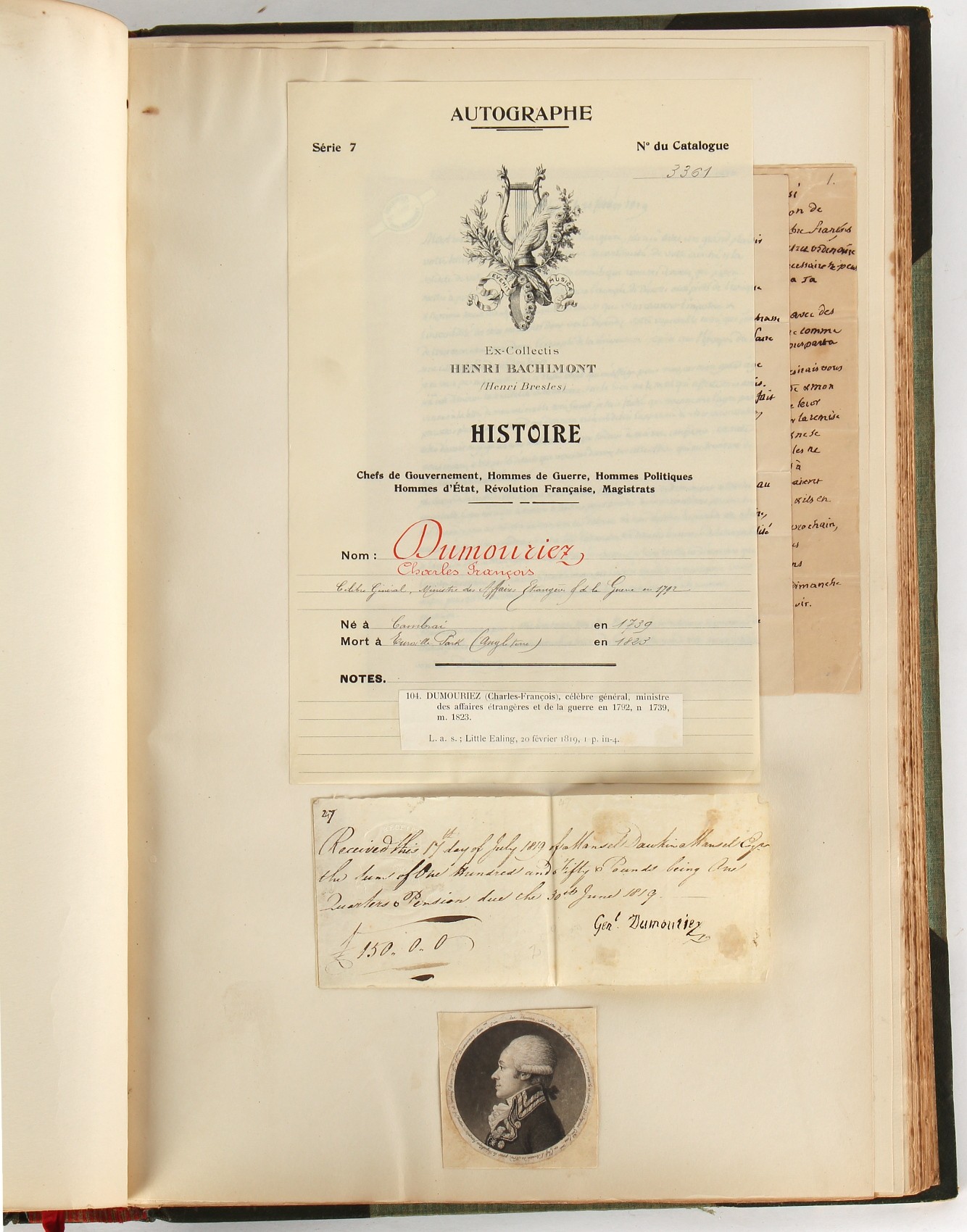 Property of a lady - Napoleonic historical interest - BROADLEY, Alexander Meyrick, and ROSE, John Holland - 'Dumouriez and the Defence of England against Napoleon' - two volume set, the personal 'Extra-Illustrated' or 'Grangerized' (or 'Grangerised') copies of Alexander Meyrick Broadley (1847-1916), London, John Lane, The Bodley Head, 1909, with tipped-in invoice from William Brendon & Son Limited Printers, Plymouth, dated 7th Sept. 1908 for £2 - - 'To one special copy pulled upon large paper, also 200 folio plain sheets', extra-illustrated or augmented with a large quantity of contemporarily hand-coloured and monochrome cartoon or caricature satirical prints, original drawings & watercolours, printed broadsides, etc., each affixed at the edges only into a window cut in to each plain folio sheet (so that backs are open & visible), Volume One including six tipped-in manuscript letters from Herbert H. Raphael (Major Sir Herbert Henry Raphael, 1st Baronet, 1859–1924) and twenty-six tipped-in manuscript letters from John Holland Rose (1855-1942) and two manuscript letters (one being four-sided) from Field Marshal Lord Roberts (1832-1914), and many other ms letters including some from Cambrai (Cambray), France (where Dumouriez was born), and the publishers (including the original contract between the authors and the publishers), all regarding the book and its compilation, also including twelve original ink manuscript letters by the subject of the book Charles Francois du Perier Dumouriez (1739-1823) (a further 16 letters by him are in Volume Two), the first dated 1765, the second (four sided) from Versailles dated 1772, the third (four sided) dated 1782, the fourth, fifth, sixth, seventh, eighth, ninth and tenth all dated 1792 when Dumouriez was Ministre des Affairs Etrangeres, Ministre de la Guerre, and Chef de L'Armee du Nord, an important ink manuscript letter from Dumouriez dated 1793 (two sided) consulting Charles James Fox on finding refuge in London (with letter from the dealer P.F. Madigan in Fifth Avenue, New York, regarding Boardley's purchase of this letter for $40), another ms letter from Dumouriez (two sided) dated 1796, and another from Antoine-Marie Chamans de Lavallette (Directeur General des Postes under Napoleon), the prints including Piercy Roberts after George Murgatroyd Woodward - 'John Bull and His Friends Commemorating The Peace' (1802); 'A Cock and Bull Story' (1803), published by Percy Roberts; a small pencil drawing portrait of Dumouriez initialled J.D. and dated 9 Oct. '69; 'La Retour en Angleterre' (we can find no record of this print); 'Carte des Descentes Faites en Angleterre et en Irlande Depuis Guillaume la Conquérant jusqu'à nos jours' (Map of the Invasions of England and Ireland from William the Conqueror to the Present) (1798), hand-coloured, with accompanying text; 'Capture of Bonaparte's Carriage', published by Edwards, 1818; a signed watercolour by G. Heberden entitled 'Genl. Dumouriez marching the Sans Culottes into Holland', 19.5 by 32.5cms.; 'A Dose for Dumourier, Evacuation of Holland and Brabant' (monochrome); and James Gillray - 'Dumourier dining in state at St James's, on the 15th of May, 1793' (monochrome), Volume Two including numerous broadsides or notices, some anti-Napoleon propaganda, one a folding monochrome broadside entitled 'An ABSTRACT of An Act for providing an Augmentation to the MILITIA, to be trained and exercised in the Manner therein directed; and for enabling His Majesty to cause the same to be embodied, in case of Necessity, for the Defence of these Kingdoms', printed by George Eyre and Andrew Strahan, 1796; lists of recruited foreign soldiers, etc.; an 'Army of Reserve Act' broadside for the Parish of St. Clement Danes, dated 1803; a Jan Kip folded engraving of Lulworth Castle entitled 'Lullworth Castle in Dorsetshire, The Seat of Humphry Weld'; other folding maps; several printed patriotic song scores of the period; a ms autograph ink sheet entitled 'Verses written on the threatened Invasion', by B. Atkinson of Bath'; a contemporary 60-page plus index ink ms booklet entitled 'Internal Defence of Essex', listing the names & number of carts & horses for each village or town to be called upon in the event of invasion; a printed list of 'Loyal Colchester Volunteers', dated July 1803; this second volume also includes a further 16 ink ms letters by Dumouriez dating from 1804 to 1822; and much more (helpfully, Broadley added a ms index of the extra illustrations); each volume approximately 20.5 by 14ins. (52 by 35.5cms.) (overall) (2). Footnote - Alexander Meyrick Broadley (1847-1916) was a British author, barrister, collector and social figure, known for defending Ahmed 'Urabi after the Urabi Revolt. Broadley penned numerous historical works later in life, particularly regarding Napoleon and his era. Among the works he authored or co-authored are 'Napoleon and the Invasion of England: The Story of the Great Terror' (London, 1908); 'Nelson’s Hardy: His Life, Letters and Friends' (London, 1909); 'Napoleon in Caricature 1795-1821' (London, 1911); and 'Napoleon in Exile' (London, 1914). Broadley was known as a celebrated grangeriser (or extra-illustrator) of books, and one of his greatest achievements was the creation, with the assistance of Daniell, of an extra-illustrated set of Rose’s 'Life of Napoleon I' and Rosebery’s 'Napoleon. The Last Phase', by inlaying and extending the works from three octavo to twenty-eight folio volumes with engravings, portraits, manuscripts, autograph letters, etc. over a period of four years. This monumental work was bought by George Nathaniel Curzon, Marquess Curzon of Kedleston at the auction of Broadley’s library held in four sales between 1916 and 1918, and Curzon later bequeathed the set to the Bodleian Library, Oxford.