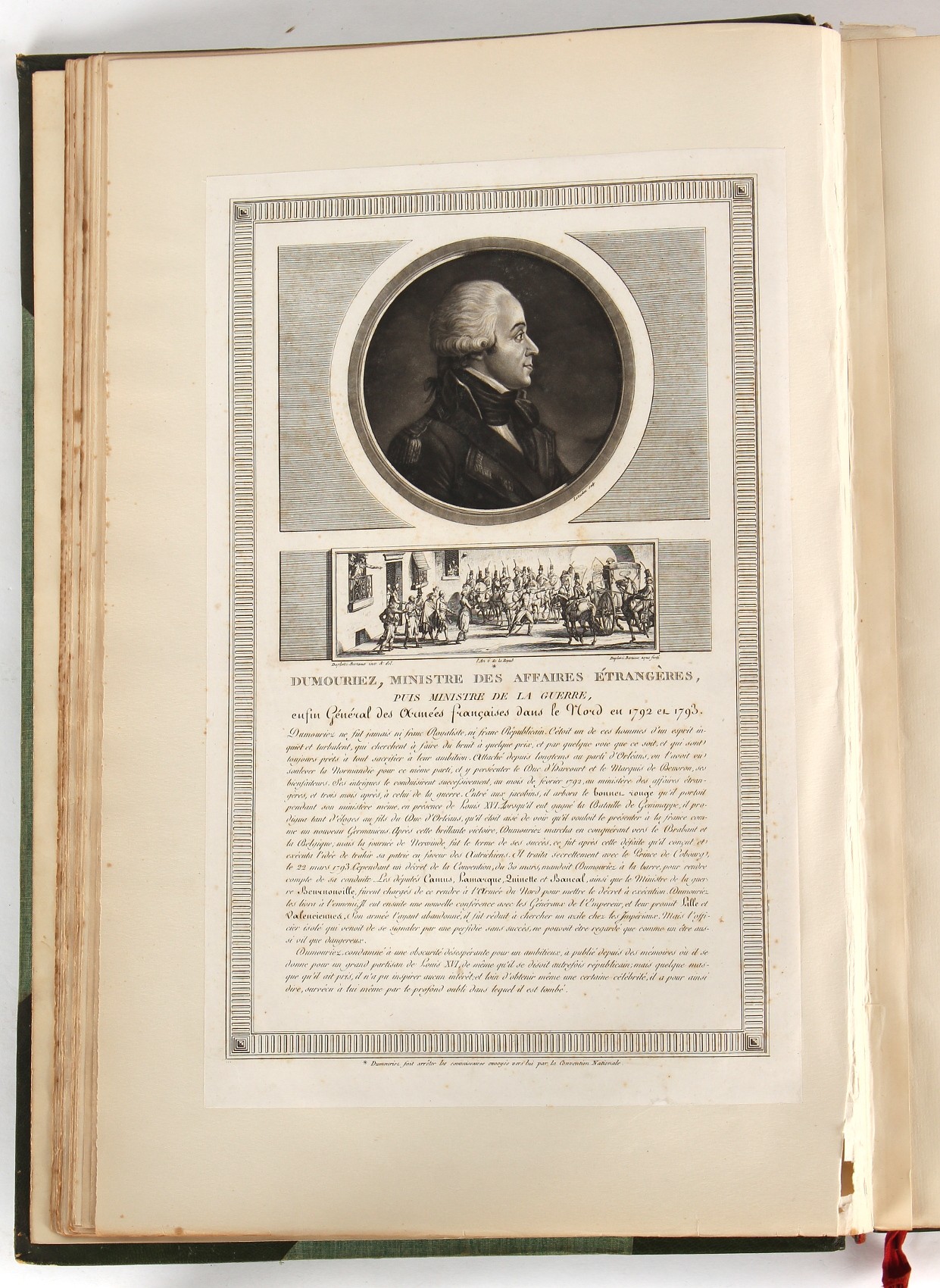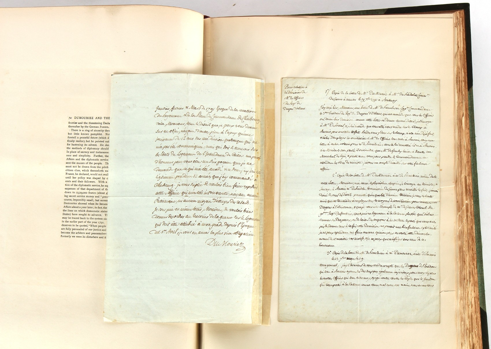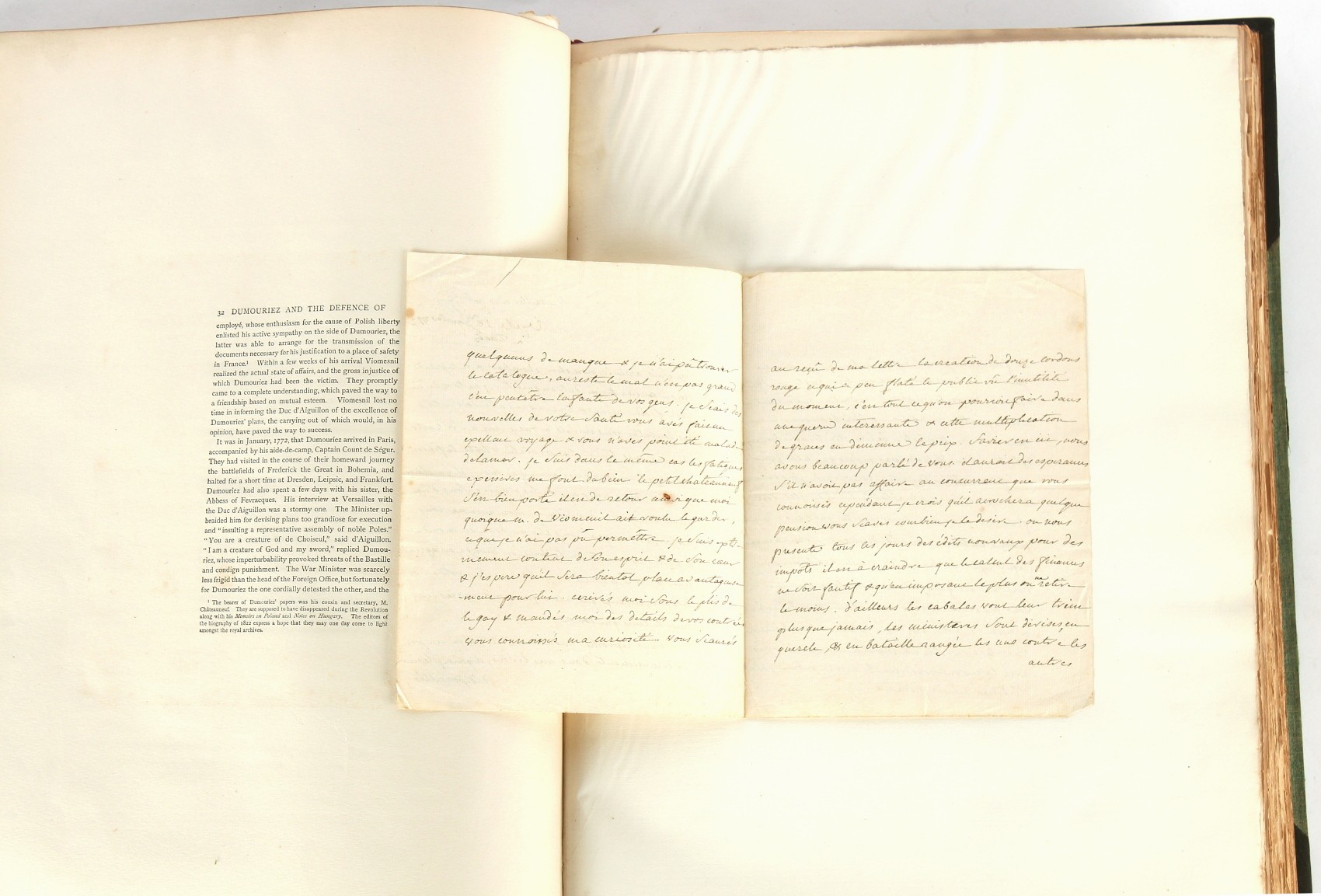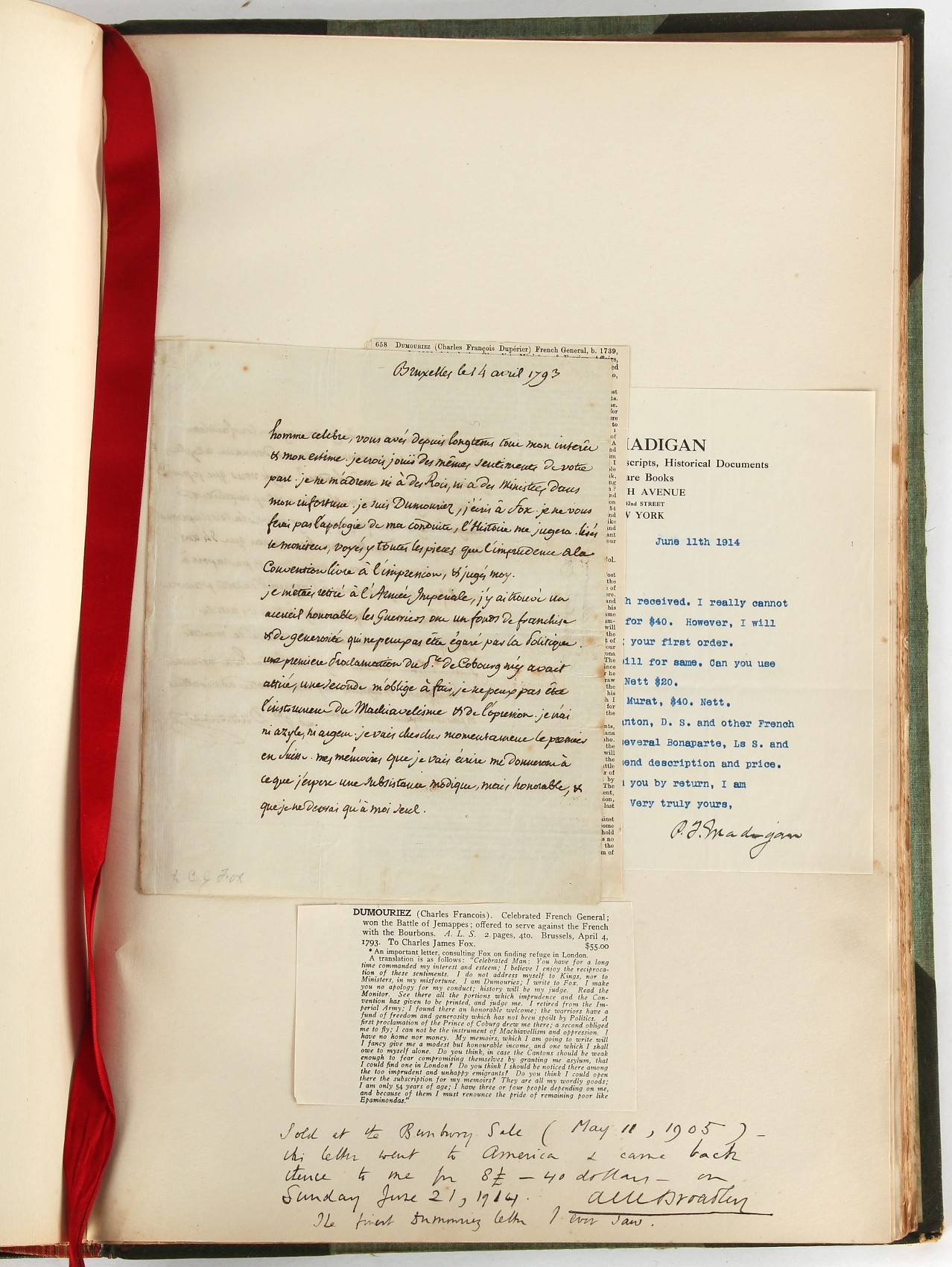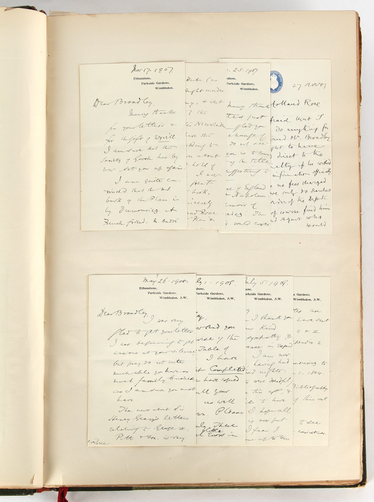 Property of a lady - Napoleonic historical interest - BROADLEY, Alexander Meyrick, and ROSE, John Holland - 'Dumouriez and the Defence of England against Napoleon' - two volume set, the personal 'Extra-Illustrated' or 'Grangerized' (or 'Grangerised') copies of Alexander Meyrick Broadley (1847-1916), London, John Lane, The Bodley Head, 1909, with tipped-in invoice from William Brendon & Son Limited Printers, Plymouth, dated 7th Sept. 1908 for £2 - - 'To one special copy pulled upon large paper, also 200 folio plain sheets', extra-illustrated or augmented with a large quantity of contemporarily hand-coloured and monochrome cartoon or caricature satirical prints, original drawings & watercolours, printed broadsides, etc., each affixed at the edges only into a window cut in to each plain folio sheet (so that backs are open & visible), Volume One including six tipped-in manuscript letters from Herbert H. Raphael (Major Sir Herbert Henry Raphael, 1st Baronet, 1859–1924) and twenty-six tipped-in manuscript letters from John Holland Rose (1855-1942) and two manuscript letters (one being four-sided) from Field Marshal Lord Roberts (1832-1914), and many other ms letters including some from Cambrai (Cambray), France (where Dumouriez was born), and the publishers (including the original contract between the authors and the publishers), all regarding the book and its compilation, also including twelve original ink manuscript letters by the subject of the book Charles Francois du Perier Dumouriez (1739-1823) (a further 16 letters by him are in Volume Two), the first dated 1765, the second (four sided) from Versailles dated 1772, the third (four sided) dated 1782, the fourth, fifth, sixth, seventh, eighth, ninth and tenth all dated 1792 when Dumouriez was Ministre des Affairs Etrangeres, Ministre de la Guerre, and Chef de L'Armee du Nord, an important ink manuscript letter from Dumouriez dated 1793 (two sided) consulting Charles James Fox on finding refuge in London (with letter from the dealer P.F. Madigan in Fifth Avenue, New York, regarding Boardley's purchase of this letter for $40), another ms letter from Dumouriez (two sided) dated 1796, and another from Antoine-Marie Chamans de Lavallette (Directeur General des Postes under Napoleon), the prints including Piercy Roberts after George Murgatroyd Woodward - 'John Bull and His Friends Commemorating The Peace' (1802); 'A Cock and Bull Story' (1803), published by Percy Roberts; a small pencil drawing portrait of Dumouriez initialled J.D. and dated 9 Oct. '69; 'La Retour en Angleterre' (we can find no record of this print); 'Carte des Descentes Faites en Angleterre et en Irlande Depuis Guillaume la Conquérant jusqu'à nos jours' (Map of the Invasions of England and Ireland from William the Conqueror to the Present) (1798), hand-coloured, with accompanying text; 'Capture of Bonaparte's Carriage', published by Edwards, 1818; a signed watercolour by G. Heberden entitled 'Genl. Dumouriez marching the Sans Culottes into Holland', 19.5 by 32.5cms.; 'A Dose for Dumourier, Evacuation of Holland and Brabant' (monochrome); and James Gillray - 'Dumourier dining in state at St James's, on the 15th of May, 1793' (monochrome), Volume Two including numerous broadsides or notices, some anti-Napoleon propaganda, one a folding monochrome broadside entitled 'An ABSTRACT of An Act for providing an Augmentation to the MILITIA, to be trained and exercised in the Manner therein directed; and for enabling His Majesty to cause the same to be embodied, in case of Necessity, for the Defence of these Kingdoms', printed by George Eyre and Andrew Strahan, 1796; lists of recruited foreign soldiers, etc.; an 'Army of Reserve Act' broadside for the Parish of St. Clement Danes, dated 1803; a Jan Kip folded engraving of Lulworth Castle entitled 'Lullworth Castle in Dorsetshire, The Seat of Humphry Weld'; other folding maps; several printed patriotic song scores of the period; a ms autograph ink sheet entitled 'Verses written on the threatened Invasion', by B. Atkinson of Bath'; a contemporary 60-page plus index ink ms booklet entitled 'Internal Defence of Essex', listing the names & number of carts & horses for each village or town to be called upon in the event of invasion; a printed list of 'Loyal Colchester Volunteers', dated July 1803; this second volume also includes a further 16 ink ms letters by Dumouriez dating from 1804 to 1822; and much more (helpfully, Broadley added a ms index of the extra illustrations); each volume approximately 20.5 by 14ins. (52 by 35.5cms.) (overall) (2). Footnote - Alexander Meyrick Broadley (1847-1916) was a British author, barrister, collector and social figure, known for defending Ahmed 'Urabi after the Urabi Revolt. Broadley penned numerous historical works later in life, particularly regarding Napoleon and his era. Among the works he authored or co-authored are 'Napoleon and the Invasion of England: The Story of the Great Terror' (London, 1908); 'Nelson’s Hardy: His Life, Letters and Friends' (London, 1909); 'Napoleon in Caricature 1795-1821' (London, 1911); and 'Napoleon in Exile' (London, 1914). Broadley was known as a celebrated grangeriser (or extra-illustrator) of books, and one of his greatest achievements was the creation, with the assistance of Daniell, of an extra-illustrated set of Rose’s 'Life of Napoleon I' and Rosebery’s 'Napoleon. The Last Phase', by inlaying and extending the works from three octavo to twenty-eight folio volumes with engravings, portraits, manuscripts, autograph letters, etc. over a period of four years. This monumental work was bought by George Nathaniel Curzon, Marquess Curzon of Kedleston at the auction of Broadley’s library held in four sales between 1916 and 1918, and Curzon later bequeathed the set to the Bodleian Library, Oxford.