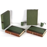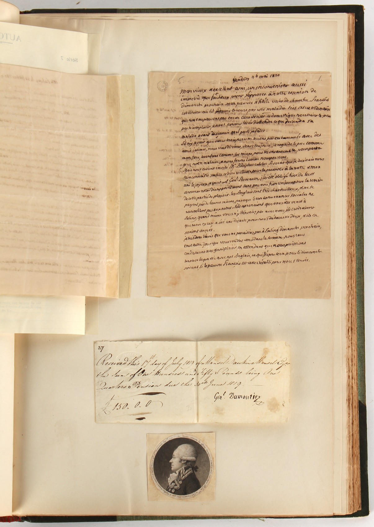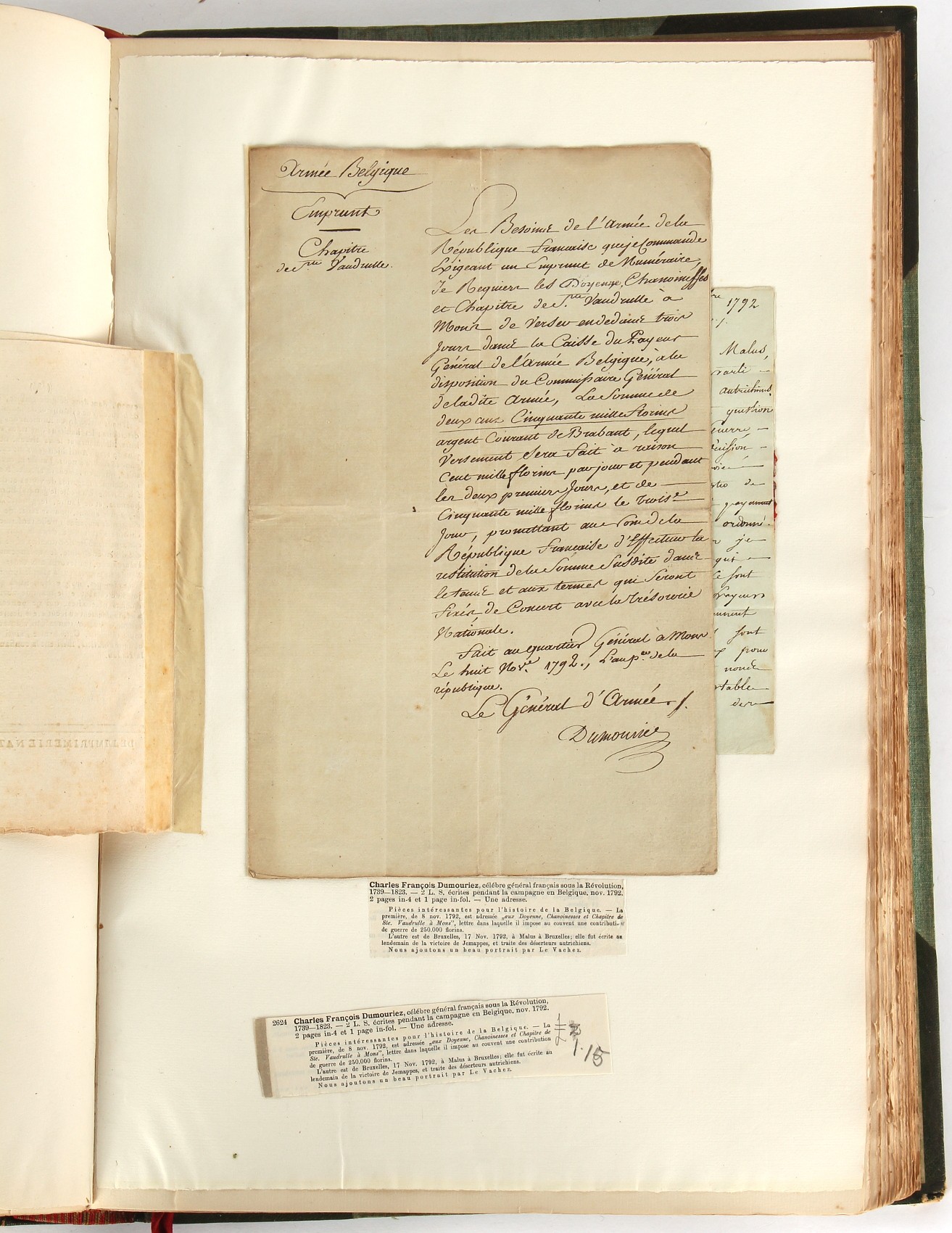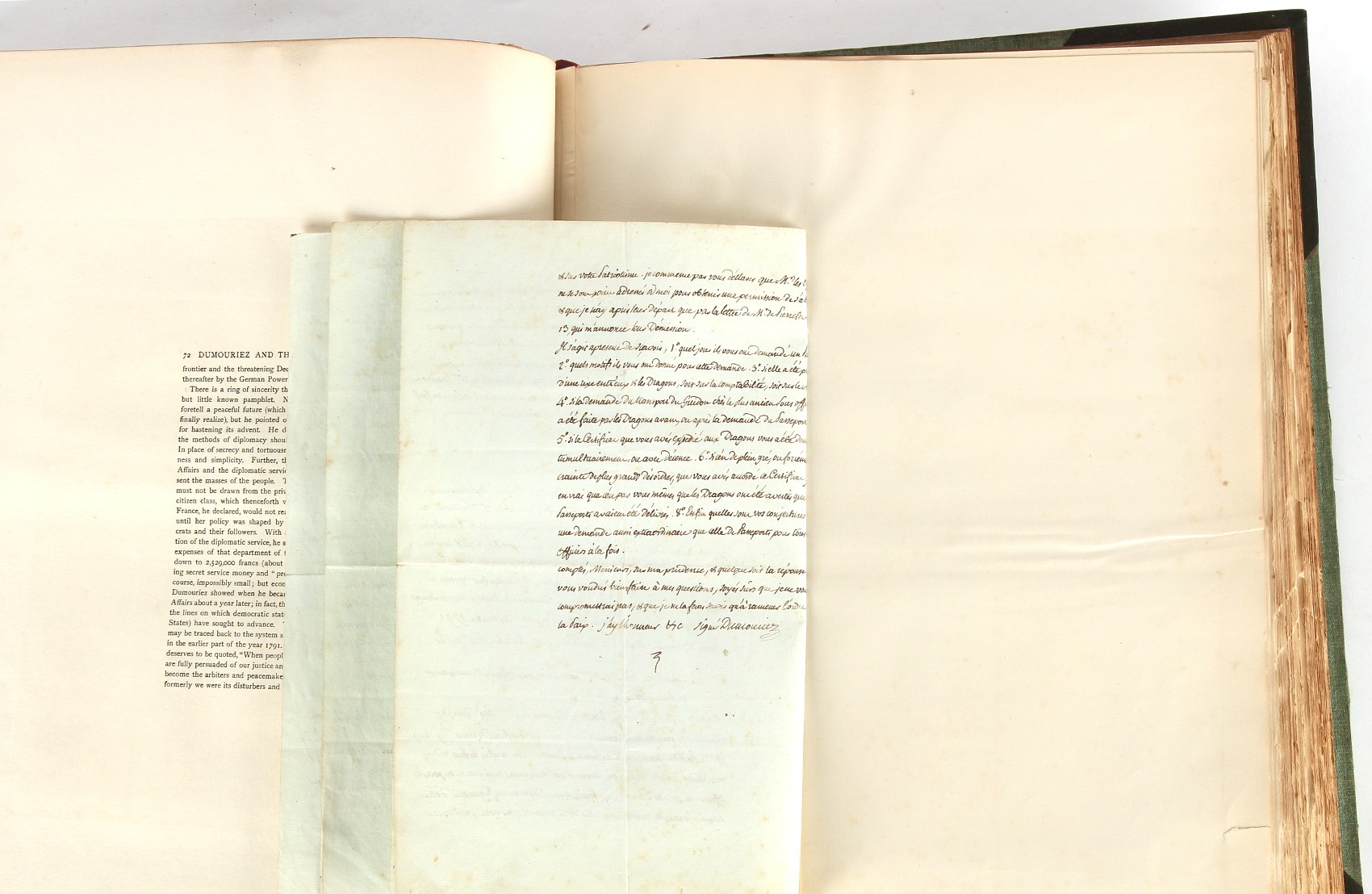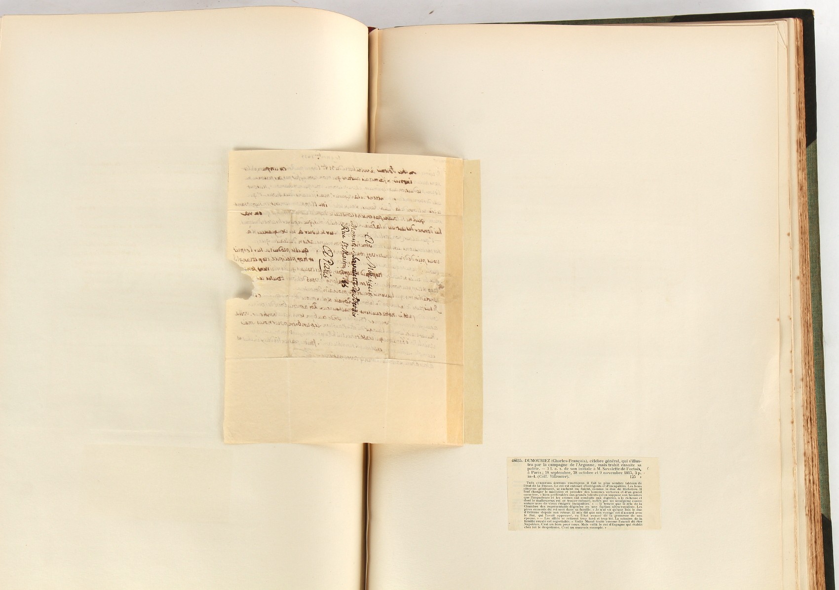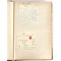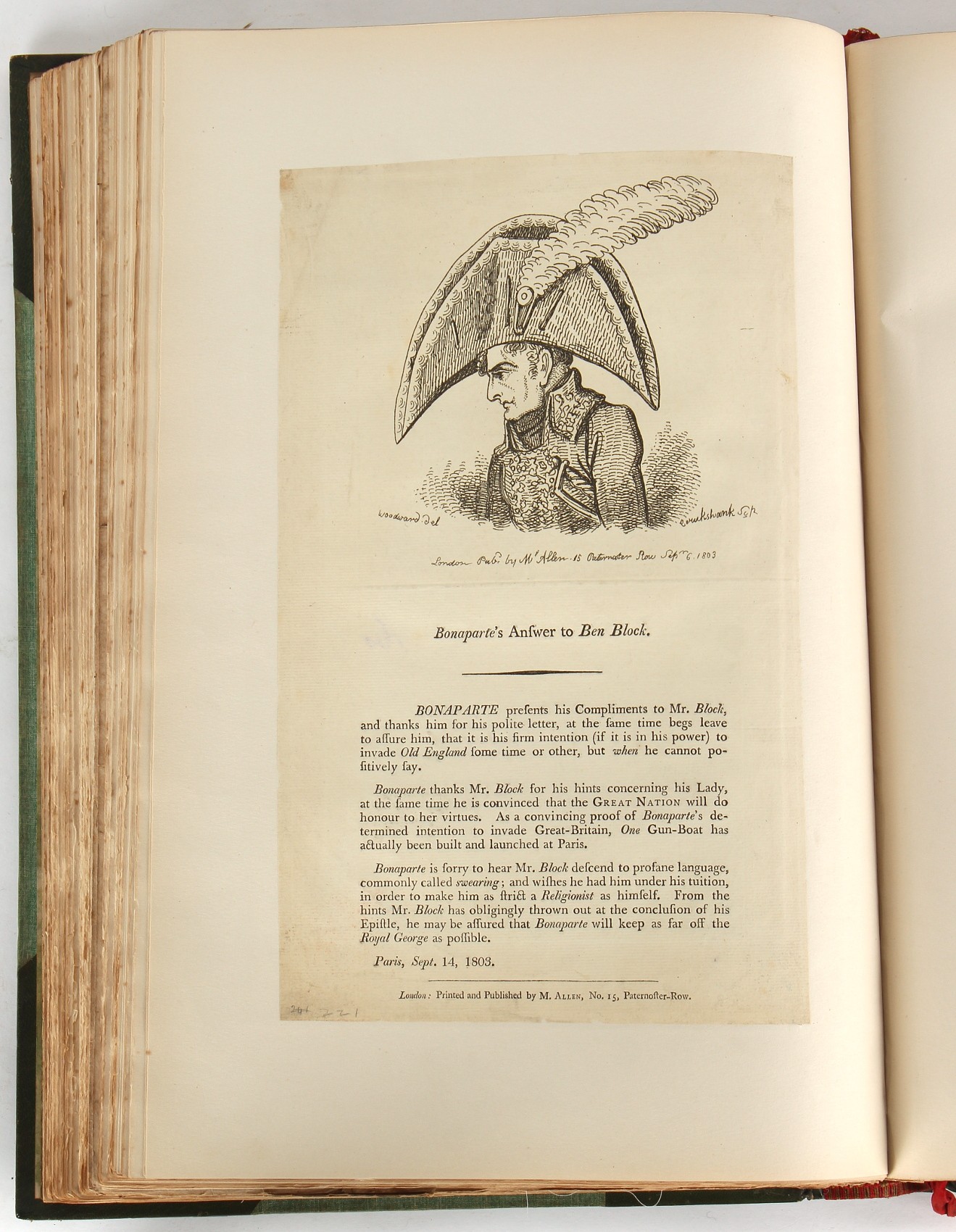 Property of a lady - Napoleonic historical interest - BROADLEY, Alexander Meyrick, and ROSE, John Holland - 'Dumouriez and the Defence of England against Napoleon' - two volume set, the personal 'Extra-Illustrated' or 'Grangerized' (or 'Grangerised') copies of Alexander Meyrick Broadley (1847-1916), London, John Lane, The Bodley Head, 1909, with tipped-in invoice from William Brendon & Son Limited Printers, Plymouth, dated 7th Sept. 1908 for £2 - - 'To one special copy pulled upon large paper, also 200 folio plain sheets', extra-illustrated or augmented with a large quantity of contemporarily hand-coloured and monochrome cartoon or caricature satirical prints, original drawings & watercolours, printed broadsides, etc., each affixed at the edges only into a window cut in to each plain folio sheet (so that backs are open & visible), Volume One including six tipped-in manuscript letters from Herbert H. Raphael (Major Sir Herbert Henry Raphael, 1st Baronet, 1859–1924) and twenty-six tipped-in manuscript letters from John Holland Rose (1855-1942) and two manuscript letters (one being four-sided) from Field Marshal Lord Roberts (1832-1914), and many other ms letters including some from Cambrai (Cambray), France (where Dumouriez was born), and the publishers (including the original contract between the authors and the publishers), all regarding the book and its compilation, also including twelve original ink manuscript letters by the subject of the book Charles Francois du Perier Dumouriez (1739-1823) (a further 16 letters by him are in Volume Two), the first dated 1765, the second (four sided) from Versailles dated 1772, the third (four sided) dated 1782, the fourth, fifth, sixth, seventh, eighth, ninth and tenth all dated 1792 when Dumouriez was Ministre des Affairs Etrangeres, Ministre de la Guerre, and Chef de L'Armee du Nord, an important ink manuscript letter from Dumouriez dated 1793 (two sided) consulting Charles James Fox on finding refuge in London (with letter from the dealer P.F. Madigan in Fifth Avenue, New York, regarding Boardley's purchase of this letter for $40), another ms letter from Dumouriez (two sided) dated 1796, and another from Antoine-Marie Chamans de Lavallette (Directeur General des Postes under Napoleon), the prints including Piercy Roberts after George Murgatroyd Woodward - 'John Bull and His Friends Commemorating The Peace' (1802); 'A Cock and Bull Story' (1803), published by Percy Roberts; a small pencil drawing portrait of Dumouriez initialled J.D. and dated 9 Oct. '69; 'La Retour en Angleterre' (we can find no record of this print); 'Carte des Descentes Faites en Angleterre et en Irlande Depuis Guillaume la Conquérant jusqu'à nos jours' (Map of the Invasions of England and Ireland from William the Conqueror to the Present) (1798), hand-coloured, with accompanying text; 'Capture of Bonaparte's Carriage', published by Edwards, 1818; a signed watercolour by G. Heberden entitled 'Genl. Dumouriez marching the Sans Culottes into Holland', 19.5 by 32.5cms.; 'A Dose for Dumourier, Evacuation of Holland and Brabant' (monochrome); and James Gillray - 'Dumourier dining in state at St James's, on the 15th of May, 1793' (monochrome), Volume Two including numerous broadsides or notices, some anti-Napoleon propaganda, one a folding monochrome broadside entitled 'An ABSTRACT of An Act for providing an Augmentation to the MILITIA, to be trained and exercised in the Manner therein directed; and for enabling His Majesty to cause the same to be embodied, in case of Necessity, for the Defence of these Kingdoms', printed by George Eyre and Andrew Strahan, 1796; lists of recruited foreign soldiers, etc.; an 'Army of Reserve Act' broadside for the Parish of St. Clement Danes, dated 1803; a Jan Kip folded engraving of Lulworth Castle entitled 'Lullworth Castle in Dorsetshire, The Seat of Humphry Weld'; other folding maps; several printed patriotic song scores of the period; a ms autograph ink sheet entitled 'Verses written on the threatened Invasion', by B. Atkinson of Bath'; a contemporary 60-page plus index ink ms booklet entitled 'Internal Defence of Essex', listing the names & number of carts & horses for each village or town to be called upon in the event of invasion; a printed list of 'Loyal Colchester Volunteers', dated July 1803; this second volume also includes a further 16 ink ms letters by Dumouriez dating from 1804 to 1822; and much more (helpfully, Broadley added a ms index of the extra illustrations); each volume approximately 20.5 by 14ins. (52 by 35.5cms.) (overall) (2). Footnote - Alexander Meyrick Broadley (1847-1916) was a British author, barrister, collector and social figure, known for defending Ahmed 'Urabi after the Urabi Revolt. Broadley penned numerous historical works later in life, particularly regarding Napoleon and his era. Among the works he authored or co-authored are 'Napoleon and the Invasion of England: The Story of the Great Terror' (London, 1908); 'Nelson’s Hardy: His Life, Letters and Friends' (London, 1909); 'Napoleon in Caricature 1795-1821' (London, 1911); and 'Napoleon in Exile' (London, 1914). Broadley was known as a celebrated grangeriser (or extra-illustrator) of books, and one of his greatest achievements was the creation, with the assistance of Daniell, of an extra-illustrated set of Rose’s 'Life of Napoleon I' and Rosebery’s 'Napoleon. The Last Phase', by inlaying and extending the works from three octavo to twenty-eight folio volumes with engravings, portraits, manuscripts, autograph letters, etc. over a period of four years. This monumental work was bought by George Nathaniel Curzon, Marquess Curzon of Kedleston at the auction of Broadley’s library held in four sales between 1916 and 1918, and Curzon later bequeathed the set to the Bodleian Library, Oxford.