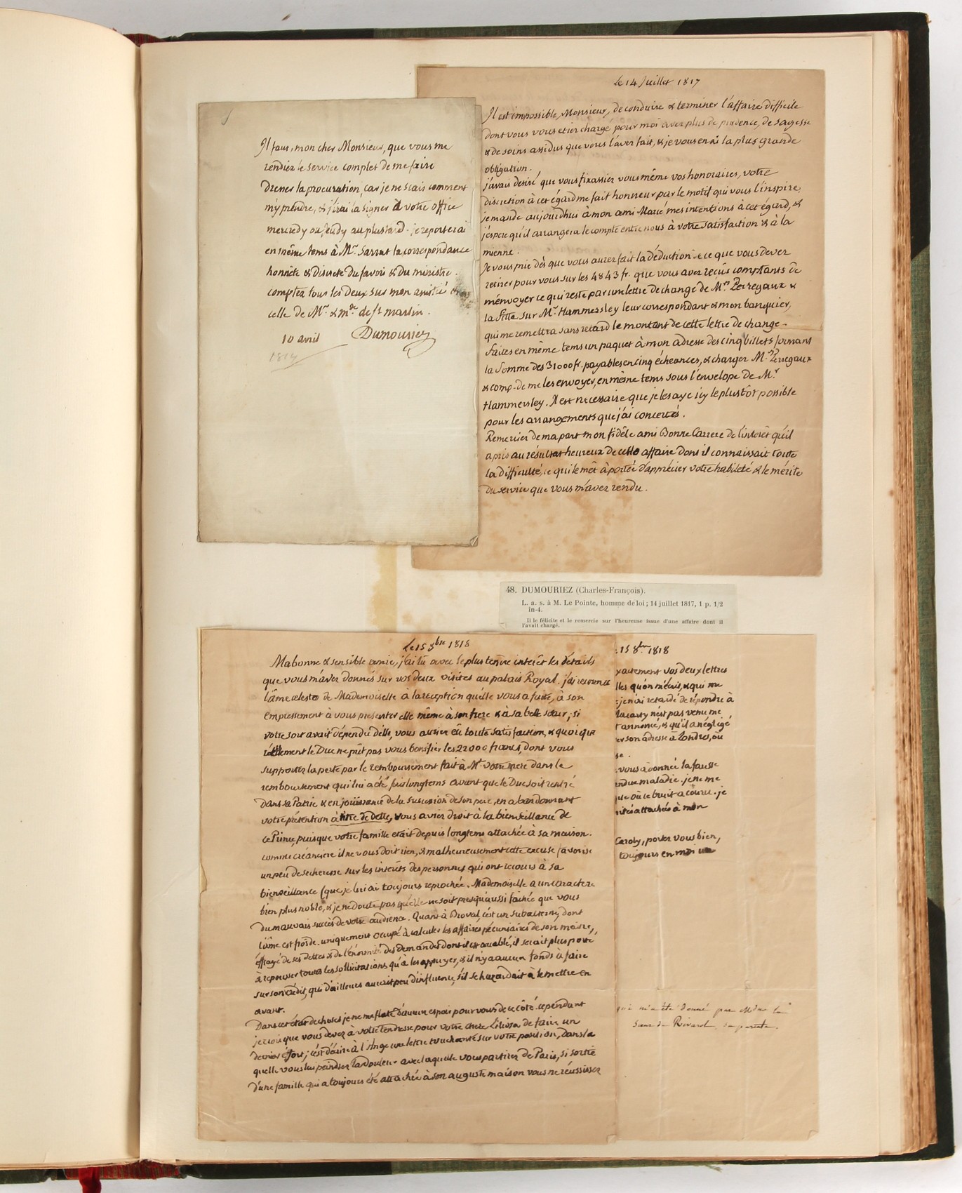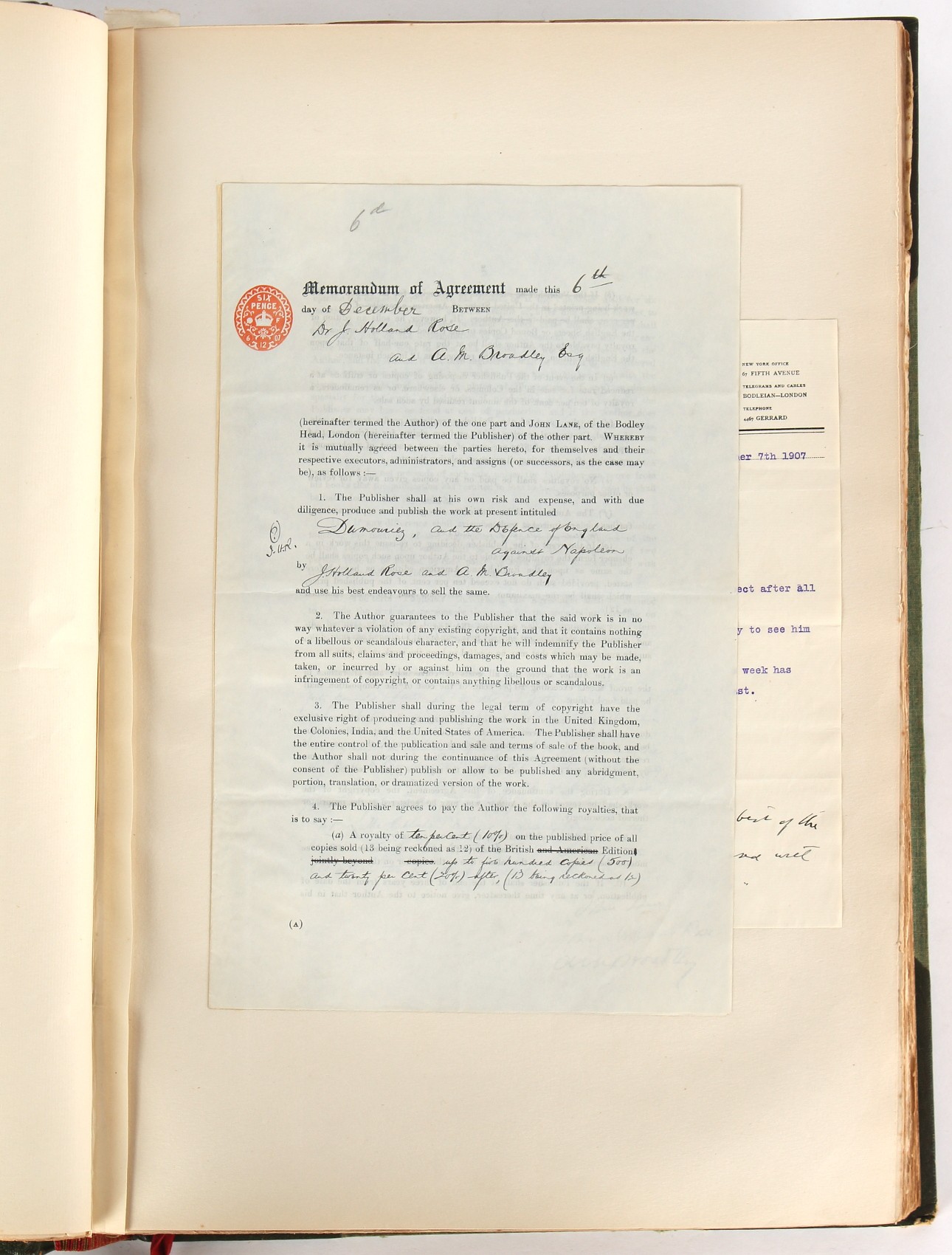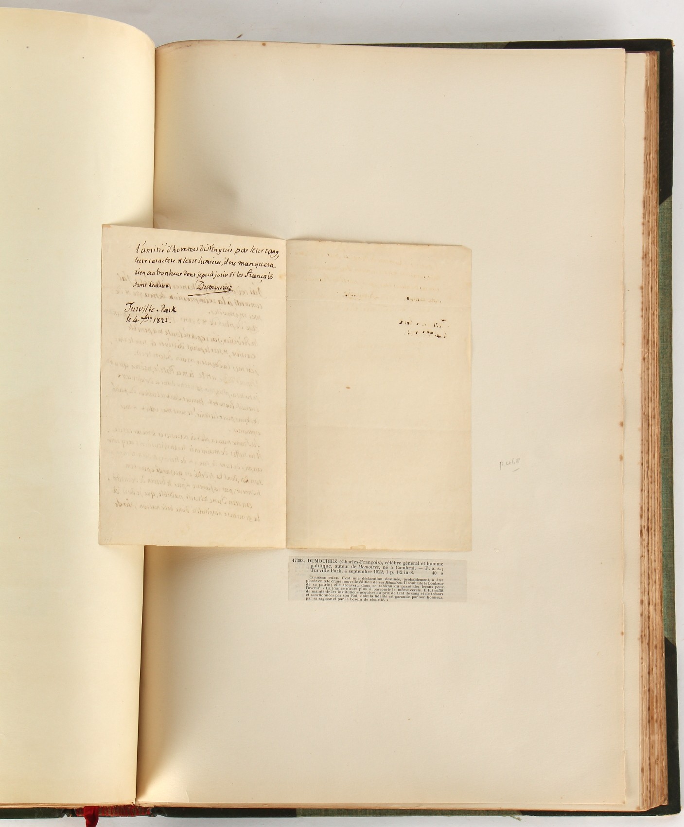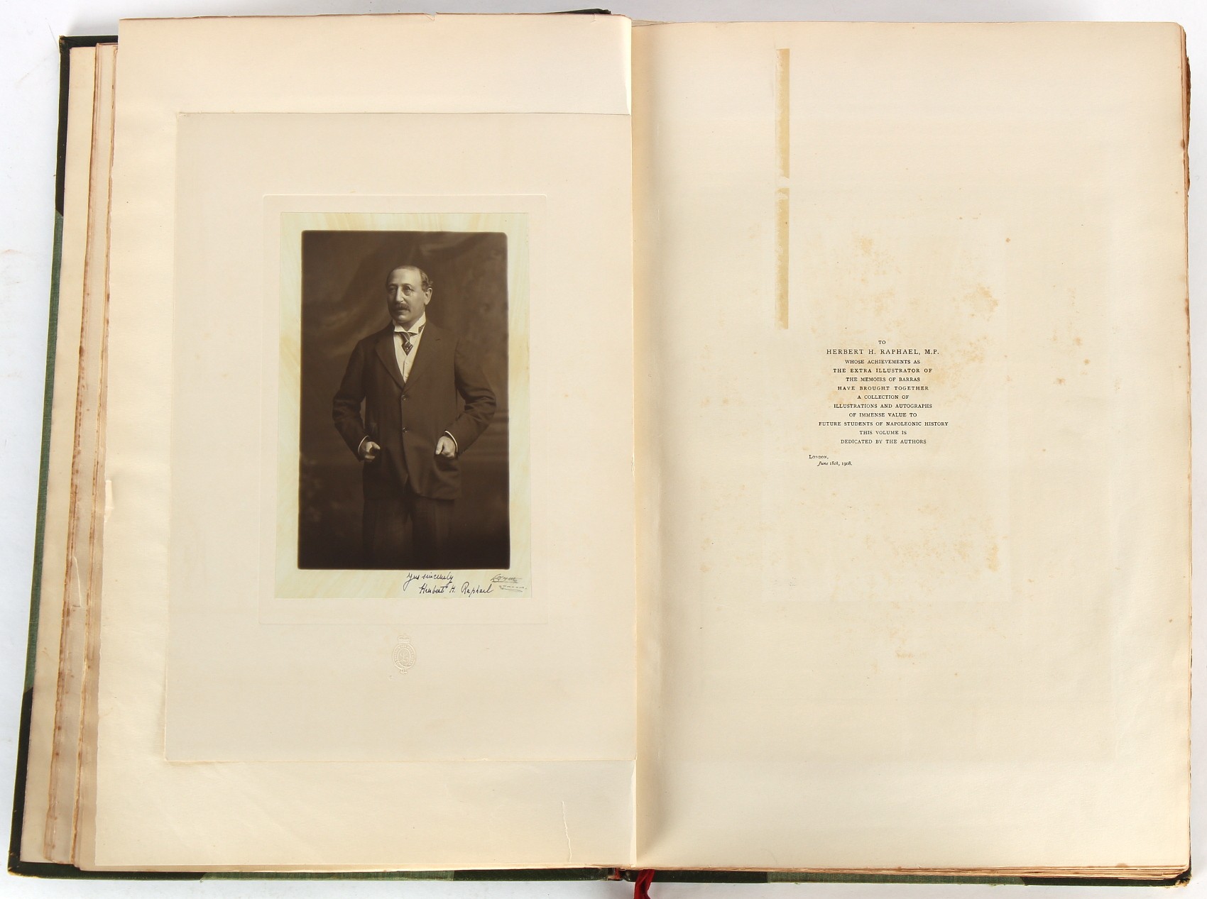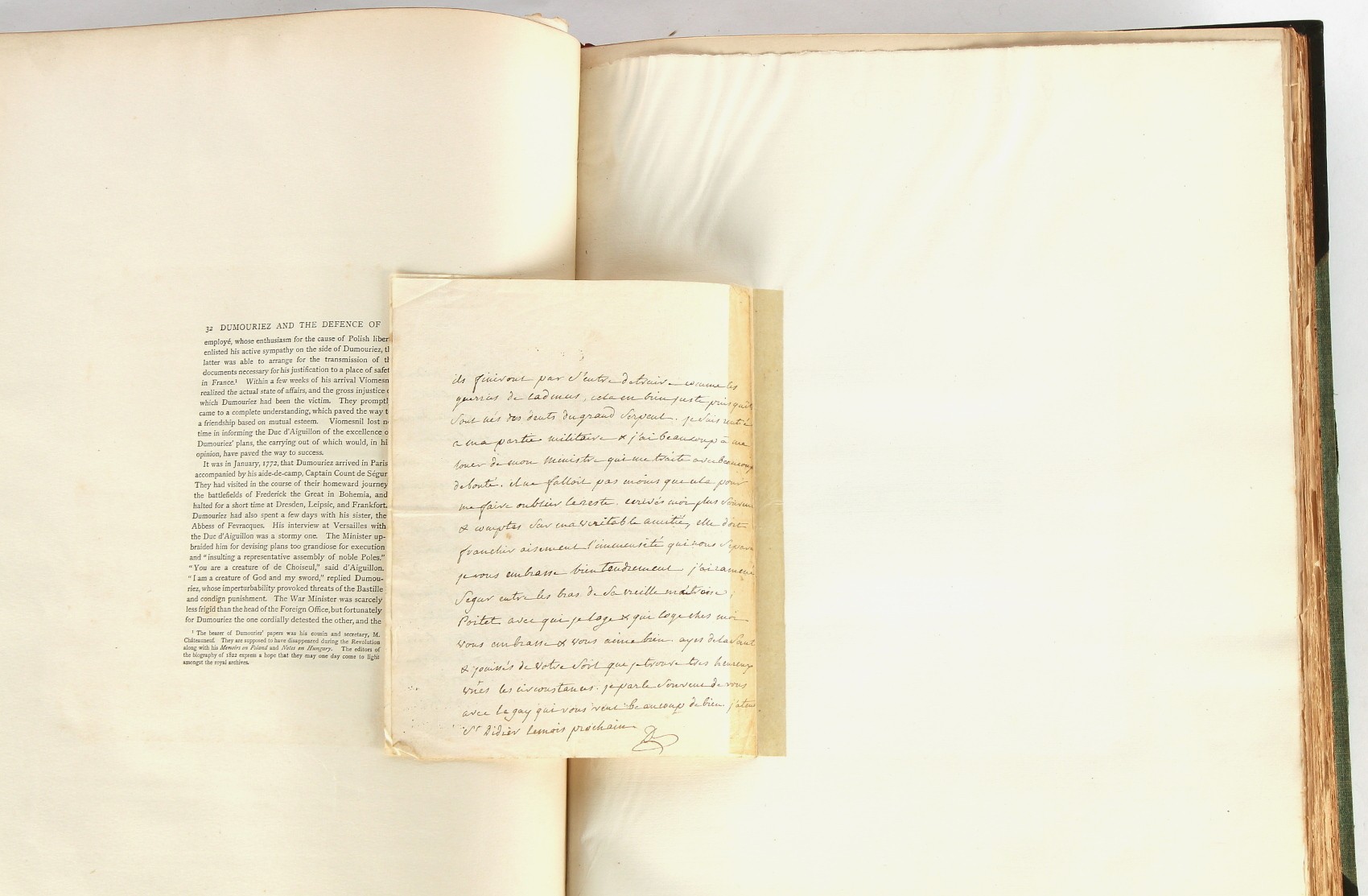 Property of a lady - Napoleonic historical interest - BROADLEY, Alexander Meyrick, and ROSE, John Holland - 'Dumouriez and the Defence of England against Napoleon' - two volume set, the personal 'Extra-Illustrated' or 'Grangerized' (or 'Grangerised') copies of Alexander Meyrick Broadley (1847-1916), London, John Lane, The Bodley Head, 1909, with tipped-in invoice from William Brendon & Son Limited Printers, Plymouth, dated 7th Sept. 1908 for £2 - - 'To one special copy pulled upon large paper, also 200 folio plain sheets', extra-illustrated or augmented with a large quantity of contemporarily hand-coloured and monochrome cartoon or caricature satirical prints, original drawings & watercolours, printed broadsides, etc., each affixed at the edges only into a window cut in to each plain folio sheet (so that backs are open & visible), Volume One including six tipped-in manuscript letters from Herbert H. Raphael (Major Sir Herbert Henry Raphael, 1st Baronet, 1859–1924) and twenty-six tipped-in manuscript letters from John Holland Rose (1855-1942) and two manuscript letters (one being four-sided) from Field Marshal Lord Roberts (1832-1914), and many other ms letters including some from Cambrai (Cambray), France (where Dumouriez was born), and the publishers (including the original contract between the authors and the publishers), all regarding the book and its compilation, also including twelve original ink manuscript letters by the subject of the book Charles Francois du Perier Dumouriez (1739-1823) (a further 16 letters by him are in Volume Two), the first dated 1765, the second (four sided) from Versailles dated 1772, the third (four sided) dated 1782, the fourth, fifth, sixth, seventh, eighth, ninth and tenth all dated 1792 when Dumouriez was Ministre des Affairs Etrangeres, Ministre de la Guerre, and Chef de L'Armee du Nord, an important ink manuscript letter from Dumouriez dated 1793 (two sided) consulting Charles James Fox on finding refuge in London (with letter from the dealer P.F. Madigan in Fifth Avenue, New York, regarding Boardley's purchase of this letter for $40), another ms letter from Dumouriez (two sided) dated 1796, and another from Antoine-Marie Chamans de Lavallette (Directeur General des Postes under Napoleon), the prints including Piercy Roberts after George Murgatroyd Woodward - 'John Bull and His Friends Commemorating The Peace' (1802); 'A Cock and Bull Story' (1803), published by Percy Roberts; a small pencil drawing portrait of Dumouriez initialled J.D. and dated 9 Oct. '69; 'La Retour en Angleterre' (we can find no record of this print); 'Carte des Descentes Faites en Angleterre et en Irlande Depuis Guillaume la Conquérant jusqu'à nos jours' (Map of the Invasions of England and Ireland from William the Conqueror to the Present) (1798), hand-coloured, with accompanying text; 'Capture of Bonaparte's Carriage', published by Edwards, 1818; a signed watercolour by G. Heberden entitled 'Genl. Dumouriez marching the Sans Culottes into Holland', 19.5 by 32.5cms.; 'A Dose for Dumourier, Evacuation of Holland and Brabant' (monochrome); and James Gillray - 'Dumourier dining in state at St James's, on the 15th of May, 1793' (monochrome), Volume Two including numerous broadsides or notices, some anti-Napoleon propaganda, one a folding monochrome broadside entitled 'An ABSTRACT of An Act for providing an Augmentation to the MILITIA, to be trained and exercised in the Manner therein directed; and for enabling His Majesty to cause the same to be embodied, in case of Necessity, for the Defence of these Kingdoms', printed by George Eyre and Andrew Strahan, 1796; lists of recruited foreign soldiers, etc.; an 'Army of Reserve Act' broadside for the Parish of St. Clement Danes, dated 1803; a Jan Kip folded engraving of Lulworth Castle entitled 'Lullworth Castle in Dorsetshire, The Seat of Humphry Weld'; other folding maps; several printed patriotic song scores of the period; a ms autograph ink sheet entitled 'Verses written on the threatened Invasion', by B. Atkinson of Bath'; a contemporary 60-page plus index ink ms booklet entitled 'Internal Defence of Essex', listing the names & number of carts & horses for each village or town to be called upon in the event of invasion; a printed list of 'Loyal Colchester Volunteers', dated July 1803; this second volume also includes a further 16 ink ms letters by Dumouriez dating from 1804 to 1822; and much more (helpfully, Broadley added a ms index of the extra illustrations); each volume approximately 20.5 by 14ins. (52 by 35.5cms.) (overall) (2). Footnote - Alexander Meyrick Broadley (1847-1916) was a British author, barrister, collector and social figure, known for defending Ahmed 'Urabi after the Urabi Revolt. Broadley penned numerous historical works later in life, particularly regarding Napoleon and his era. Among the works he authored or co-authored are 'Napoleon and the Invasion of England: The Story of the Great Terror' (London, 1908); 'Nelson’s Hardy: His Life, Letters and Friends' (London, 1909); 'Napoleon in Caricature 1795-1821' (London, 1911); and 'Napoleon in Exile' (London, 1914). Broadley was known as a celebrated grangeriser (or extra-illustrator) of books, and one of his greatest achievements was the creation, with the assistance of Daniell, of an extra-illustrated set of Rose’s 'Life of Napoleon I' and Rosebery’s 'Napoleon. The Last Phase', by inlaying and extending the works from three octavo to twenty-eight folio volumes with engravings, portraits, manuscripts, autograph letters, etc. over a period of four years. This monumental work was bought by George Nathaniel Curzon, Marquess Curzon of Kedleston at the auction of Broadley’s library held in four sales between 1916 and 1918, and Curzon later bequeathed the set to the Bodleian Library, Oxford.