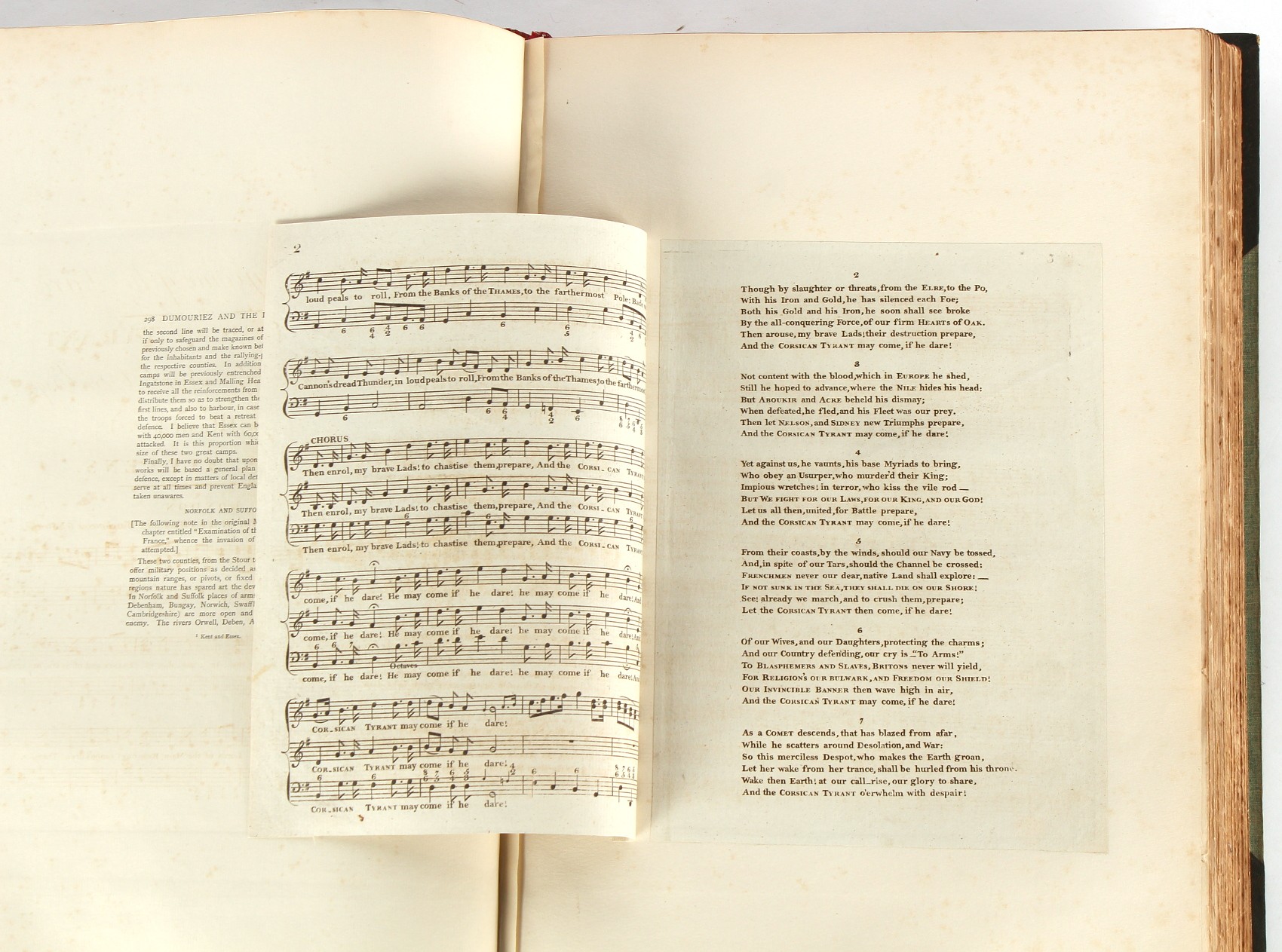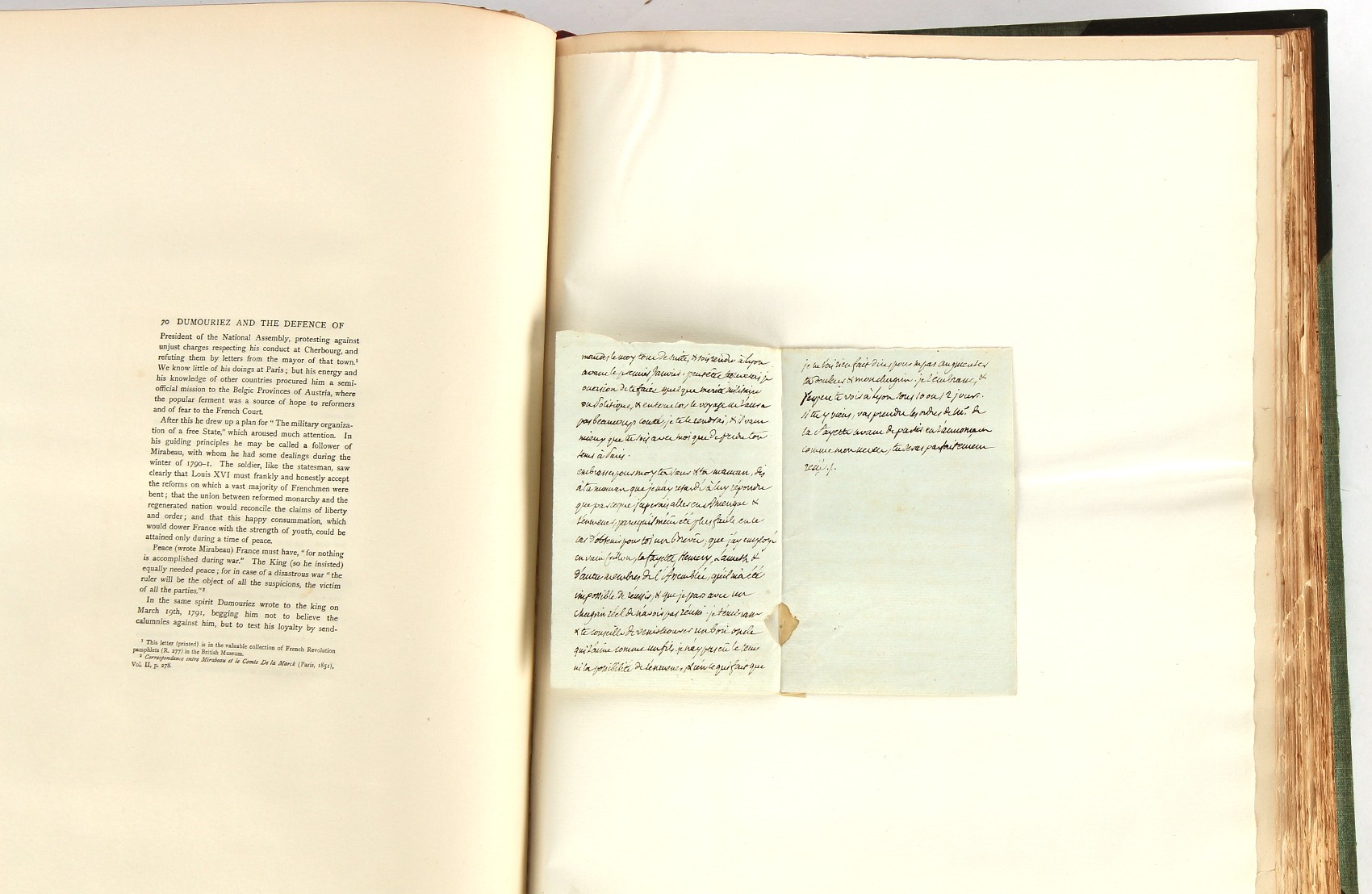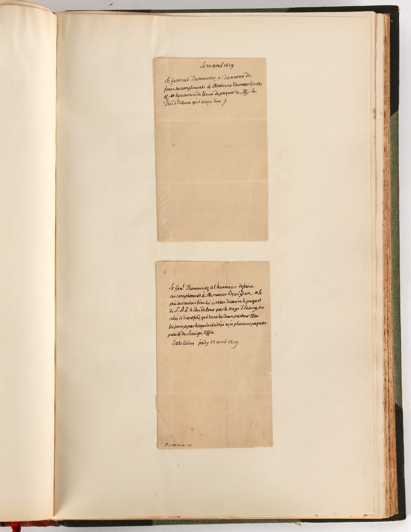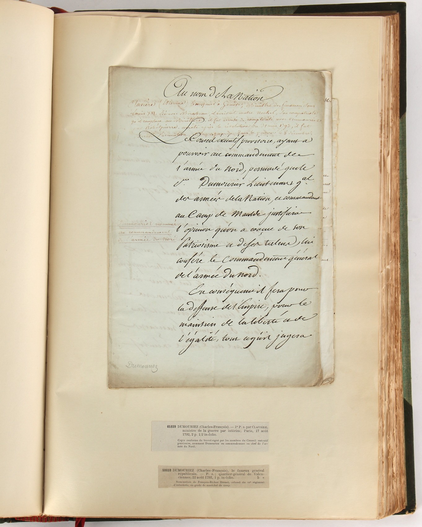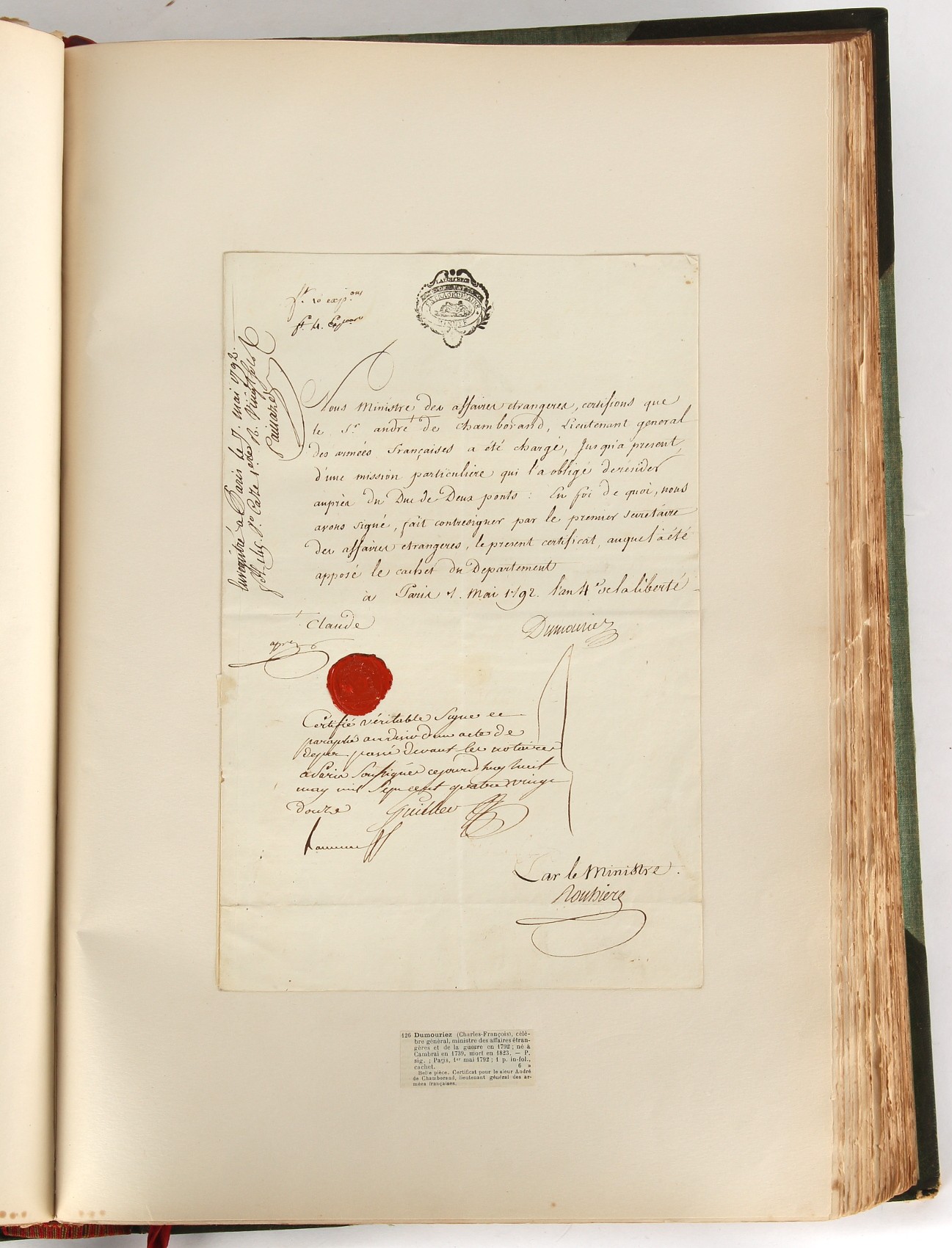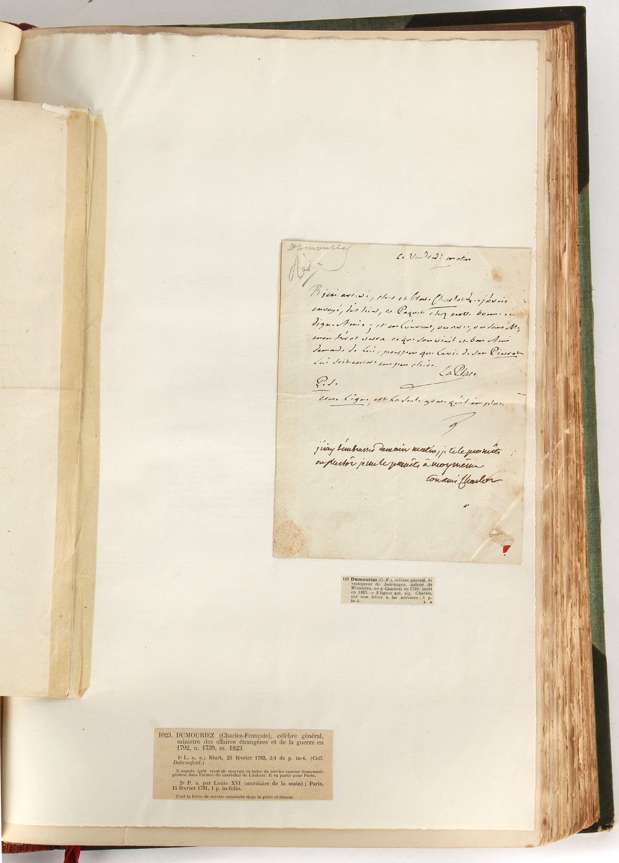 Property of a lady - Napoleonic historical interest - BROADLEY, Alexander Meyrick, and ROSE, John Holland - 'Dumouriez and the Defence of England against Napoleon' - two volume set, the personal 'Extra-Illustrated' or 'Grangerized' (or 'Grangerised') copies of Alexander Meyrick Broadley (1847-1916), London, John Lane, The Bodley Head, 1909, with tipped-in invoice from William Brendon & Son Limited Printers, Plymouth, dated 7th Sept. 1908 for £2 - - 'To one special copy pulled upon large paper, also 200 folio plain sheets', extra-illustrated or augmented with a large quantity of contemporarily hand-coloured and monochrome cartoon or caricature satirical prints, original drawings & watercolours, printed broadsides, etc., each affixed at the edges only into a window cut in to each plain folio sheet (so that backs are open & visible), Volume One including six tipped-in manuscript letters from Herbert H. Raphael (Major Sir Herbert Henry Raphael, 1st Baronet, 1859–1924) and twenty-six tipped-in manuscript letters from John Holland Rose (1855-1942) and two manuscript letters (one being four-sided) from Field Marshal Lord Roberts (1832-1914), and many other ms letters including some from Cambrai (Cambray), France (where Dumouriez was born), and the publishers (including the original contract between the authors and the publishers), all regarding the book and its compilation, also including twelve original ink manuscript letters by the subject of the book Charles Francois du Perier Dumouriez (1739-1823) (a further 16 letters by him are in Volume Two), the first dated 1765, the second (four sided) from Versailles dated 1772, the third (four sided) dated 1782, the fourth, fifth, sixth, seventh, eighth, ninth and tenth all dated 1792 when Dumouriez was Ministre des Affairs Etrangeres, Ministre de la Guerre, and Chef de L'Armee du Nord, an important ink manuscript letter from Dumouriez dated 1793 (two sided) consulting Charles James Fox on finding refuge in London (with letter from the dealer P.F. Madigan in Fifth Avenue, New York, regarding Boardley's purchase of this letter for $40), another ms letter from Dumouriez (two sided) dated 1796, and another from Antoine-Marie Chamans de Lavallette (Directeur General des Postes under Napoleon), the prints including Piercy Roberts after George Murgatroyd Woodward - 'John Bull and His Friends Commemorating The Peace' (1802); 'A Cock and Bull Story' (1803), published by Percy Roberts; a small pencil drawing portrait of Dumouriez initialled J.D. and dated 9 Oct. '69; 'La Retour en Angleterre' (we can find no record of this print); 'Carte des Descentes Faites en Angleterre et en Irlande Depuis Guillaume la Conquérant jusqu'à nos jours' (Map of the Invasions of England and Ireland from William the Conqueror to the Present) (1798), hand-coloured, with accompanying text; 'Capture of Bonaparte's Carriage', published by Edwards, 1818; a signed watercolour by G. Heberden entitled 'Genl. Dumouriez marching the Sans Culottes into Holland', 19.5 by 32.5cms.; 'A Dose for Dumourier, Evacuation of Holland and Brabant' (monochrome); and James Gillray - 'Dumourier dining in state at St James's, on the 15th of May, 1793' (monochrome), Volume Two including numerous broadsides or notices, some anti-Napoleon propaganda, one a folding monochrome broadside entitled 'An ABSTRACT of An Act for providing an Augmentation to the MILITIA, to be trained and exercised in the Manner therein directed; and for enabling His Majesty to cause the same to be embodied, in case of Necessity, for the Defence of these Kingdoms', printed by George Eyre and Andrew Strahan, 1796; lists of recruited foreign soldiers, etc.; an 'Army of Reserve Act' broadside for the Parish of St. Clement Danes, dated 1803; a Jan Kip folded engraving of Lulworth Castle entitled 'Lullworth Castle in Dorsetshire, The Seat of Humphry Weld'; other folding maps; several printed patriotic song scores of the period; a ms autograph ink sheet entitled 'Verses written on the threatened Invasion', by B. Atkinson of Bath'; a contemporary 60-page plus index ink ms booklet entitled 'Internal Defence of Essex', listing the names & number of carts & horses for each village or town to be called upon in the event of invasion; a printed list of 'Loyal Colchester Volunteers', dated July 1803; this second volume also includes a further 16 ink ms letters by Dumouriez dating from 1804 to 1822; and much more (helpfully, Broadley added a ms index of the extra illustrations); each volume approximately 20.5 by 14ins. (52 by 35.5cms.) (overall) (2). Footnote - Alexander Meyrick Broadley (1847-1916) was a British author, barrister, collector and social figure, known for defending Ahmed 'Urabi after the Urabi Revolt. Broadley penned numerous historical works later in life, particularly regarding Napoleon and his era. Among the works he authored or co-authored are 'Napoleon and the Invasion of England: The Story of the Great Terror' (London, 1908); 'Nelson’s Hardy: His Life, Letters and Friends' (London, 1909); 'Napoleon in Caricature 1795-1821' (London, 1911); and 'Napoleon in Exile' (London, 1914). Broadley was known as a celebrated grangeriser (or extra-illustrator) of books, and one of his greatest achievements was the creation, with the assistance of Daniell, of an extra-illustrated set of Rose’s 'Life of Napoleon I' and Rosebery’s 'Napoleon. The Last Phase', by inlaying and extending the works from three octavo to twenty-eight folio volumes with engravings, portraits, manuscripts, autograph letters, etc. over a period of four years. This monumental work was bought by George Nathaniel Curzon, Marquess Curzon of Kedleston at the auction of Broadley’s library held in four sales between 1916 and 1918, and Curzon later bequeathed the set to the Bodleian Library, Oxford.
