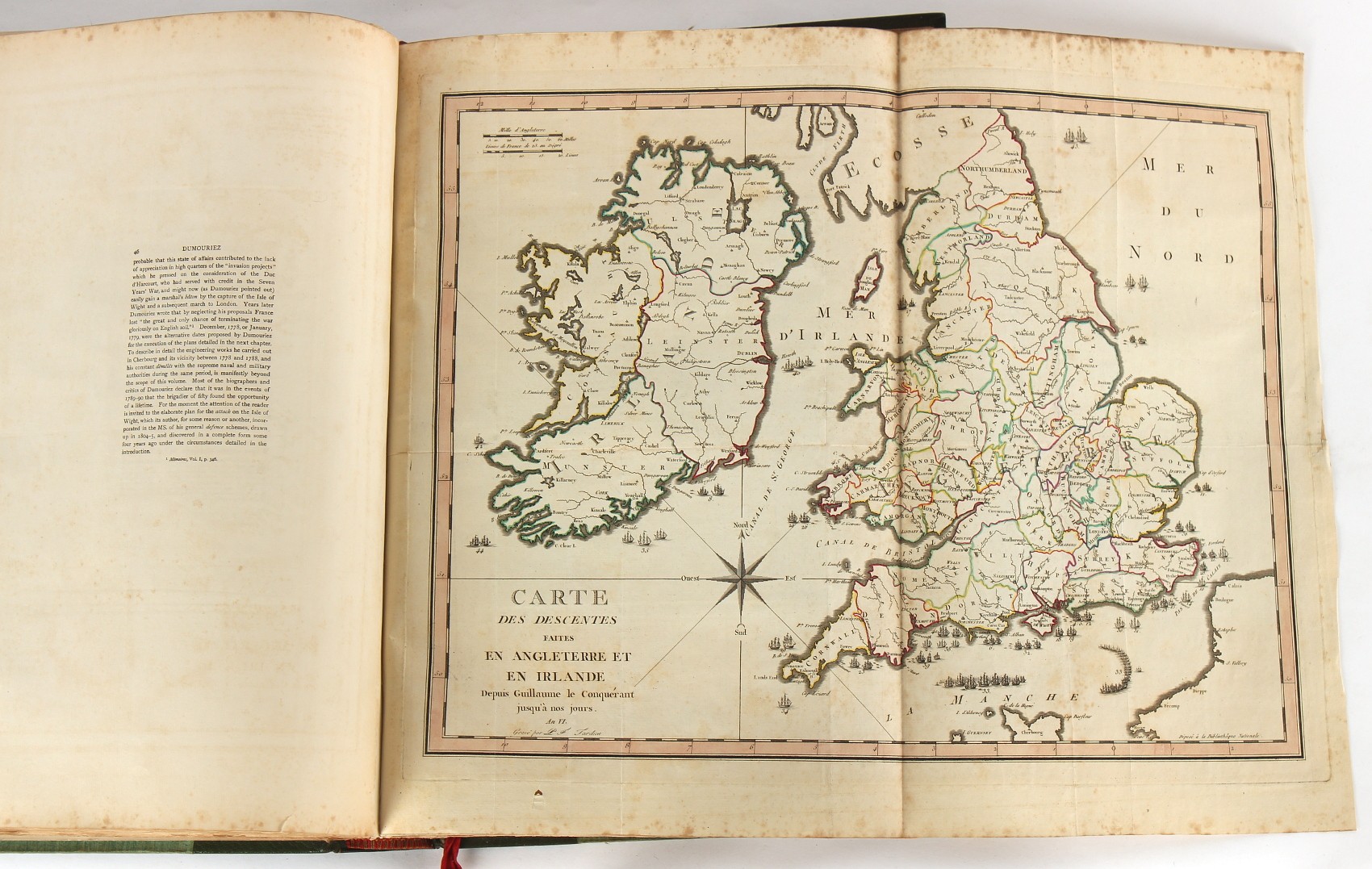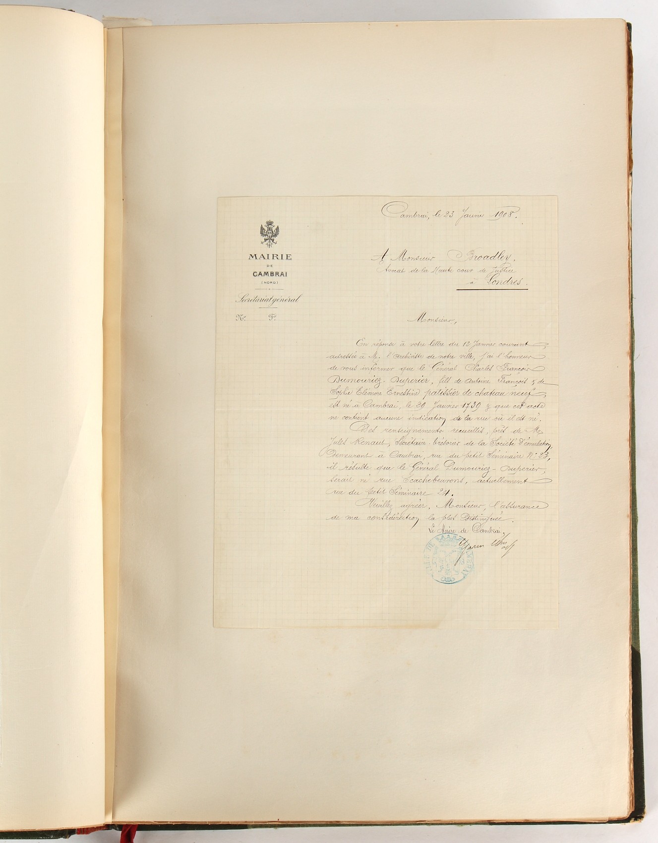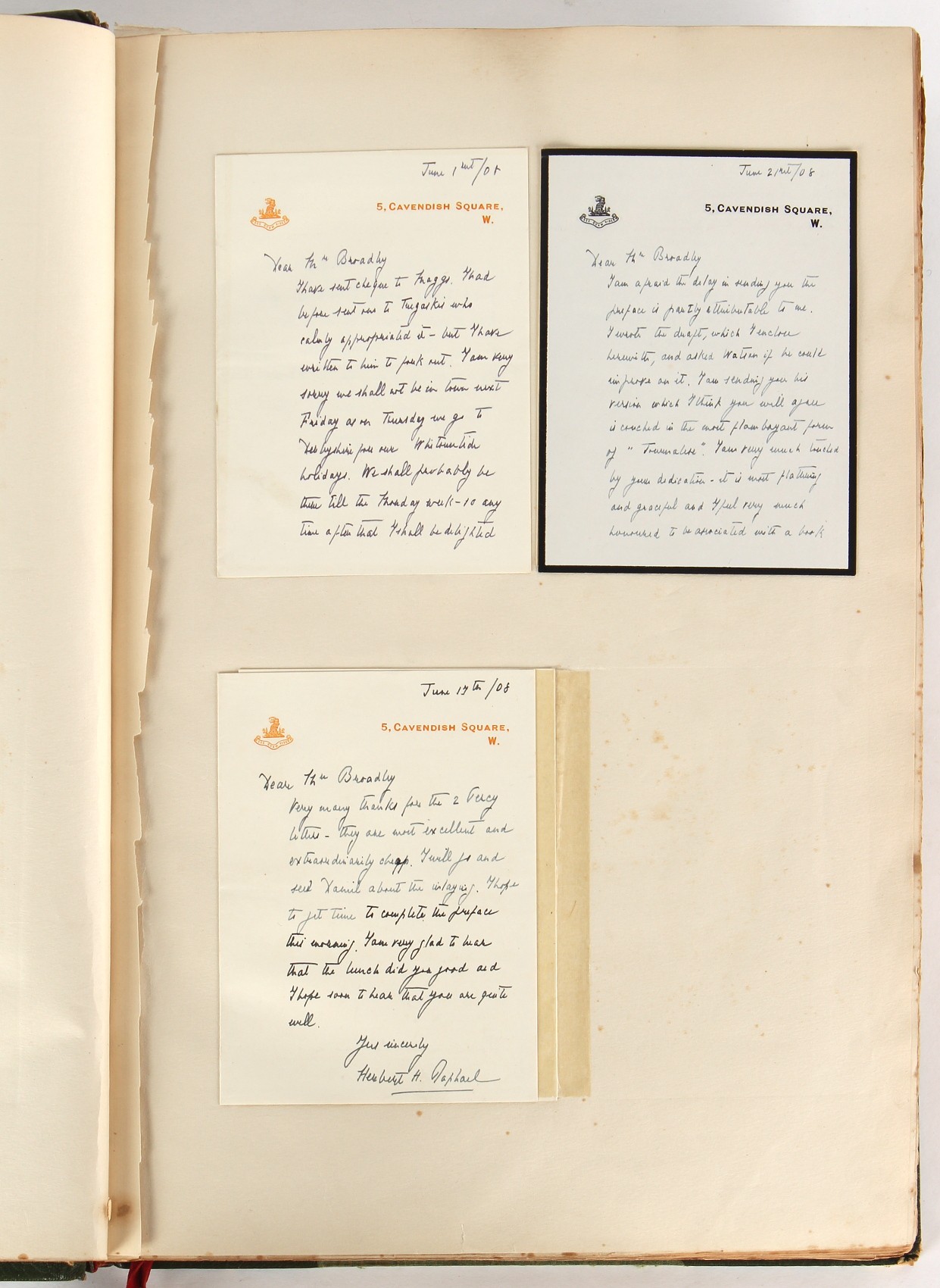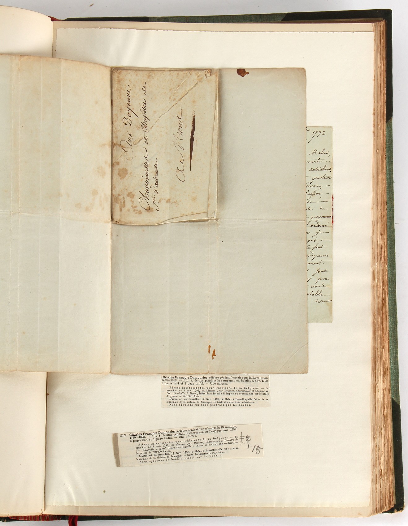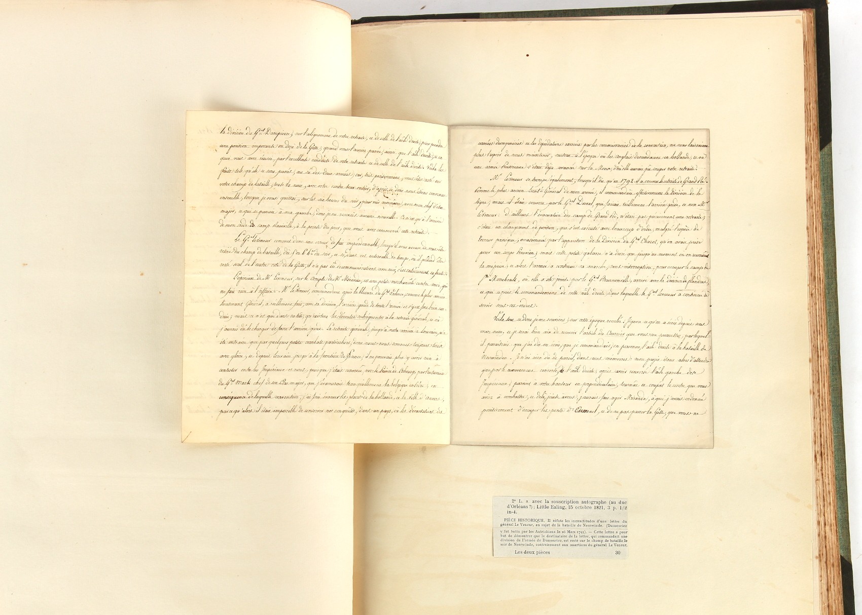 Property of a lady - Napoleonic historical interest - BROADLEY, Alexander Meyrick, and ROSE, John Holland - 'Dumouriez and the Defence of England against Napoleon' - two volume set, the personal 'Extra-Illustrated' or 'Grangerized' (or 'Grangerised') copies of Alexander Meyrick Broadley (1847-1916), London, John Lane, The Bodley Head, 1909, with tipped-in invoice from William Brendon & Son Limited Printers, Plymouth, dated 7th Sept. 1908 for £2 - - 'To one special copy pulled upon large paper, also 200 folio plain sheets', extra-illustrated or augmented with a large quantity of contemporarily hand-coloured and monochrome cartoon or caricature satirical prints, original drawings & watercolours, printed broadsides, etc., each affixed at the edges only into a window cut in to each plain folio sheet (so that backs are open & visible), Volume One including six tipped-in manuscript letters from Herbert H. Raphael (Major Sir Herbert Henry Raphael, 1st Baronet, 1859–1924) and twenty-six tipped-in manuscript letters from John Holland Rose (1855-1942) and two manuscript letters (one being four-sided) from Field Marshal Lord Roberts (1832-1914), and many other ms letters including some from Cambrai (Cambray), France (where Dumouriez was born), and the publishers (including the original contract between the authors and the publishers), all regarding the book and its compilation, also including twelve original ink manuscript letters by the subject of the book Charles Francois du Perier Dumouriez (1739-1823) (a further 16 letters by him are in Volume Two), the first dated 1765, the second (four sided) from Versailles dated 1772, the third (four sided) dated 1782, the fourth, fifth, sixth, seventh, eighth, ninth and tenth all dated 1792 when Dumouriez was Ministre des Affairs Etrangeres, Ministre de la Guerre, and Chef de L'Armee du Nord, an important ink manuscript letter from Dumouriez dated 1793 (two sided) consulting Charles James Fox on finding refuge in London (with letter from the dealer P.F. Madigan in Fifth Avenue, New York, regarding Boardley's purchase of this letter for $40), another ms letter from Dumouriez (two sided) dated 1796, and another from Antoine-Marie Chamans de Lavallette (Directeur General des Postes under Napoleon), the prints including Piercy Roberts after George Murgatroyd Woodward - 'John Bull and His Friends Commemorating The Peace' (1802); 'A Cock and Bull Story' (1803), published by Percy Roberts; a small pencil drawing portrait of Dumouriez initialled J.D. and dated 9 Oct. '69; 'La Retour en Angleterre' (we can find no record of this print); 'Carte des Descentes Faites en Angleterre et en Irlande Depuis Guillaume la Conquérant jusqu'à nos jours' (Map of the Invasions of England and Ireland from William the Conqueror to the Present) (1798), hand-coloured, with accompanying text; 'Capture of Bonaparte's Carriage', published by Edwards, 1818; a signed watercolour by G. Heberden entitled 'Genl. Dumouriez marching the Sans Culottes into Holland', 19.5 by 32.5cms.; 'A Dose for Dumourier, Evacuation of Holland and Brabant' (monochrome); and James Gillray - 'Dumourier dining in state at St James's, on the 15th of May, 1793' (monochrome), Volume Two including numerous broadsides or notices, some anti-Napoleon propaganda, one a folding monochrome broadside entitled 'An ABSTRACT of An Act for providing an Augmentation to the MILITIA, to be trained and exercised in the Manner therein directed; and for enabling His Majesty to cause the same to be embodied, in case of Necessity, for the Defence of these Kingdoms', printed by George Eyre and Andrew Strahan, 1796; lists of recruited foreign soldiers, etc.; an 'Army of Reserve Act' broadside for the Parish of St. Clement Danes, dated 1803; a Jan Kip folded engraving of Lulworth Castle entitled 'Lullworth Castle in Dorsetshire, The Seat of Humphry Weld'; other folding maps; several printed patriotic song scores of the period; a ms autograph ink sheet entitled 'Verses written on the threatened Invasion', by B. Atkinson of Bath'; a contemporary 60-page plus index ink ms booklet entitled 'Internal Defence of Essex', listing the names & number of carts & horses for each village or town to be called upon in the event of invasion; a printed list of 'Loyal Colchester Volunteers', dated July 1803; this second volume also includes a further 16 ink ms letters by Dumouriez dating from 1804 to 1822; and much more (helpfully, Broadley added a ms index of the extra illustrations); each volume approximately 20.5 by 14ins. (52 by 35.5cms.) (overall) (2). Footnote - Alexander Meyrick Broadley (1847-1916) was a British author, barrister, collector and social figure, known for defending Ahmed 'Urabi after the Urabi Revolt. Broadley penned numerous historical works later in life, particularly regarding Napoleon and his era. Among the works he authored or co-authored are 'Napoleon and the Invasion of England: The Story of the Great Terror' (London, 1908); 'Nelson’s Hardy: His Life, Letters and Friends' (London, 1909); 'Napoleon in Caricature 1795-1821' (London, 1911); and 'Napoleon in Exile' (London, 1914). Broadley was known as a celebrated grangeriser (or extra-illustrator) of books, and one of his greatest achievements was the creation, with the assistance of Daniell, of an extra-illustrated set of Rose’s 'Life of Napoleon I' and Rosebery’s 'Napoleon. The Last Phase', by inlaying and extending the works from three octavo to twenty-eight folio volumes with engravings, portraits, manuscripts, autograph letters, etc. over a period of four years. This monumental work was bought by George Nathaniel Curzon, Marquess Curzon of Kedleston at the auction of Broadley’s library held in four sales between 1916 and 1918, and Curzon later bequeathed the set to the Bodleian Library, Oxford.